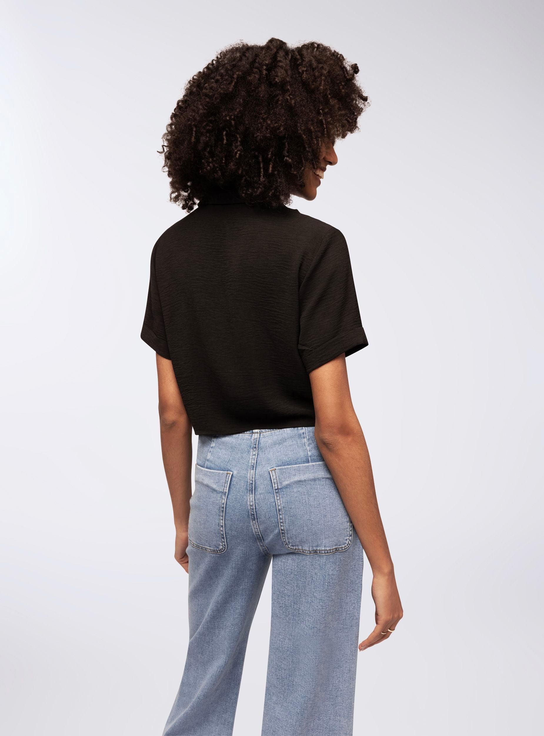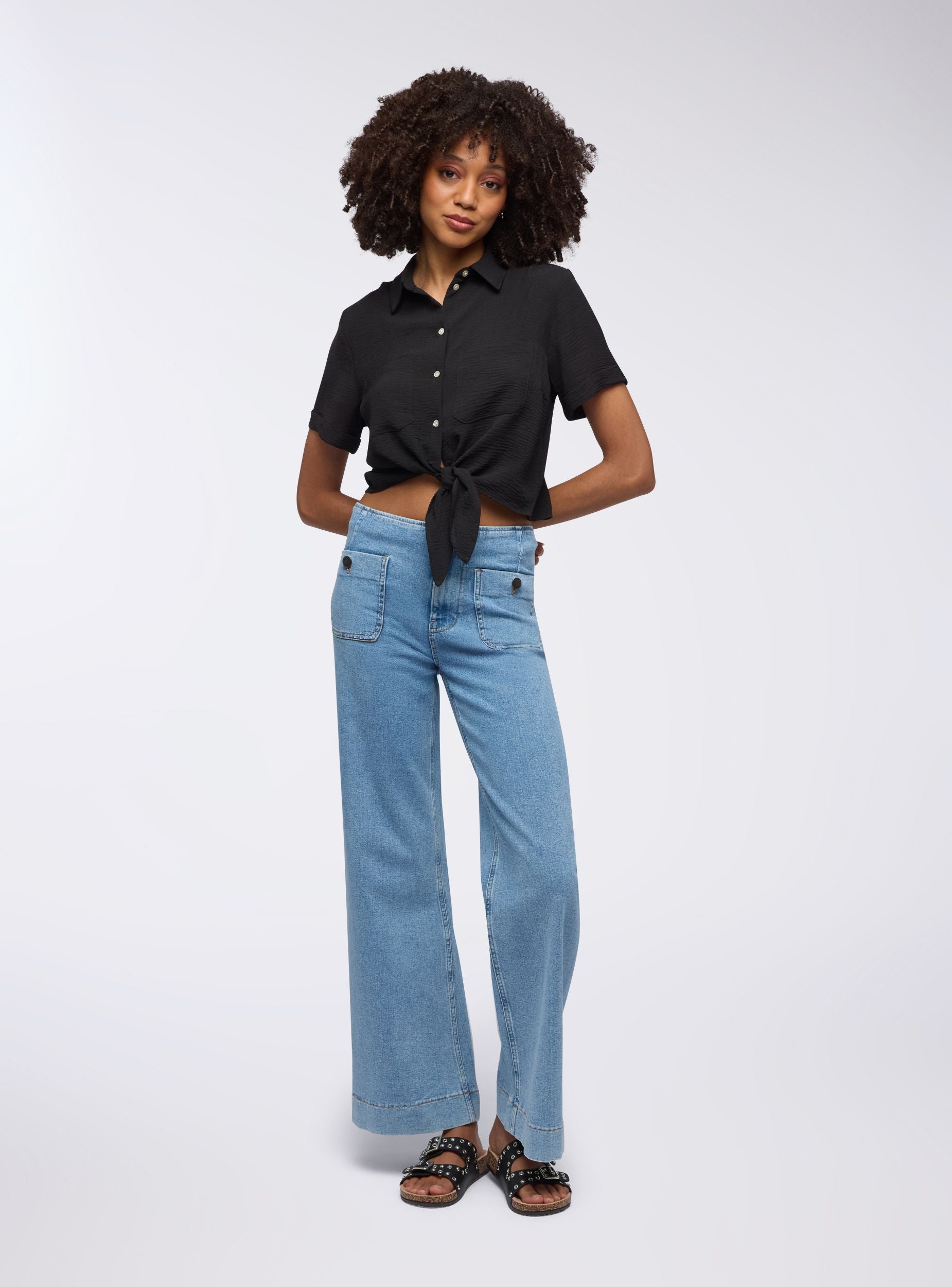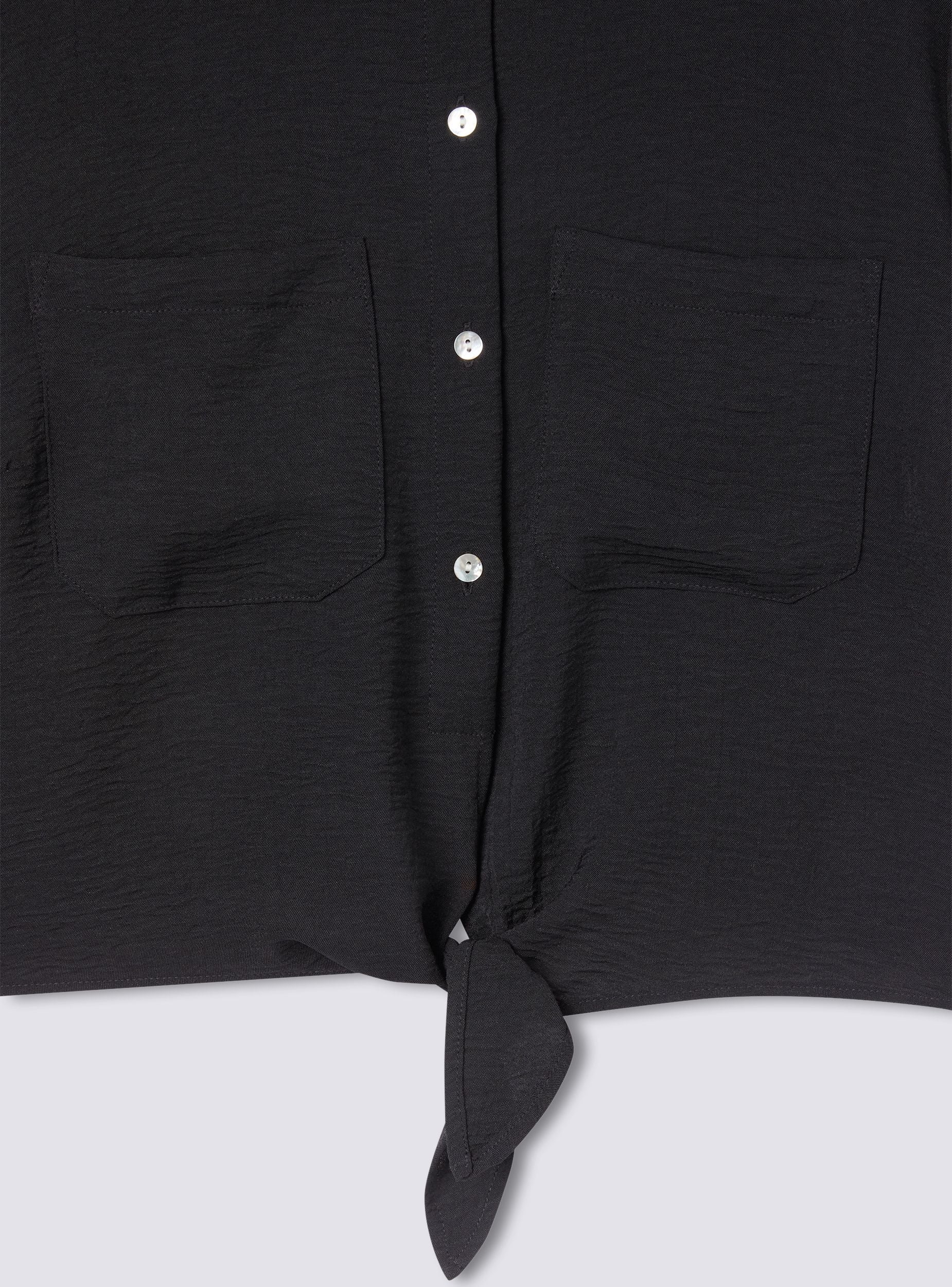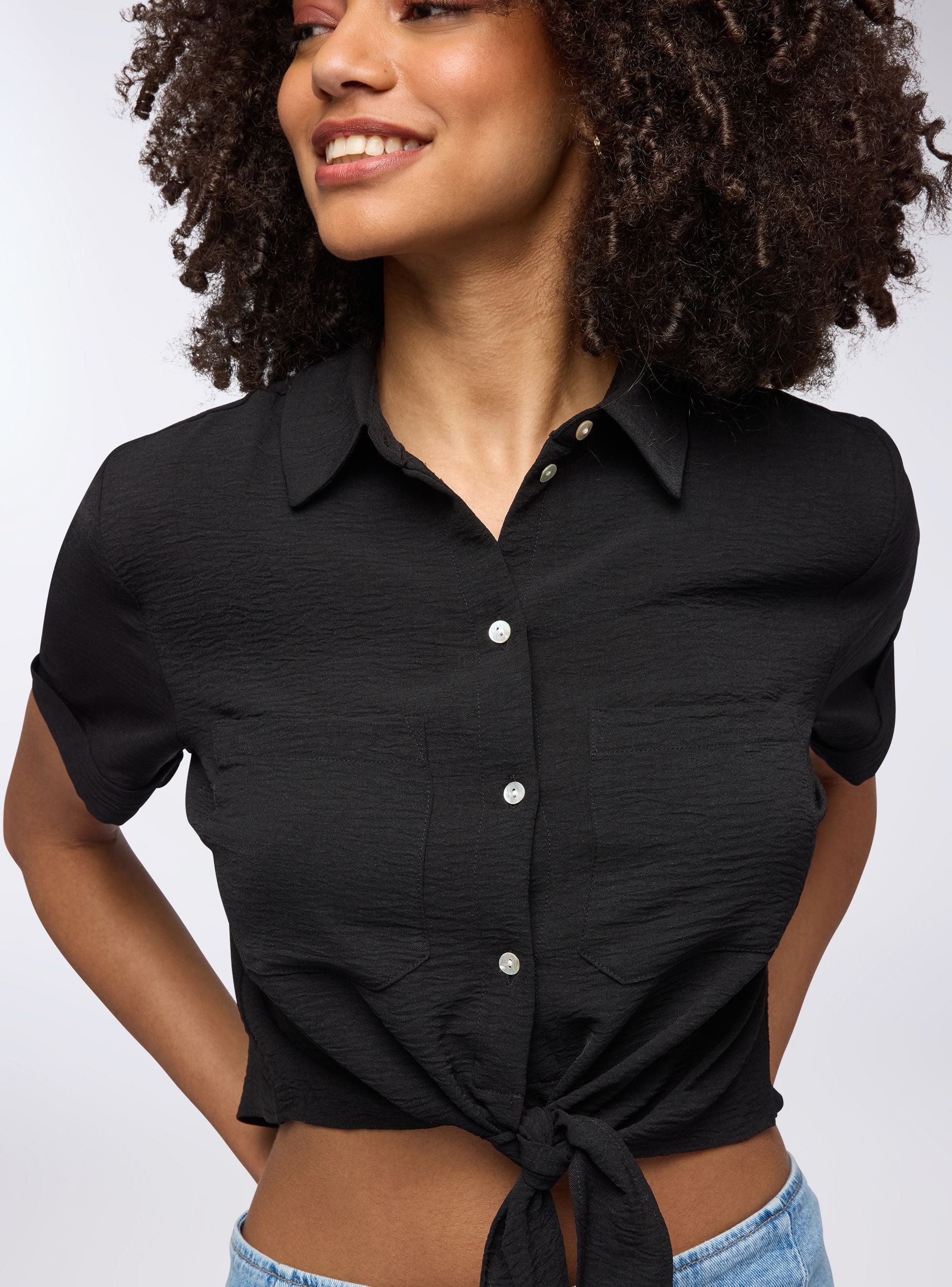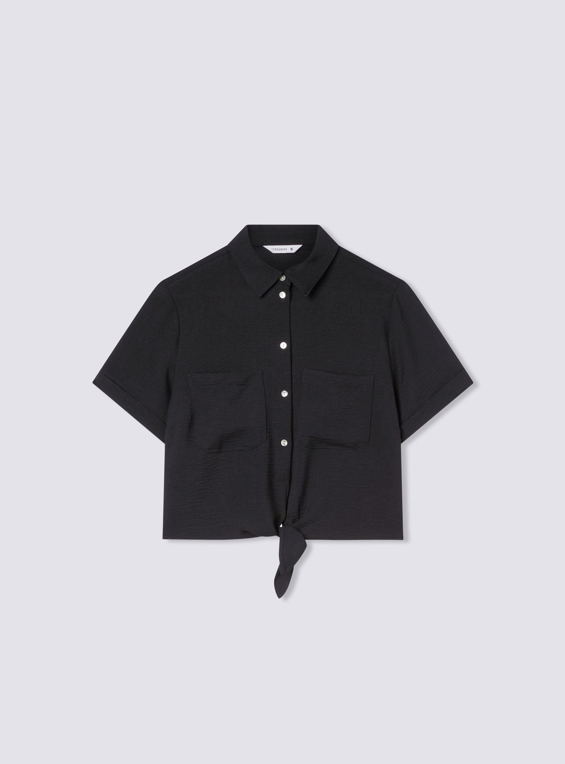 Camicia da donna crop a tinta unita, perfetta per uno stile fresco e moderno. Questo modello presenta un colletto, una chiusura frontale con bottoni e maniche corte per il massimo comfort. Le tasche applicate sul petto aggiungono praticità, mentre il dettaglio del nodo sul fondo dona un tocco di originalità. Ideale per completare look casual e versatili con un tocco di personalità.Dettagli
