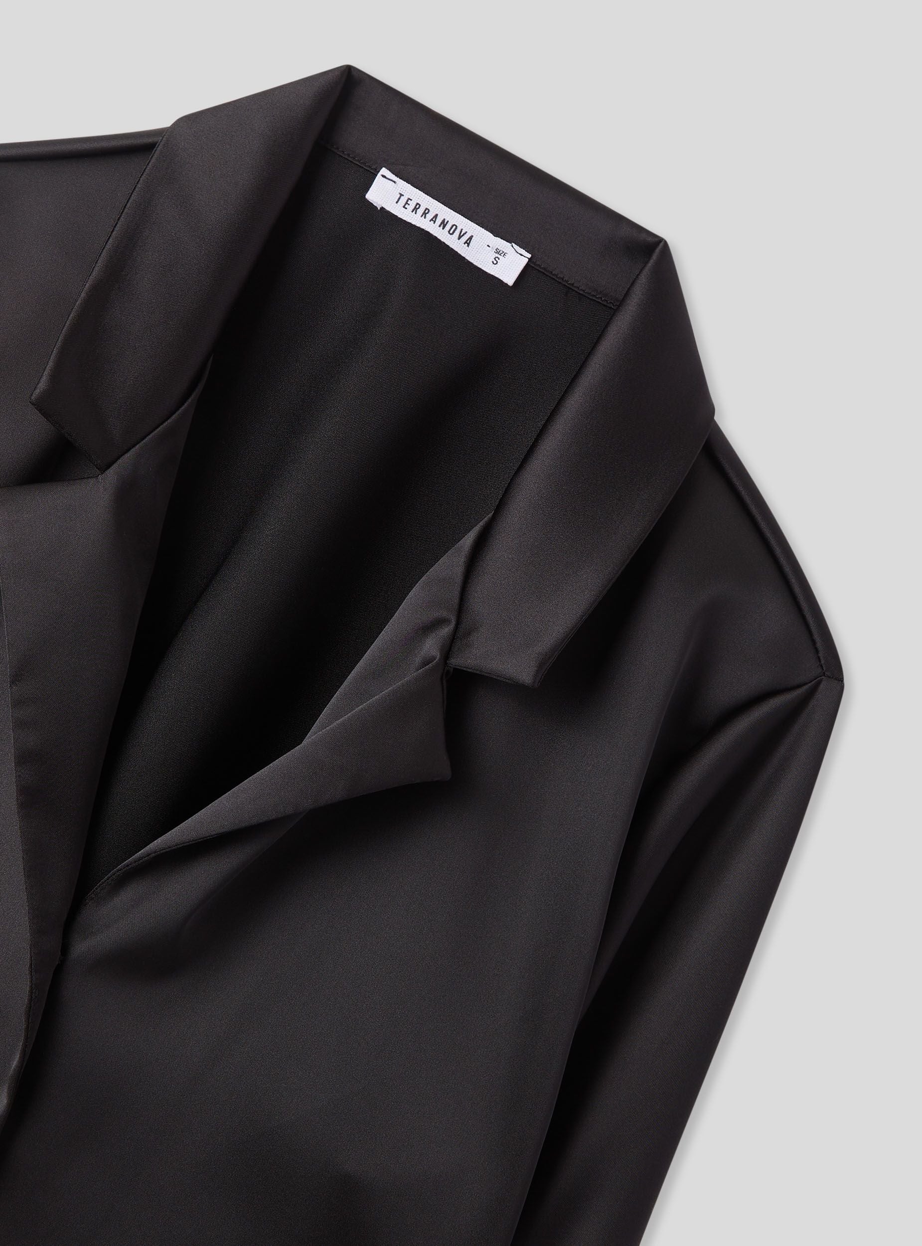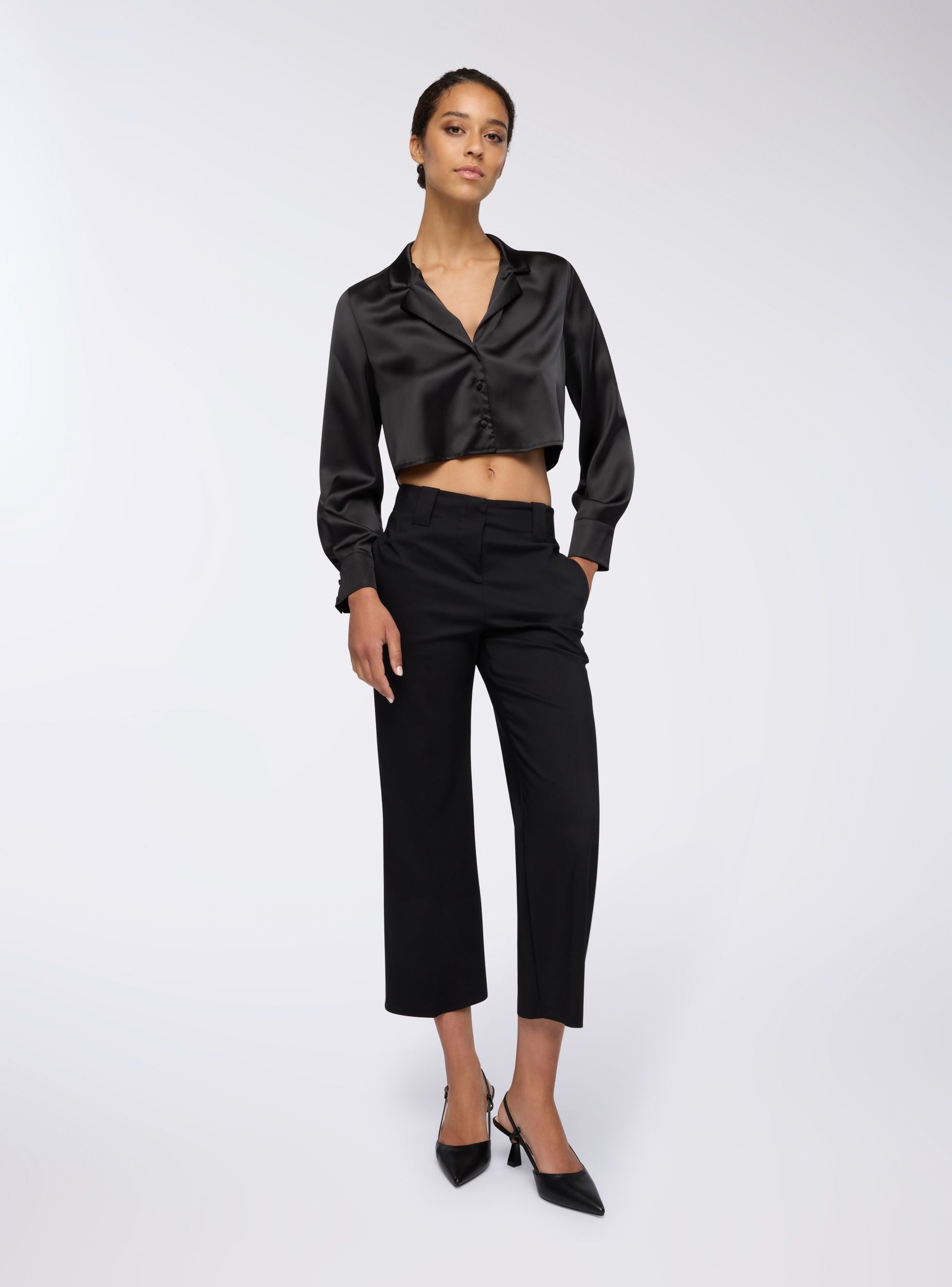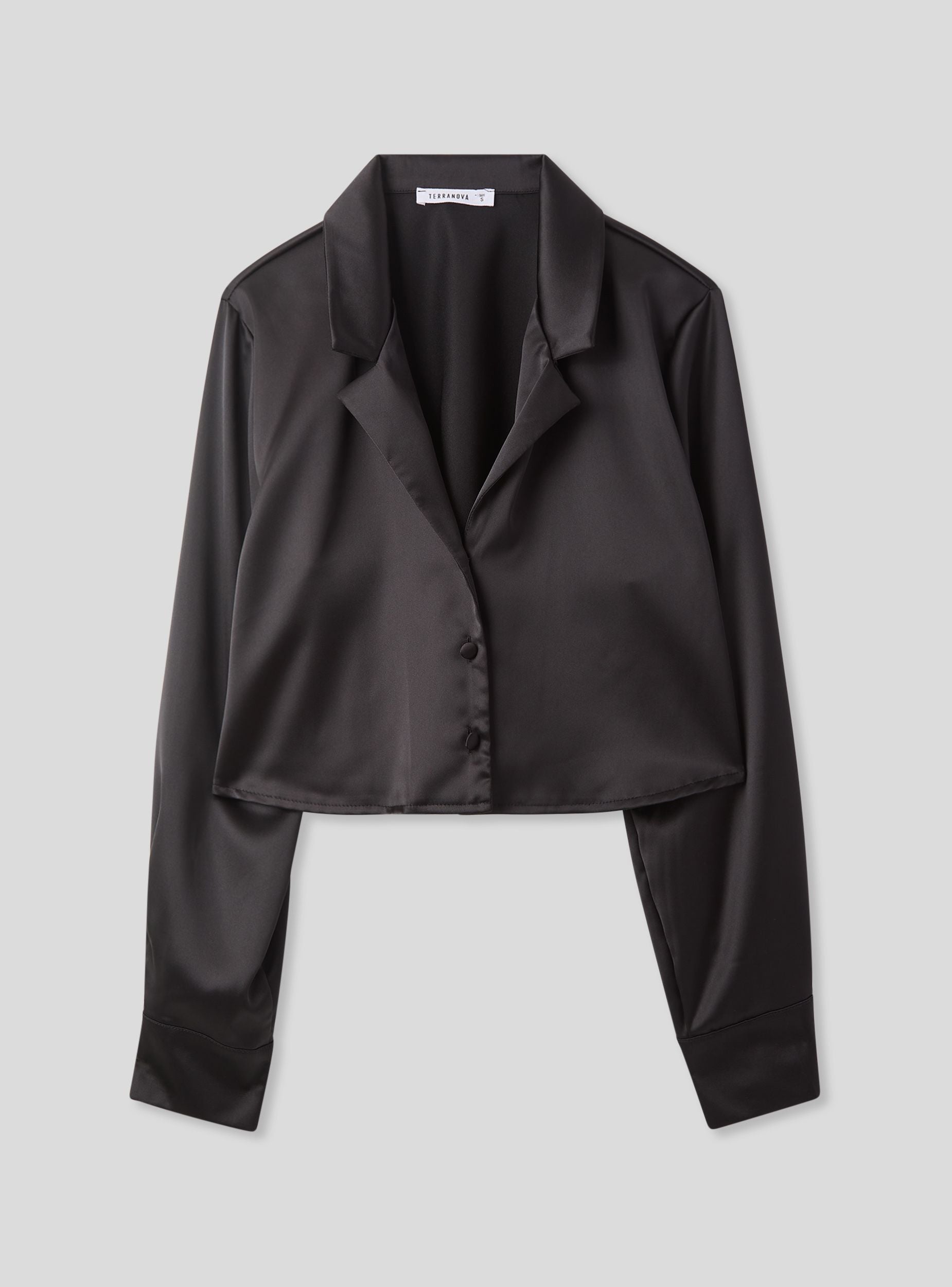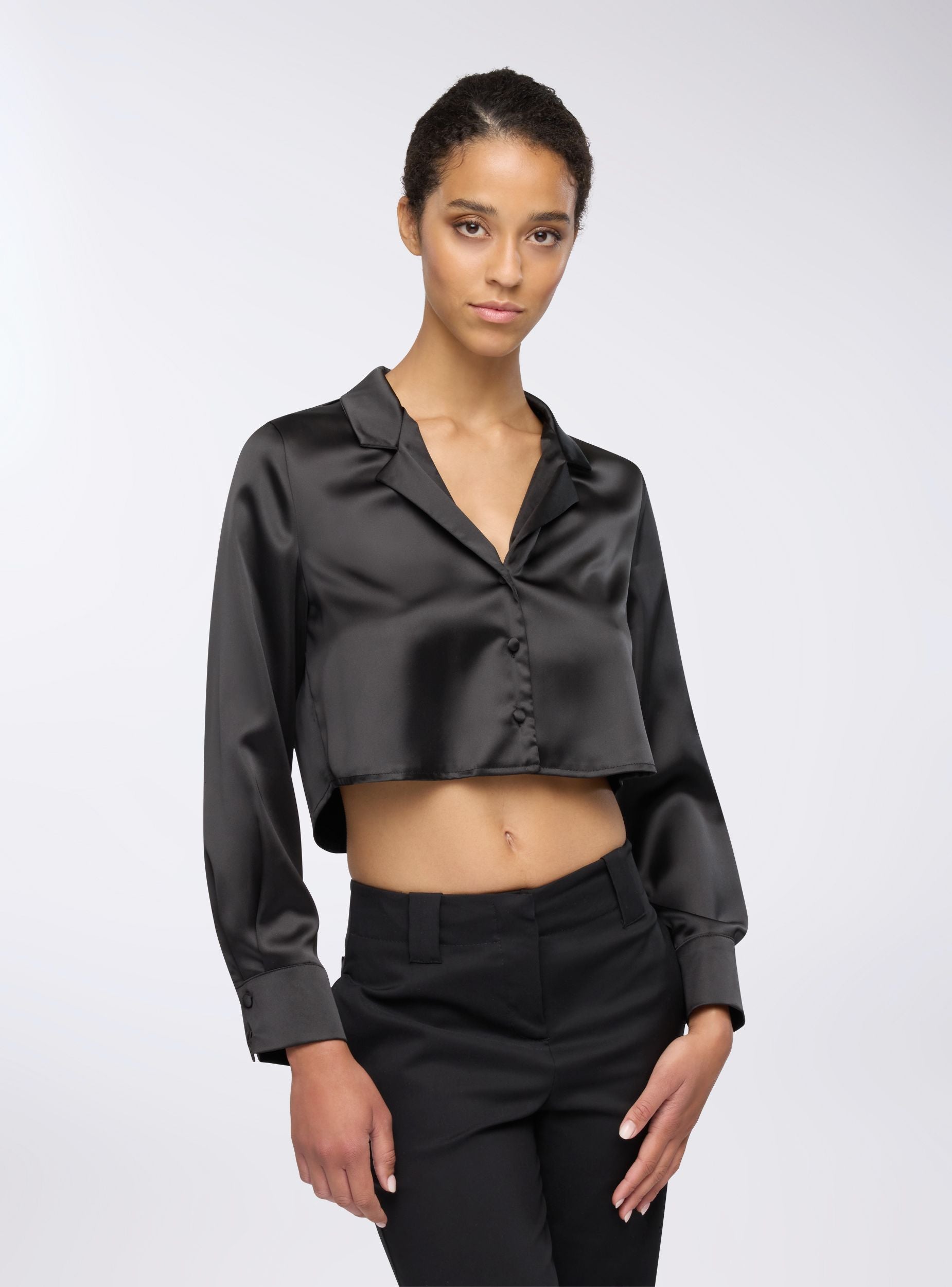 Camicia da donna ideale per occasioni casual o formali. Design crop con rever, perfetta per abbinamenti con pantaloni a vita alta o gonne. Maniche lunghe e chiusura con bottoni, il tessuto effetto raso offre un look elegante e moderno. Versatile sia per outfit da giorno che serali, si distingue per il suo stile raffinato e contemporaneo.Dettagli