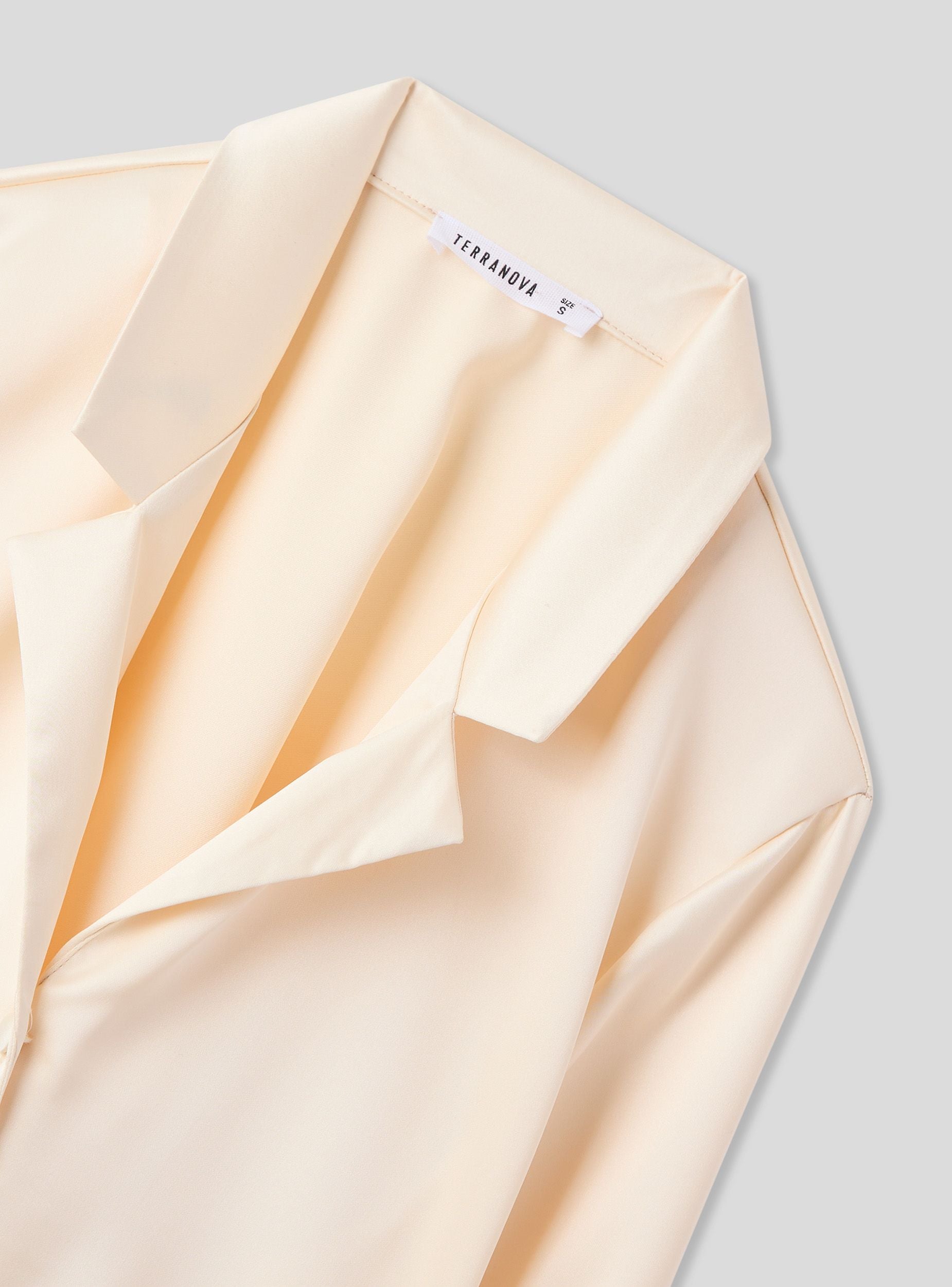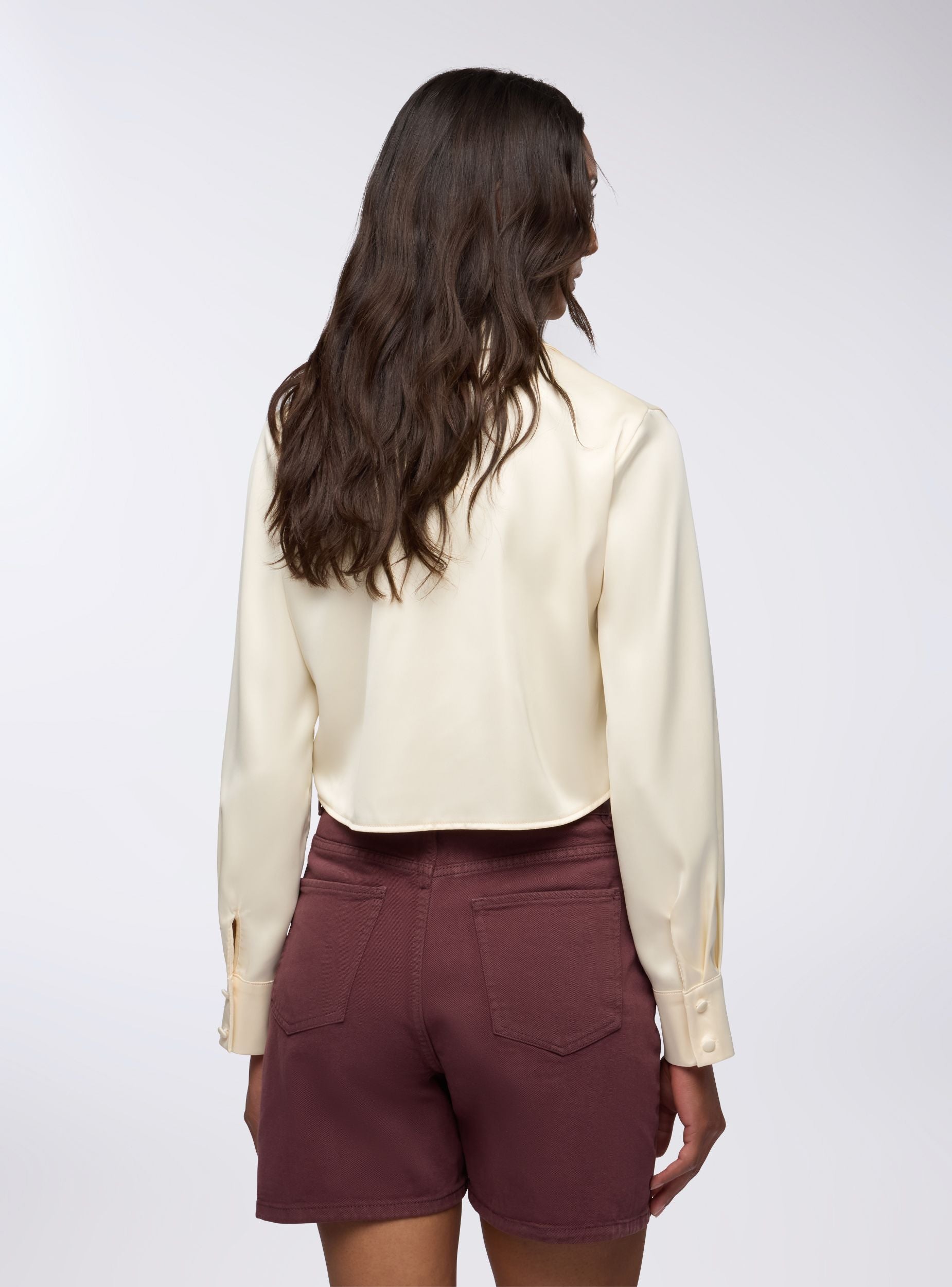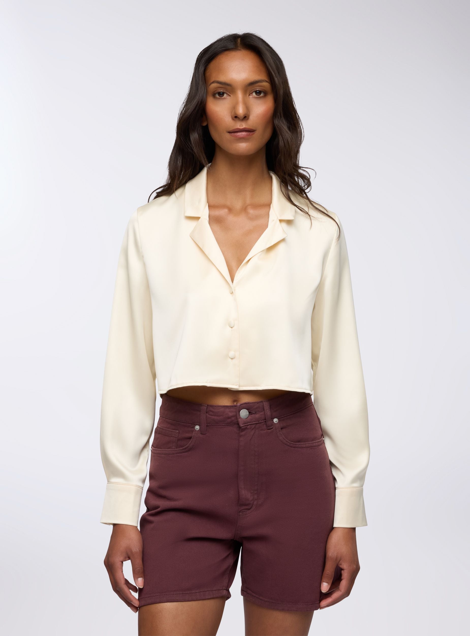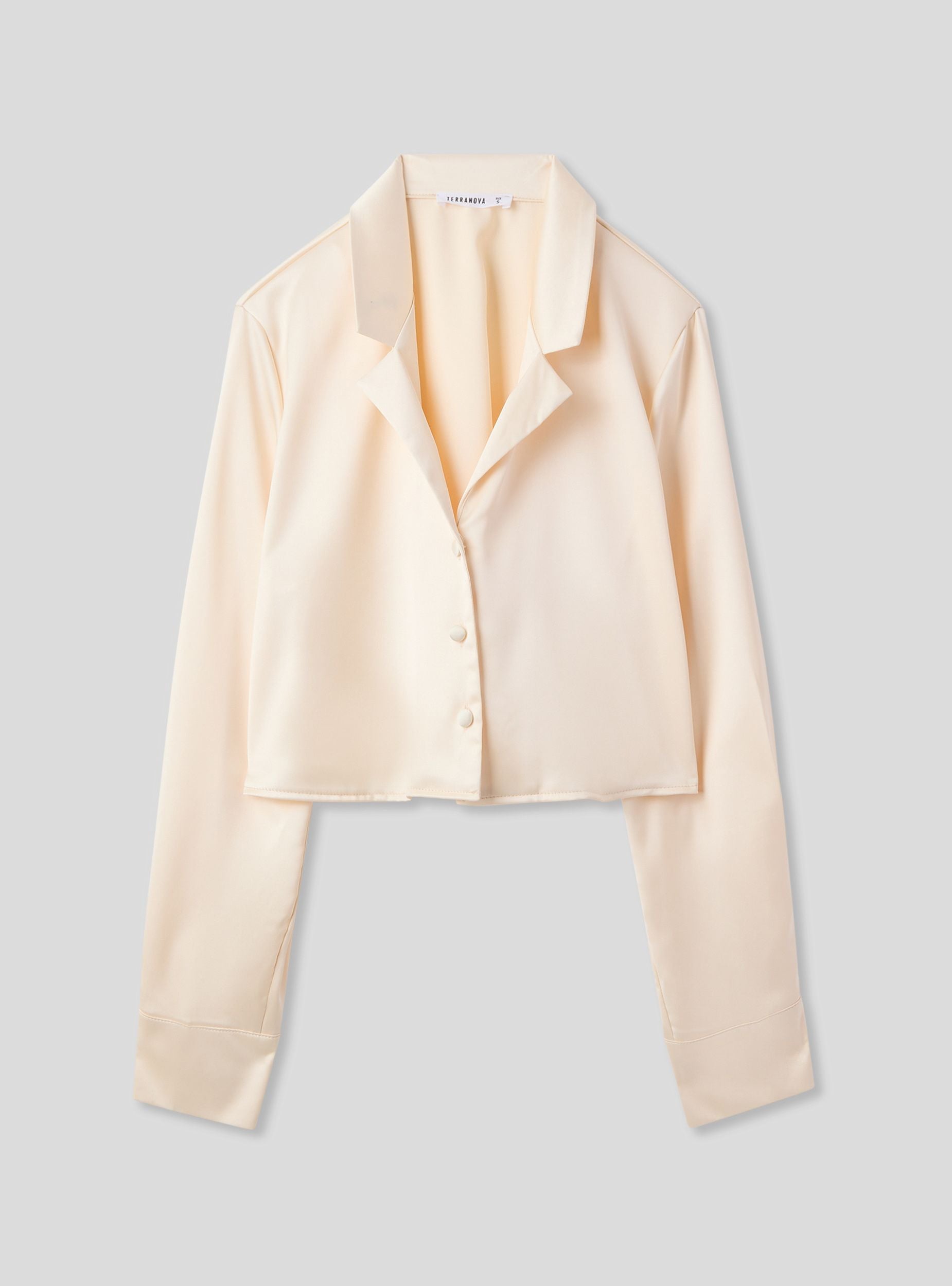 Camicia da donna ideale per occasioni casual o formali. Design crop con rever, perfetta per abbinamenti con pantaloni a vita alta o gonne. Maniche lunghe e chiusura con bottoni, il tessuto effetto raso offre un look elegante e moderno. Versatile sia per outfit da giorno che serali, si distingue per il suo stile raffinato e contemporaneo.Dettagli