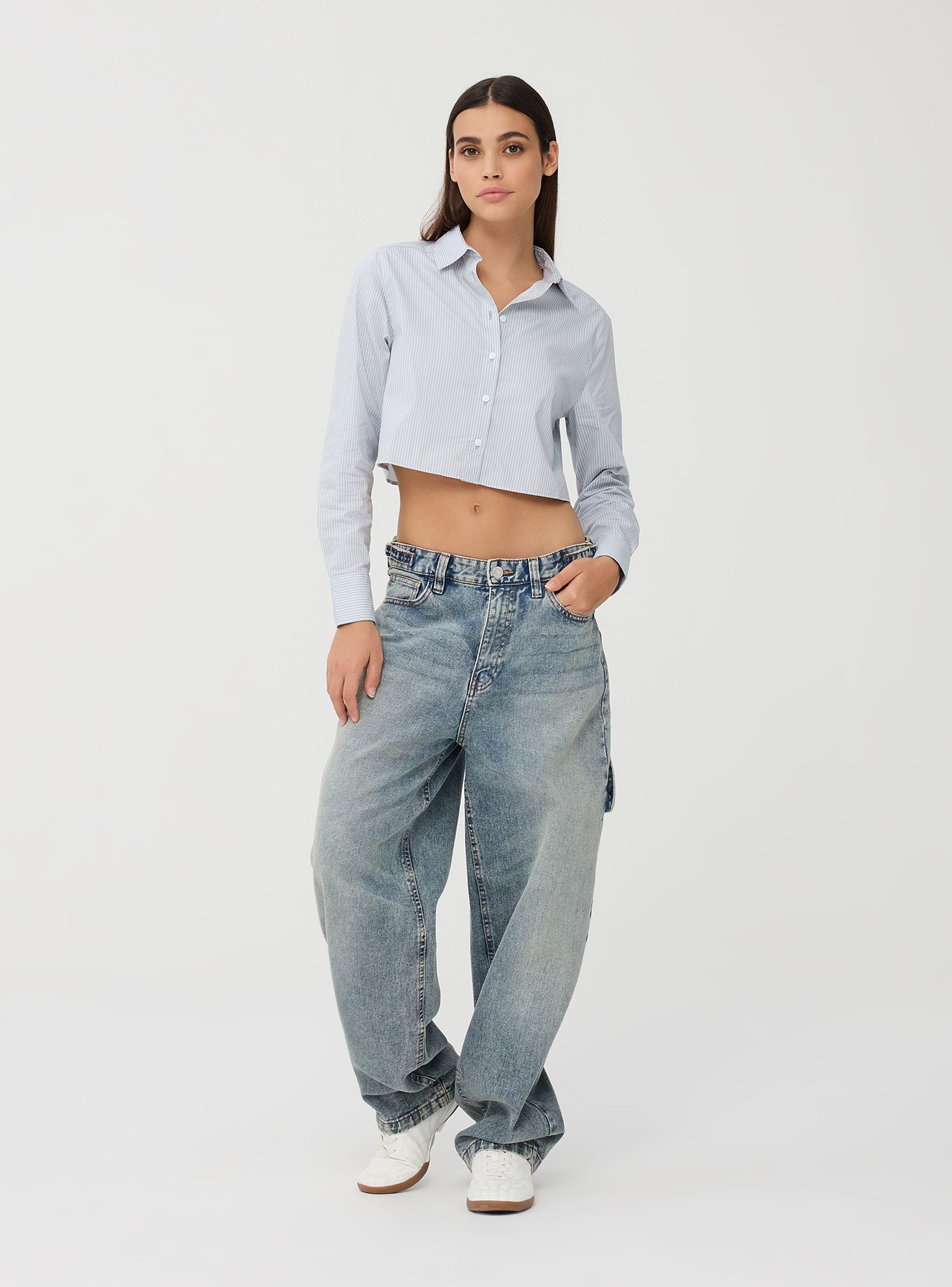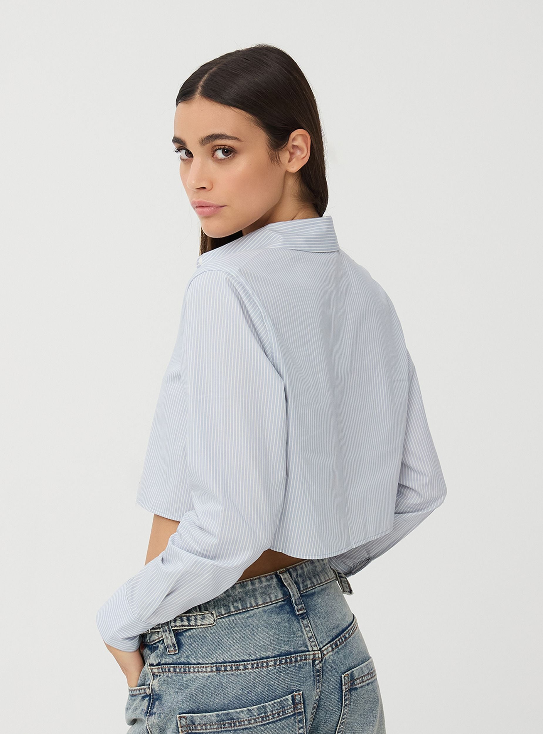 Camicia da donna con design a righe, vestibilità crop. Presenta una chiusura frontale con bottoni e un colletto classico. Le maniche lunghe terminano con polsini abbottonati. Il retro della camicia mantiene lo stesso motivo a righe e il taglio crop. Ideale per la stagione invernale, offrendo un look moderno e raffinato.Dettagli
