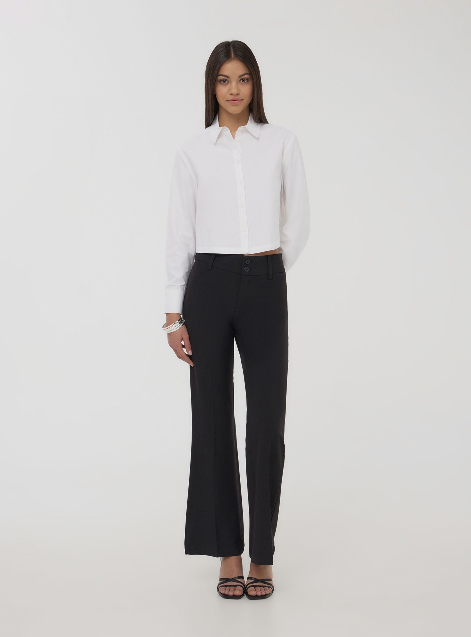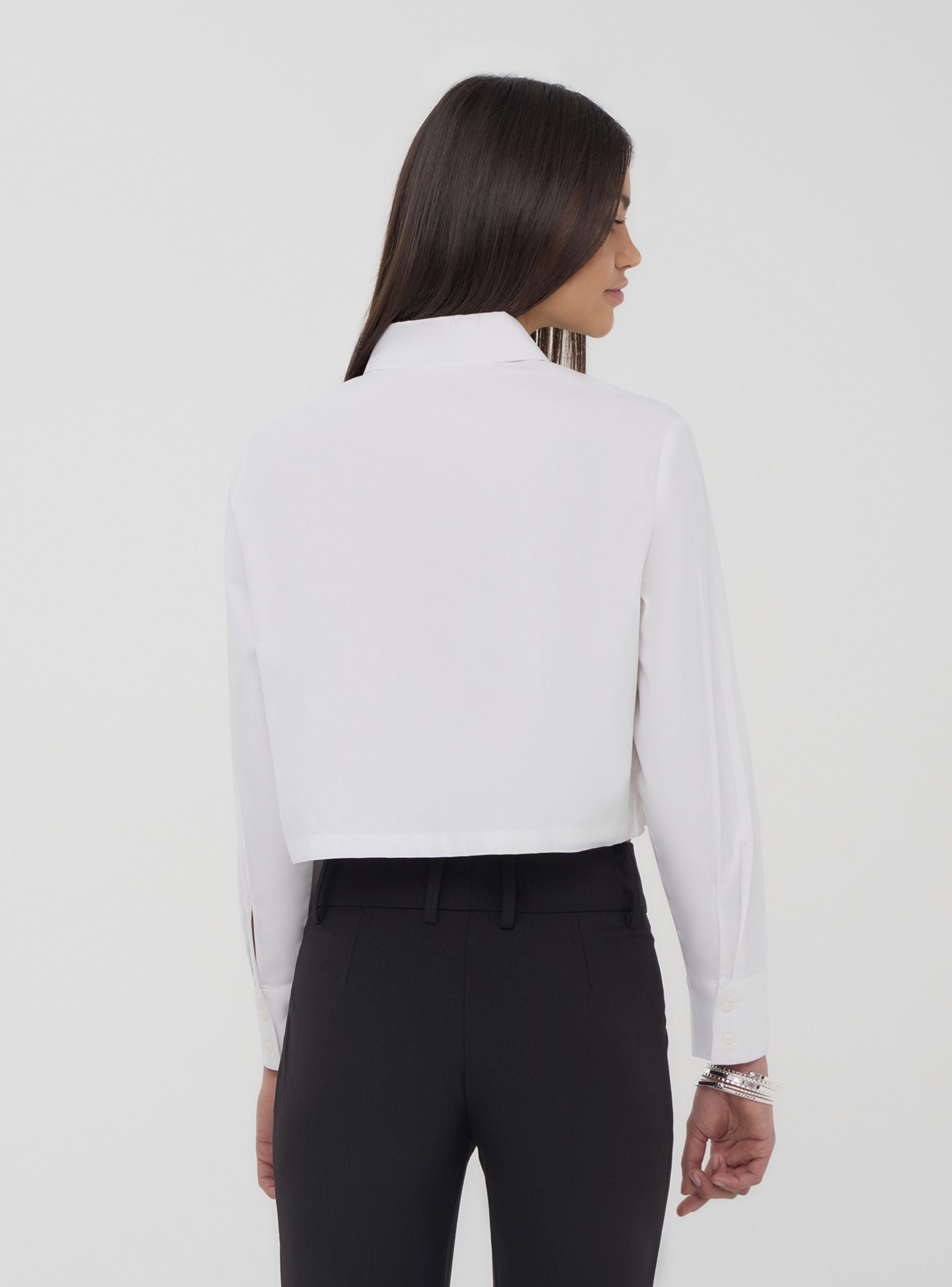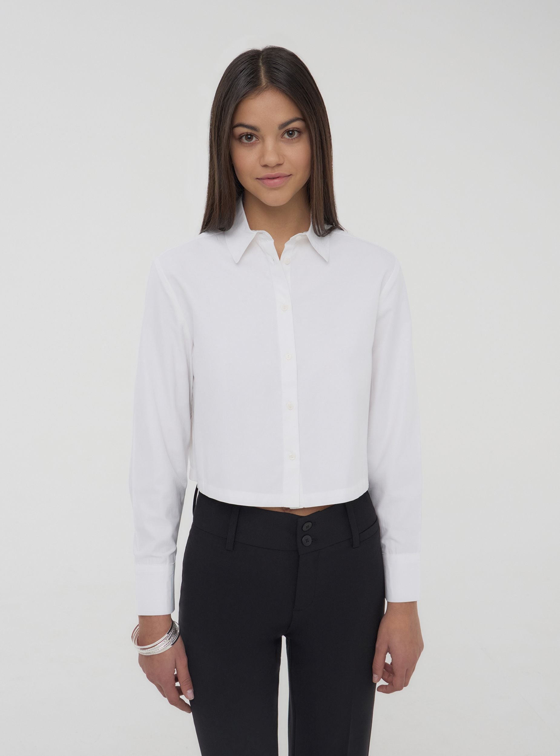 Camicia da donna crop a tinta unita, ideale per aggiungere un tocco moderno e versatile al tuo guardaroba. Dotata di colletto e una chiusura frontale con bottoni, questa camicia combina praticità e stile. La linea corta esalta la silhouette, rendendola perfetta per essere abbinata a pantaloni a vita alta o gonne. Un capo essenziale per outfit casual e contemporanei.Dettagli