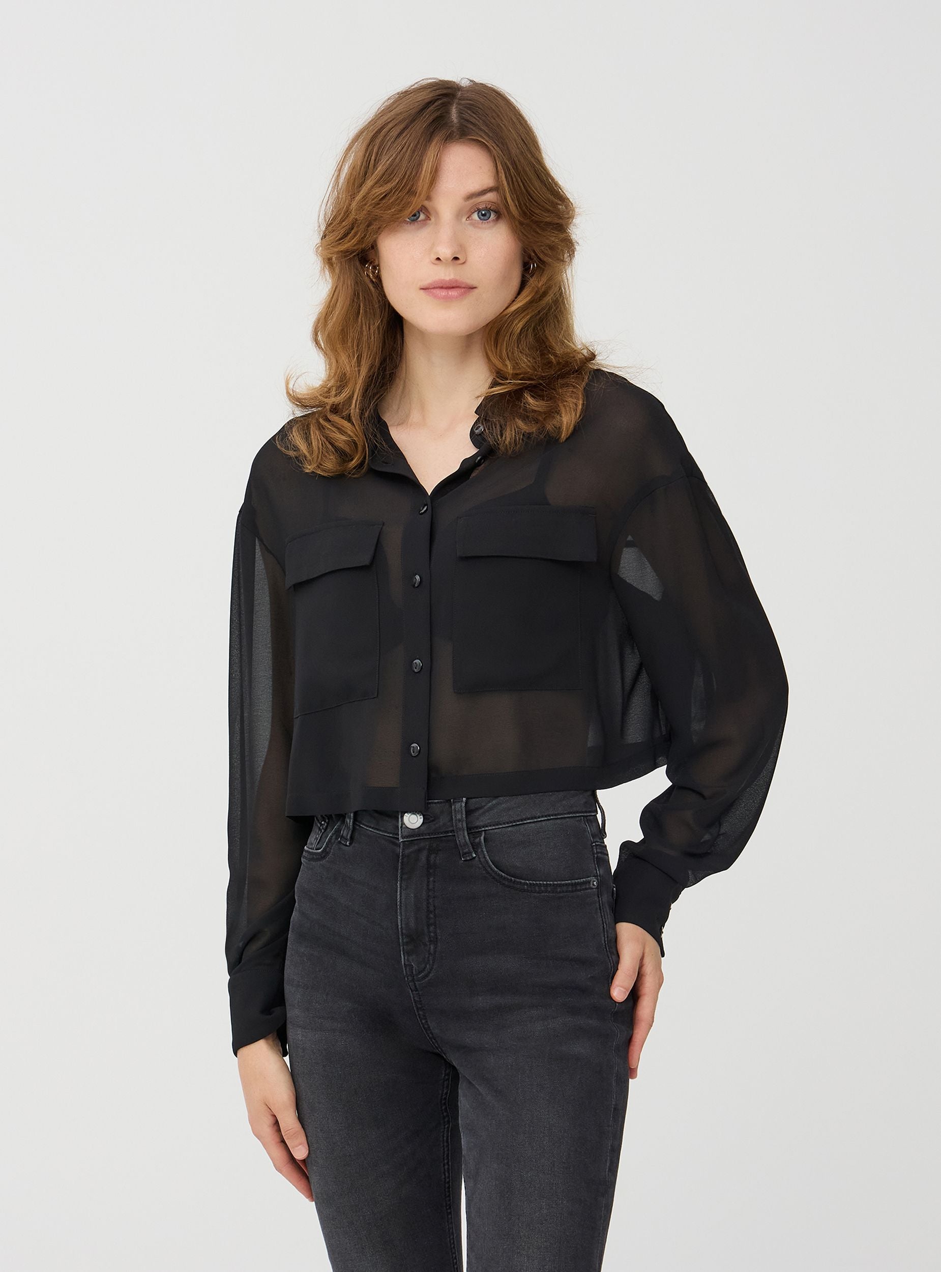 Camicia da donna elegante caratterizzata da un tessuto trasparente tinta unita . Il modello crop offre un tocco di raffinatezza e contemporaneità, le tasche sono strategicamente posizionate sul seno, fornendo una discreta copertura e mantenendo un perfetto equilibrio tra seduzione e classe. Questo capo è perfetto per chi cerca di combinare stile e funzionalità. Lasciati avvolgere dalla sua leggerezza e trasforma ogni occasione in un momento di puro stile.Dettagli