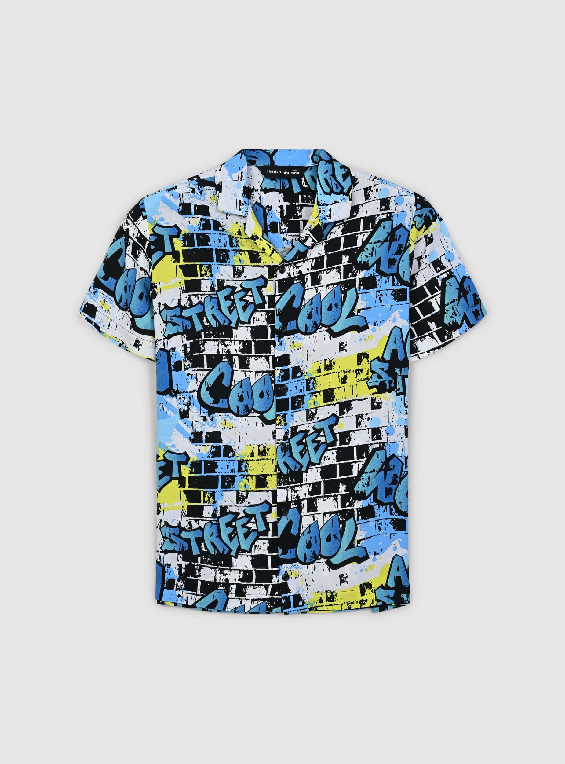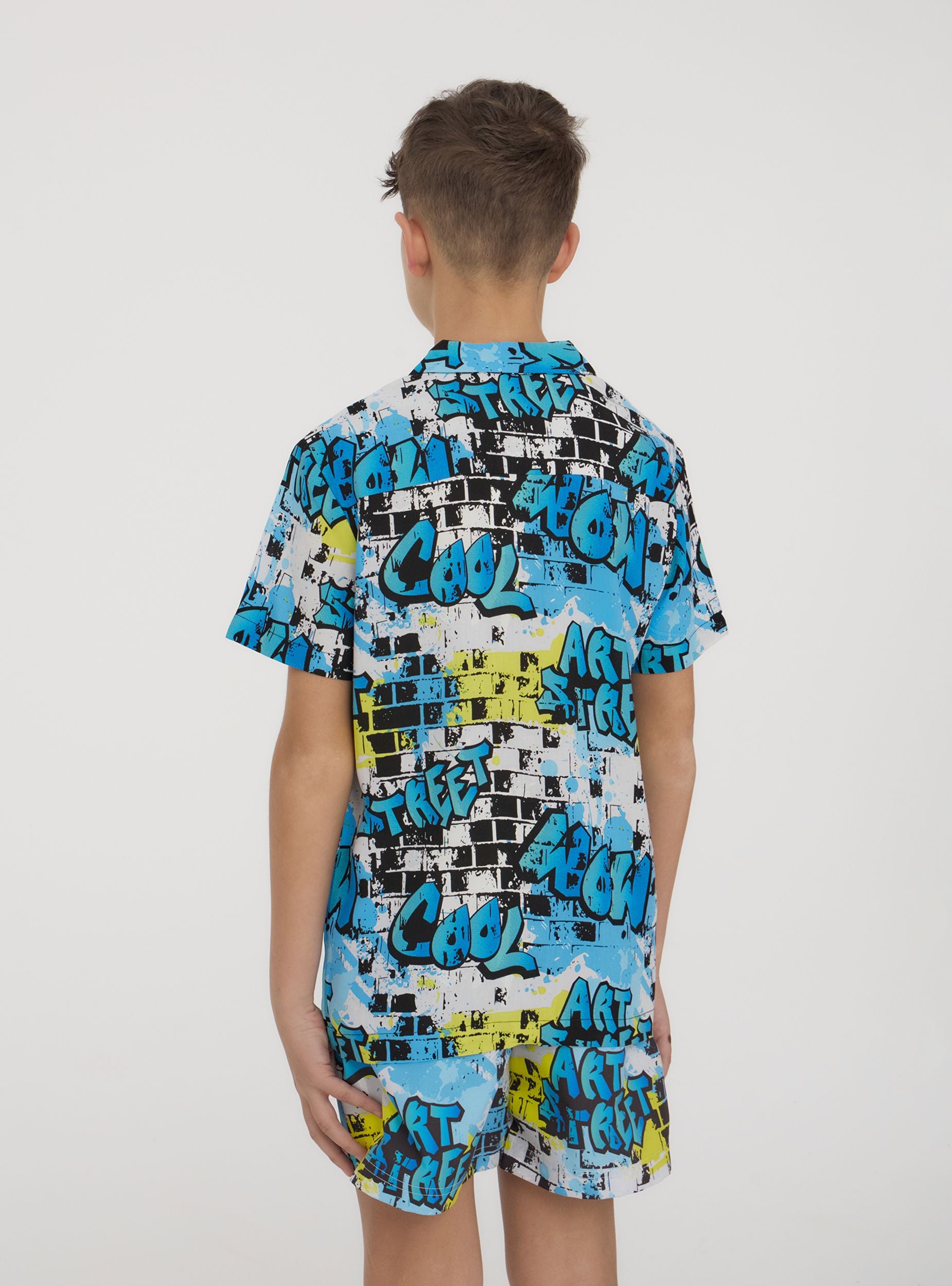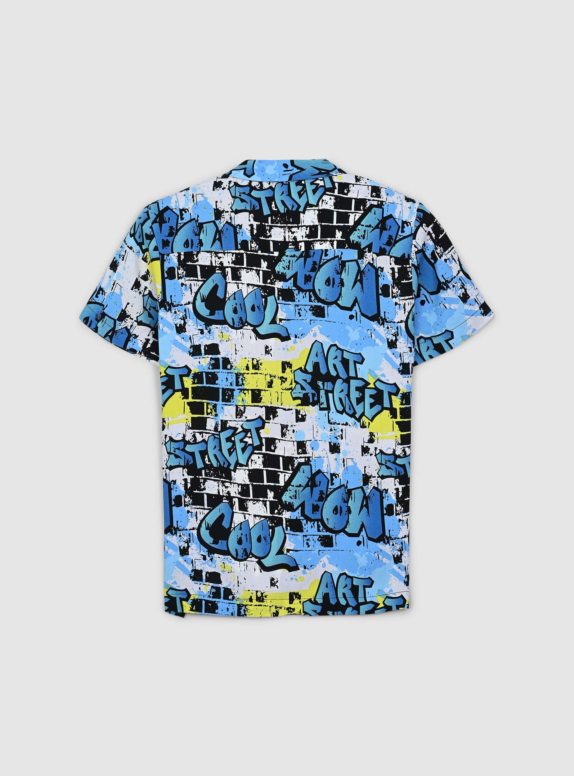 Camicia da bambino dallo stile grintoso e urbano, perfetta per chi ama distinguersi con un look dinamico. La stampa effetto murales dona un tocco streetwear moderno e di tendenza, ideale per creare outfit originali e pieni di energia. Le maniche corte offrono freschezza e libertà di movimento, mentre la chiusura con bottoni aggiunge praticità e versatilità. Perfetta da abbinare a jeans o bermuda per un look casual e alla moda.Dettagli