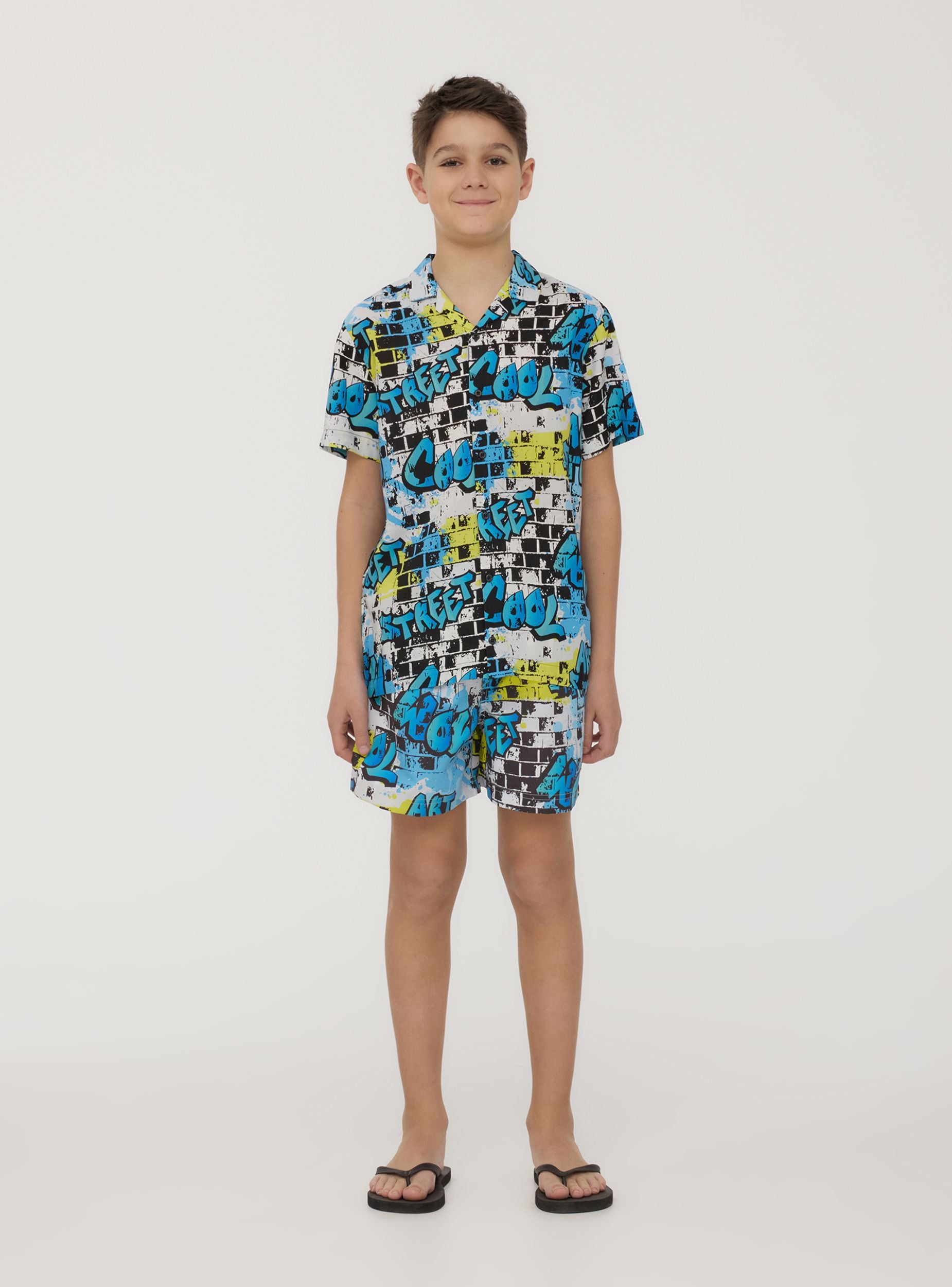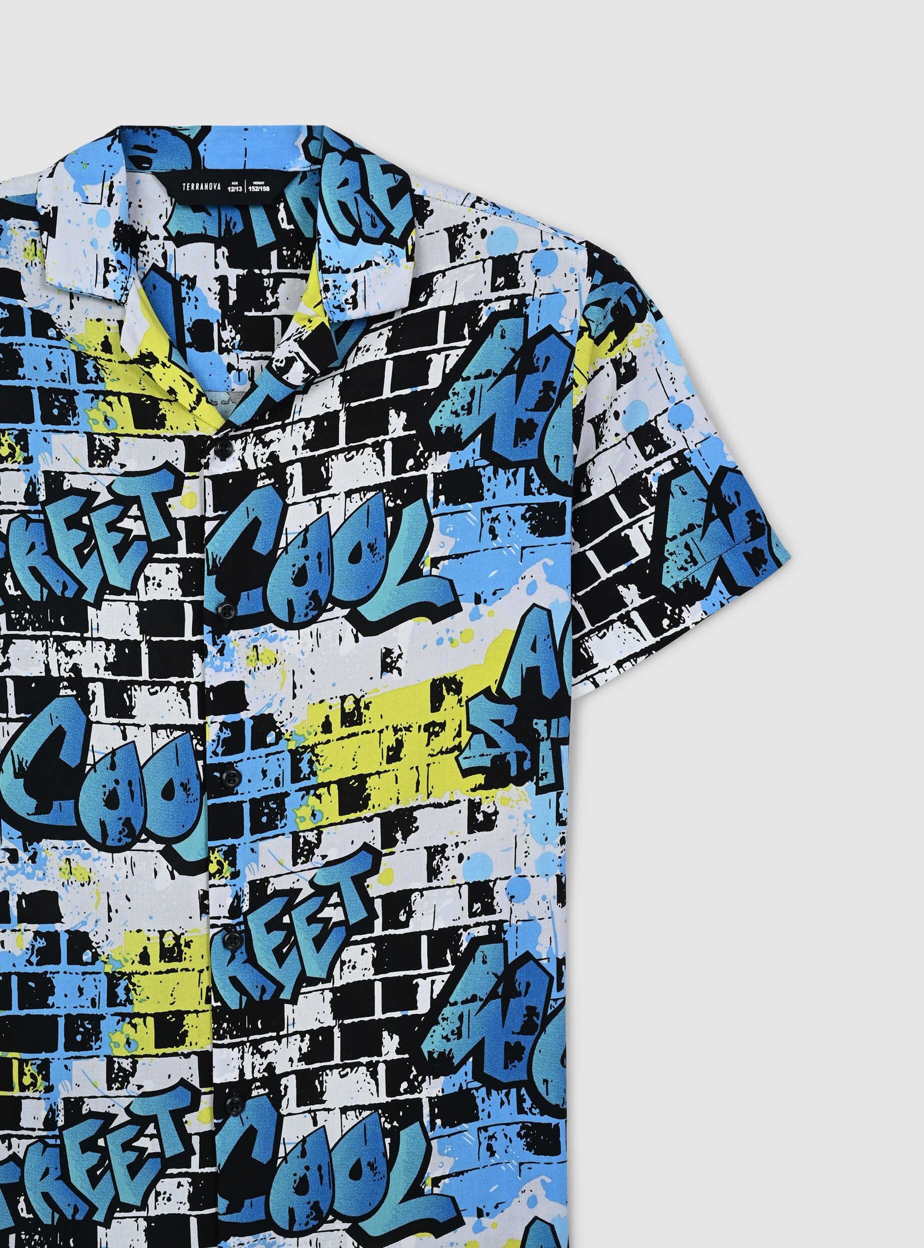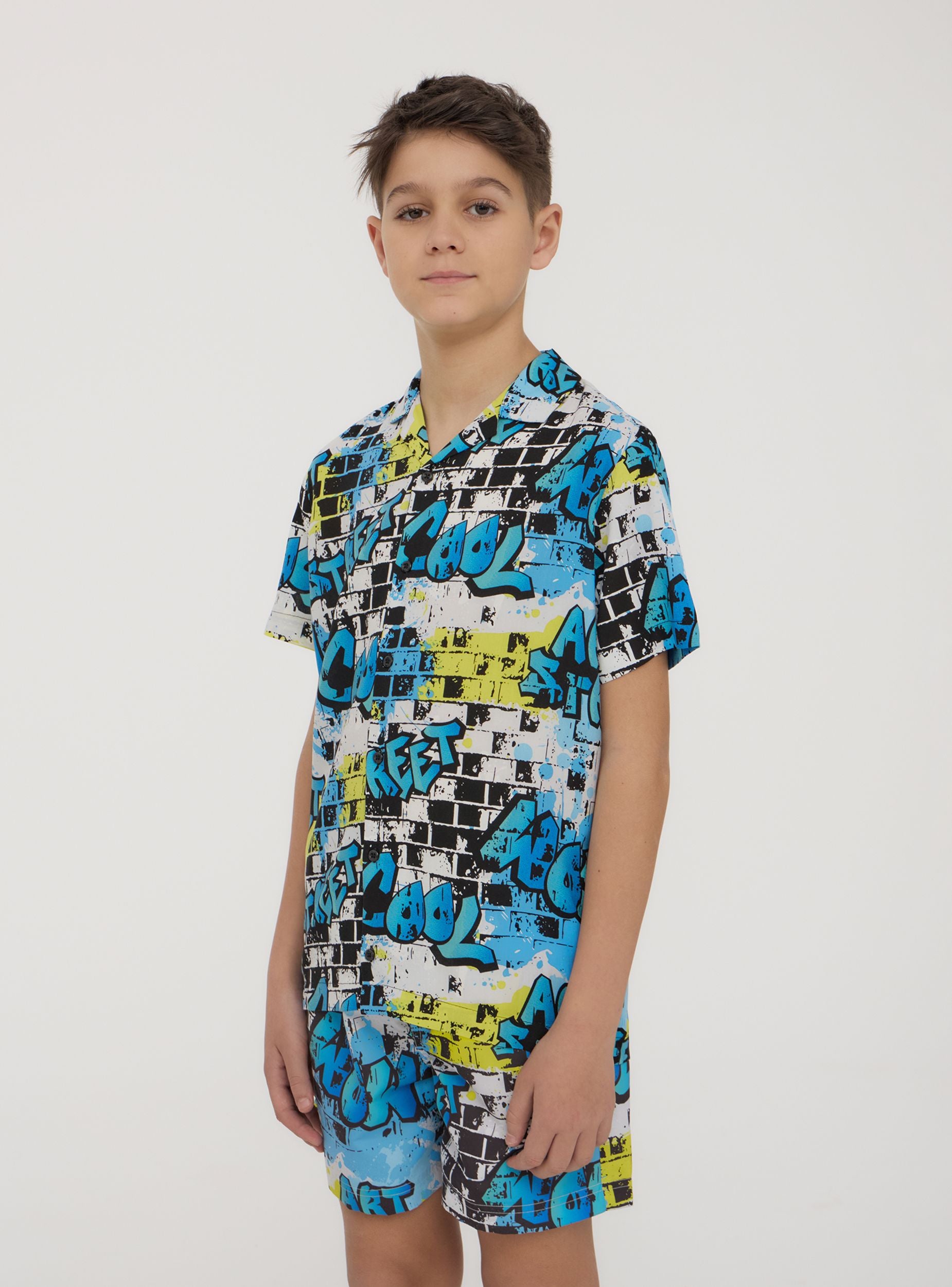 Camicia da bambino dallo stile grintoso e urbano, perfetta per chi ama distinguersi con un look dinamico. La stampa effetto murales dona un tocco streetwear moderno e di tendenza, ideale per creare outfit originali e pieni di energia. Le maniche corte offrono freschezza e libertà di movimento, mentre la chiusura con bottoni aggiunge praticità e versatilità. Perfetta da abbinare a jeans o bermuda per un look casual e alla moda.Dettagli