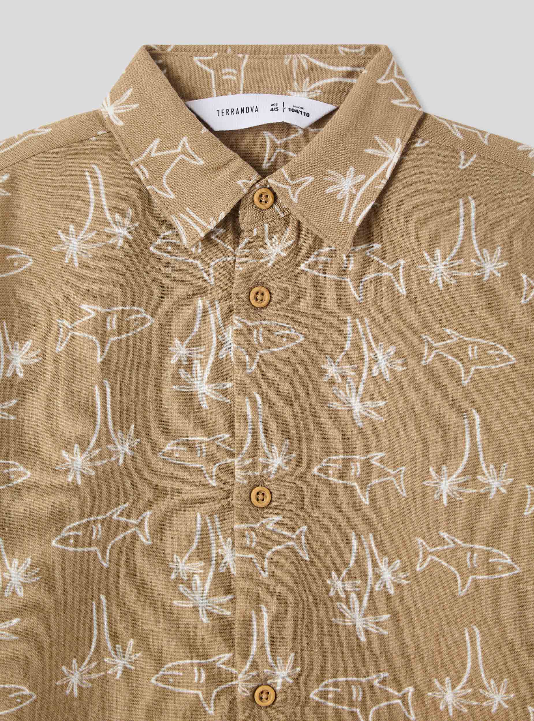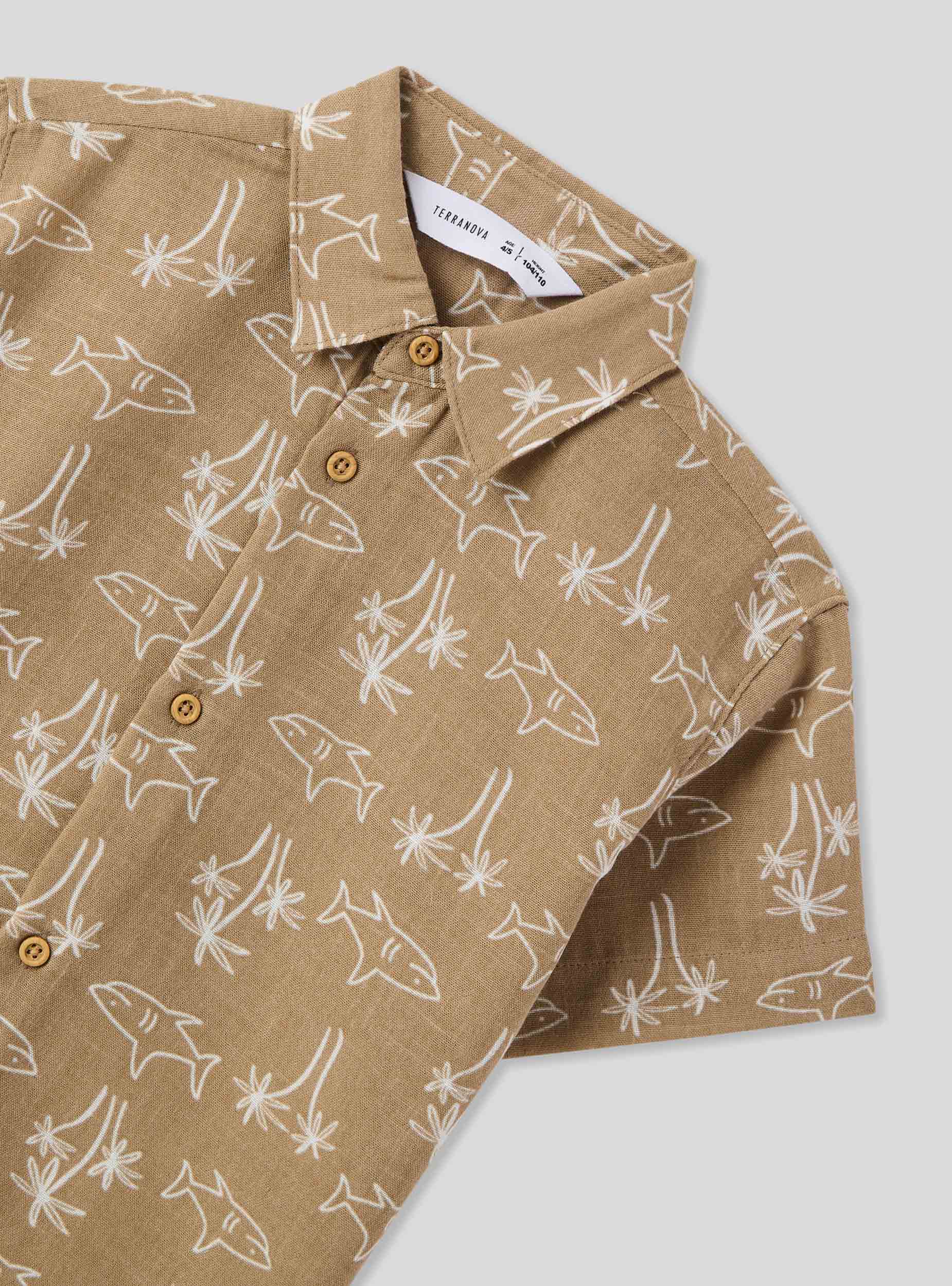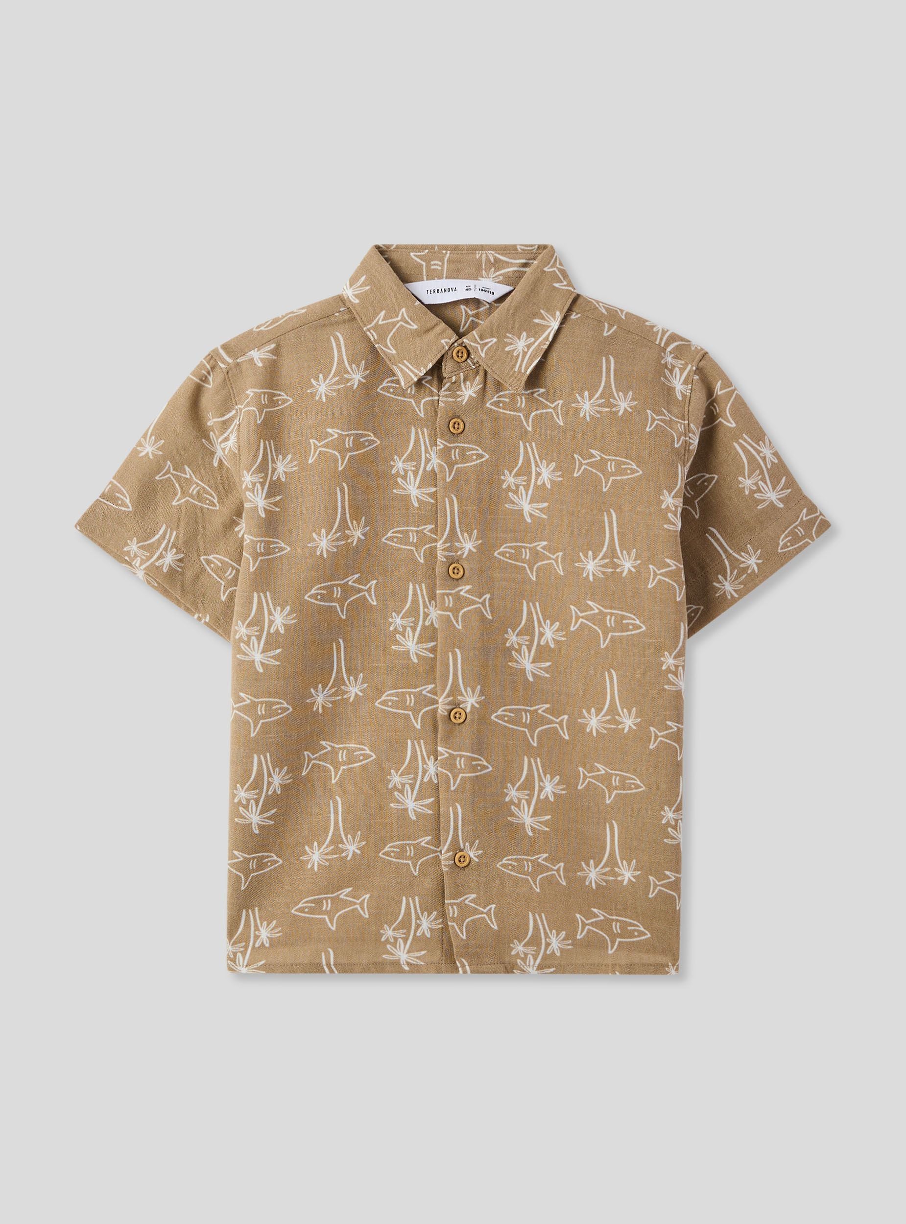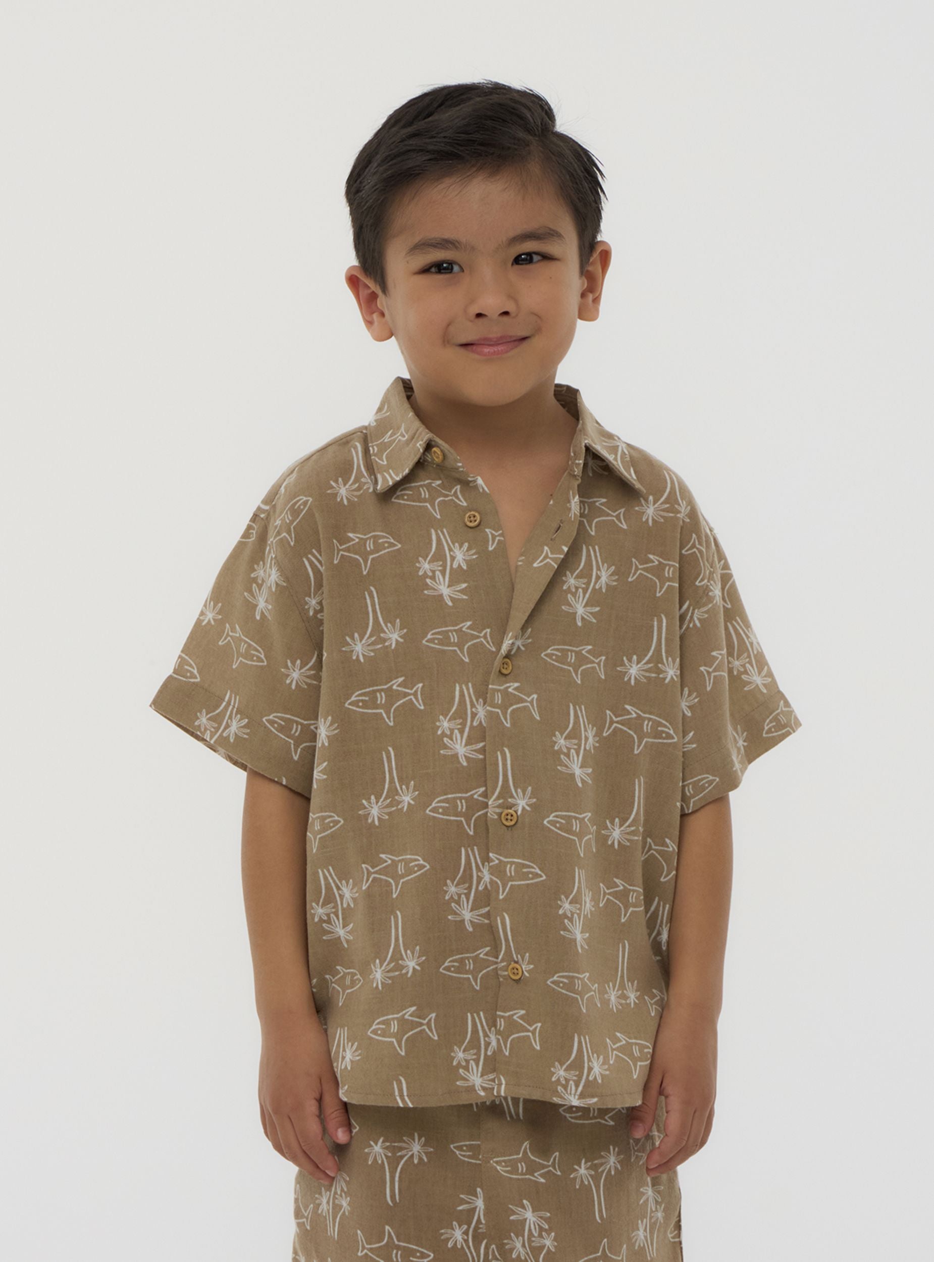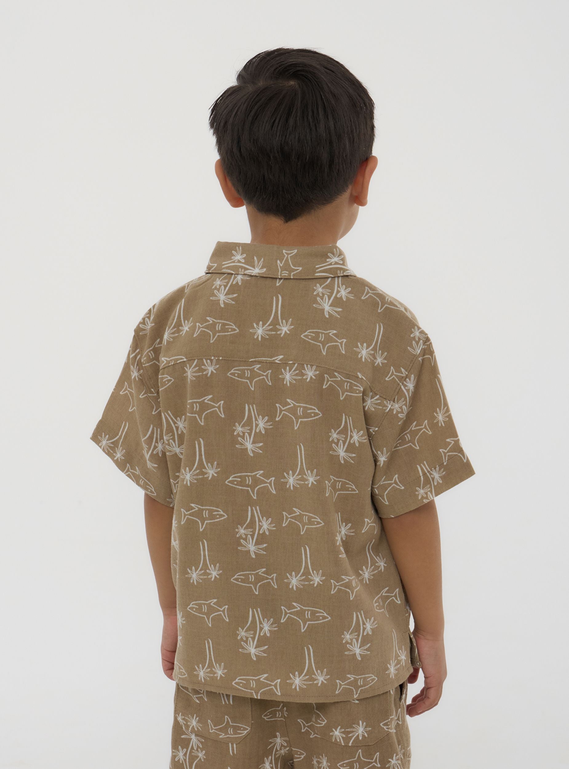 Camicia da bimbo con maniche corte, perfetta per aggiungere un tocco di allegria al guardaroba dei più piccoli. Il design presenta una fantasia vivace con squali stilizzati, ideale per chi ama il mare e l'avventura. La chiusura con bottoni la rende pratica da indossare e regala un tocco curato al look. Perfetta da abbinare a pantaloncini o jeans per un outfit comodo e originale.Dettagli