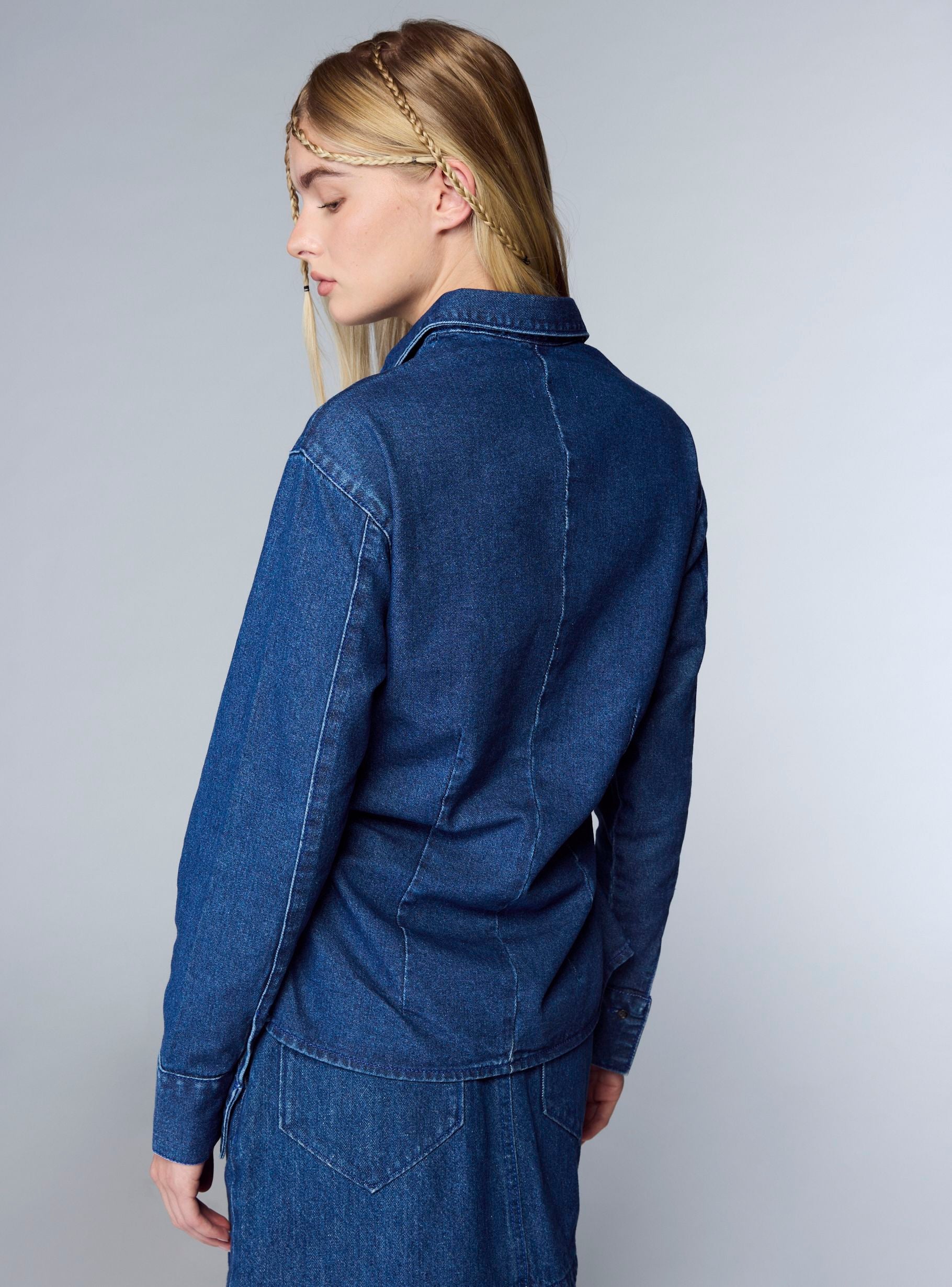 Camicia da donna in denim a maniche lunghe con colletto e chiusura frontale con bottoni. Tinta unita con arricciature ai fianchi, arricchita da lacci da chiudere a fiocco. Fondo leggermente arrotondato, polsini con bottone e linea dritta di media lunghezza. Ideale per look casual chic, si abbina a jeans slim o pantaloni sartoriali per un tocco urban raffinato. Questo articolo fa parte del progetto TRNPOPLAB nato dalla collaborazione con NABA Milano. Gli studenti di fashion design hanno dato vita a collezioni ispirate ai trend più cool del momento. E ora vedranno le loro creazioni prendere vita e arrivare direttamente nelle tue mani!Dettagli