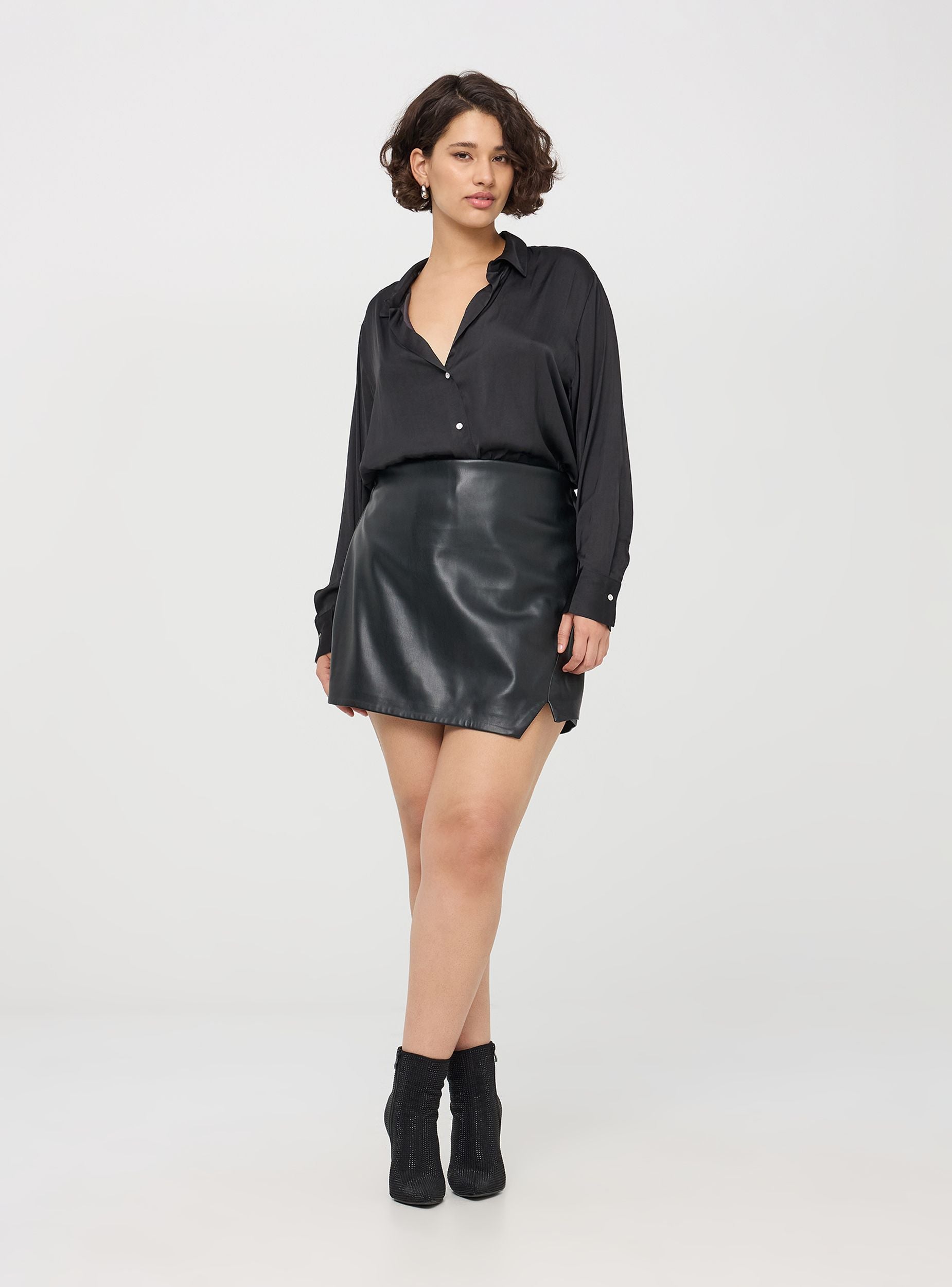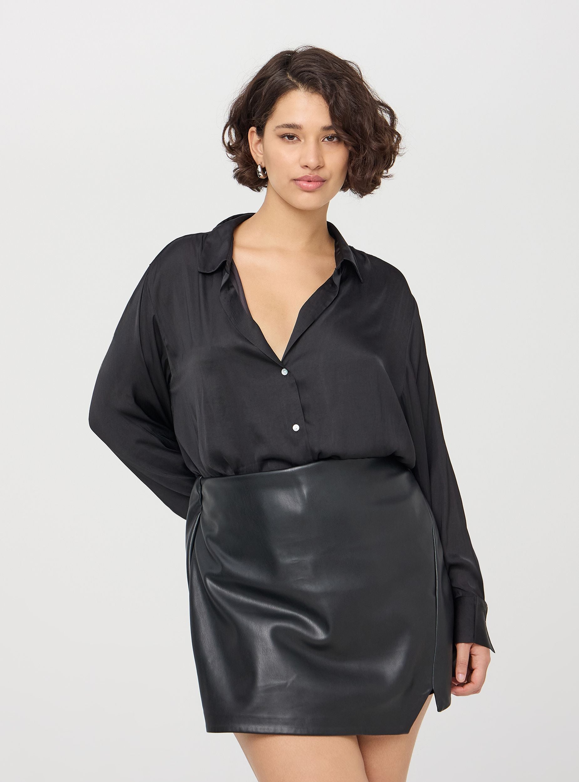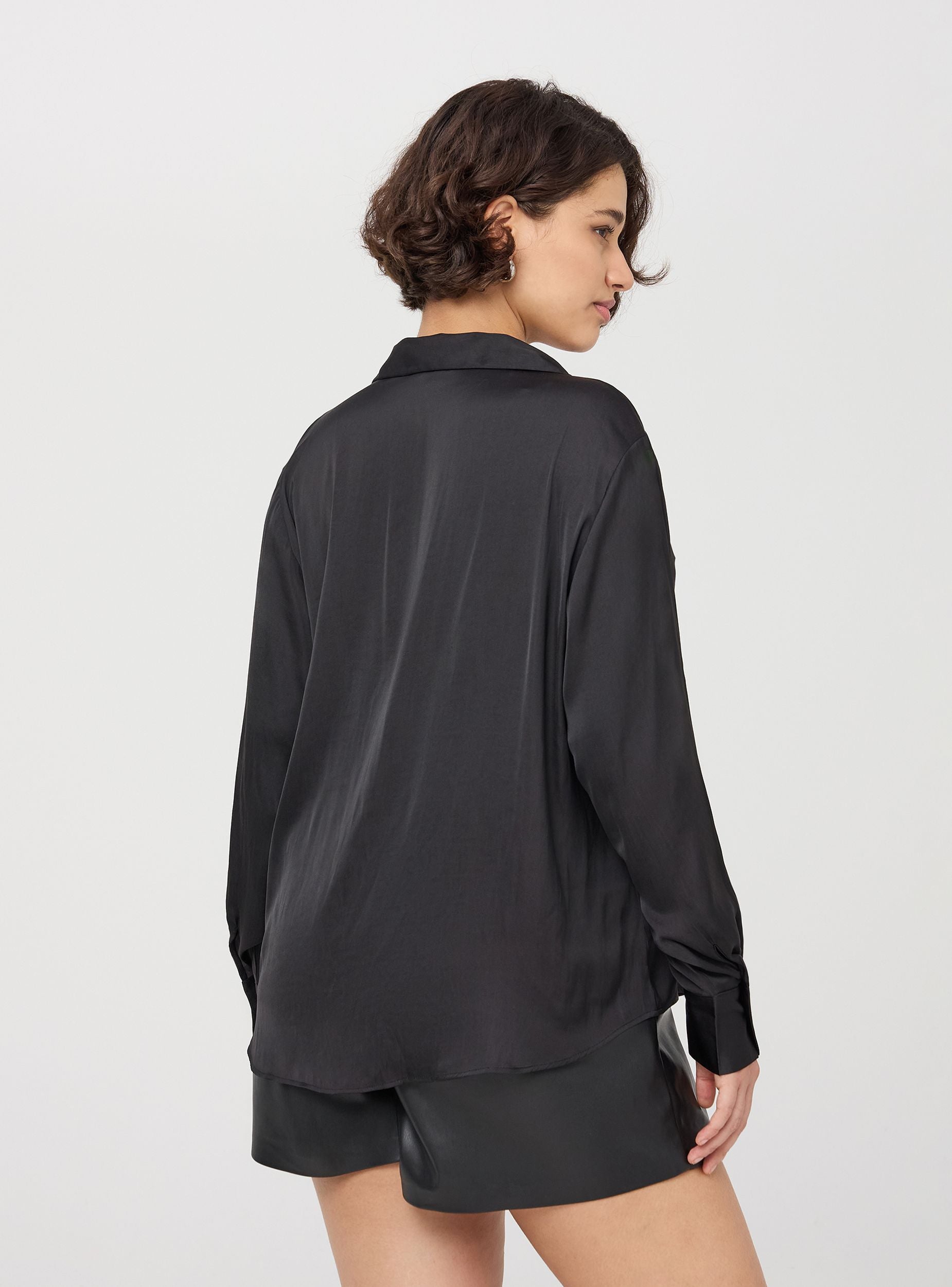 Camicia in effetto raso da donna caratterizzata da una linea classica e raffinata. Presenta maniche lunghe, colletto e una chiusura frontale con bottoni. Il tessuto in effetto raso dona un tocco di eleganza, ideale per occasioni formali o per un look chic e sofisticato.Dettagli