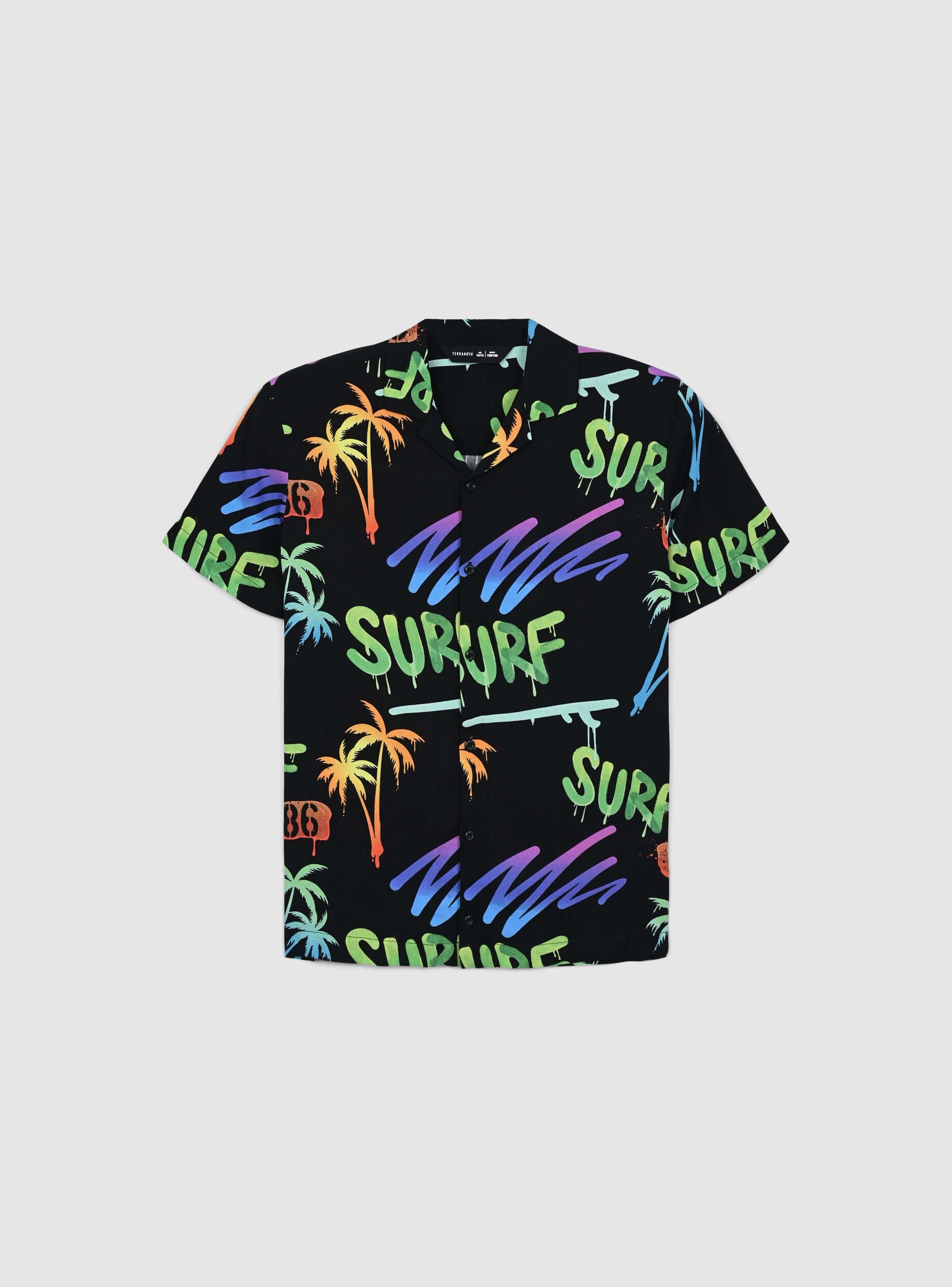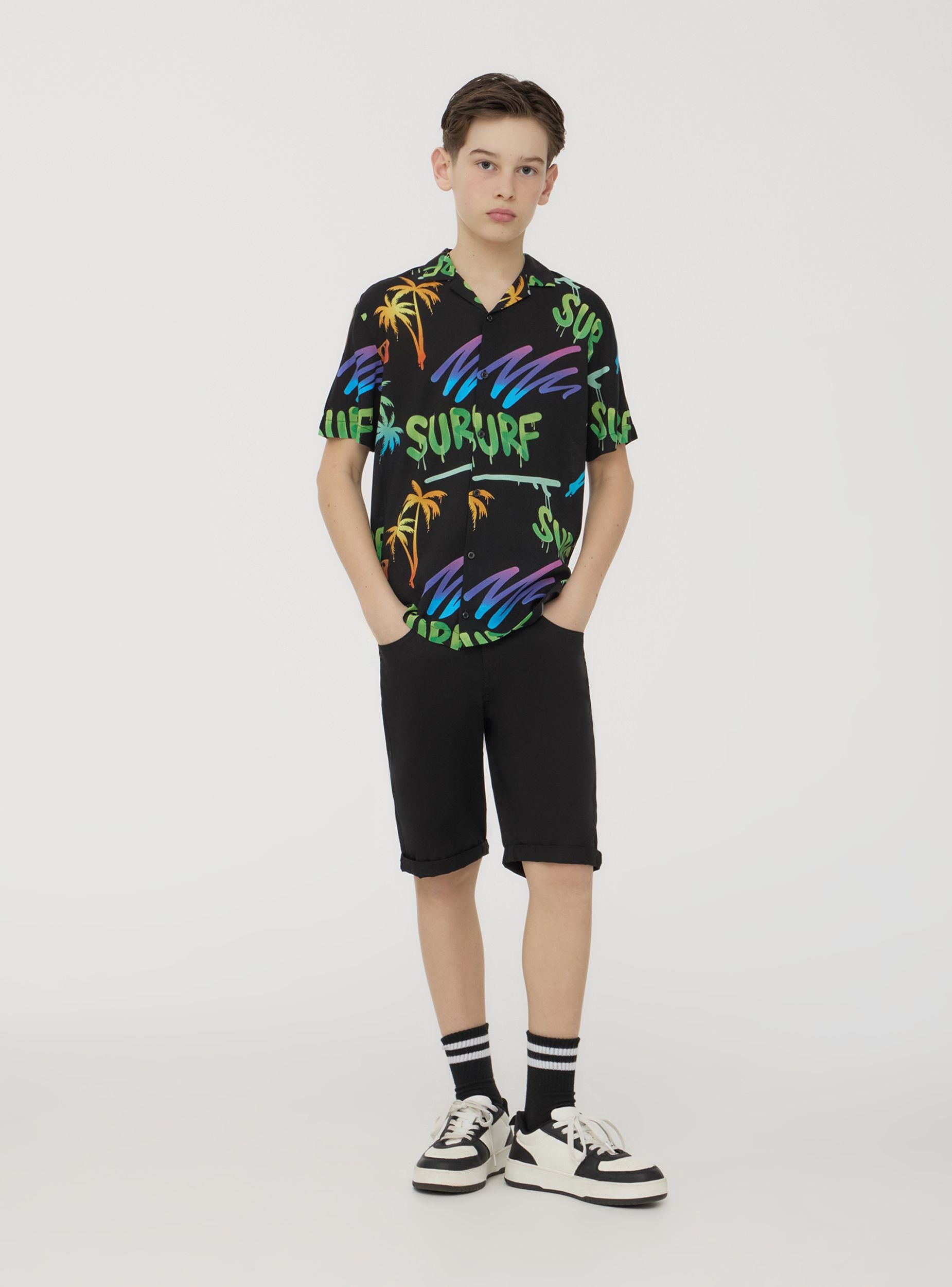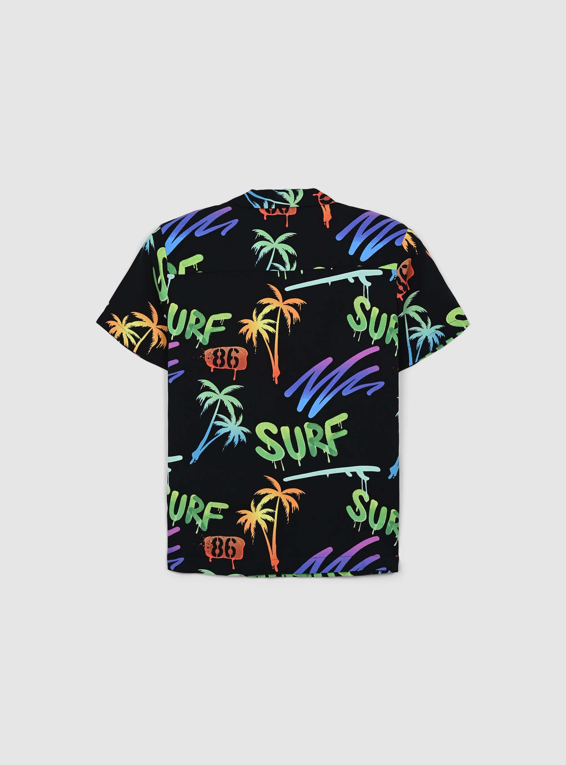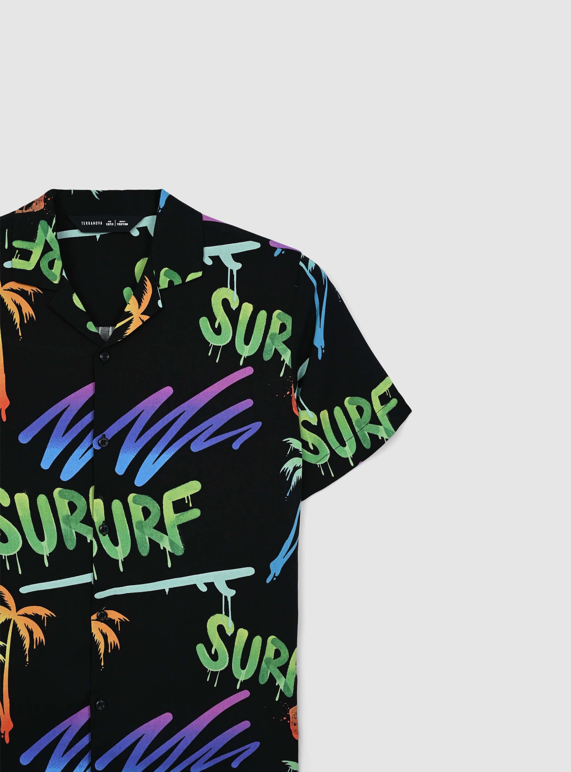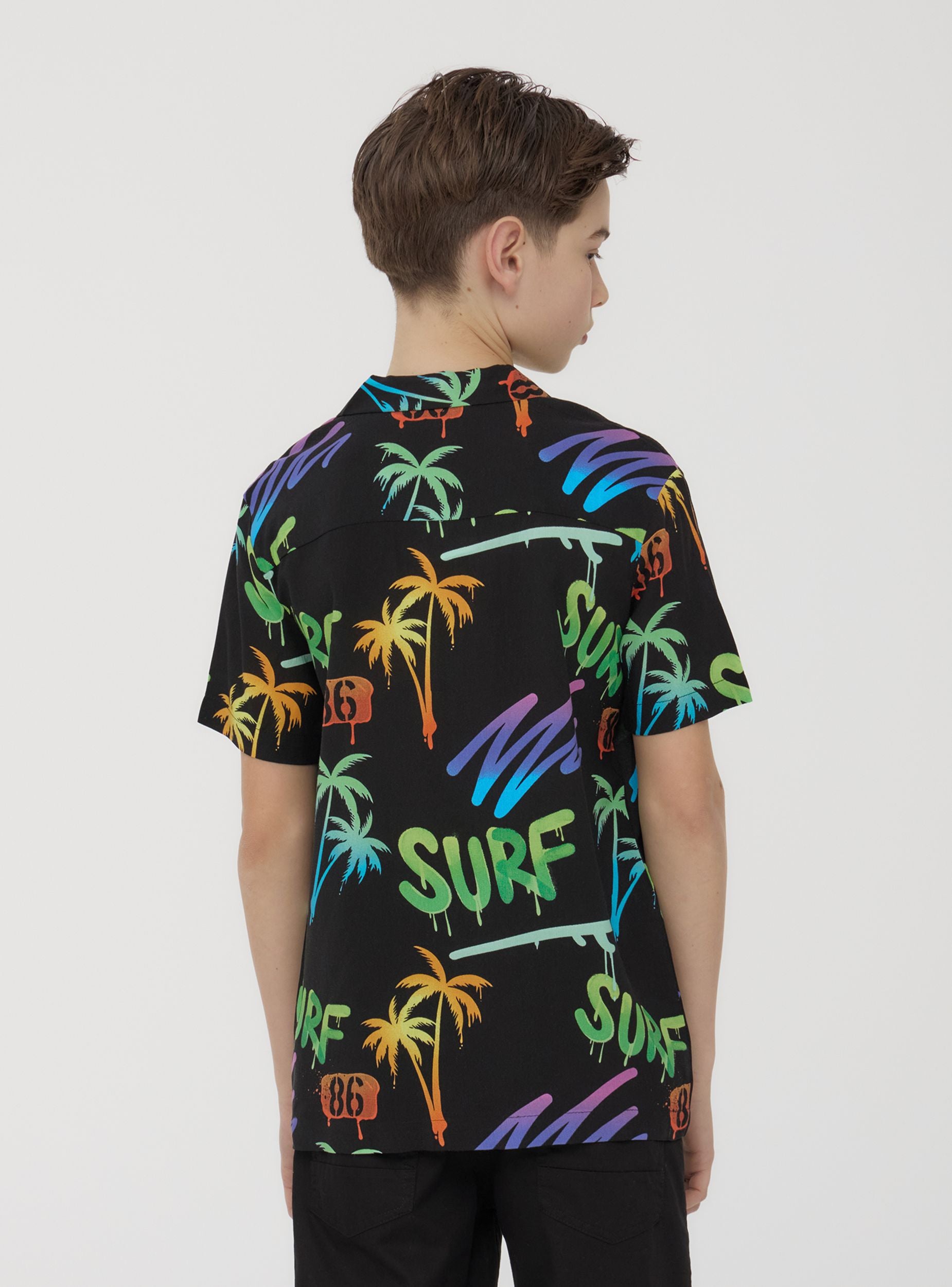 Camicia da bambino a maniche corte, perfetta per un look estivo vivace e alla moda. Realizzata in viscosa, offre una vestibilità leggera e confortevole. Il design si distingue per una stampa tropicale con palme e dettagli fluo che aggiungono un tocco di energia e dinamismo. La chiusura con bottoni completa il modello, rendendolo pratico da indossare. Ideale per creare outfit freschi e divertenti, perfetti per le giornate più calde.Dettagli