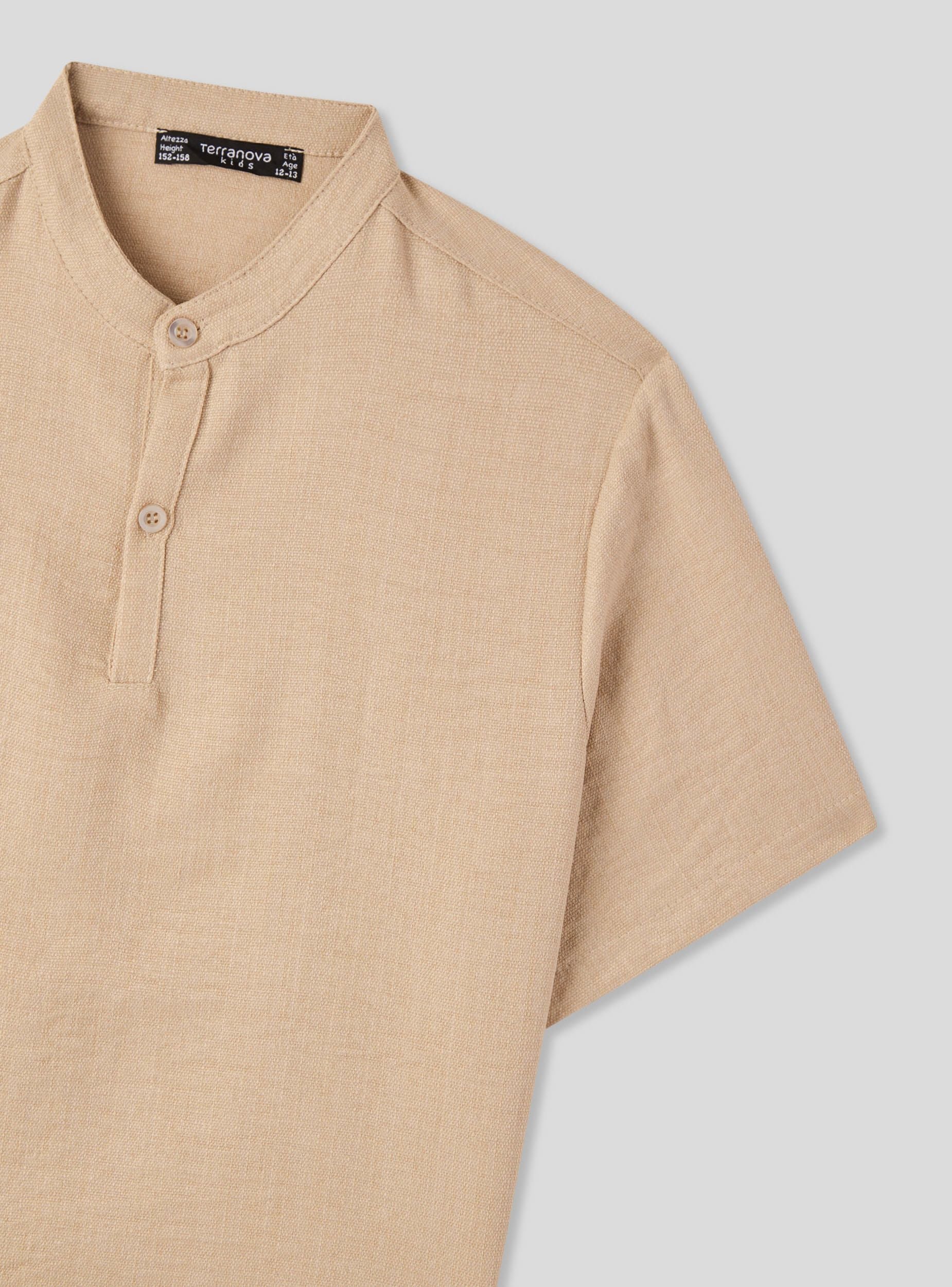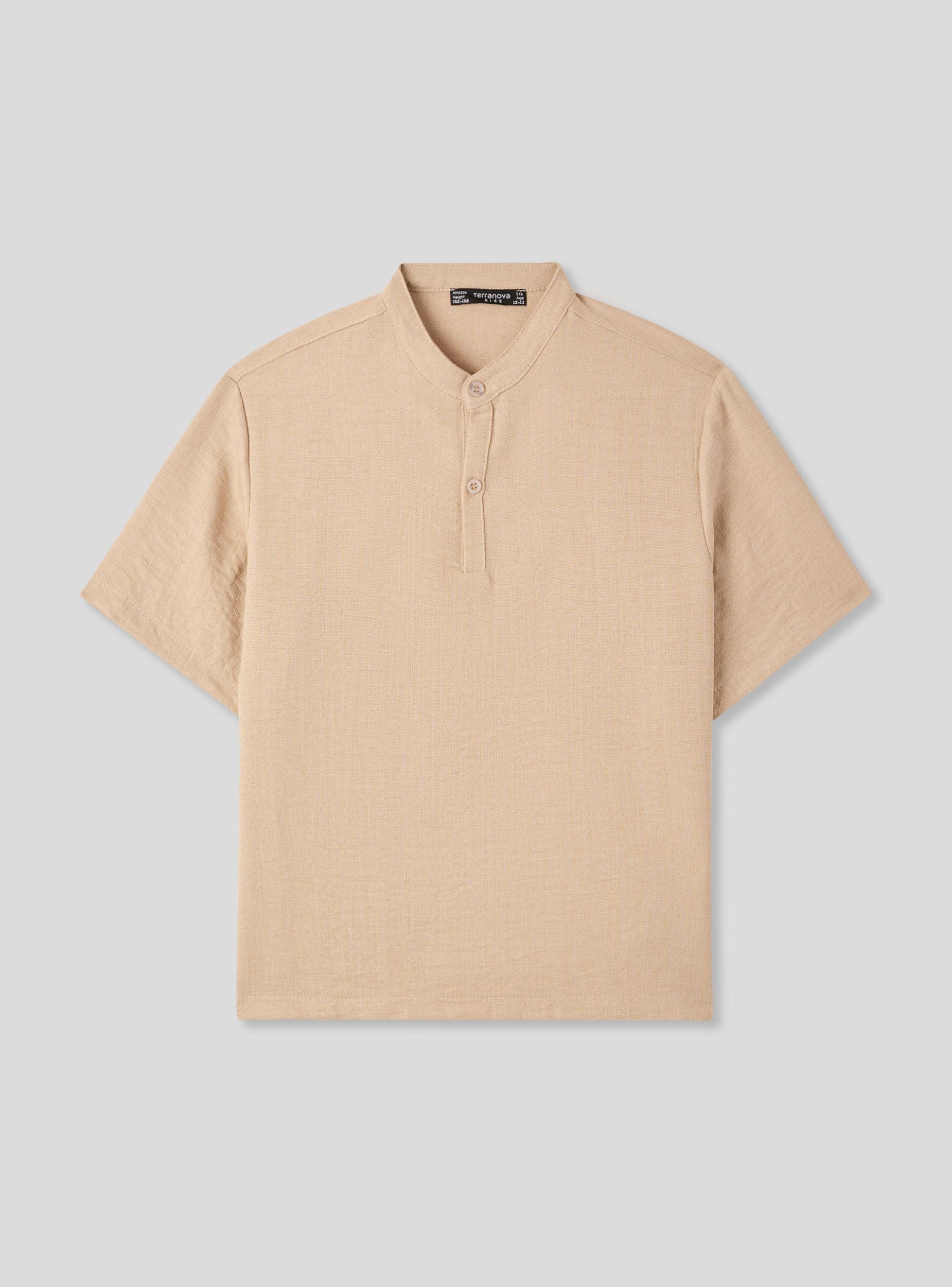 Camicia a manica corta da bambino, ideale per look casual e versatili durante la stagione calda. Il design presenta un collo alla coreana con bottoni, perfetta per ogni occasione e per essere abbinata a pantaloni chino o bermuda. Il tessuto leggero effetto lino a tinta unita e la vestibilità regolare assicura comfort e libertà di movimento.Dettagli