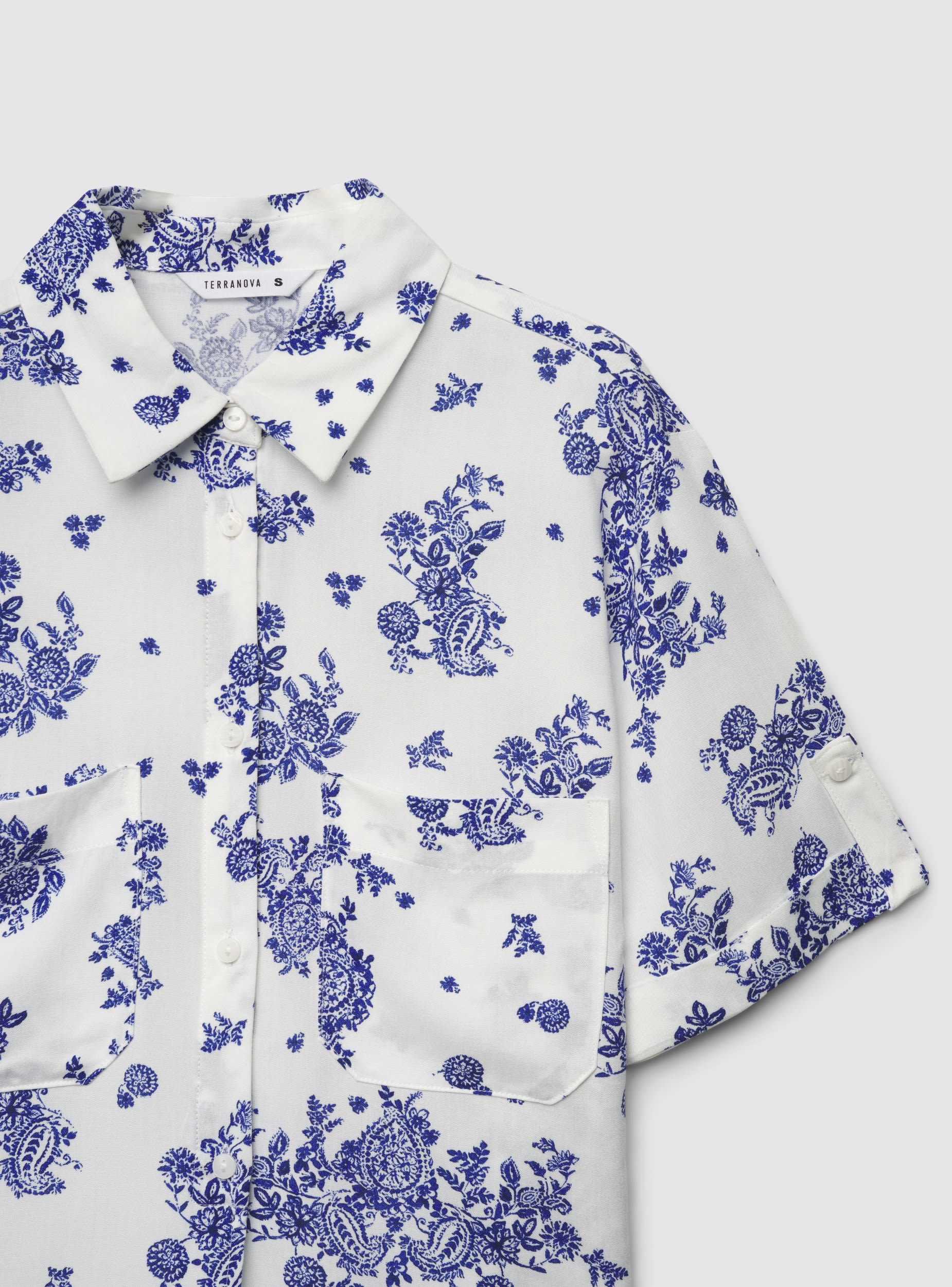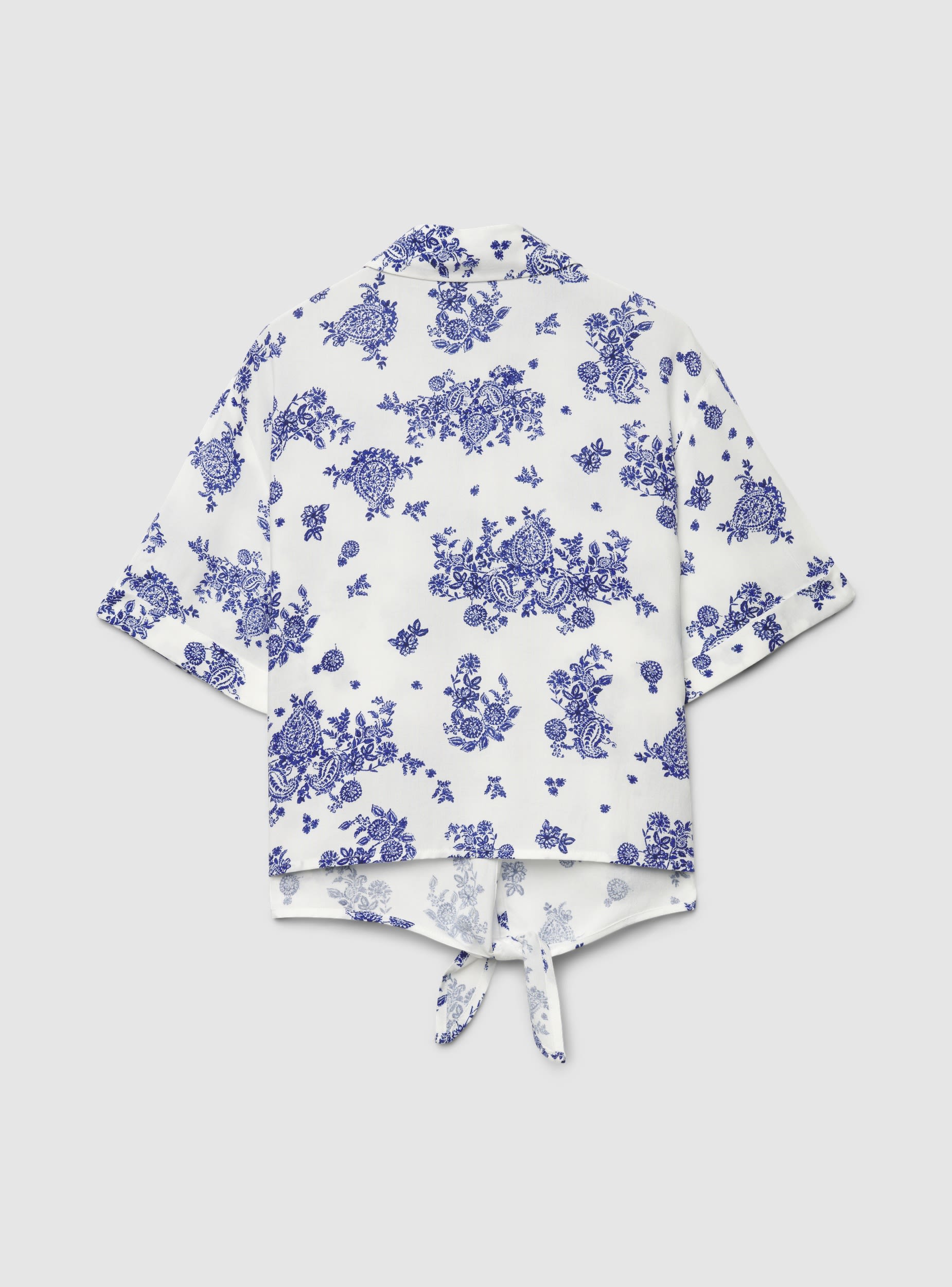 Camicia da donna a maniche corte con stampa all over, ideale per look da giorno e weekend. Il modello crop presenta colletto a camicia e chiusura frontale con bottoni, completata da tasche applicate sul petto. Il fondo è rifinito con nodo frontale che definisce la silhouette e valorizza jeans, pantaloni a vita alta o gonne fluide.Dettagli