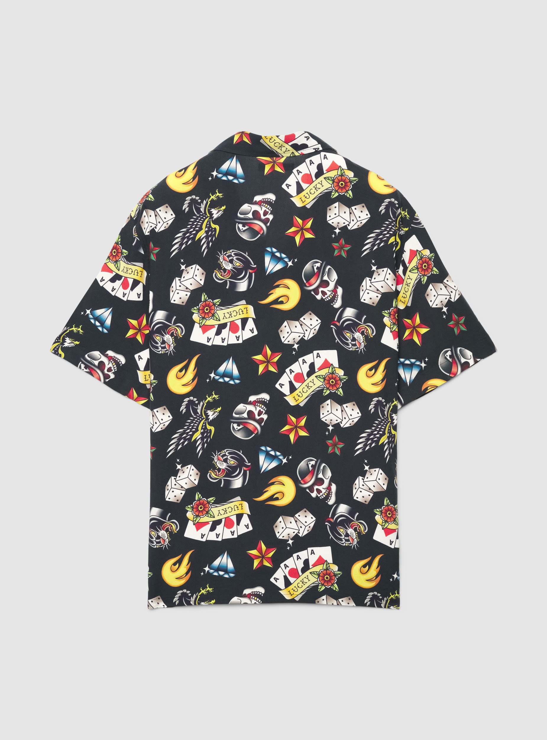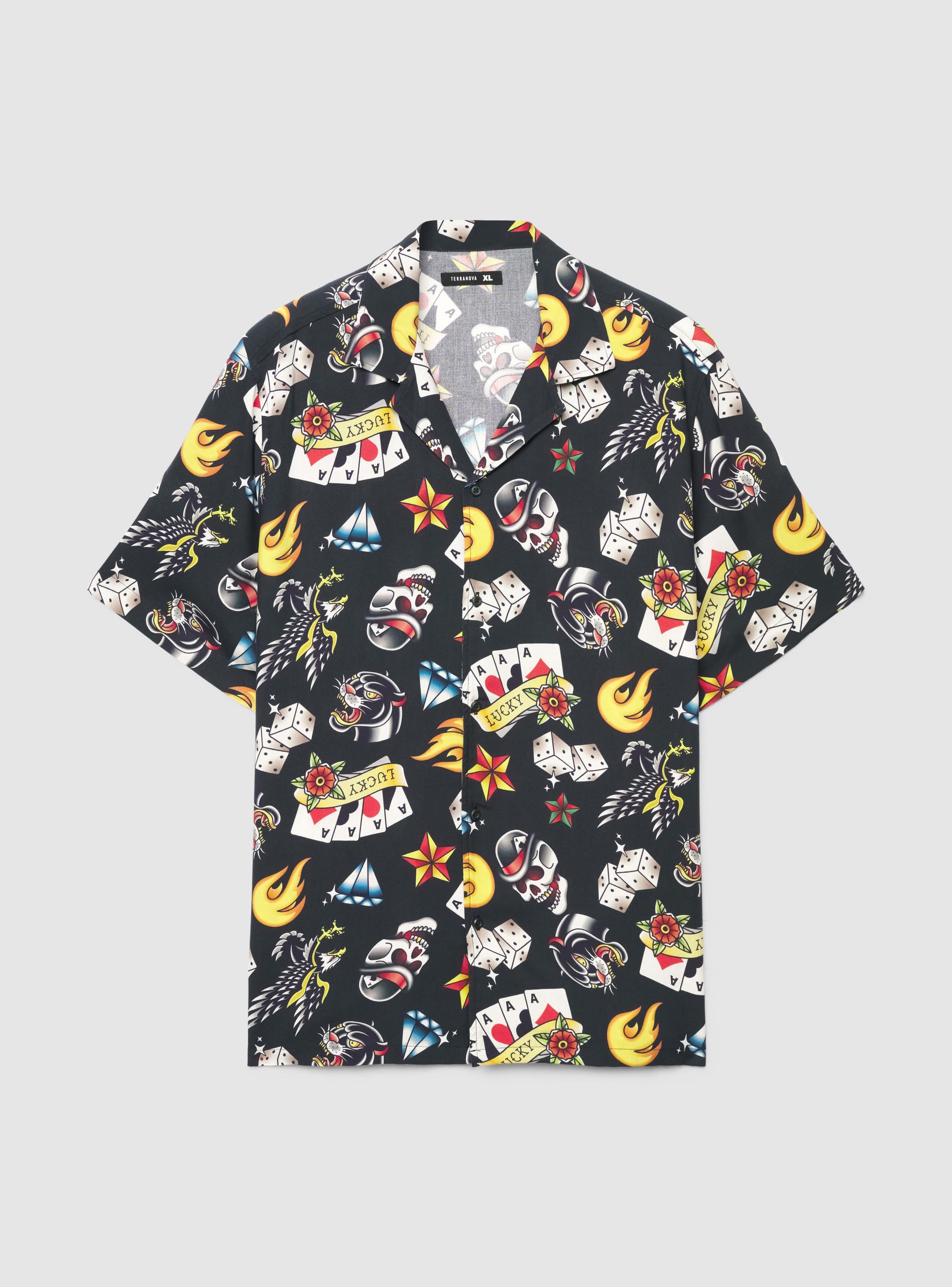 Camicia da uomo a maniche corte in stile bowling, con colletto aperto e chiusura frontale con bottoni. La stampa allover a tema carte e dadi dona un look deciso e originale, ideale per tempo libero, serate estive e festival. Vestibilità regular facile da abbinare a jeans o pantaloni chino per outfit urban e trendy.Dettagli