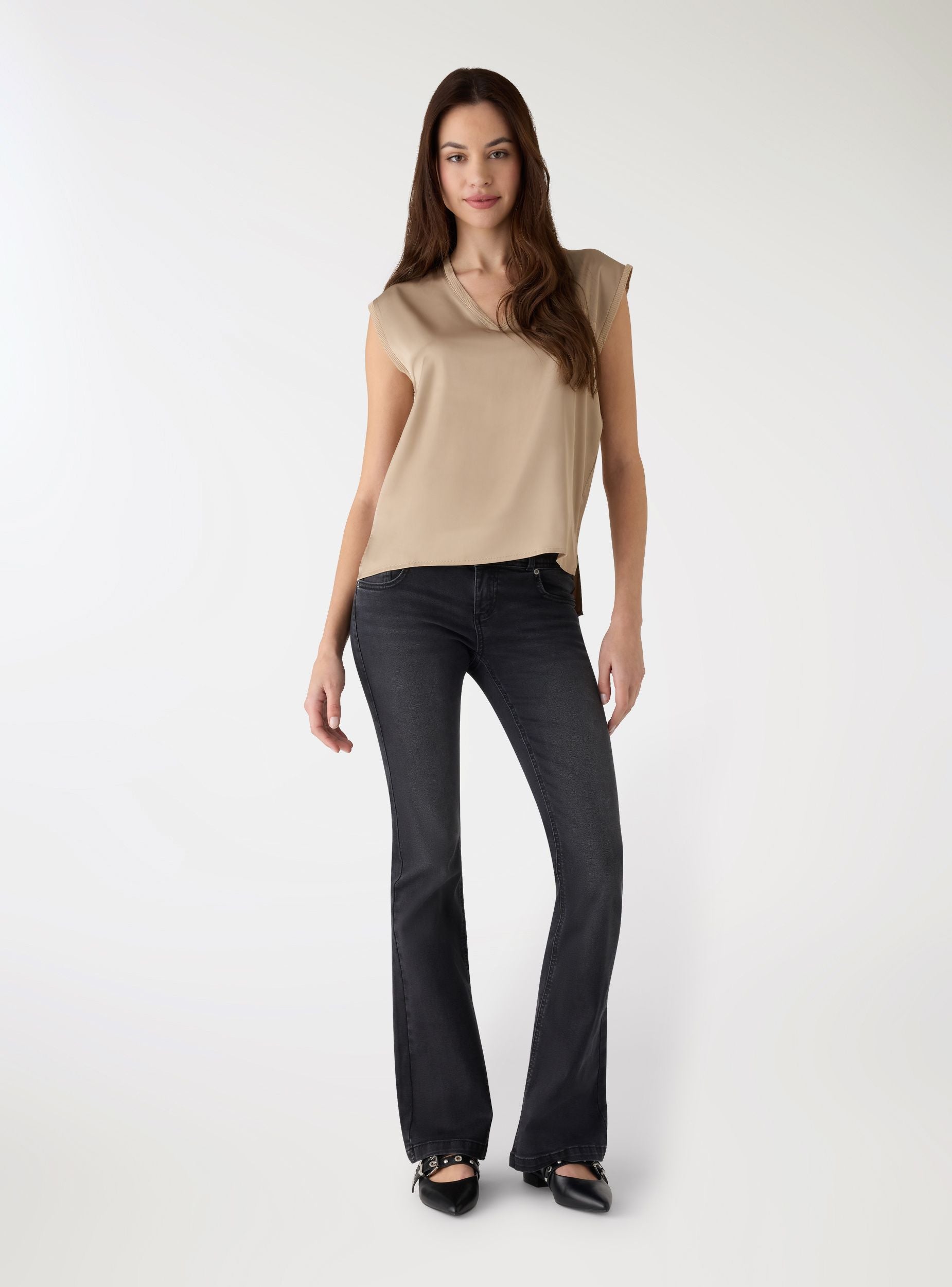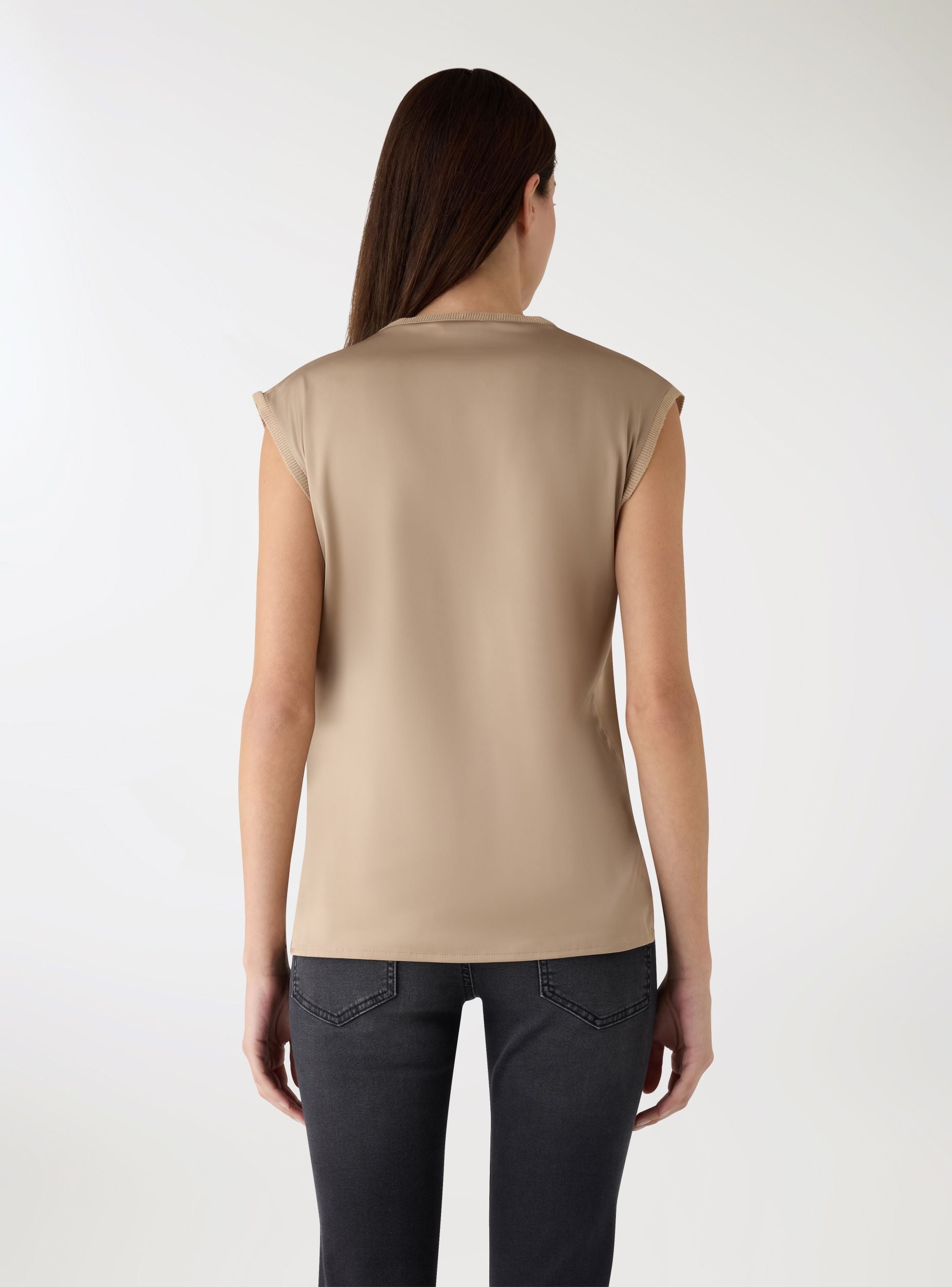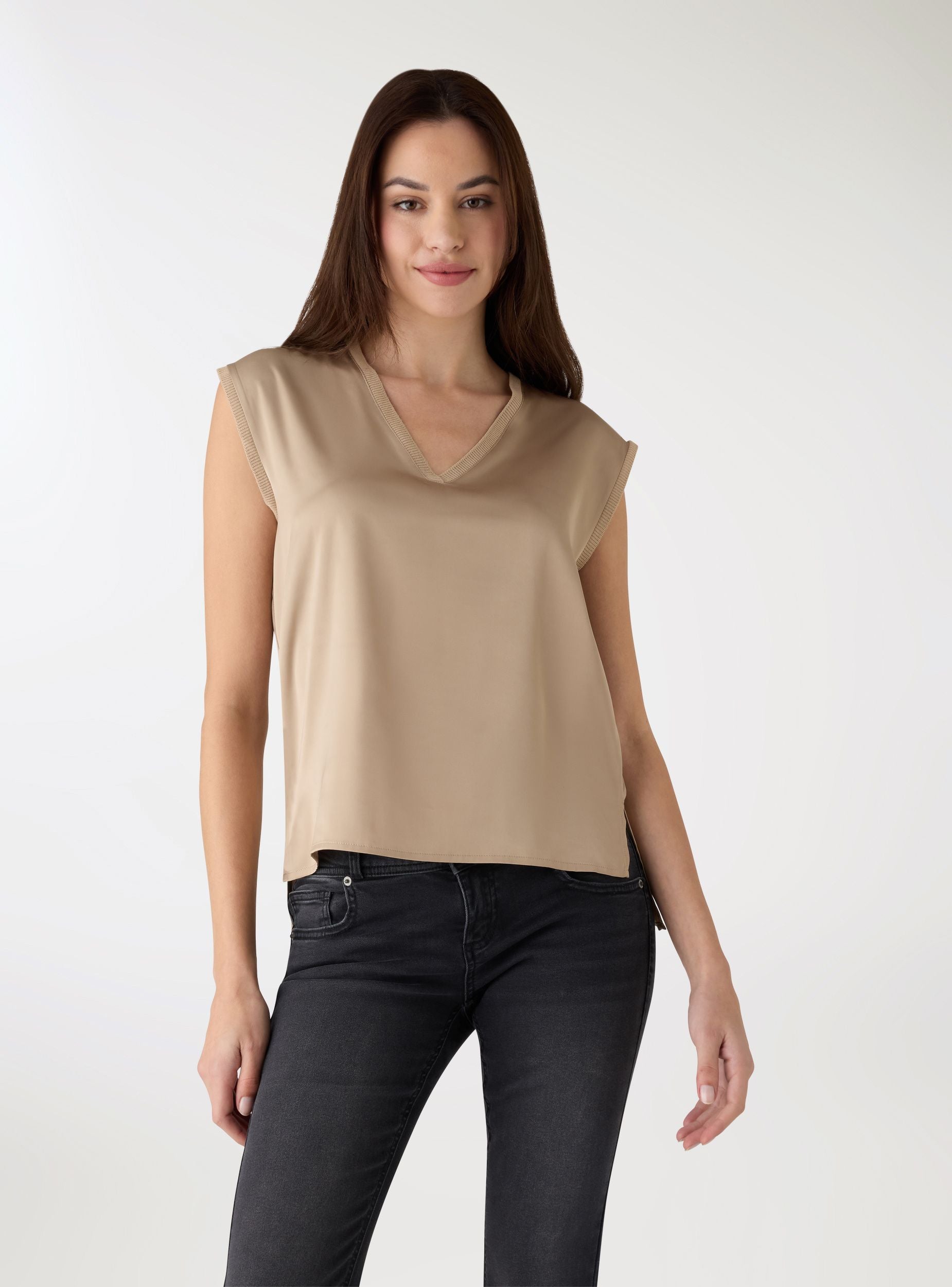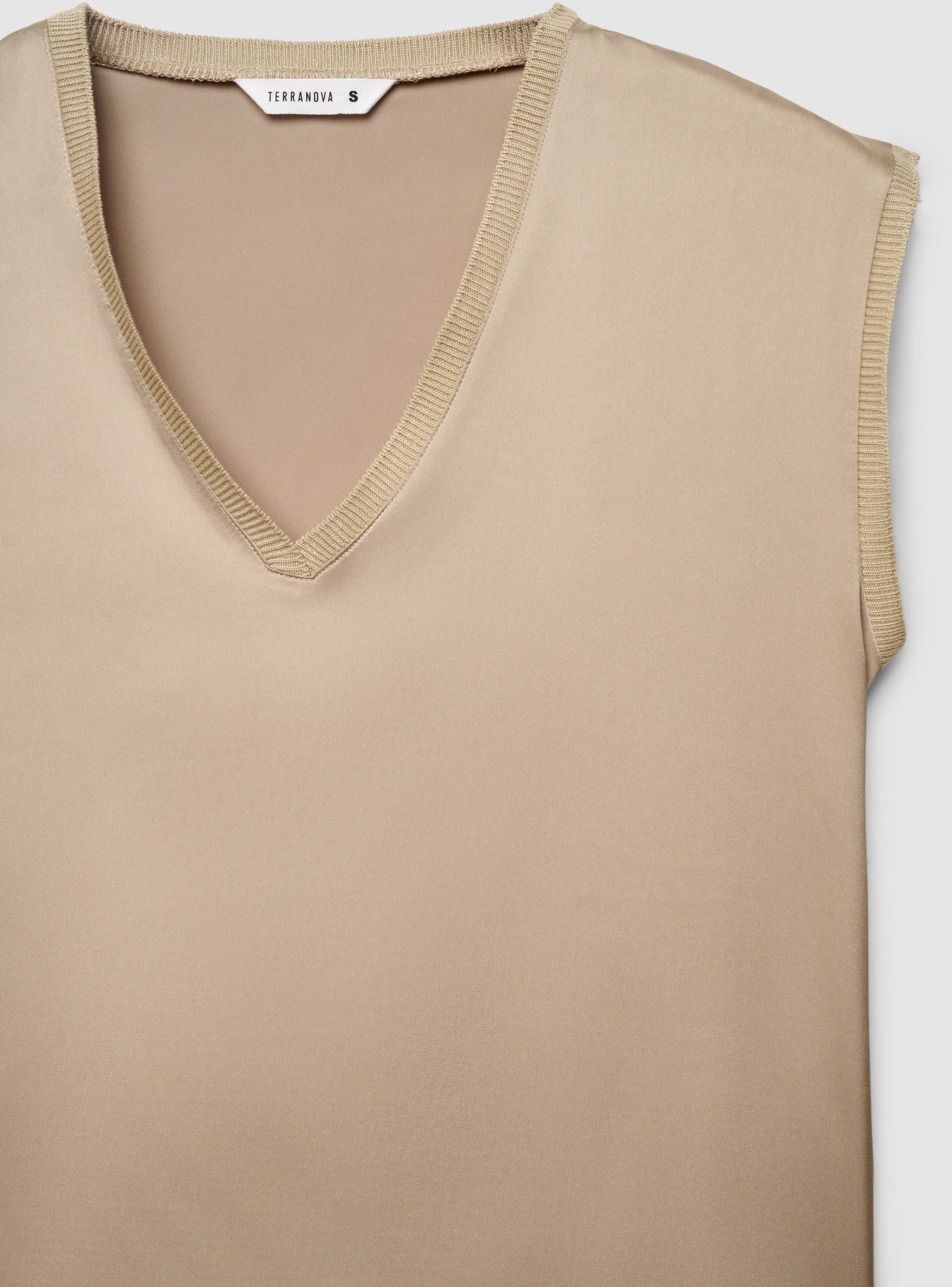 Top da donna a tinta unita, senza maniche e con scollo a V profondo rifinito a costine. Linea dritta e lunghezza normale, ideale per ufficio e tempo libero. Il design minimal facilita gli abbinamenti con jeans, gonne midi o pantaloni eleganti, mentre l’orlo leggermente doppiato dona un tocco curato. Perfetta sotto blazer o cardigan per look versatili e femminili.Dettagli
