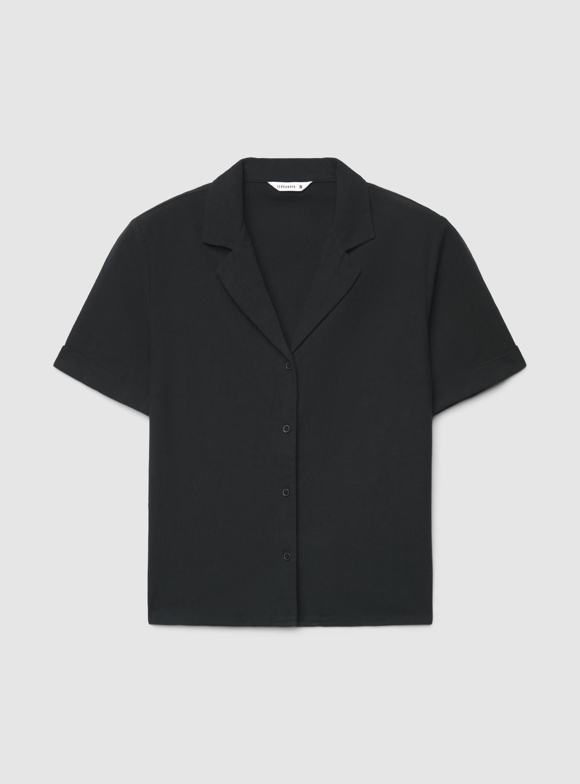 Camicia da donna a maniche corte in tinta unita con collo a rever e chiusura frontale con bottoni. Linea ampia, ideale per look estivi rilassati. Perfetta con jeans dritti o shorts e sandali, funziona anche aperta su una canotta per un outfit casual. Dettagli minimal e bordo manica rifinito valorizzano lo stile essenziale e versatile, adatto dal tempo libero all’ufficio informale.Dettagli
