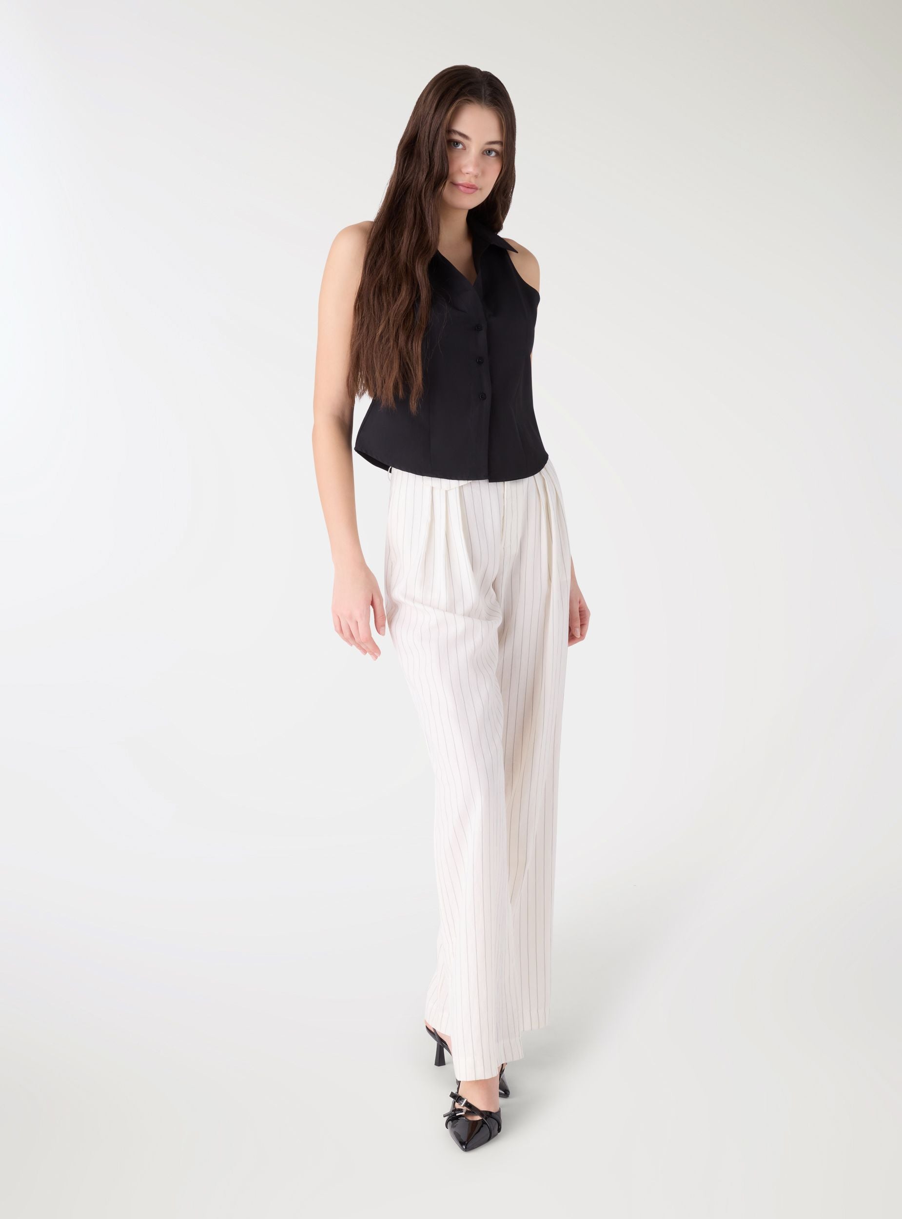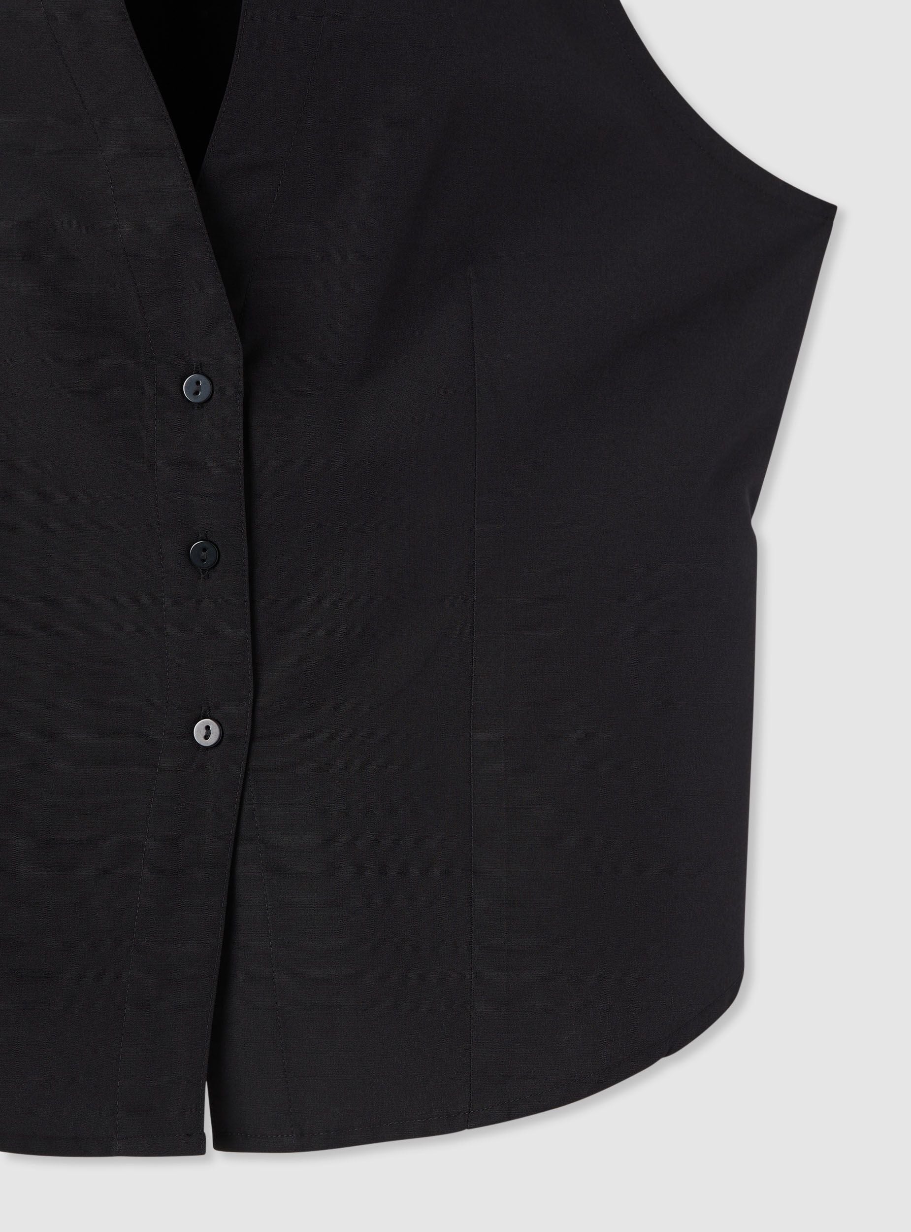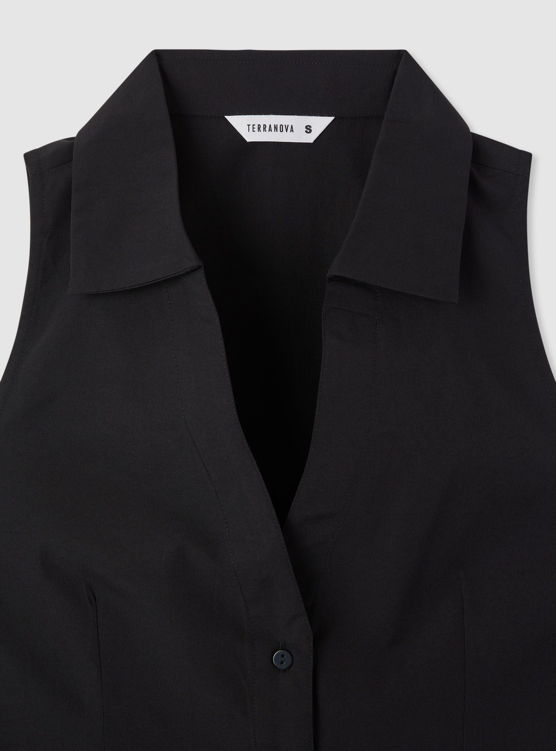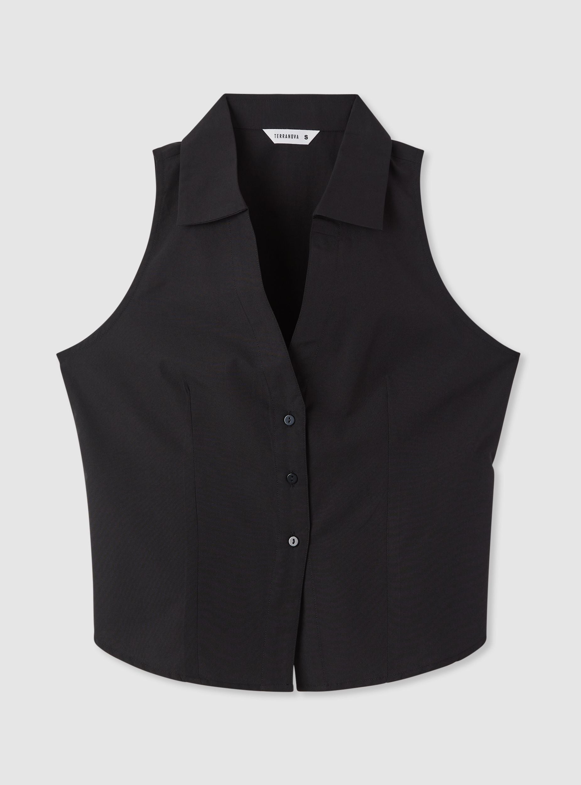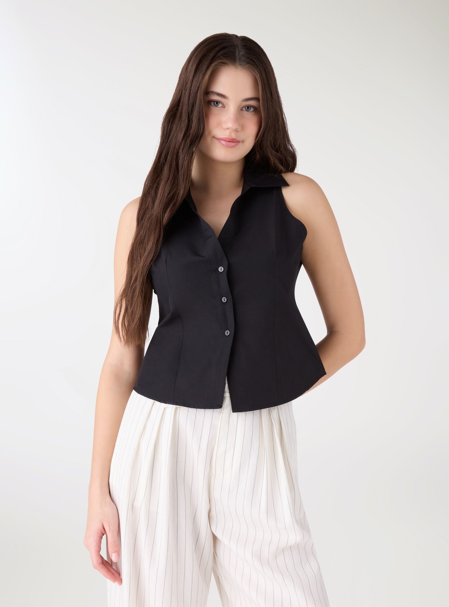 Camicia da donna senza maniche dal design tinta unita con colletto a punta e apertura frontale con bottoni. Linee pulite e taglio regolare, ideale per look quotidiani o per dare un tocco elegante a jeans, pantaloni sartoriali o gonne. Perfetta sotto blazer o cardigan, valorizza la figura grazie alle pince anteriori e all’orlo leggermente arrotondato.Dettagli