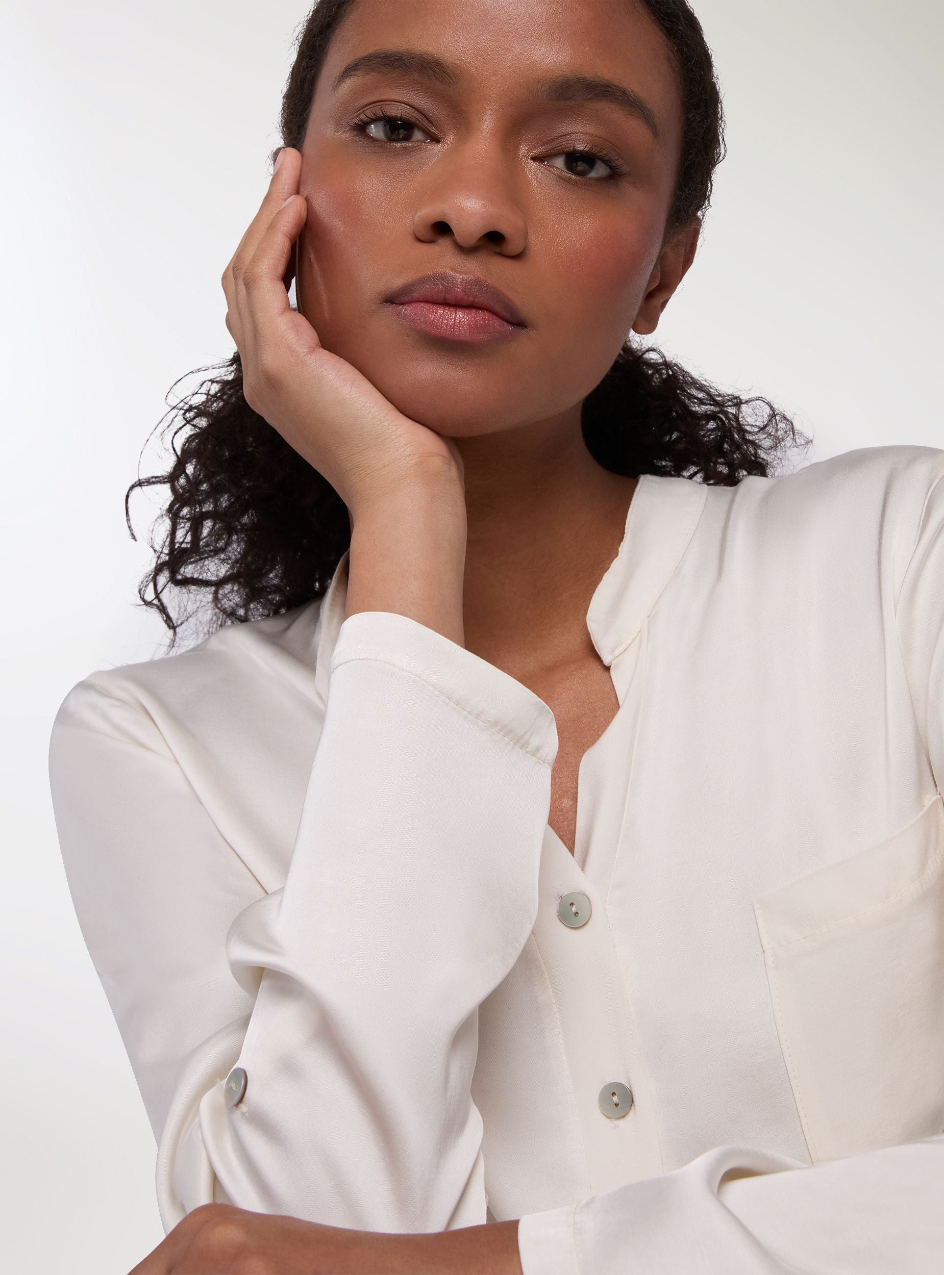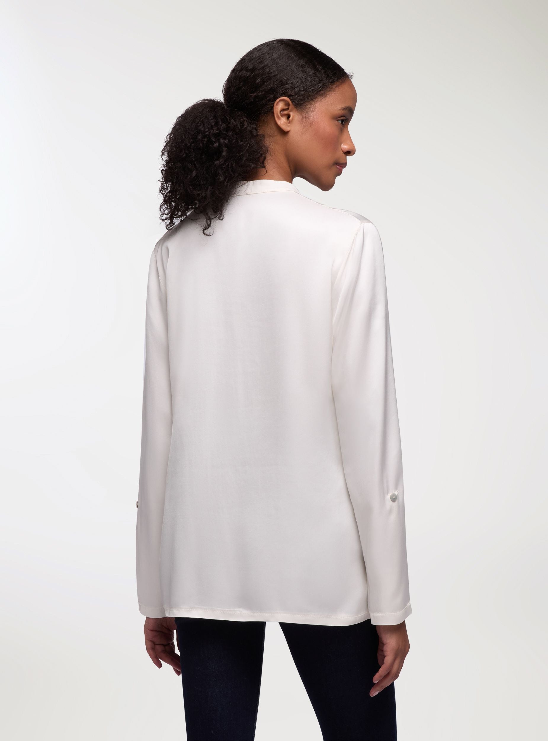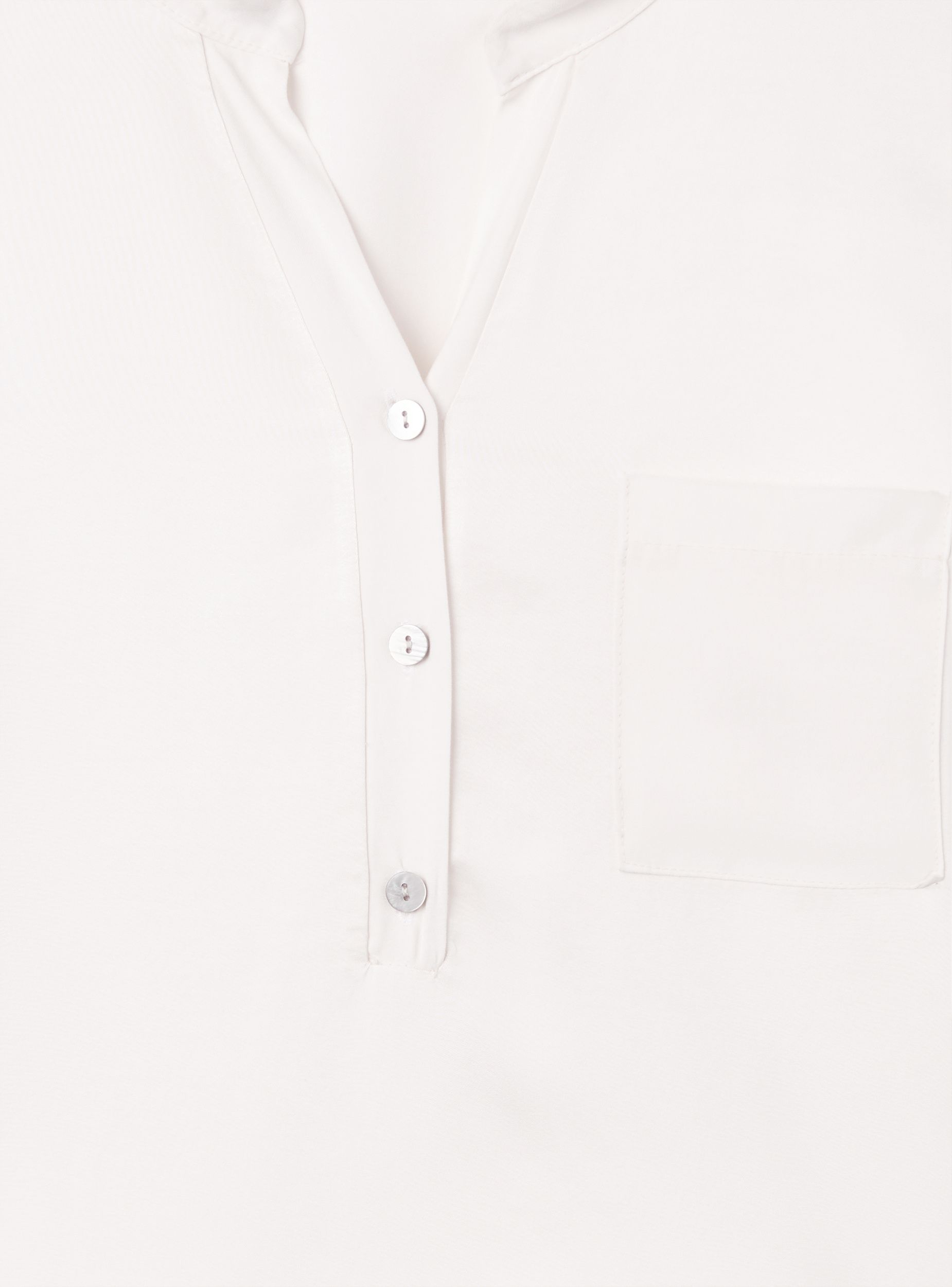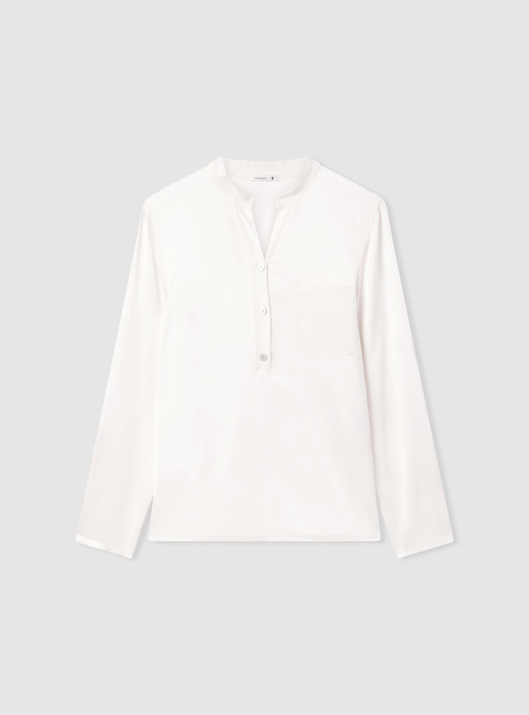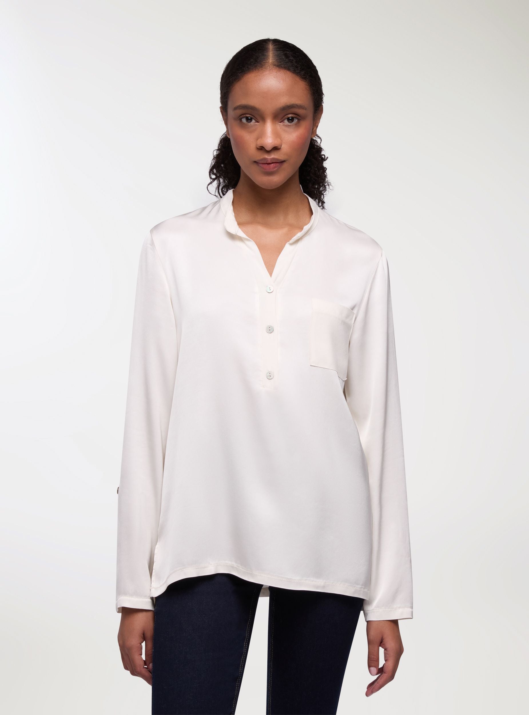 Camicia da donna, effetto raso, con collo alla coreana e scollo a V, maniche lunghe e abbottonatura parziale sul davanti. Il design a tinta unita presenta un taschino sul petto, ideale per look da ufficio o per il tempo libero. Vestibilità regular e lunghezza standard, perfetta con jeans o pantaloni sartoriali, si indossa facilmente sotto blazer o cardigan.Dettagli