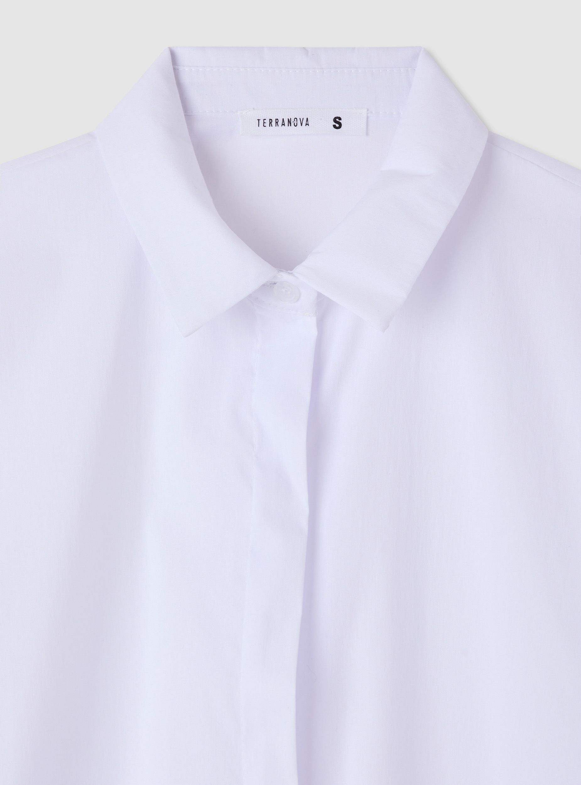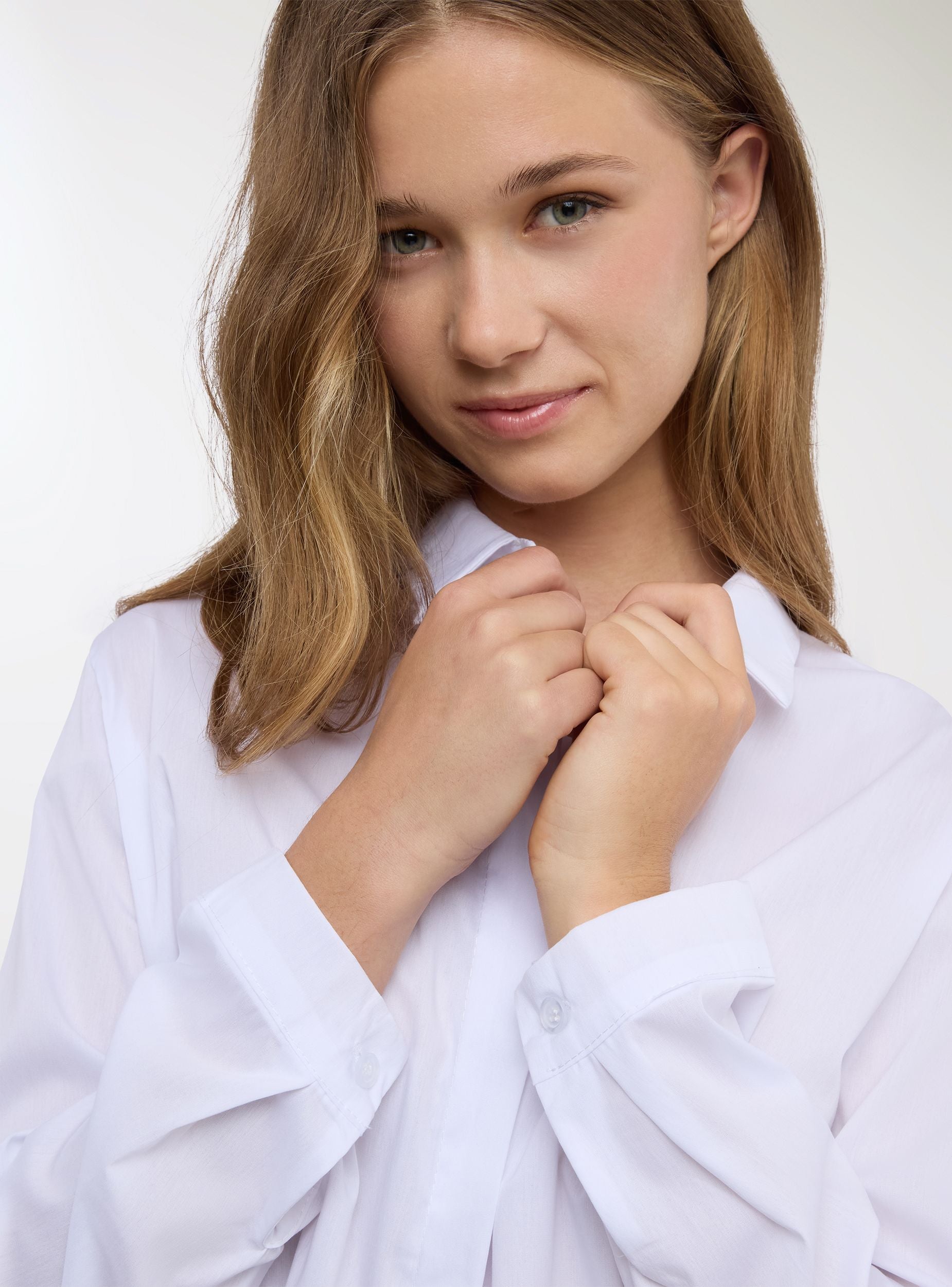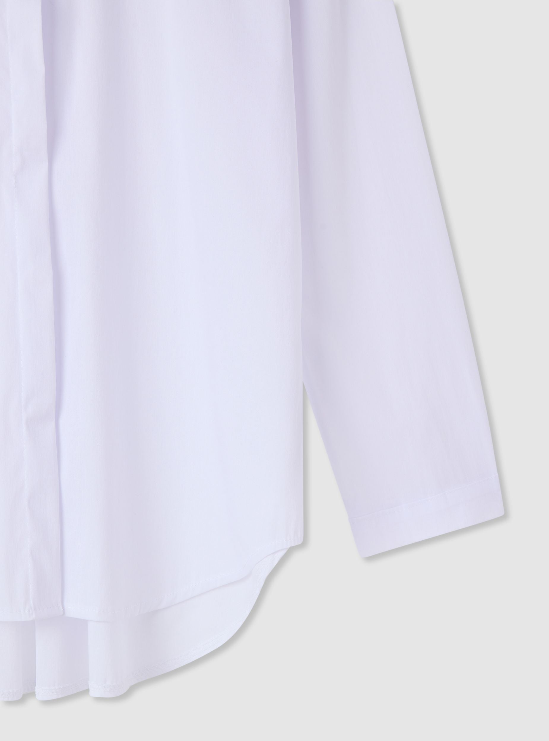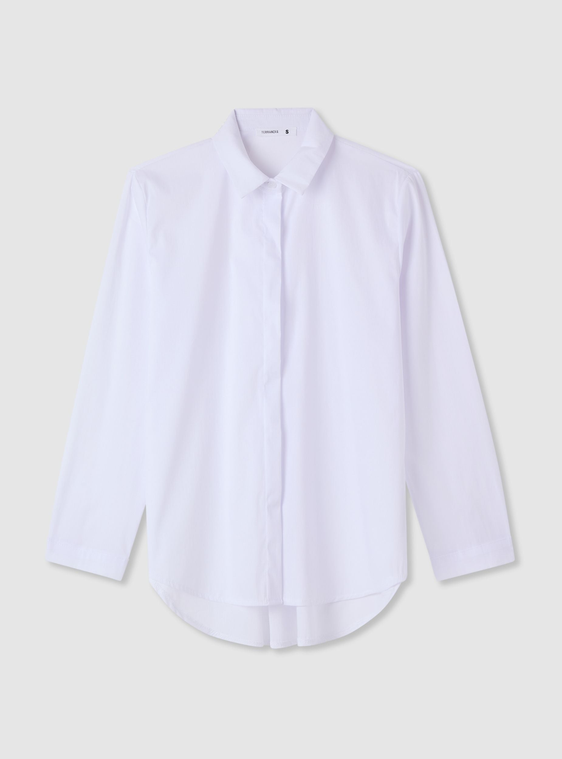 Camicia da donna a tinta unita con vestibilità over e fondo arrotondato più lungo sul retro. Colletto classico, maniche lunghe e chiusura frontale con bottoni coperti donano un look pulito e versatile. Ideale per l’ufficio con pantaloni sartoriali o per il tempo libero su jeans, si presta anche a sovrapposizioni su top o dolcevita. Linea morbida per comfort quotidiano.Dettagli