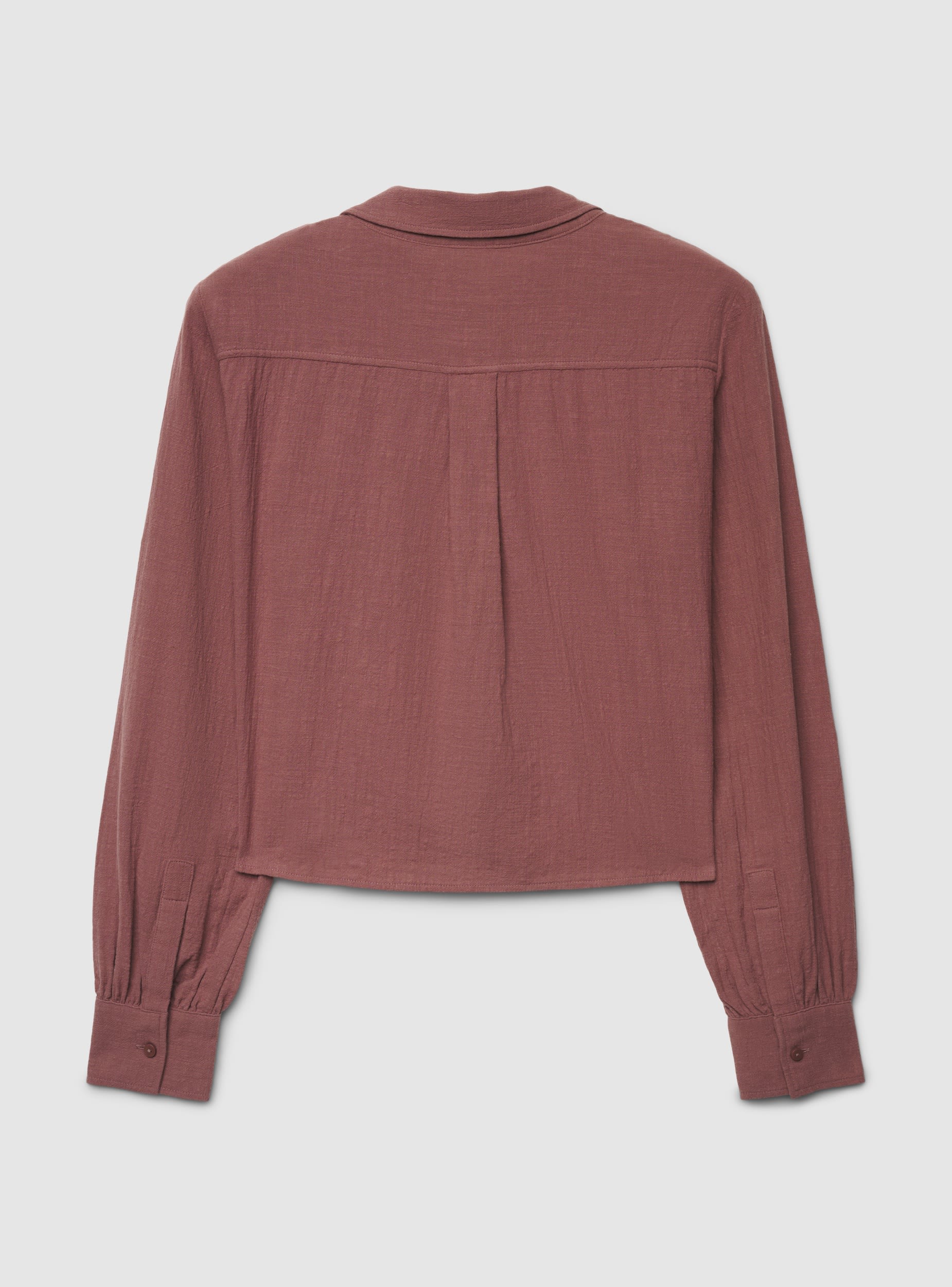 Camicia da donna a tinta unita con silhouette crop e nodo frontale, ideale per look casual e trendy. Colletto classico, maniche lunghe con polsini abbottonati e abbottonatura frontale. La texture effetto lino aggiunge movimento al design. Perfetta con jeans a vita alta o gonne a vita media per uscite di giorno o serate informali, offre una vestibilità regular che valorizza la figura senza costringere.Dettagli