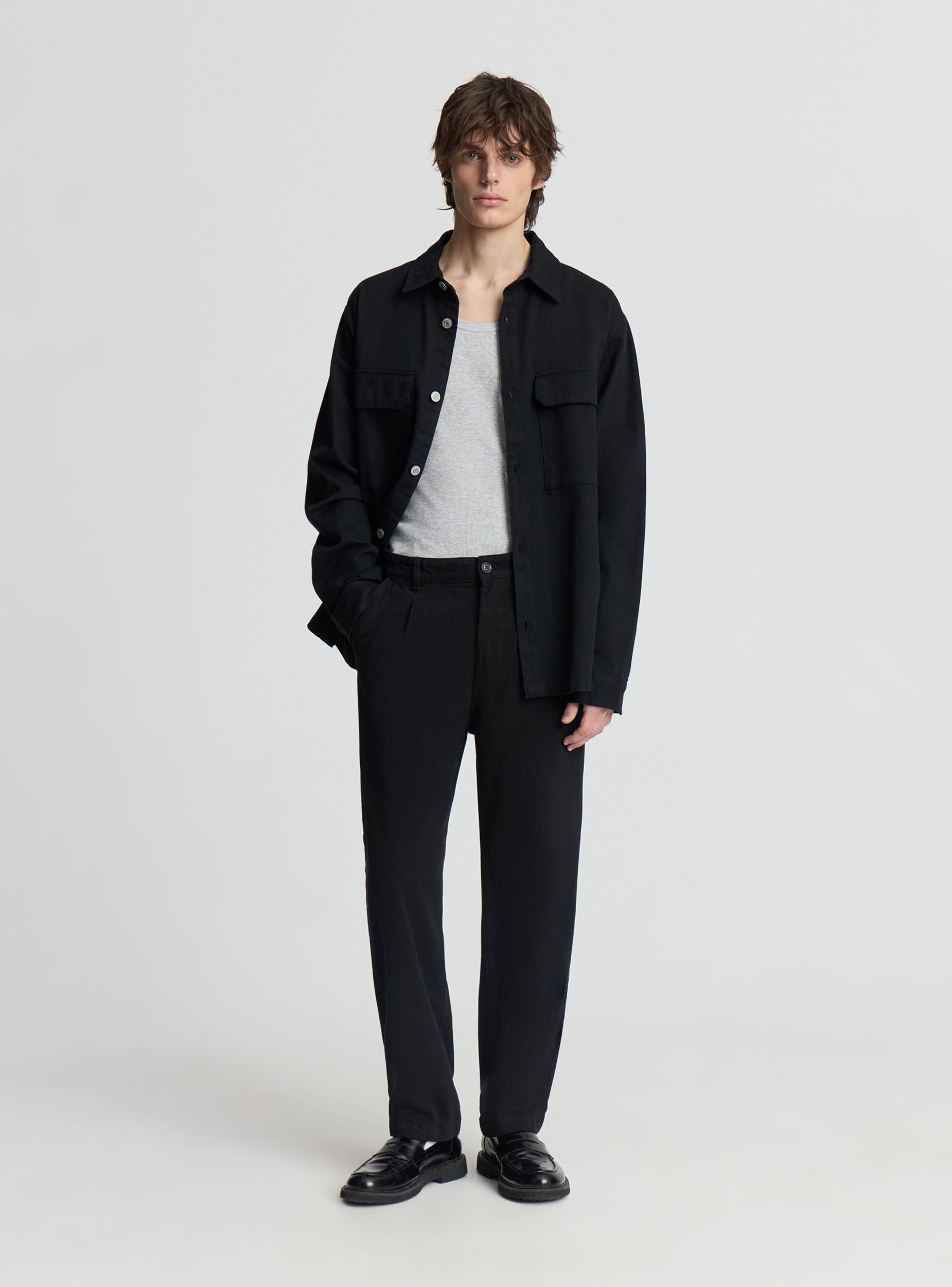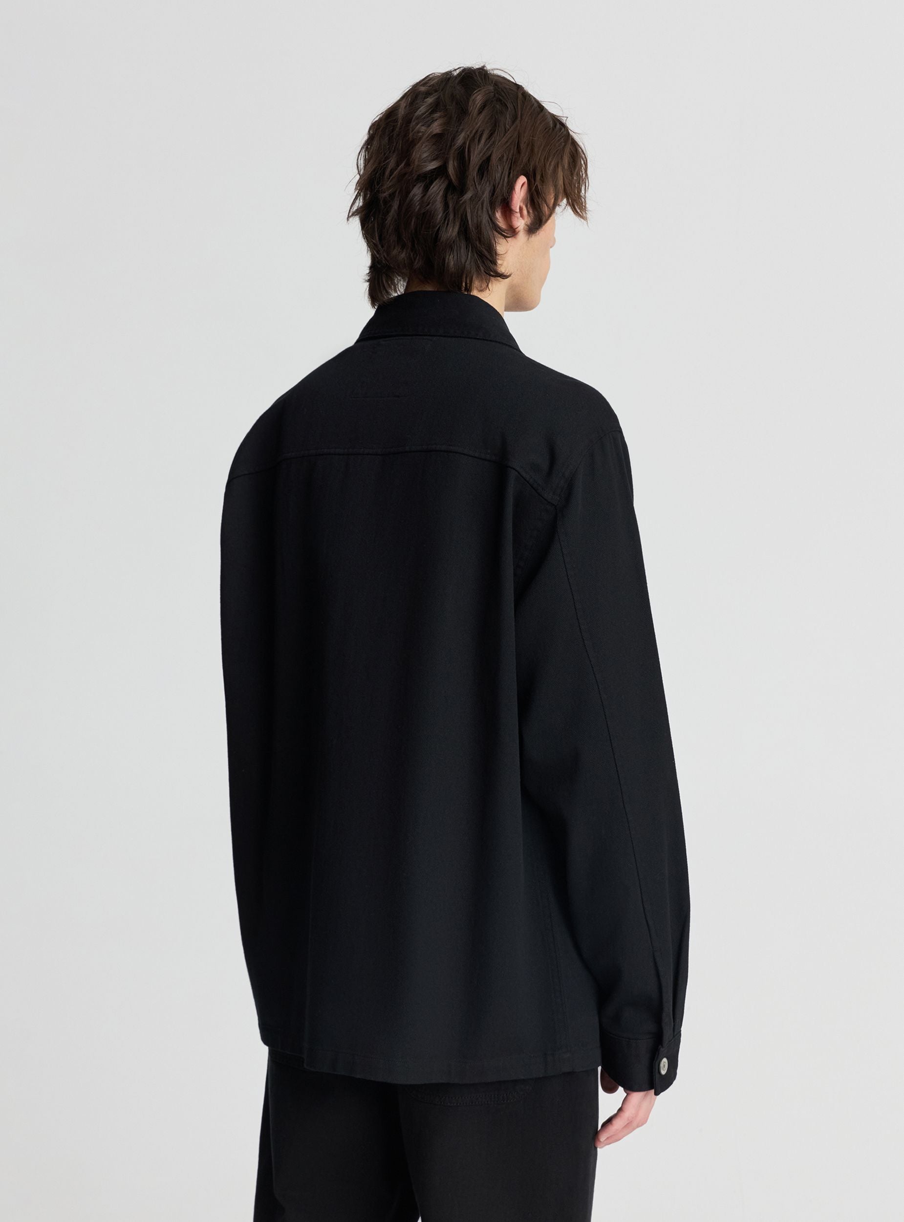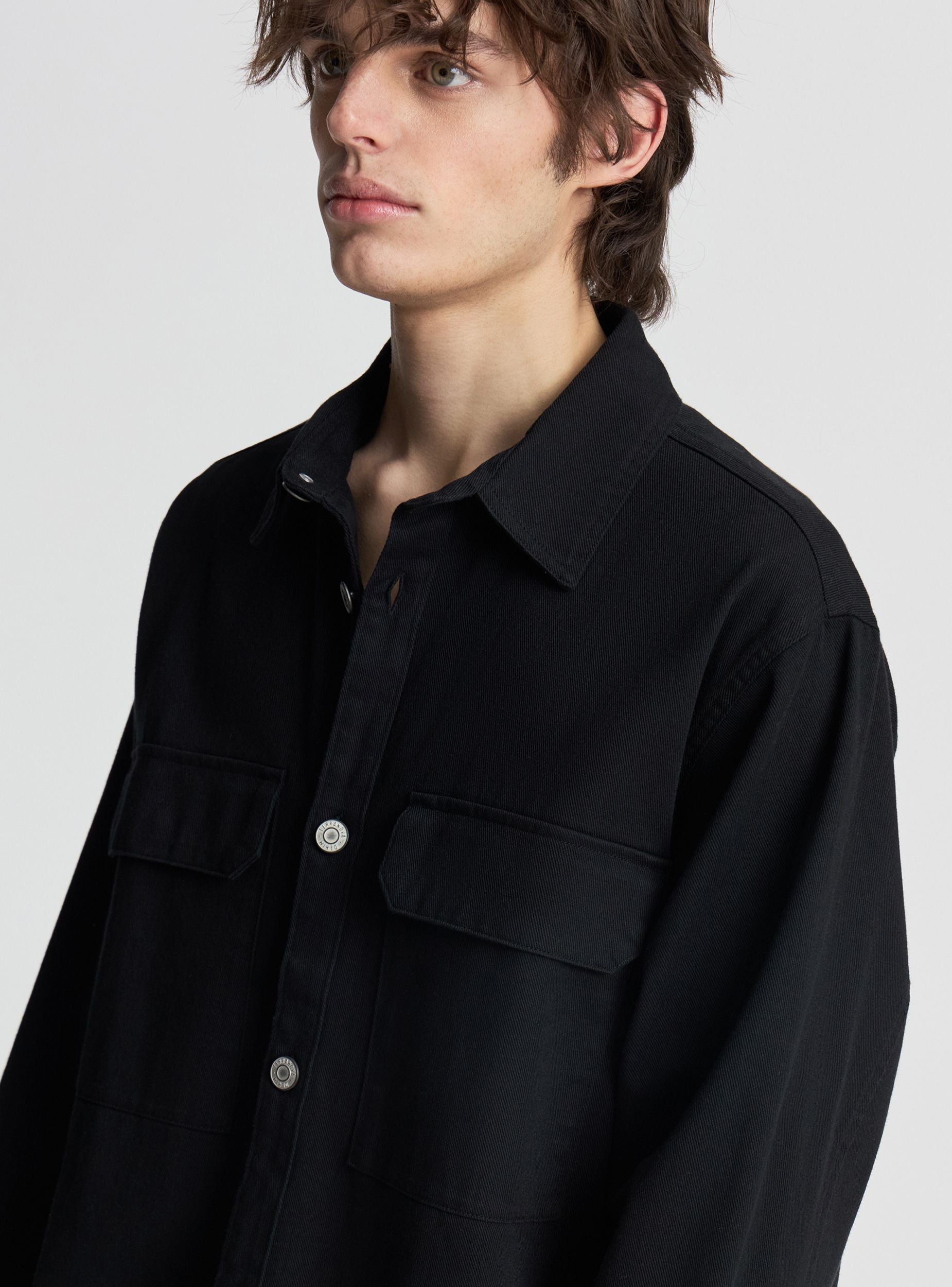 Shacket da uomo a tinta unita pensata per look casual e urban. Colletto a punta, maniche lunghe e chiusura frontale con bottoni. Due tasche applicate sul petto con patta aggiungono funzionalità e stile. Perfetta sopra maglietta e jeans o abbinata a pantaloni chino per il tempo libero.Dettagli
