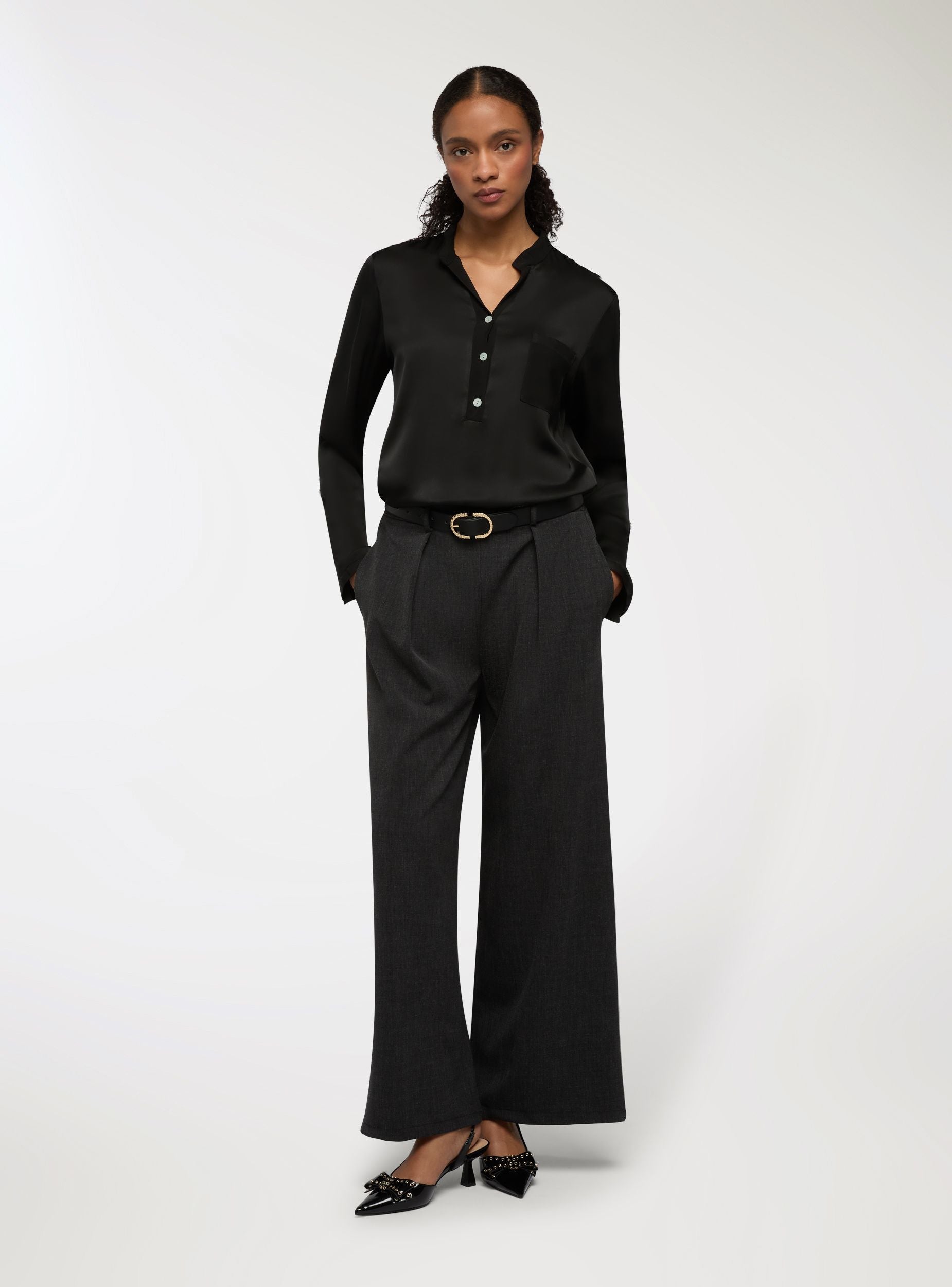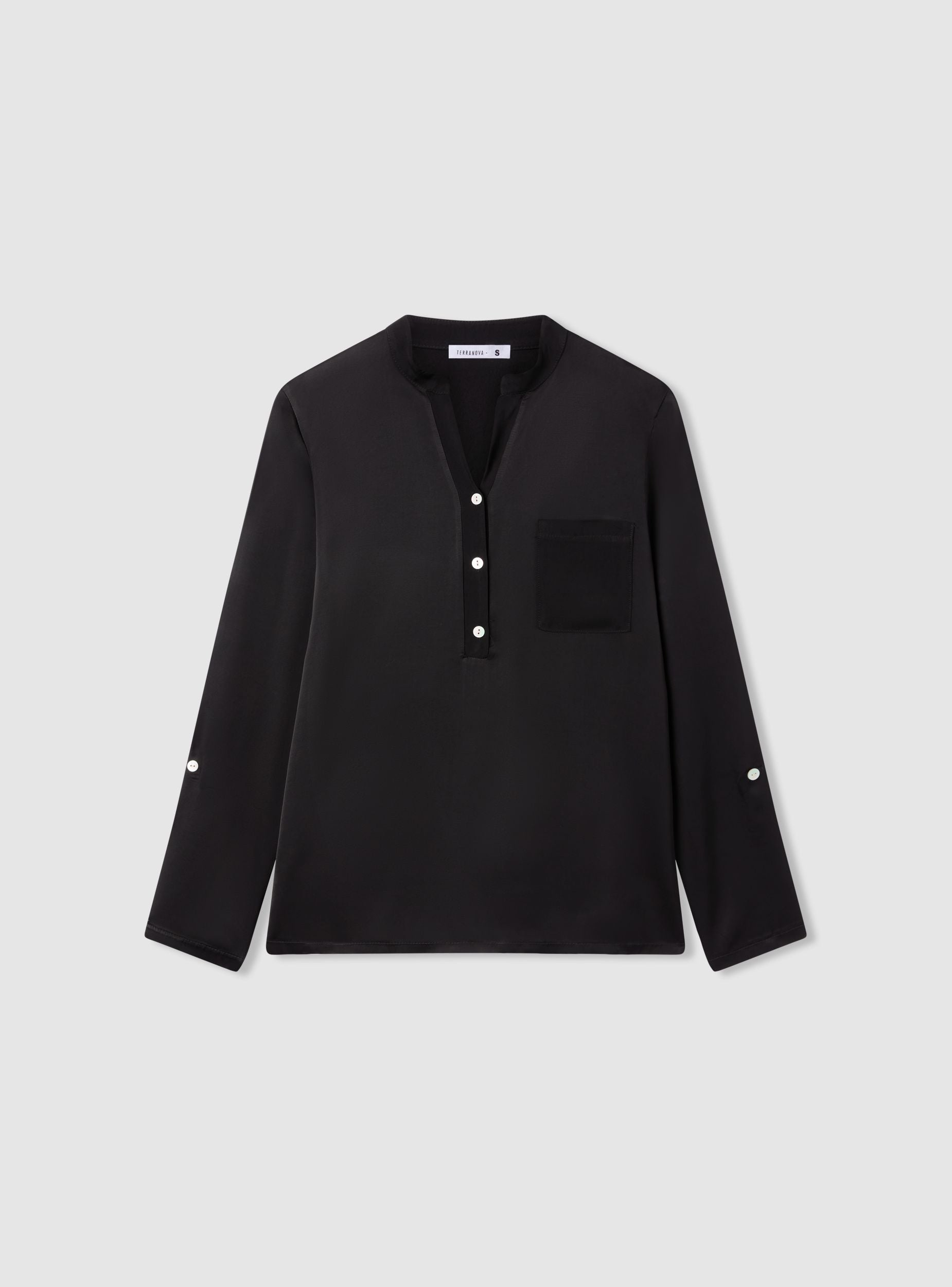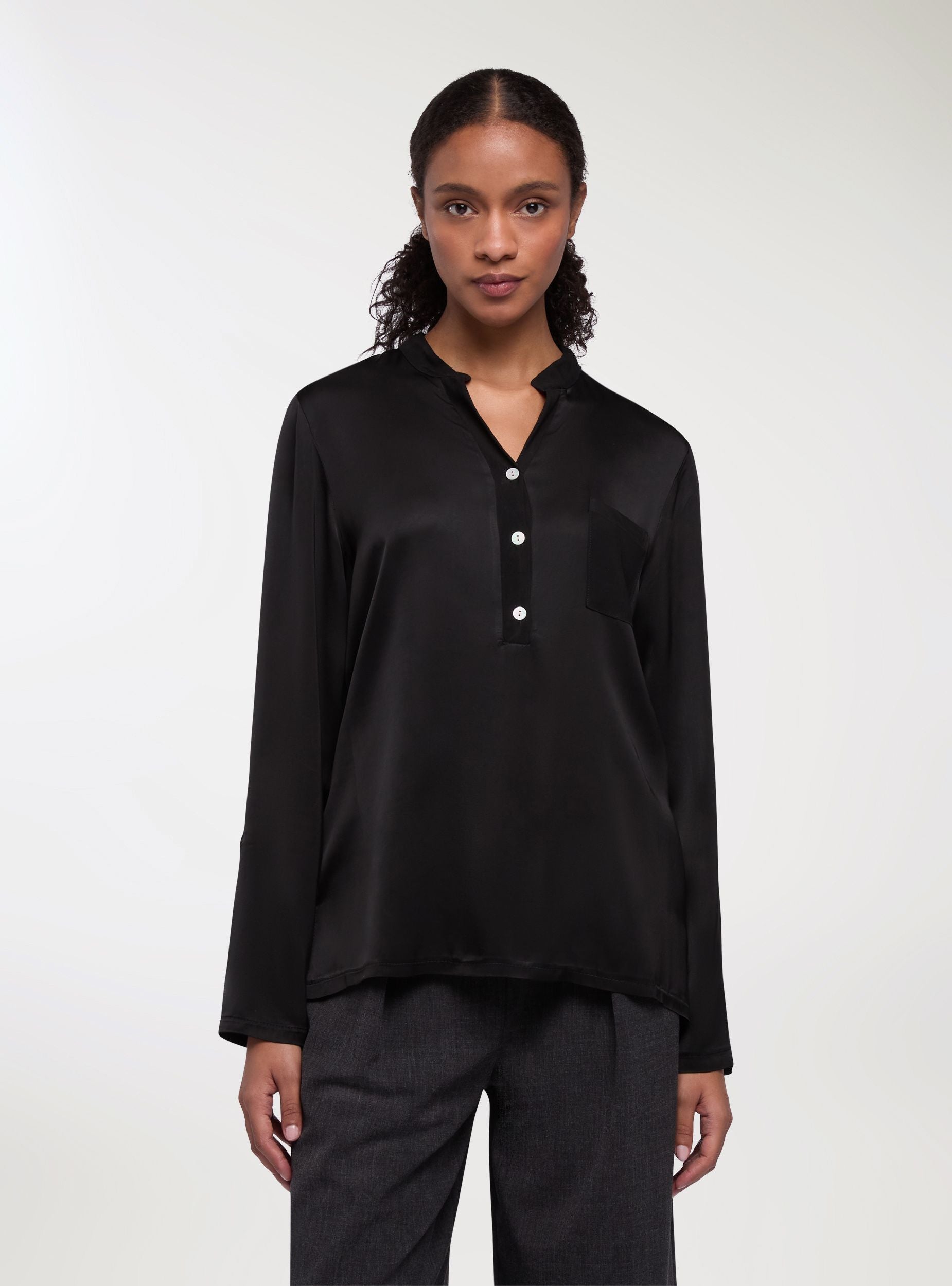 Camicia da donna, effetto raso, con collo alla coreana e scollo a V, maniche lunghe e abbottonatura parziale sul davanti. Il design a tinta unita presenta un taschino sul petto, ideale per look da ufficio o per il tempo libero. Vestibilità regular e lunghezza standard, perfetta con jeans o pantaloni sartoriali, si indossa facilmente sotto blazer o cardigan.Dettagli