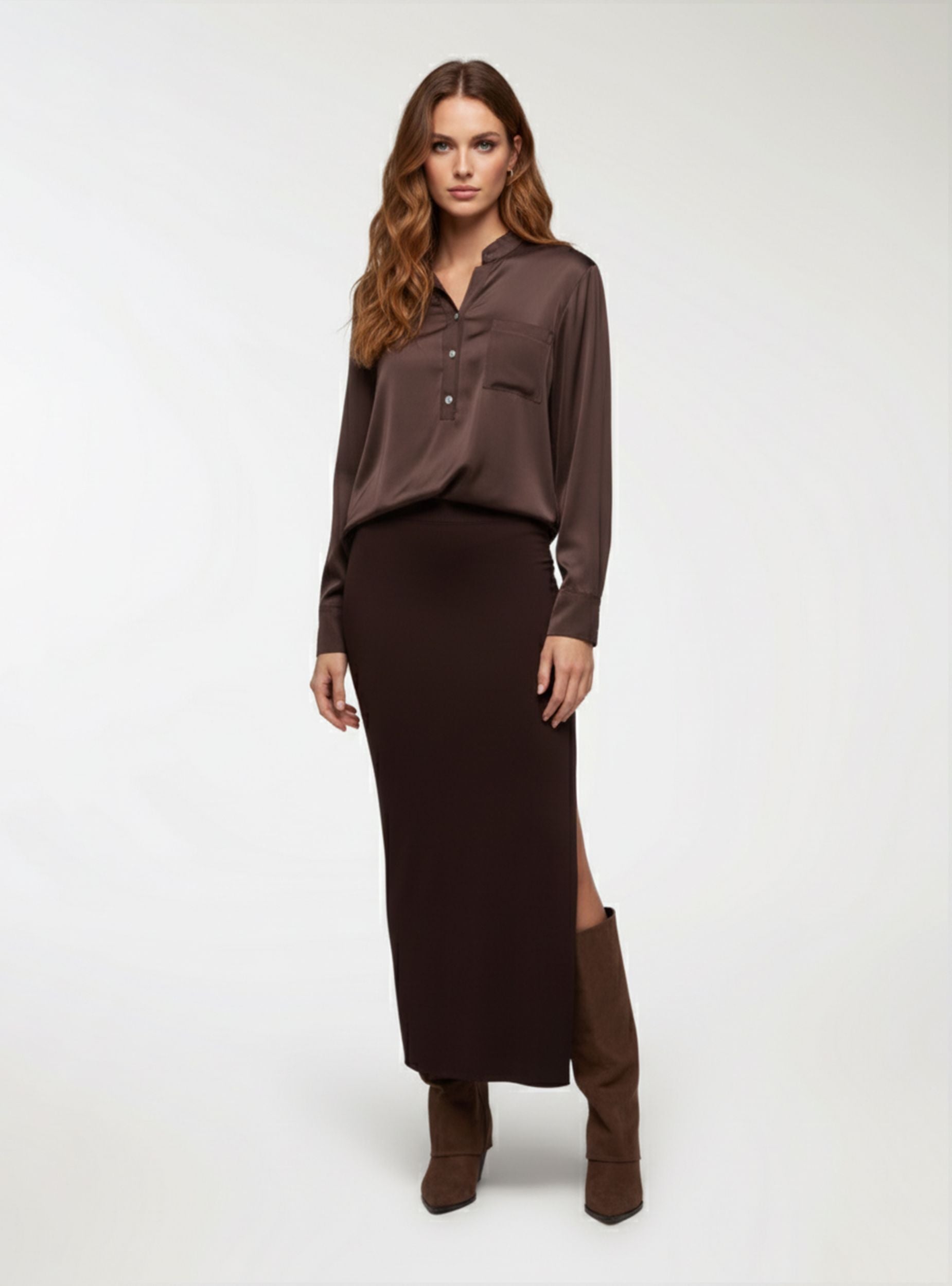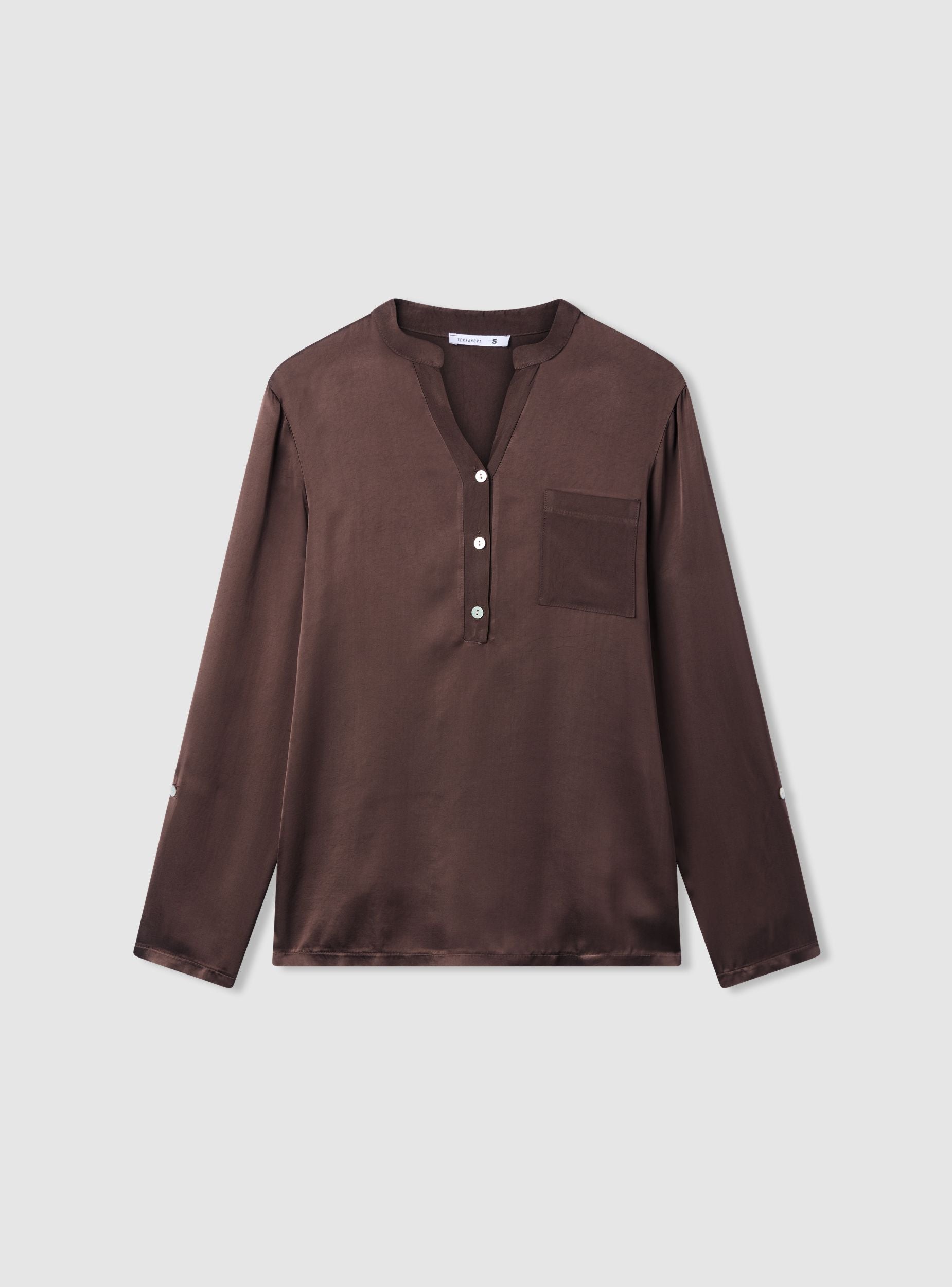 Camicia da donna, effetto raso, con collo alla coreana e scollo a V, maniche lunghe e abbottonatura parziale sul davanti. Il design a tinta unita presenta un taschino sul petto, ideale per look da ufficio o per il tempo libero. Vestibilità regular e lunghezza standard, perfetta con jeans o pantaloni sartoriali, si indossa facilmente sotto blazer o cardigan.Dettagli