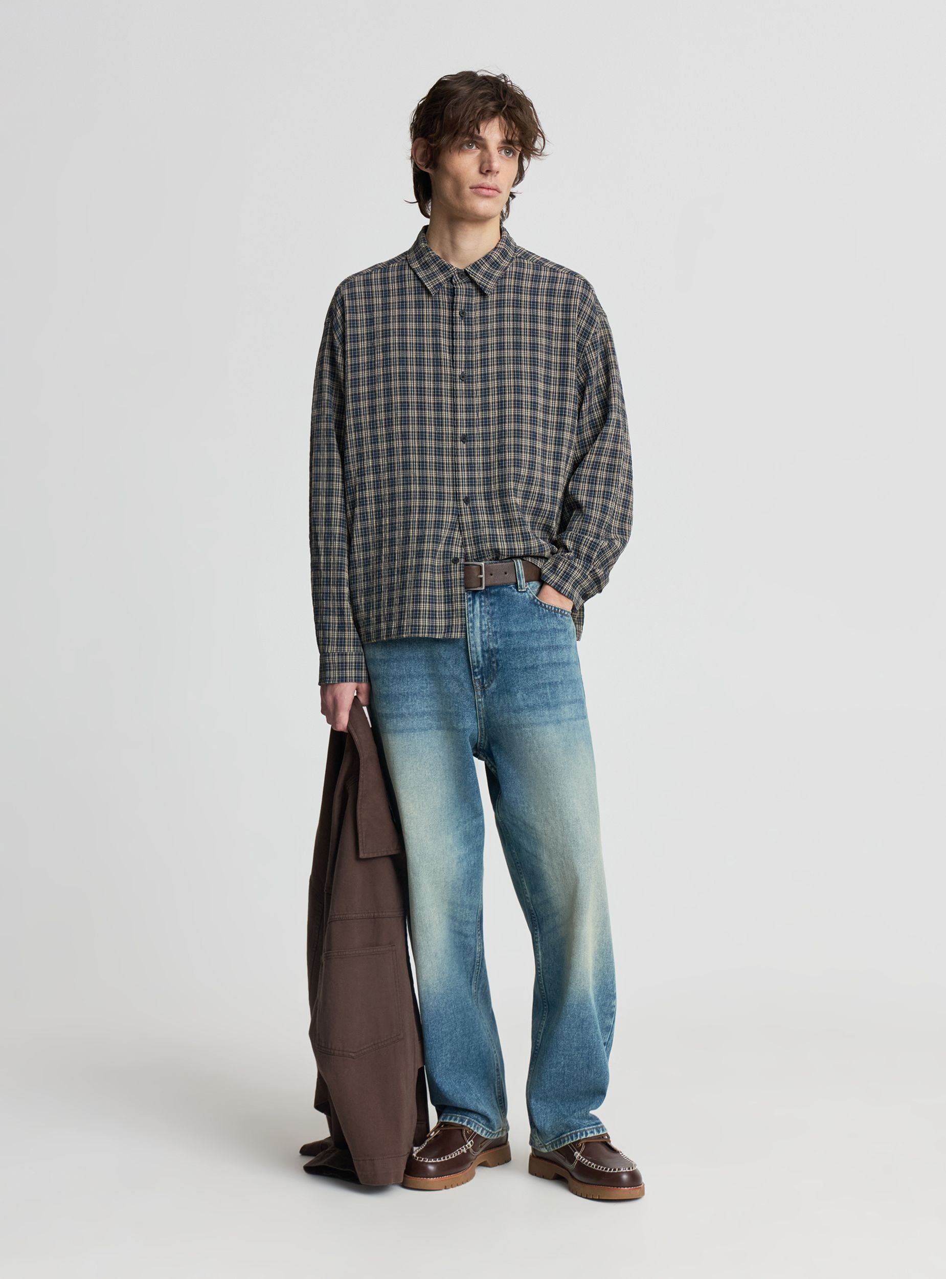Camicia da uomo a quadretti con colletto classico e maniche lunghe. Chiusura frontale con bottoni e polsini abbottonati, vestibilità regular pensata per outfit casual e urban. Perfetta sopra una maglietta o sotto una giacca, si abbina a jeans o chino per il tempo libero e l’ufficio informale. Tessuto confortevole, linea pulita e dettagli essenziali per un look versatile.Dettagli
