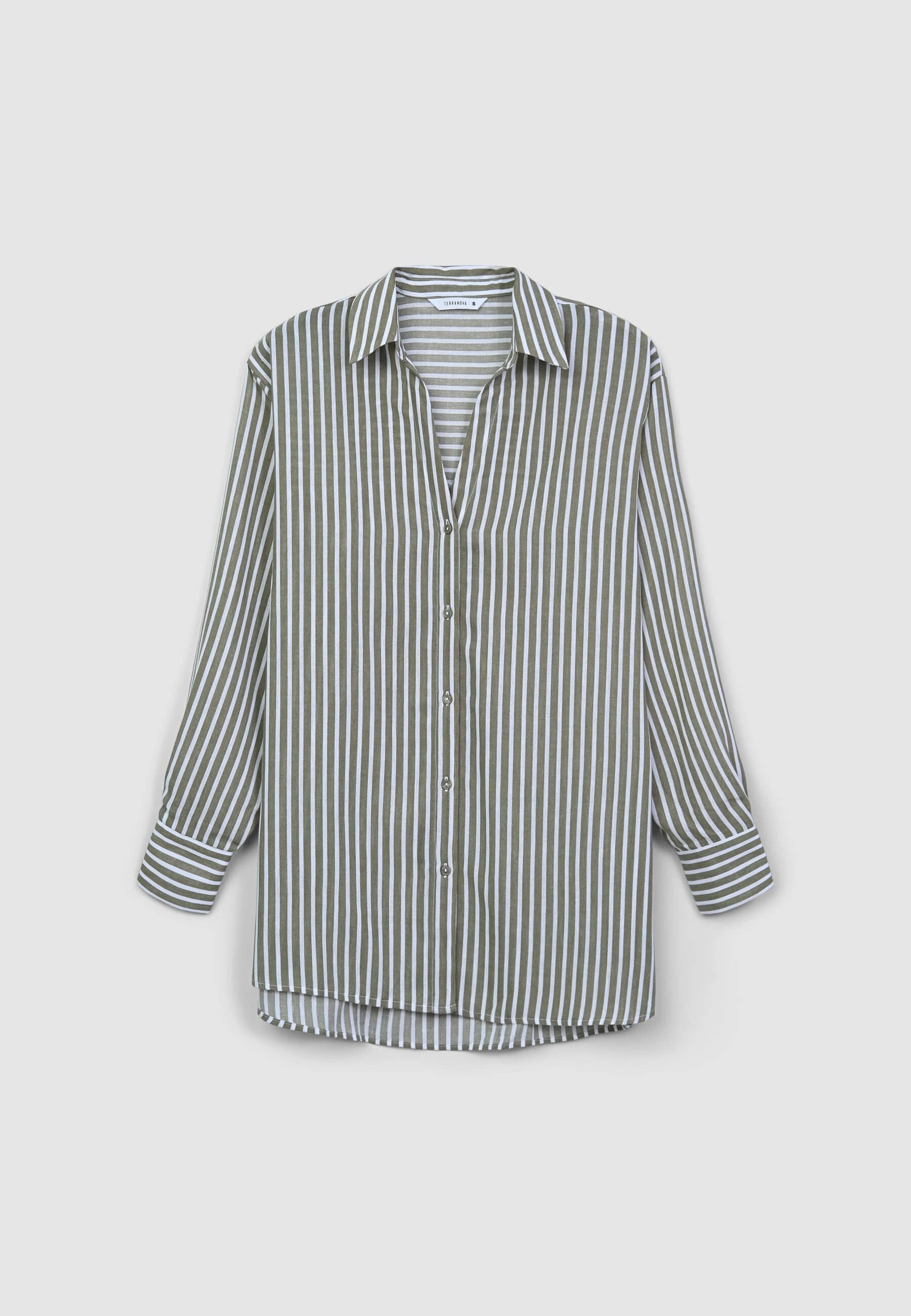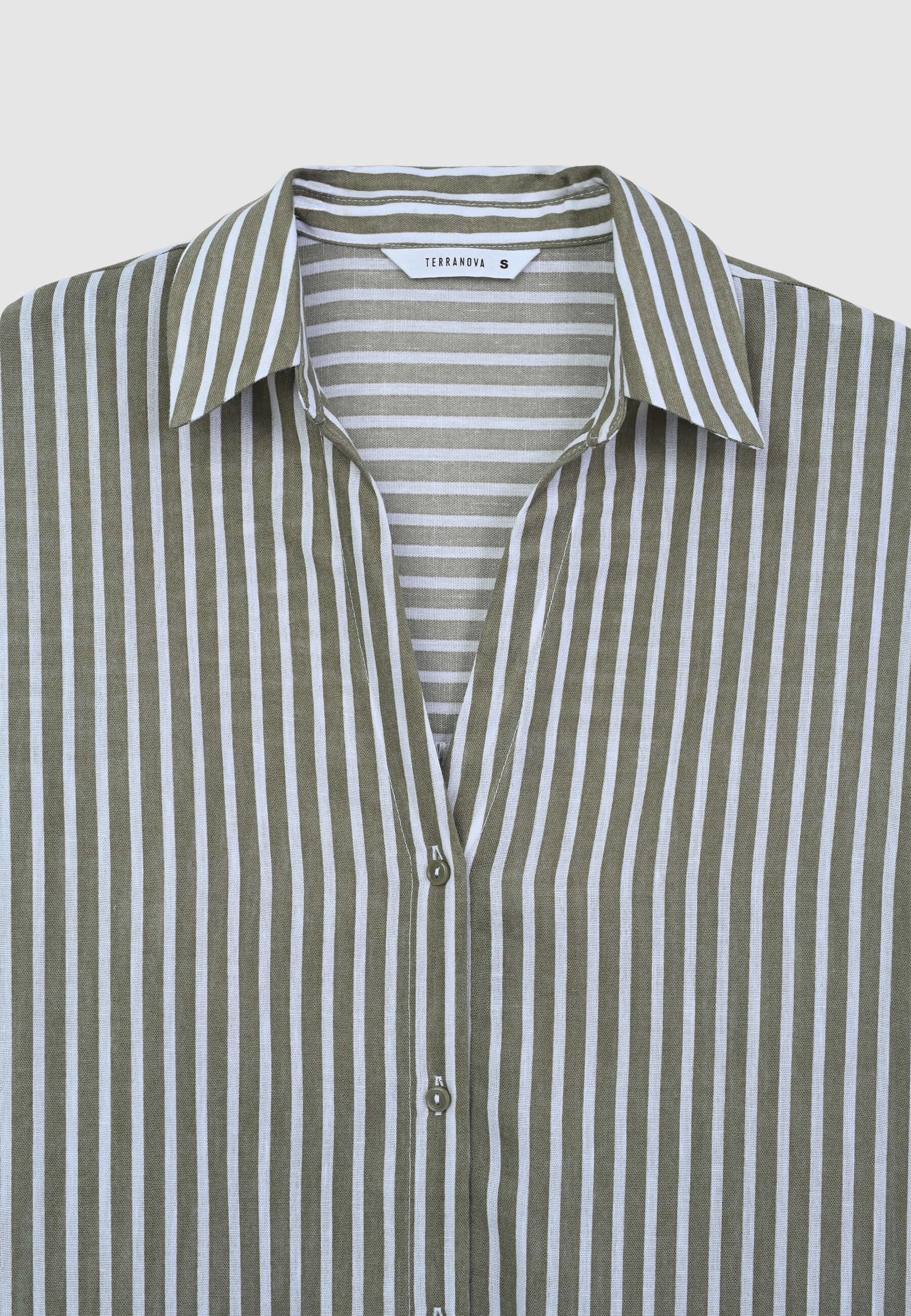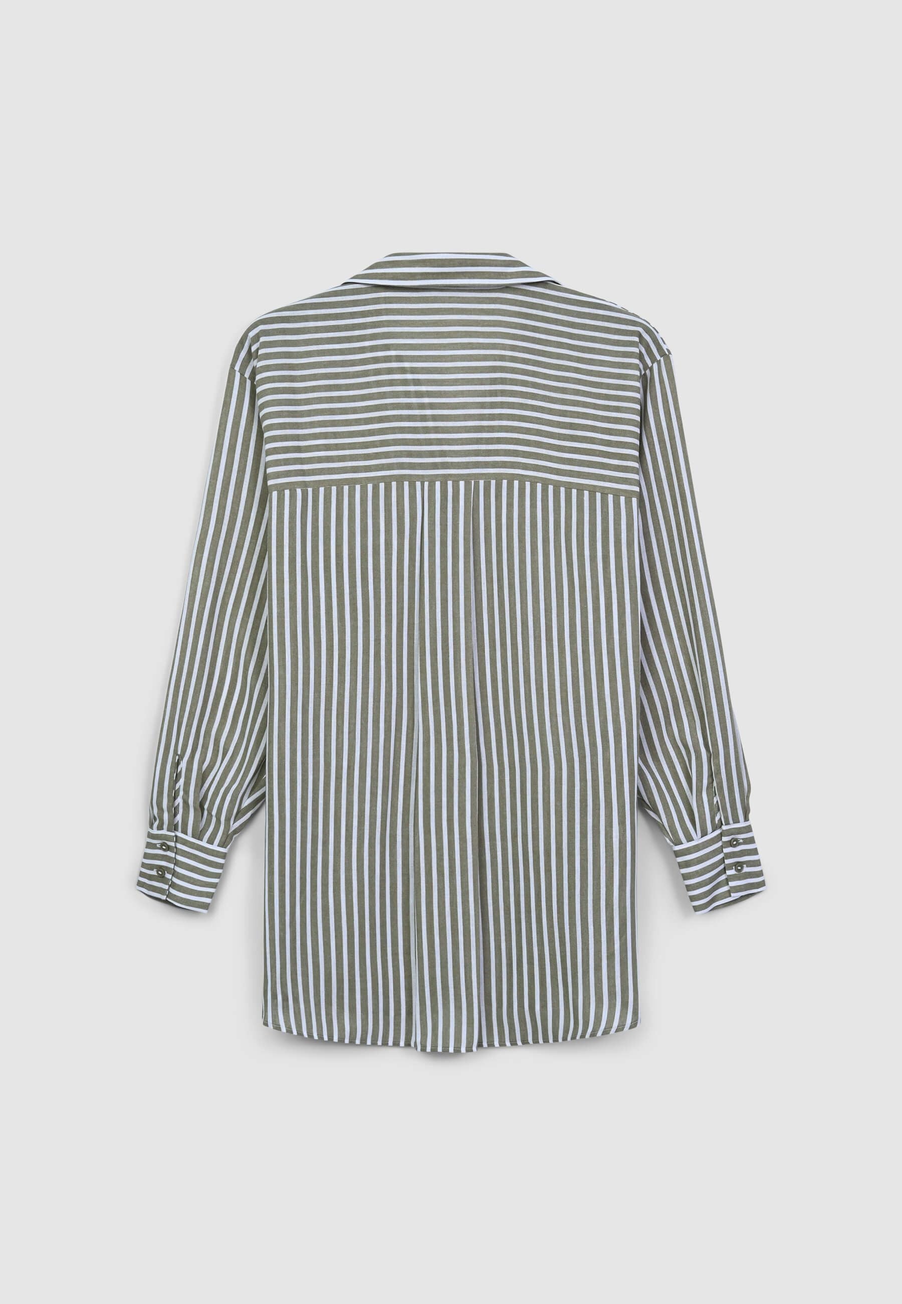 Camicia da donna over a righe, caratterizzata da un raffinato effetto lino che dona un aspetto leggero e naturale. Questo modello presenta una chiusura frontale con bottoni, maniche lunghe e una vestibilità ampia, ideale per creare outfit moderni e confortevoli. Perfetta da abbinare a pantaloni o gonne per un look versatile e ricercato.Dettagli