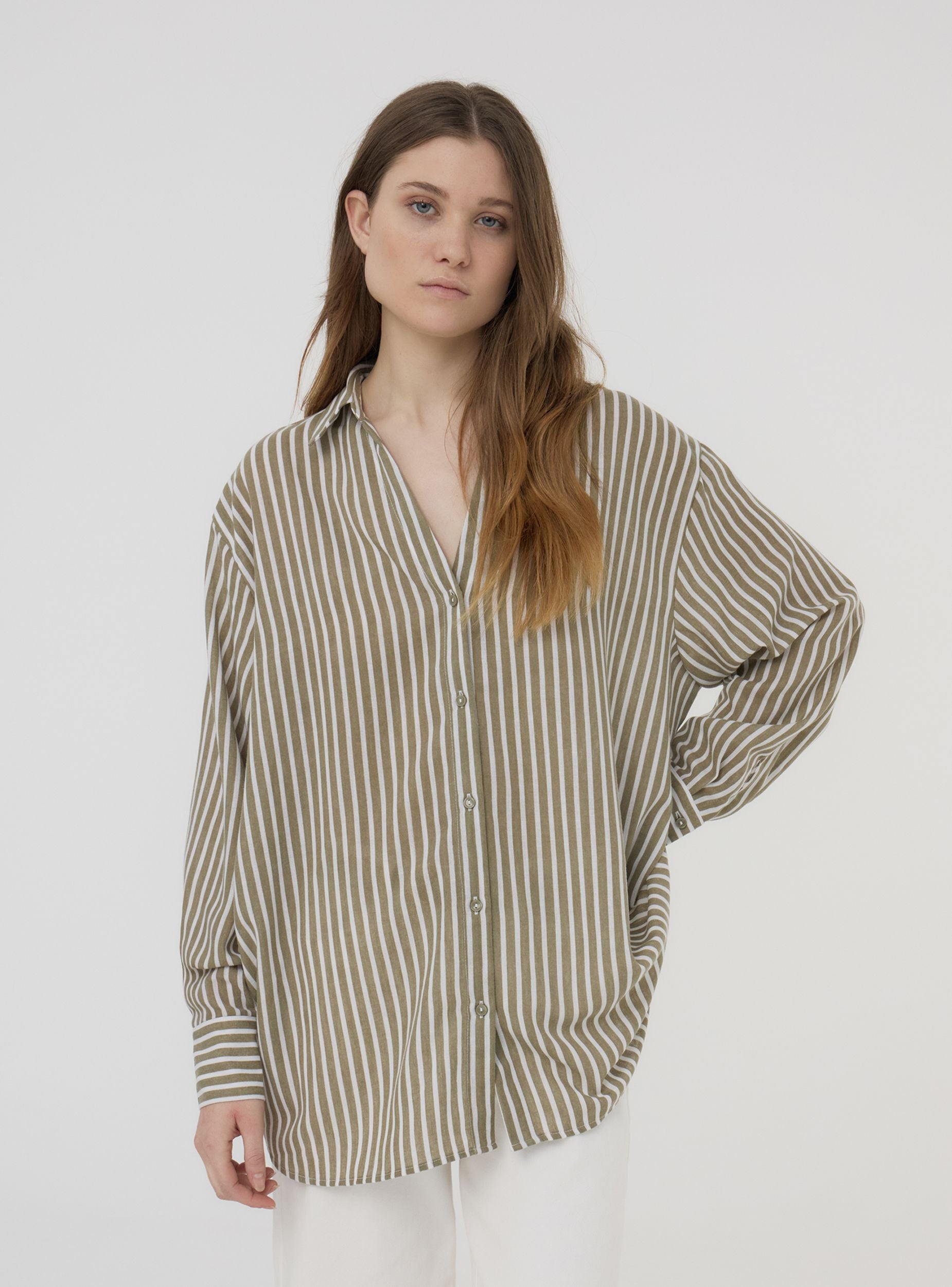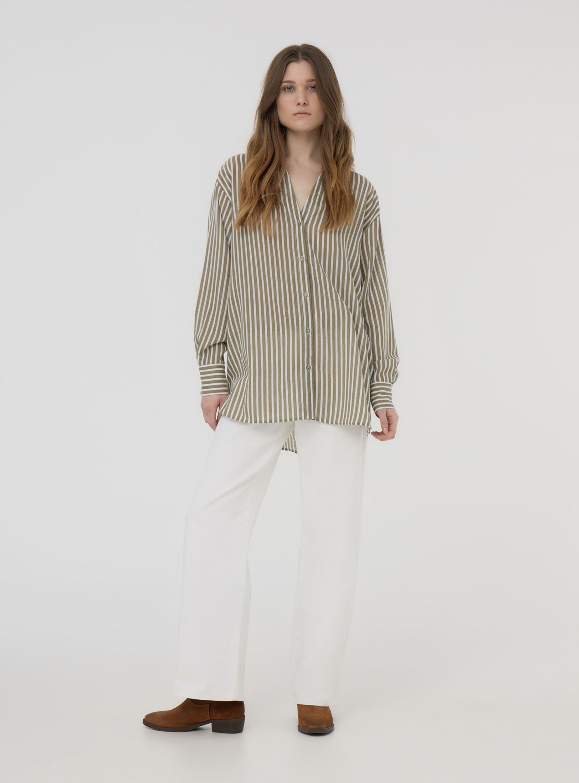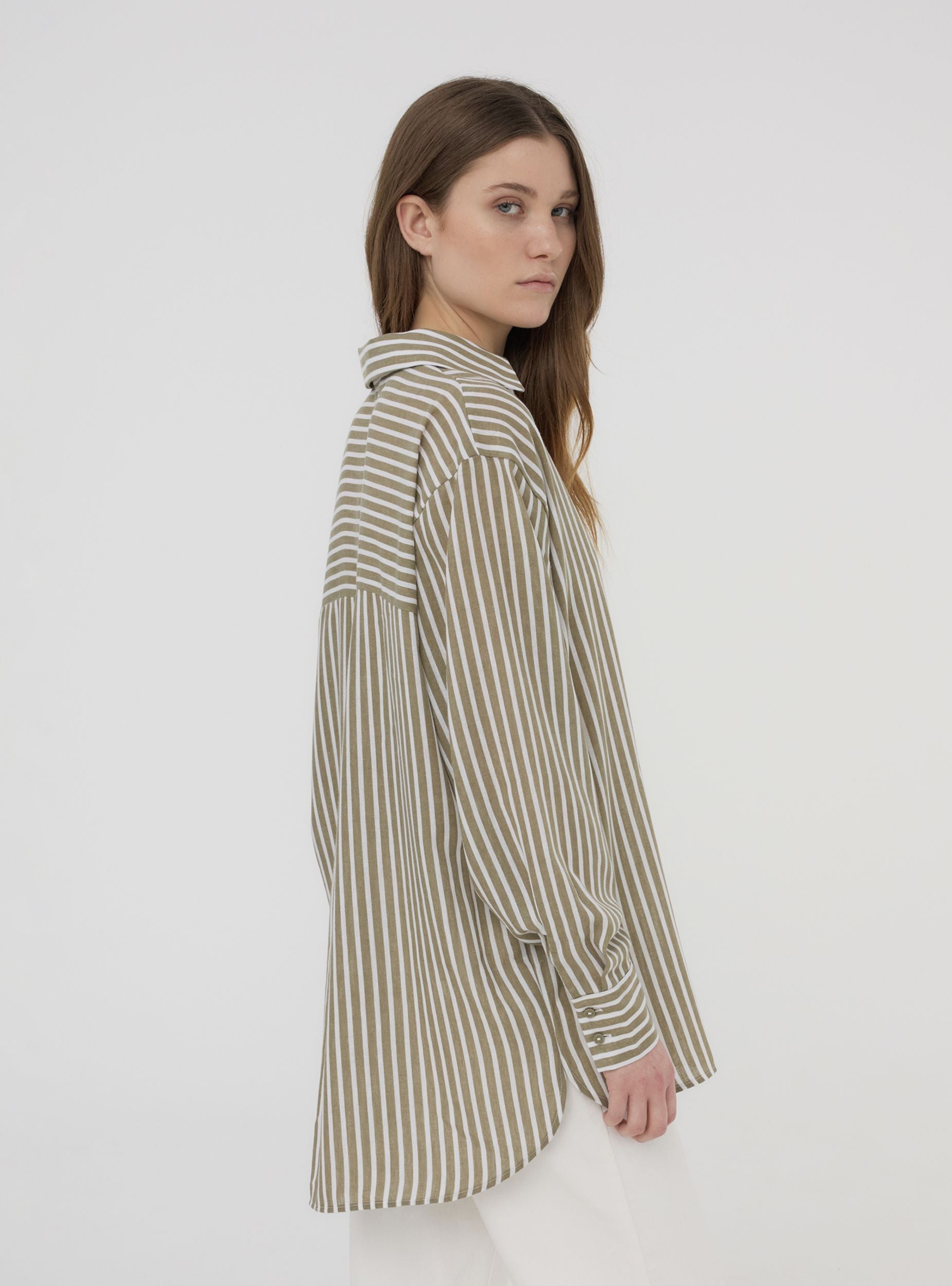 Camicia da donna over a righe, caratterizzata da un raffinato effetto lino che dona un aspetto leggero e naturale. Questo modello presenta una chiusura frontale con bottoni, maniche lunghe e una vestibilità ampia, ideale per creare outfit moderni e confortevoli. Perfetta da abbinare a pantaloni o gonne per un look versatile e ricercato.Dettagli