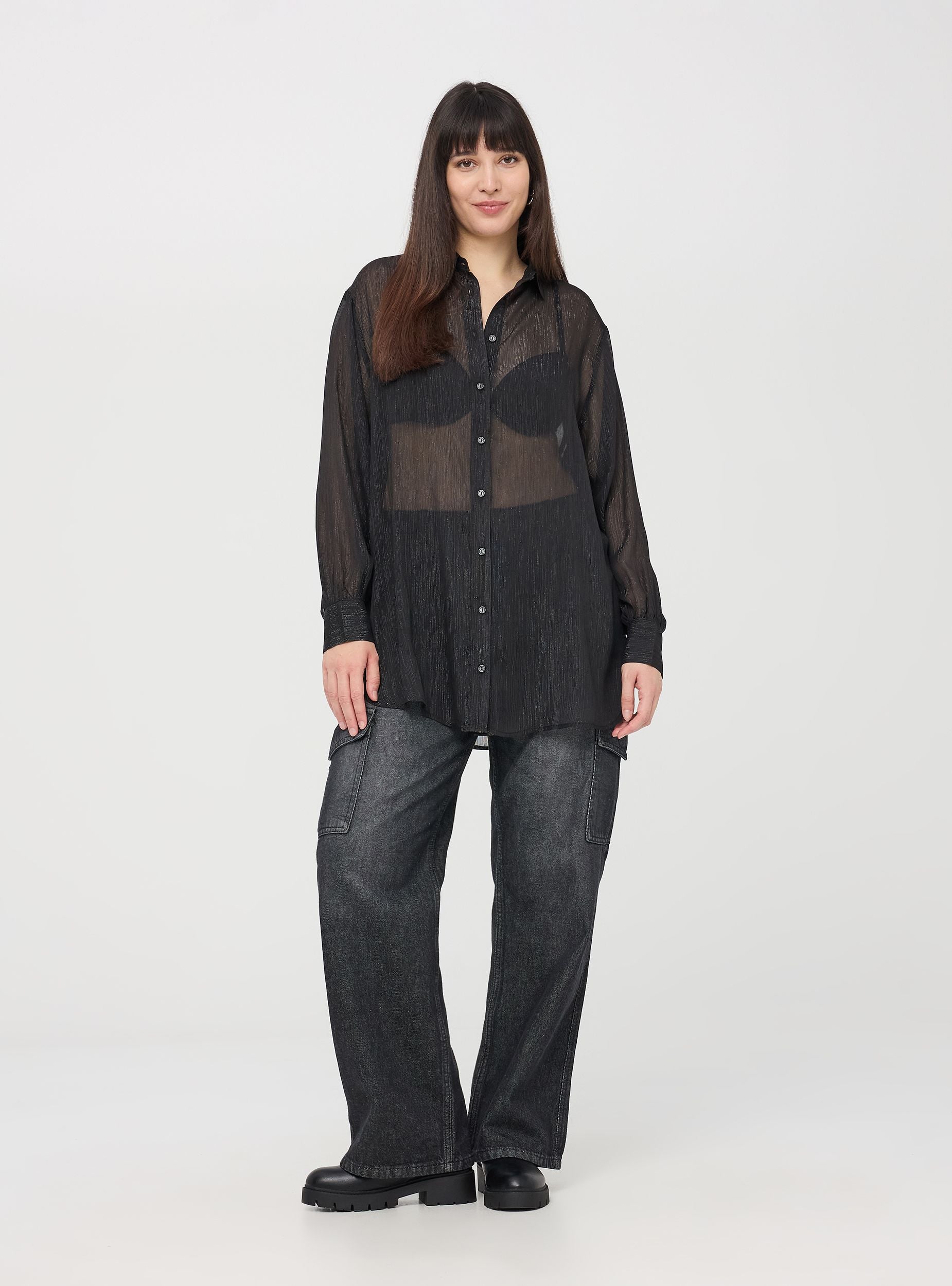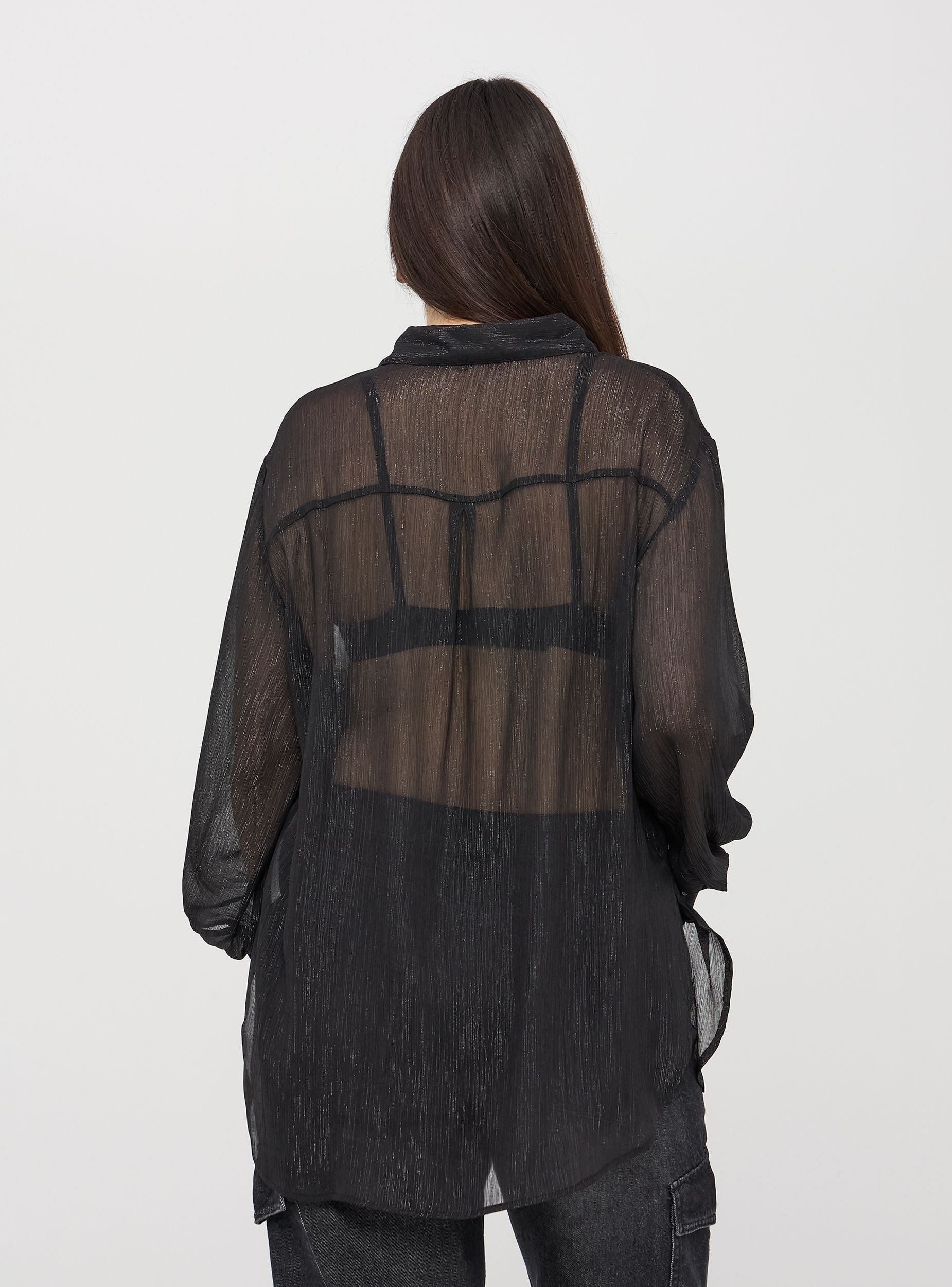 Camicia over da donna realizzata in tessuto luccicante, caratterizzata da un taglio ampio e confortevole. Presenta un colletto classico, maniche lunghe con polsini e una chiusura frontale con bottoni. Il tessuto brillante conferisce un tocco di eleganza e luminosità , rendendola perfetta per serate e occasioni speciali.Dettagli