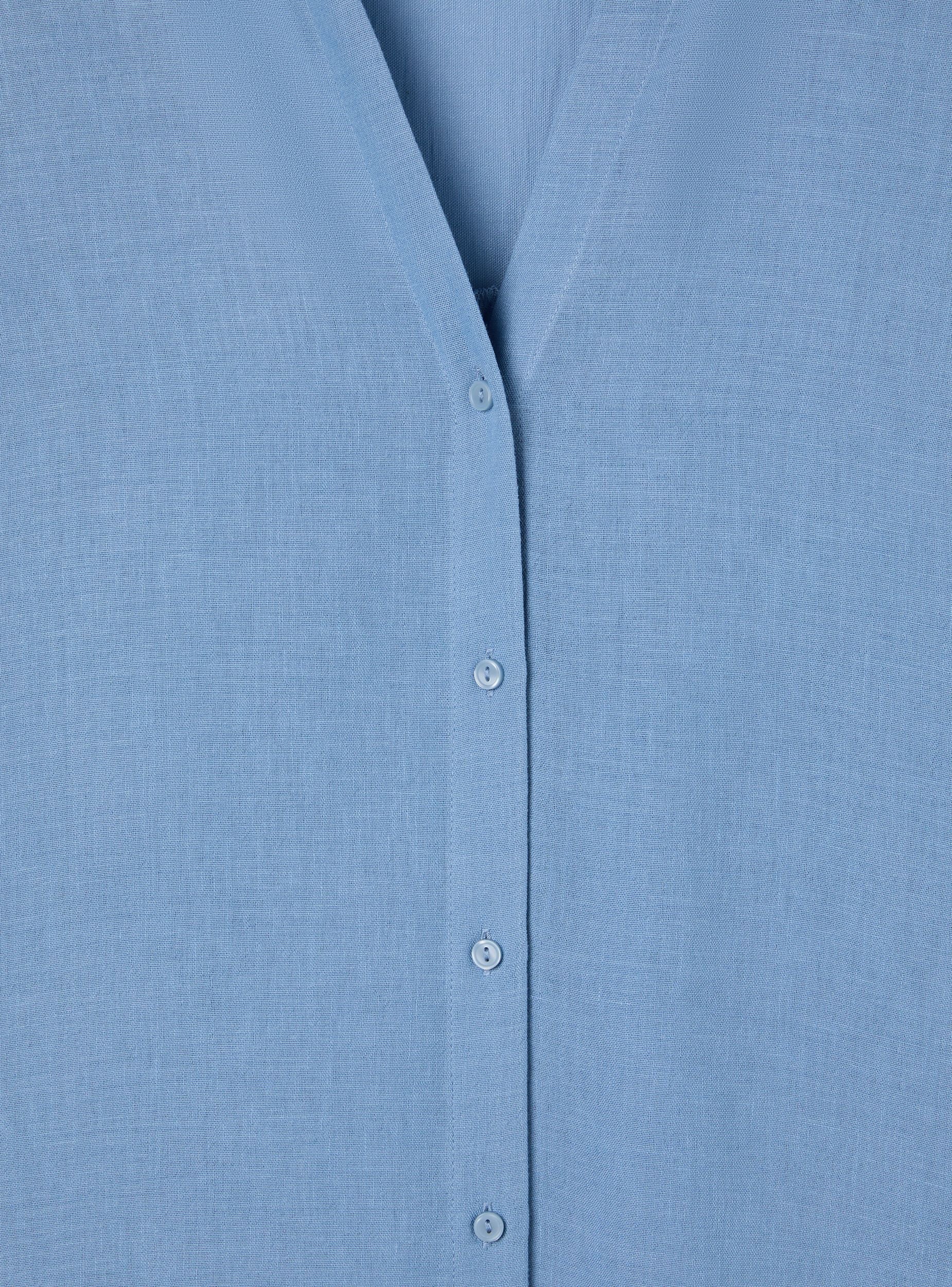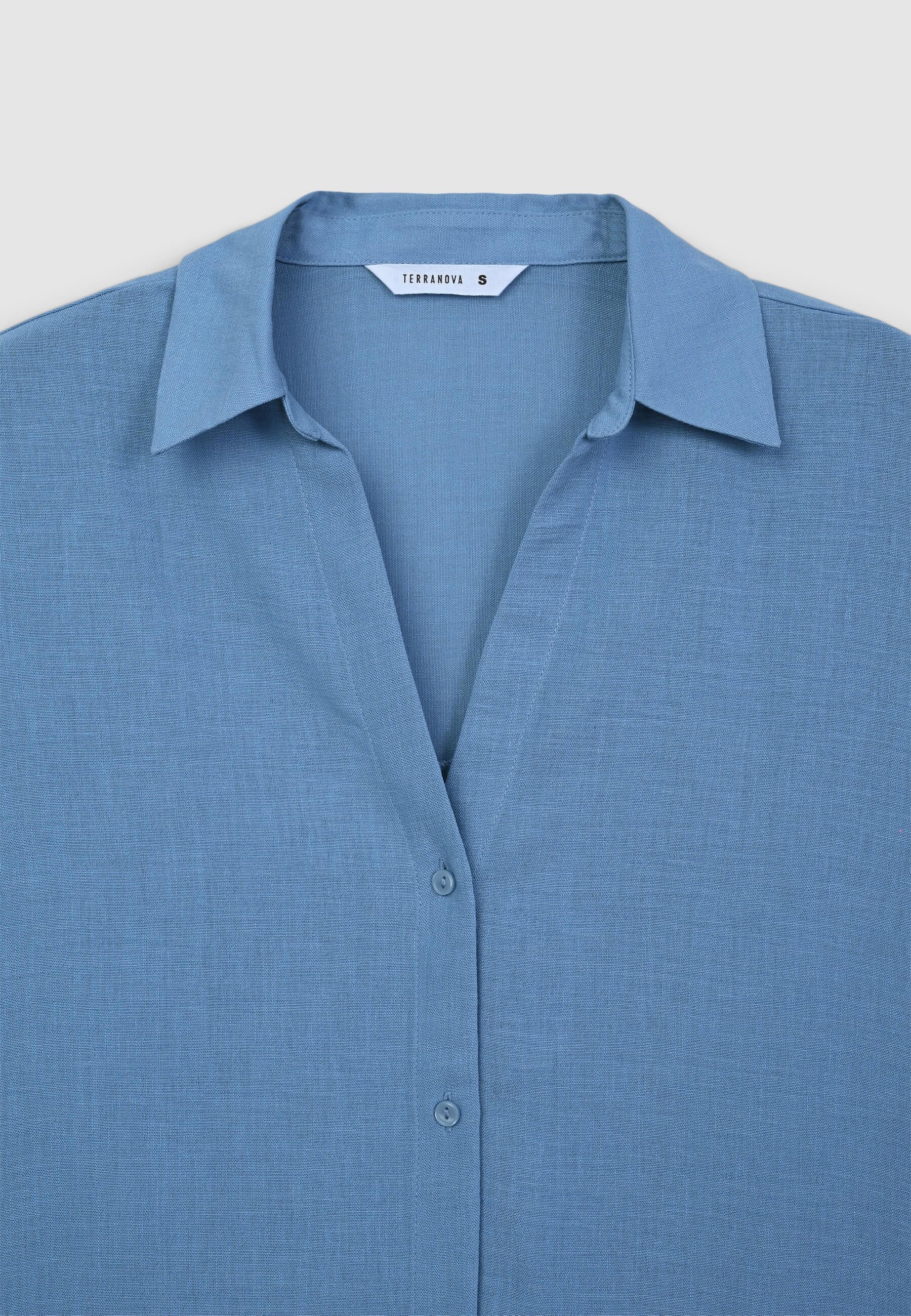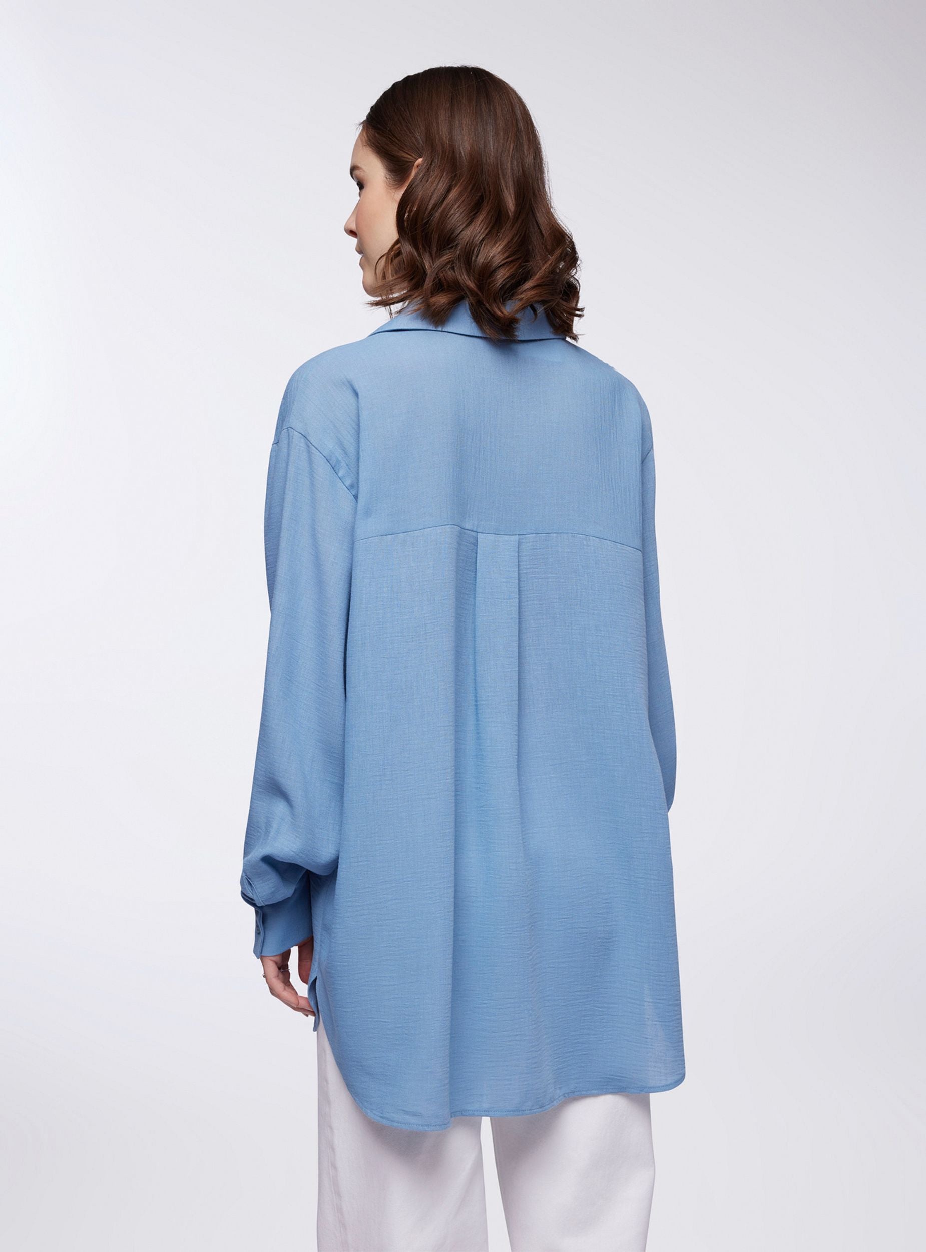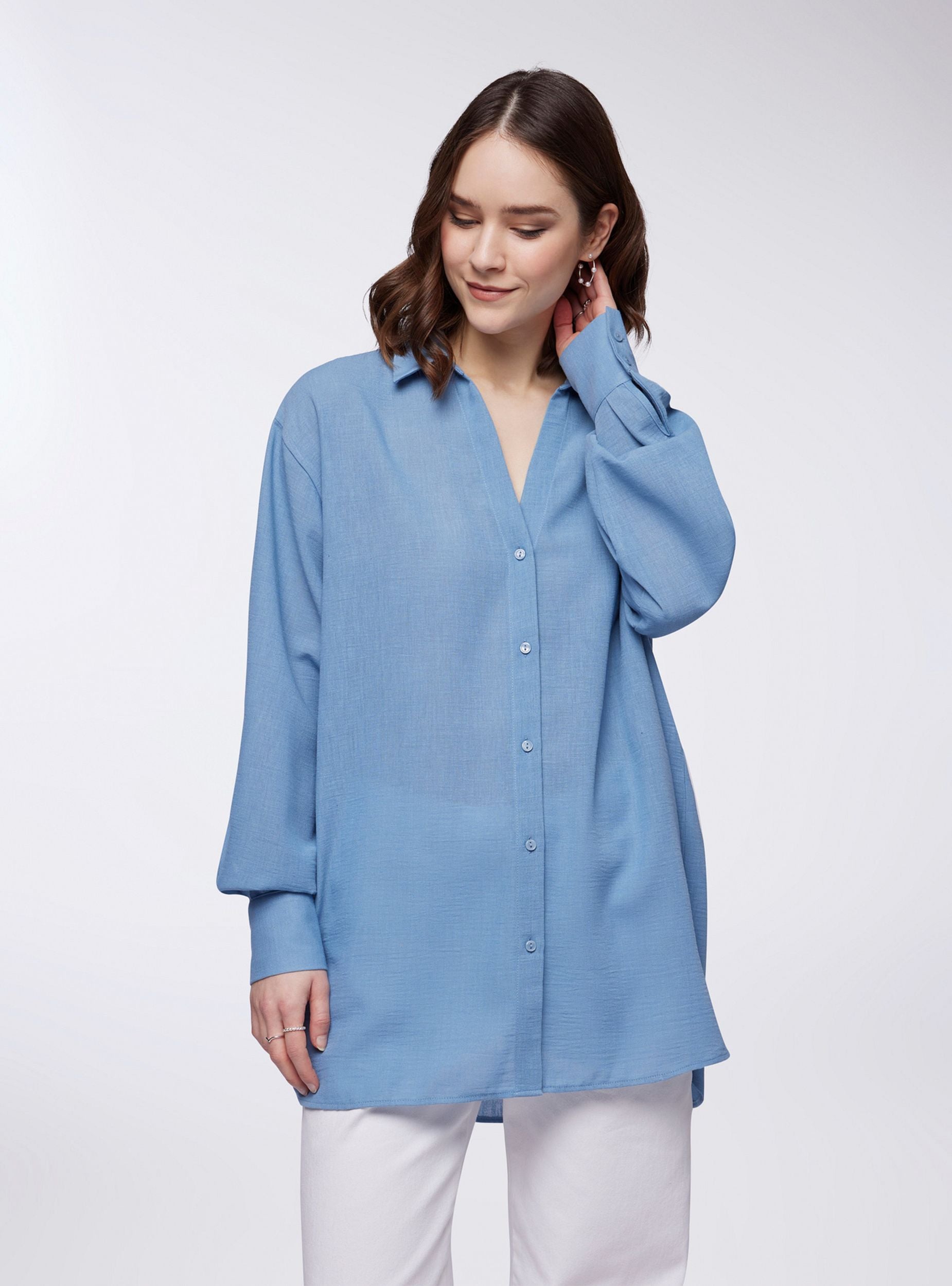 Camicia da donna over a tinta unita, perfetta per un look rilassato e sofisticato. Il design con effetto lino dona leggerezza, mentre il colletto e lo scollo a V aggiungono un tocco di eleganza. La chiusura con bottoni completa lo stile, accompagnata da maniche lunghe con polsini abbottonati per una vestibilità versatile. Gli spacchetti laterati conferiscono un movimento fluido, ideale per diverse occasioni.Dettagli