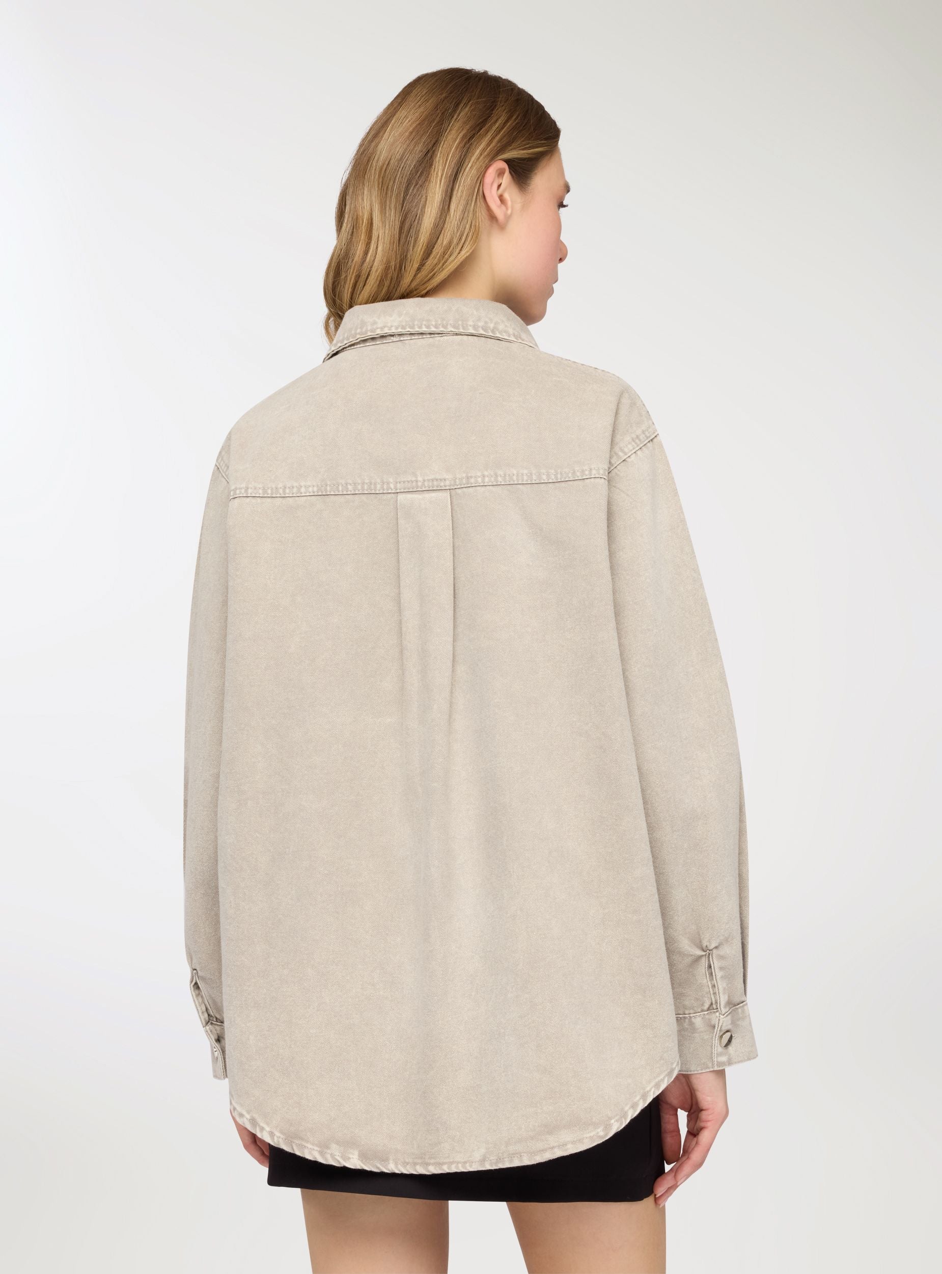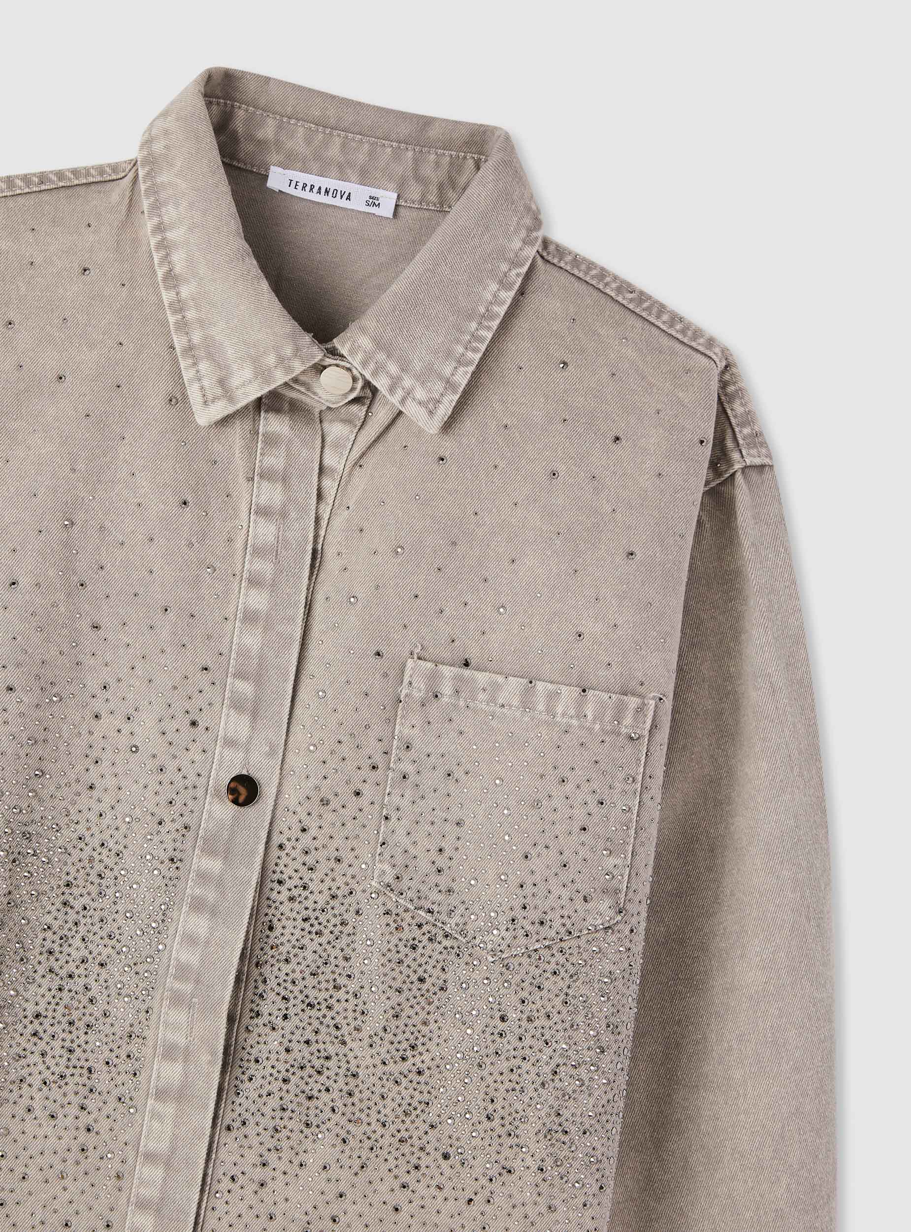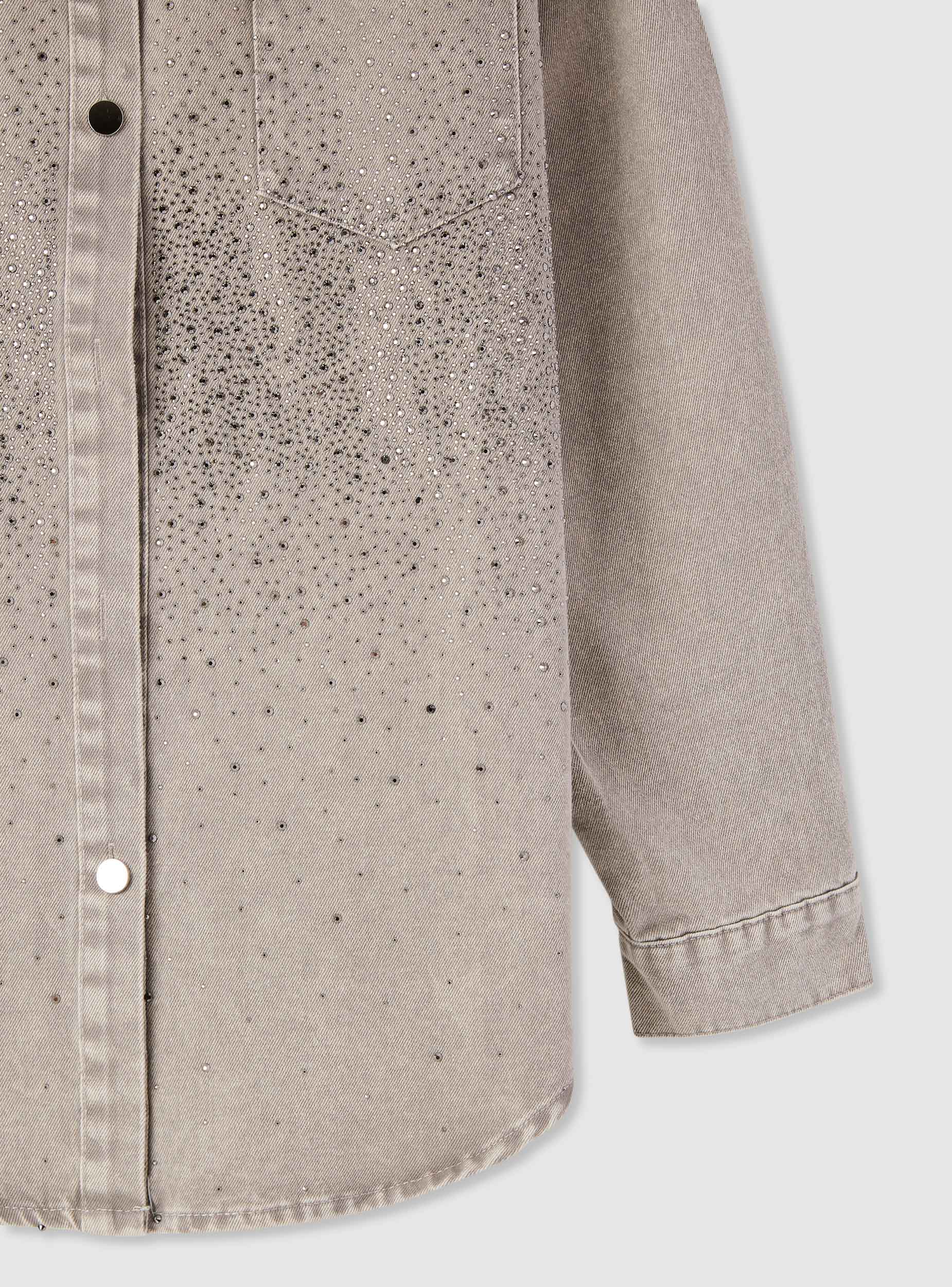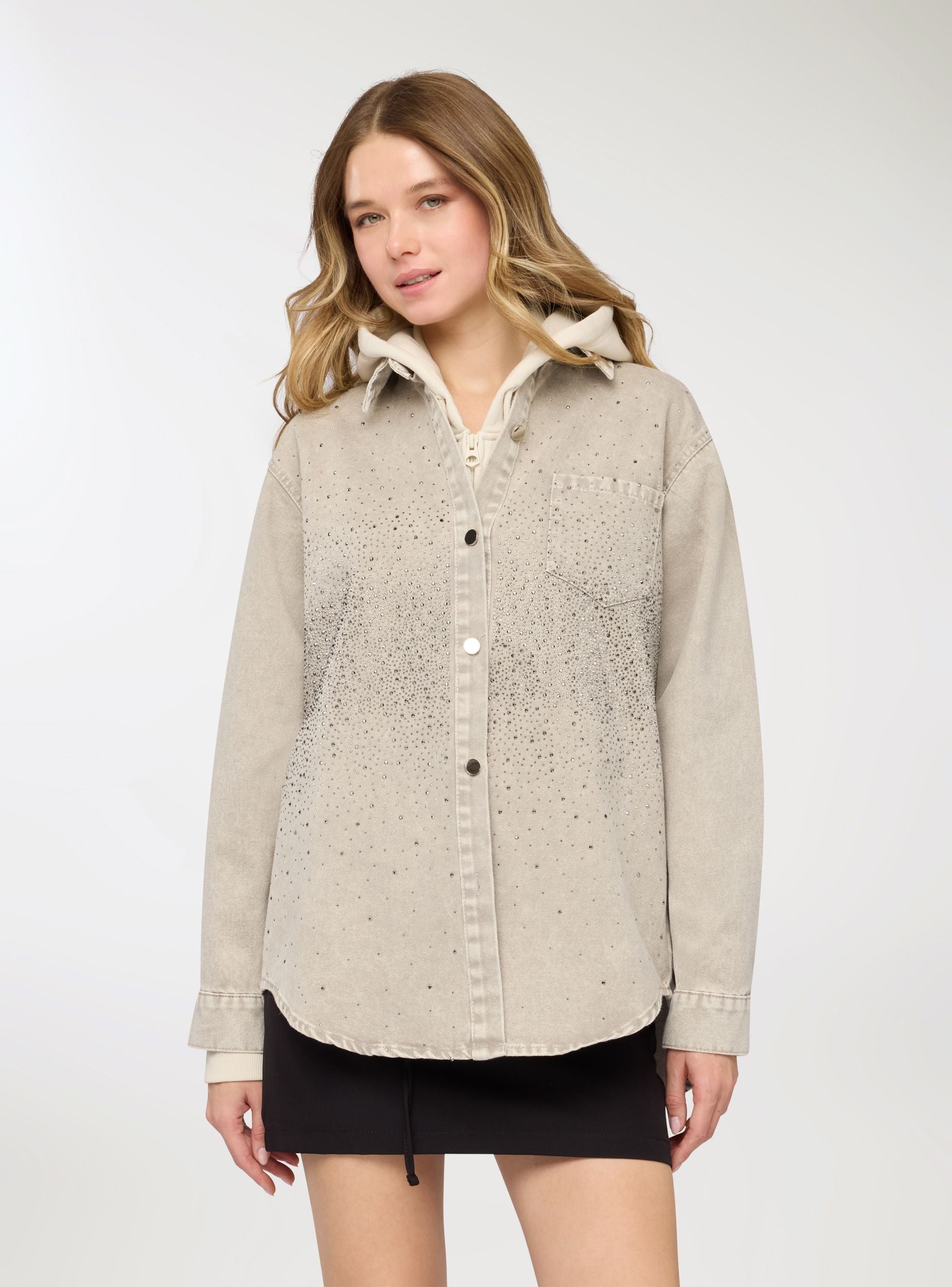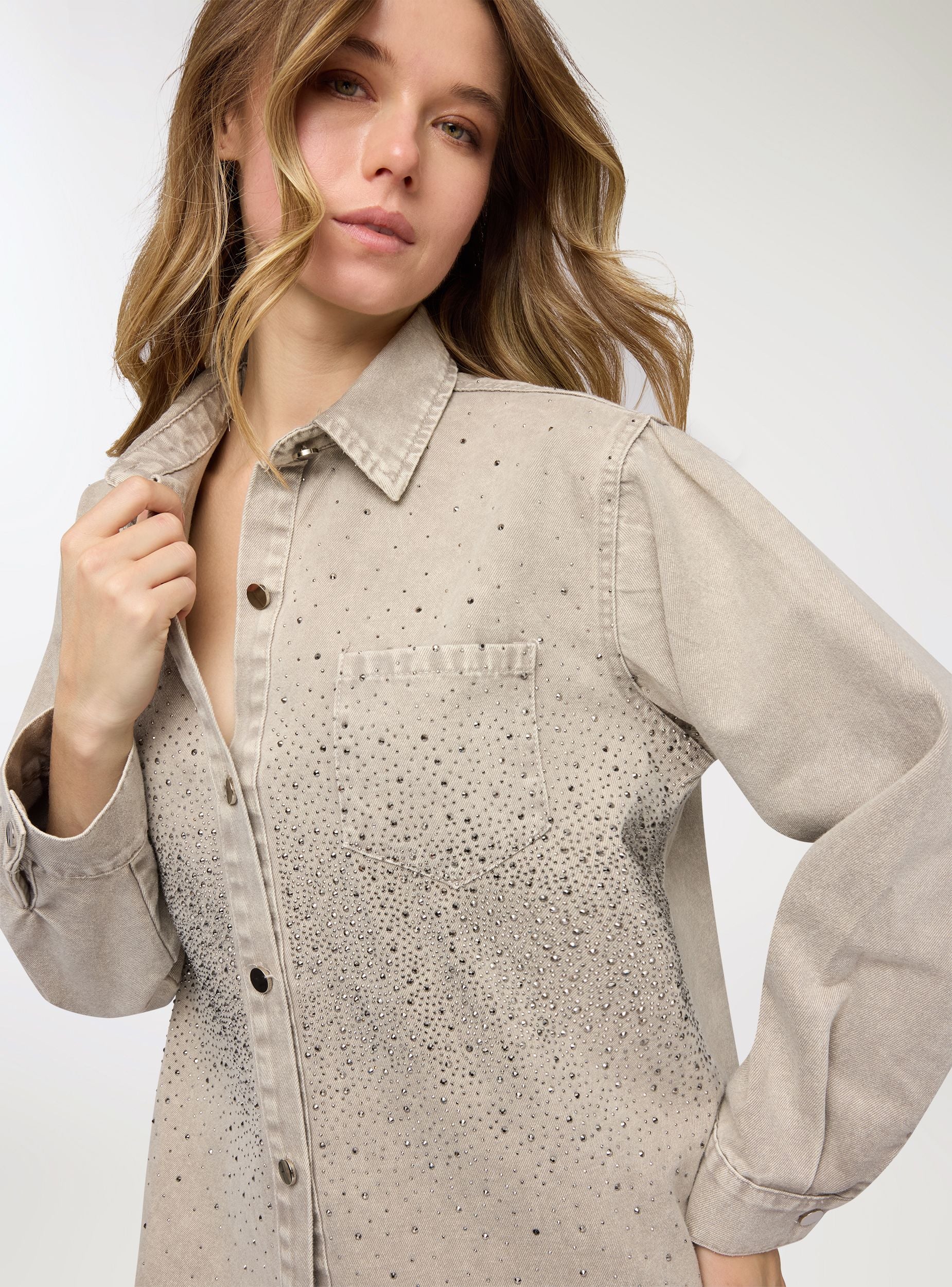 Camicia da donna in denim a tinta unita in stile shacket, ideale come strato leggero per look casual o urban. Colletto a punta, maniche lunghe e chiusura frontale con bottoni. Taschino applicato sul petto e profilo arrotondato sul fondo. La decorazione con strass dona un effetto luccicante che eleva jeans e stivaletti o un pantalone dritto per uscite serali.Dettagli