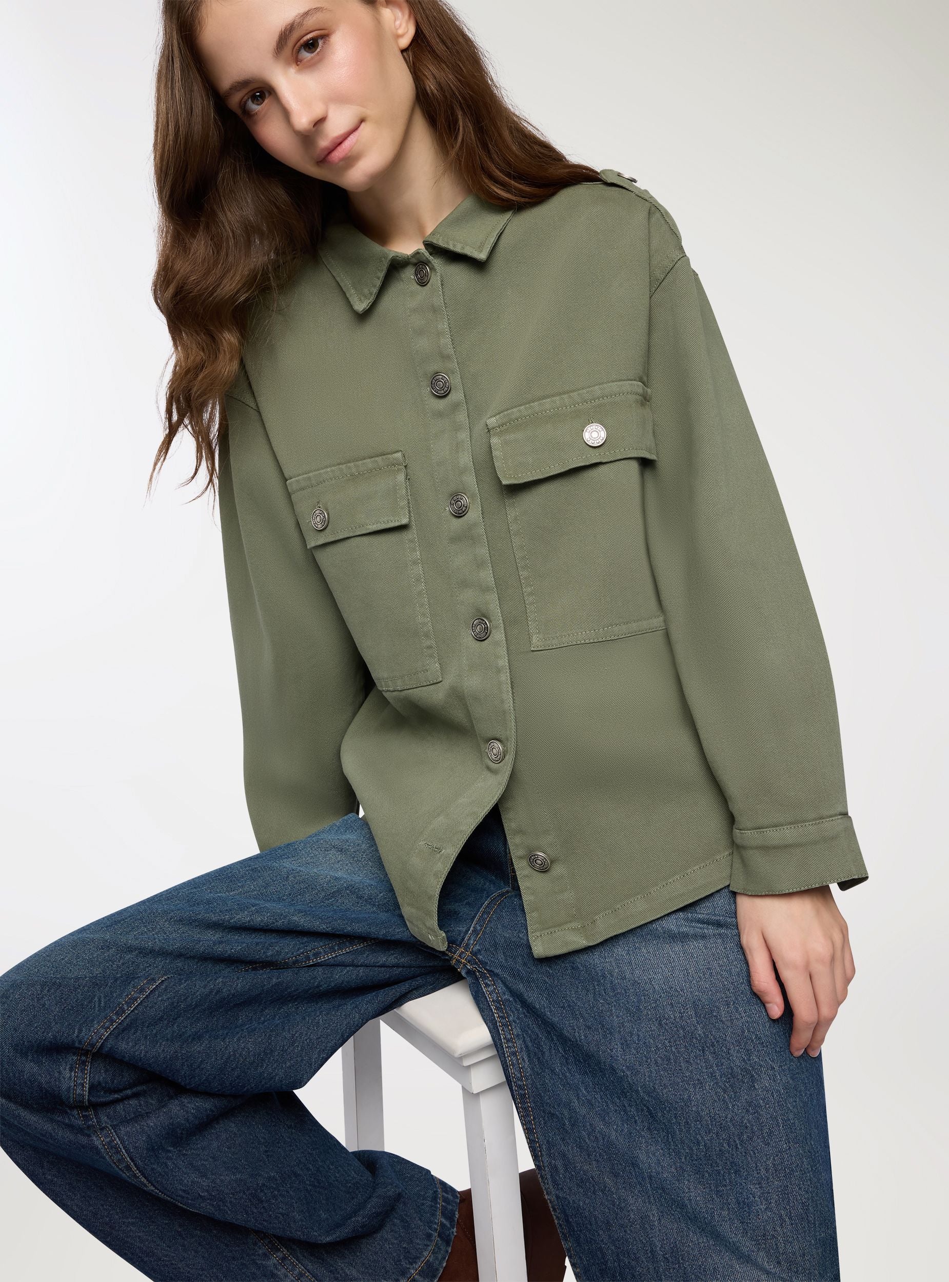 Shacket da donna in tinta unita, ideale per look casual e urban. Colletto a punta, maniche lunghe e chiusura frontale con bottoni a pressione. Presenta due tasche applicate sul petto con pattina e bottoni, spalle con alamari decorativi e vestibilità regular che consente di indossarla aperta su top e magliette o abbottonata con jeans e pantaloni cargo per uscite e tempo libero.Dettagli