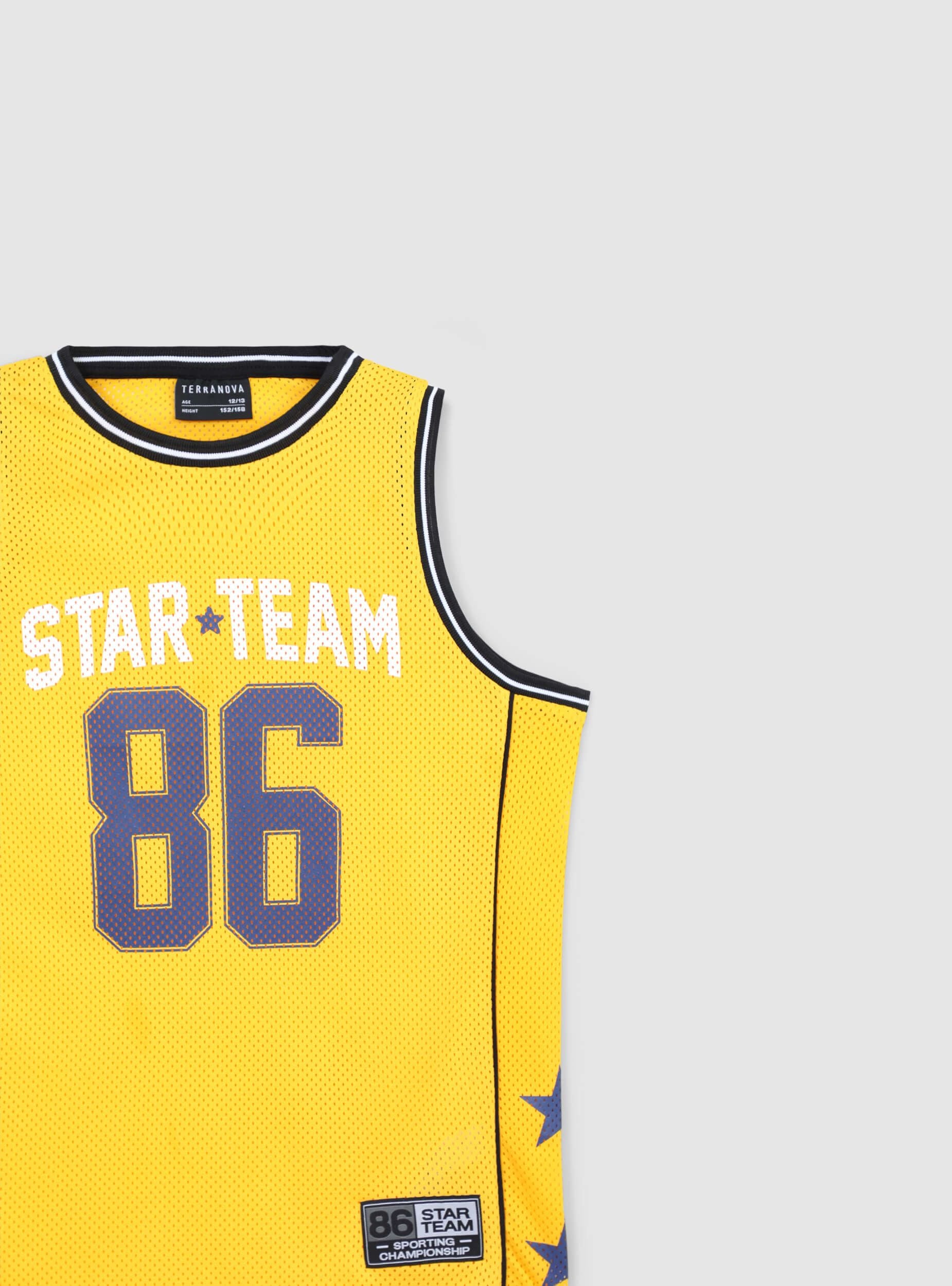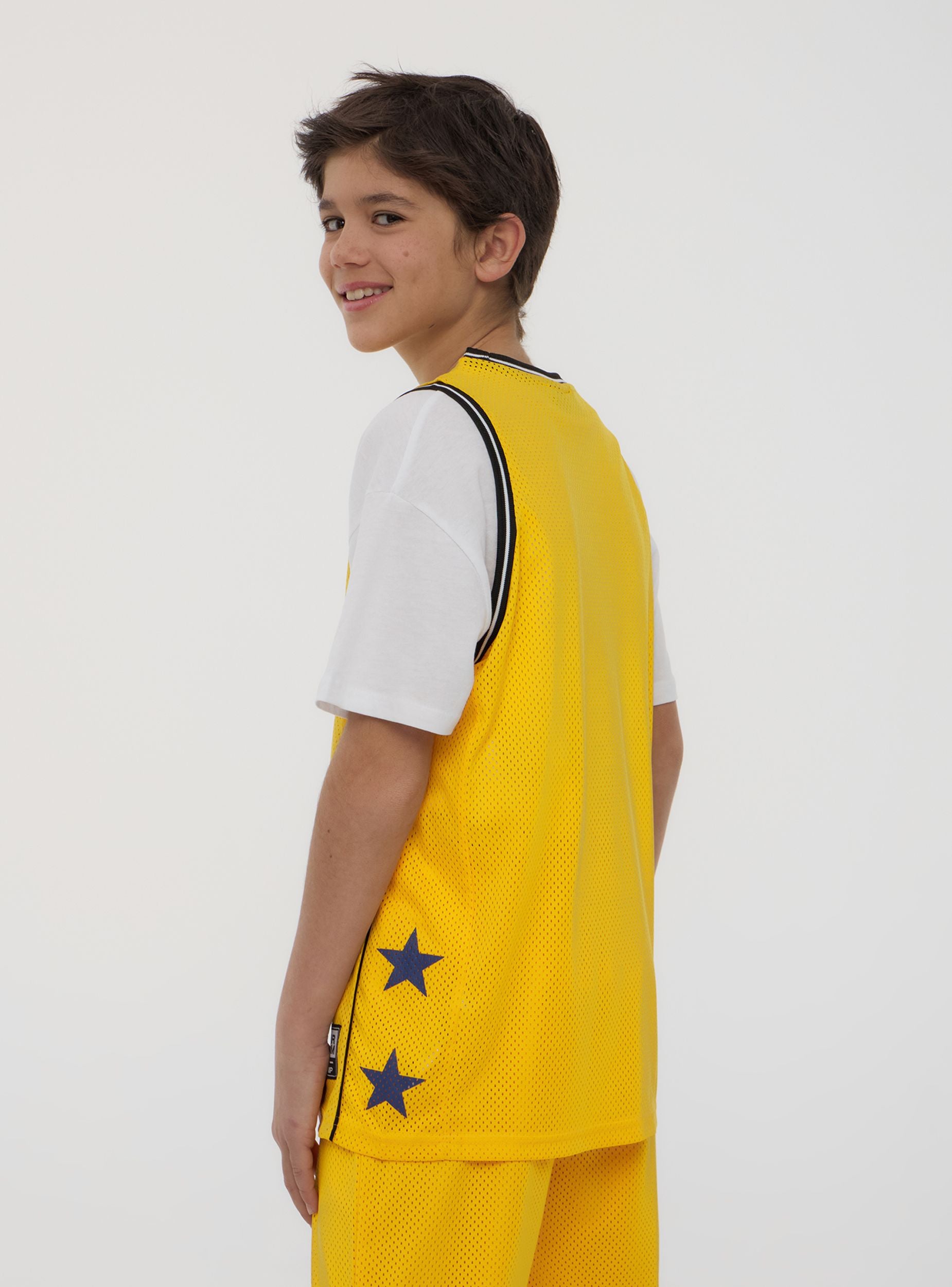 Canotta a rete da bambino ideale per attività sportive e tempo libero. Perfetta per un look dinamico e casual, presenta una vestibilità regolare e un design con stampa grafica. Adatta per abbinamenti con pantaloncini o tute sportive, garantisce comfort e stile in ogni occasione.Dettagli