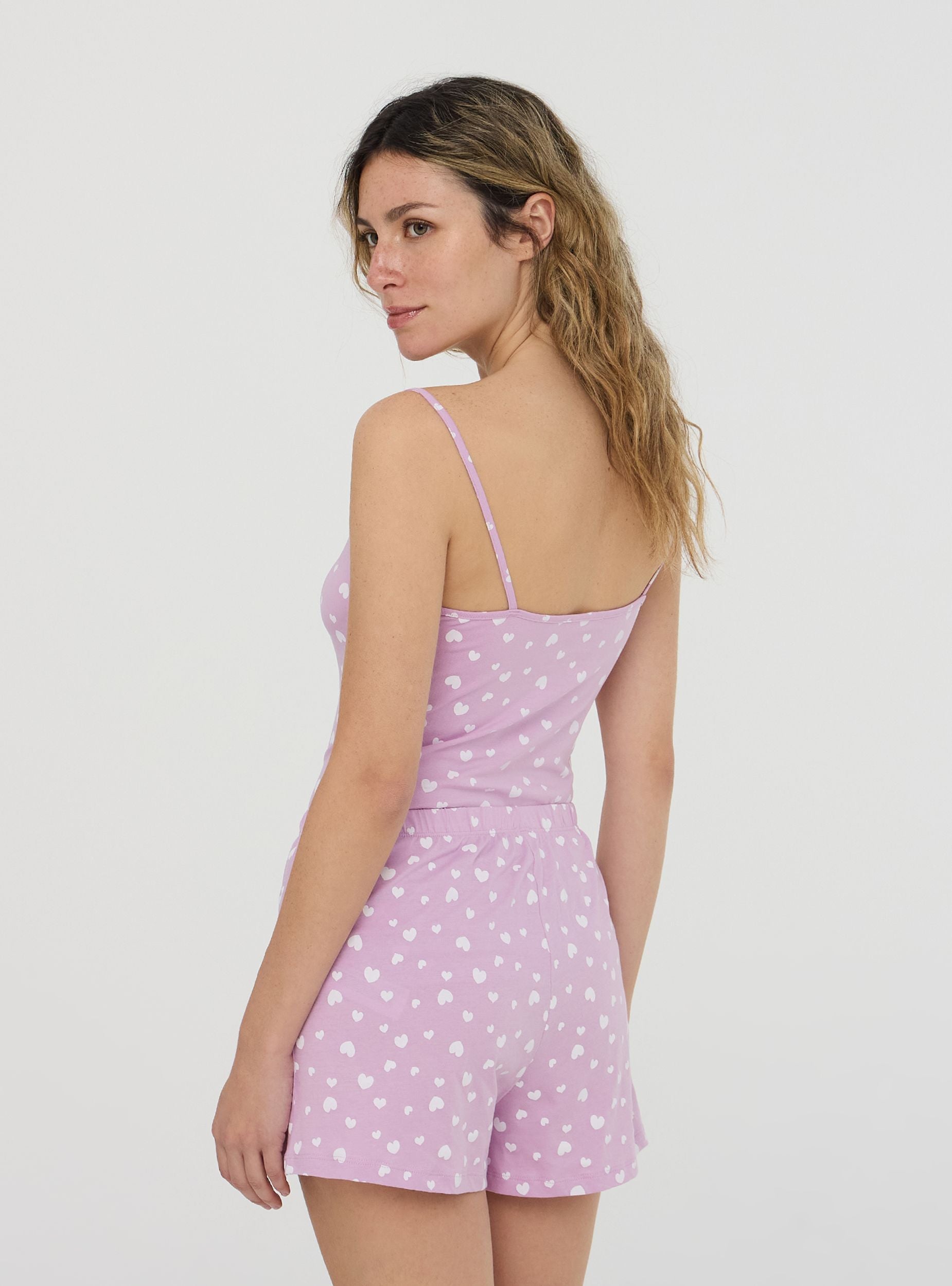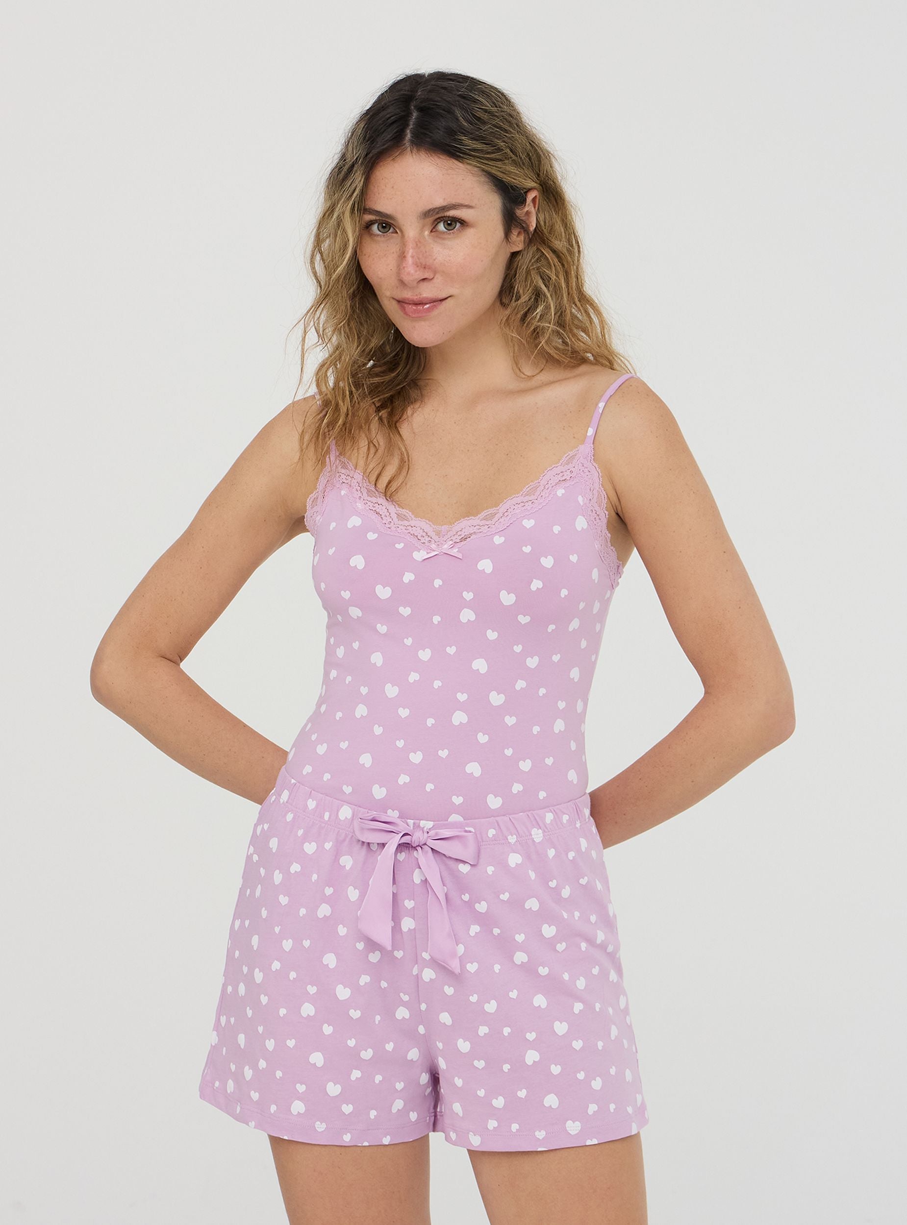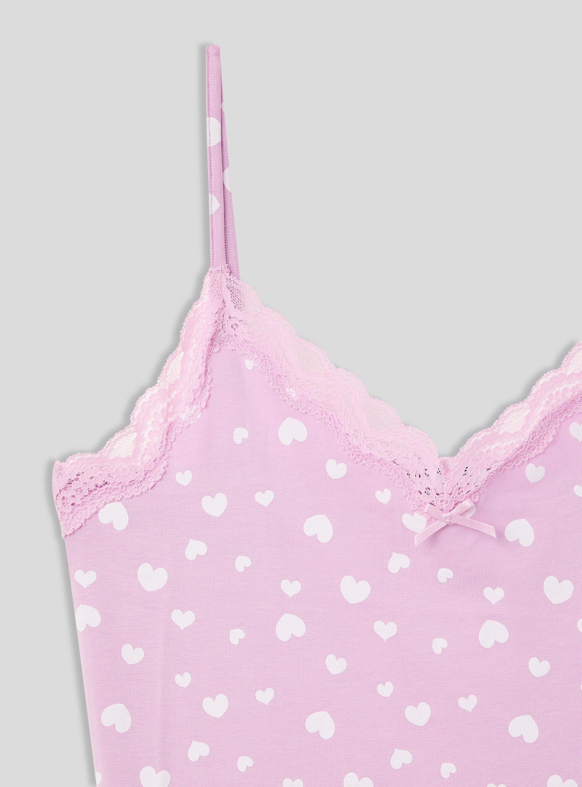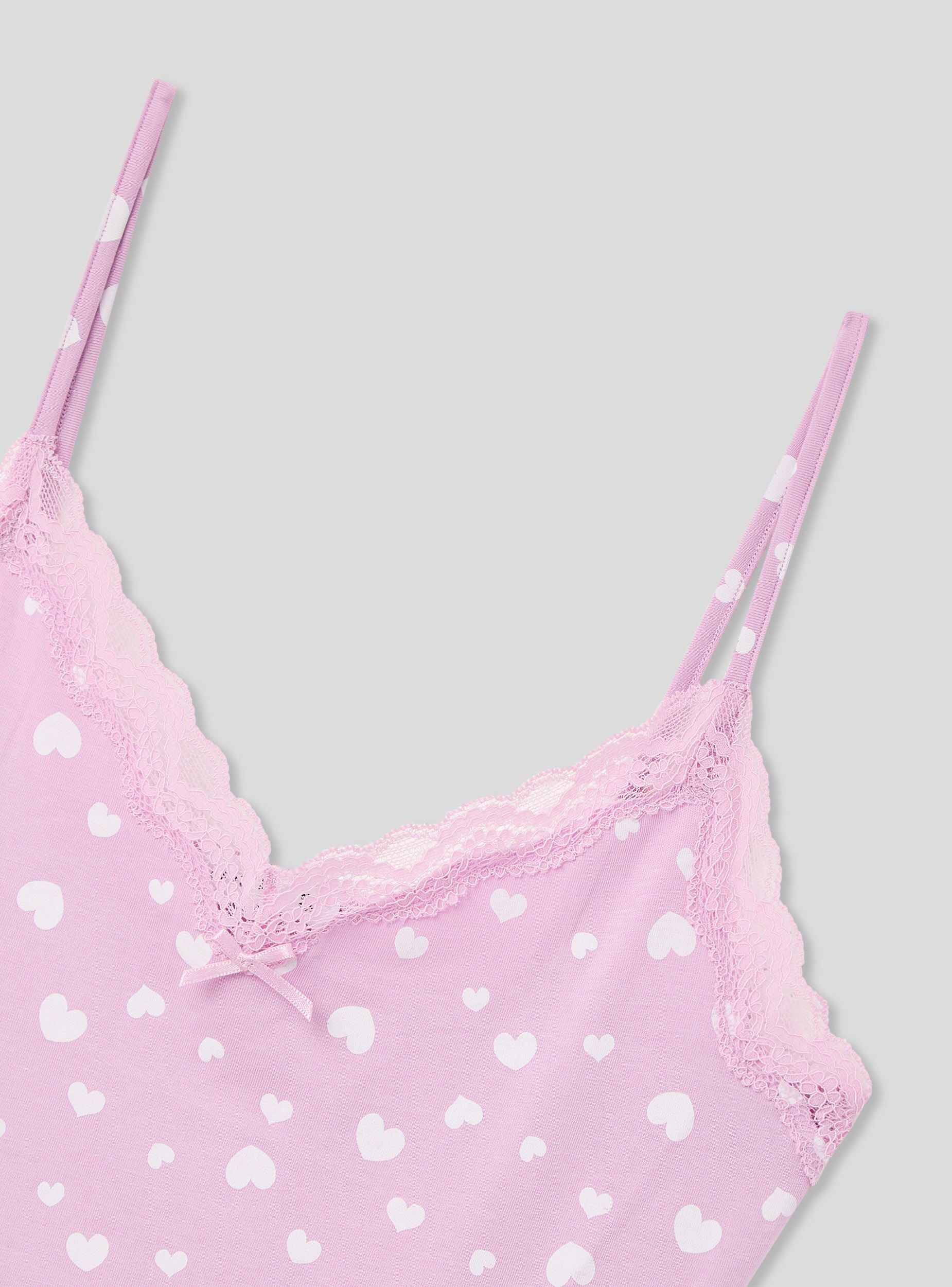 Canotta da donna dal design romantico, decorata con un delicato motivo a cuori e rifinita con dettagli in pizzo per un tocco femminile. Le spalline sottili e il fiocco frontale aggiungono eleganza e leggerezza. Perfetta da indossare sotto maglie o camicie per un comfort quotidiano, oppure come capo da notte per un look intimo raffinato e confortevole.Dettagli