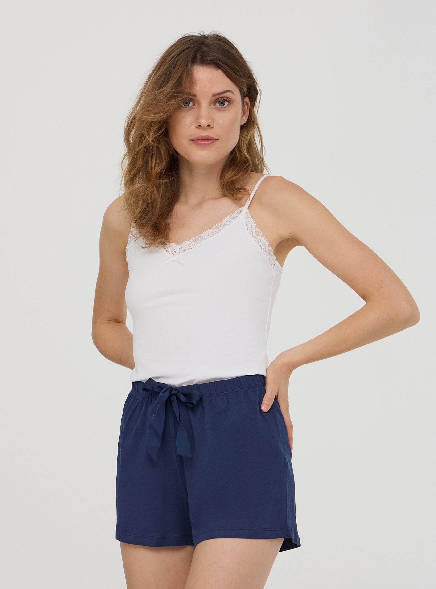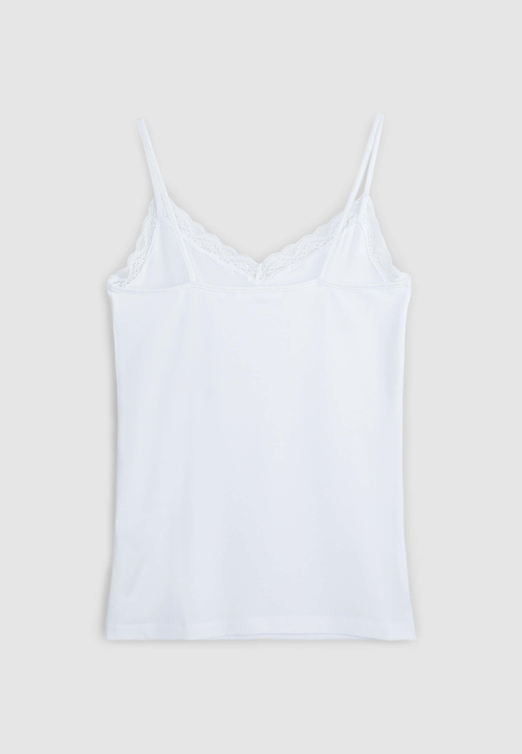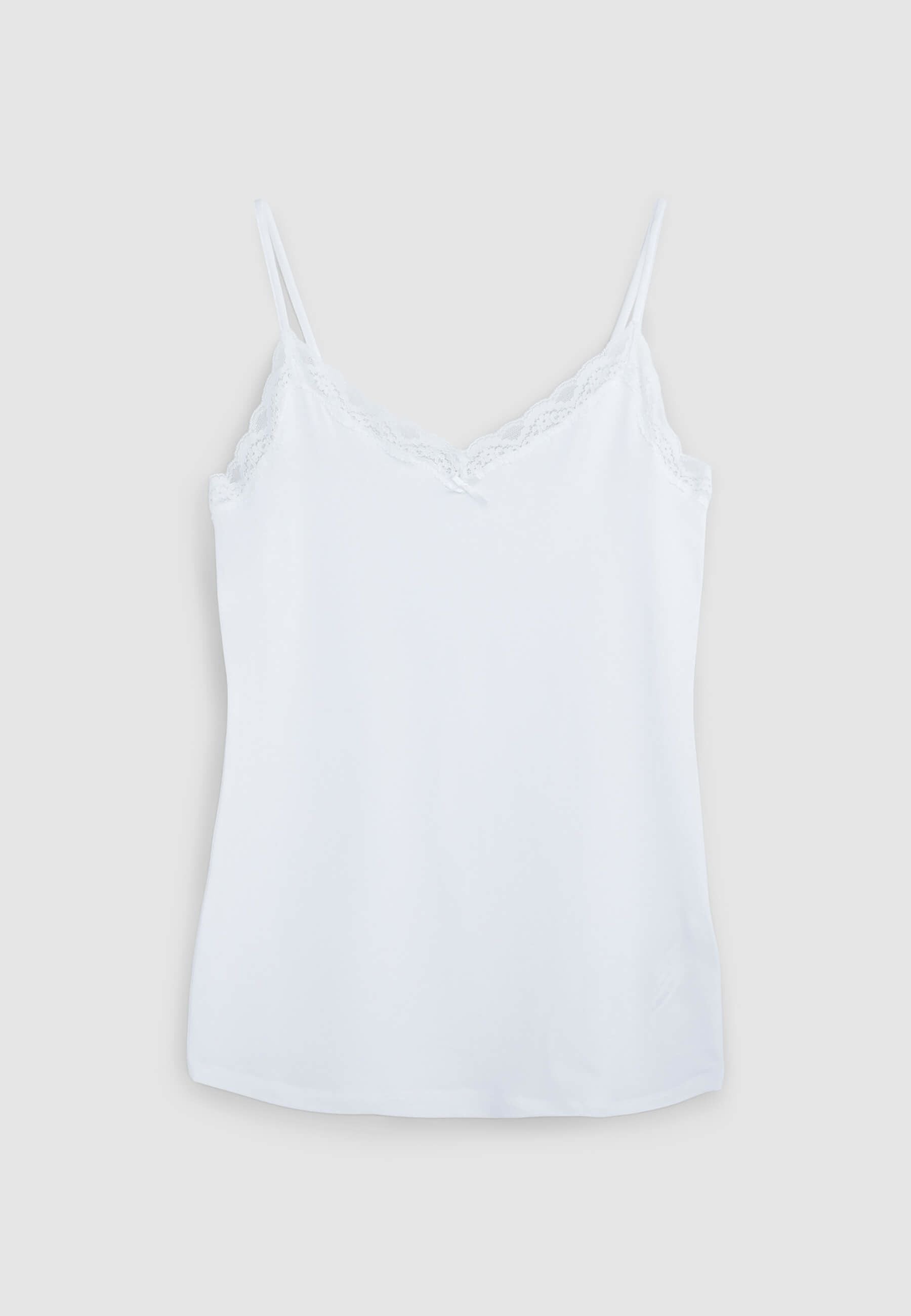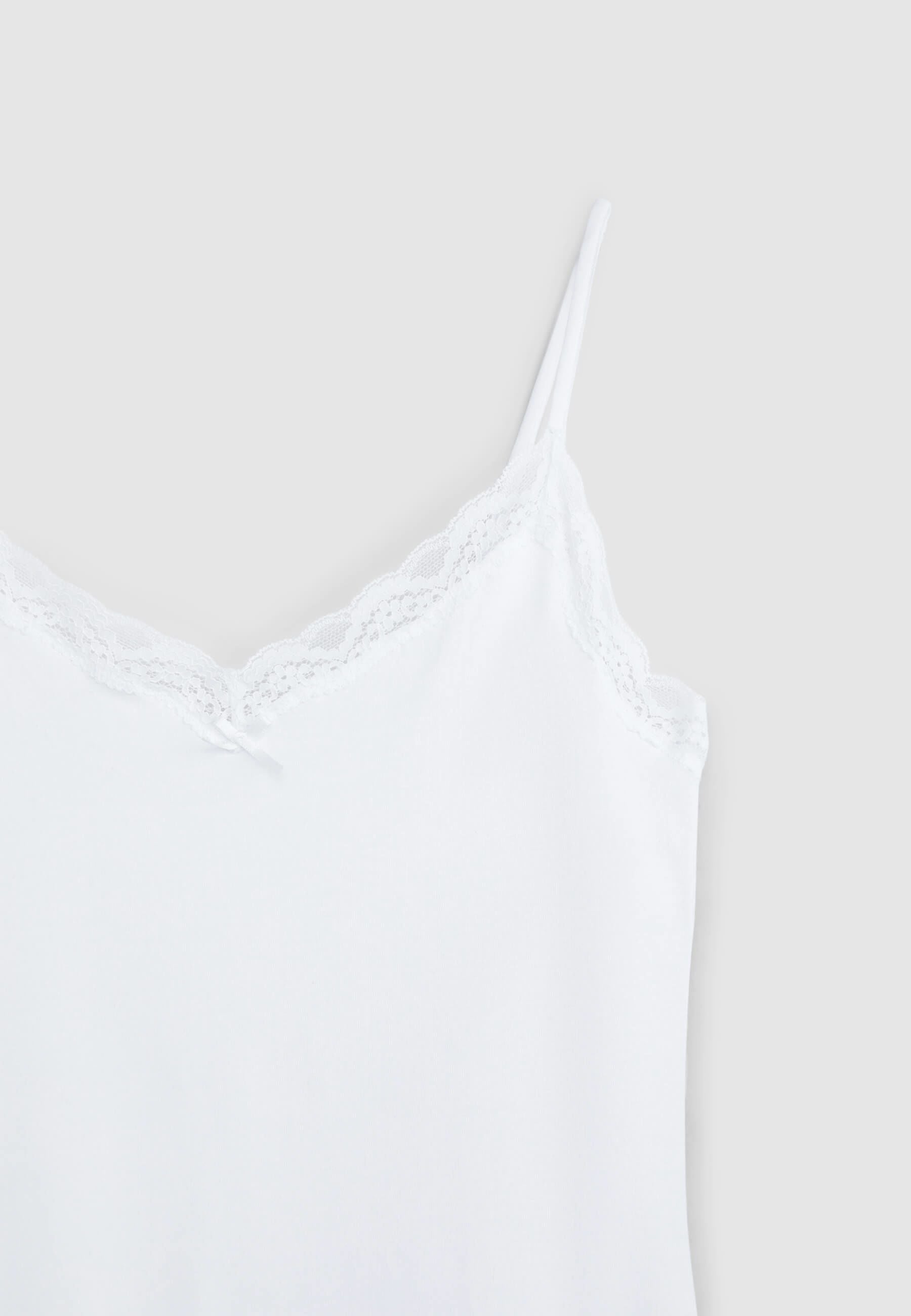 Canotta da donna dal design raffinato e femminile. Presenta una tinta unita valorizzata da delicati profili in pizzo lungo lo scollo e un piccolo fiocchetto decorativo al centro. Le spalline sottili aggiungono un tocco di eleganza, rendendola ideale per un look intimo curato e confortevole.Dettagli