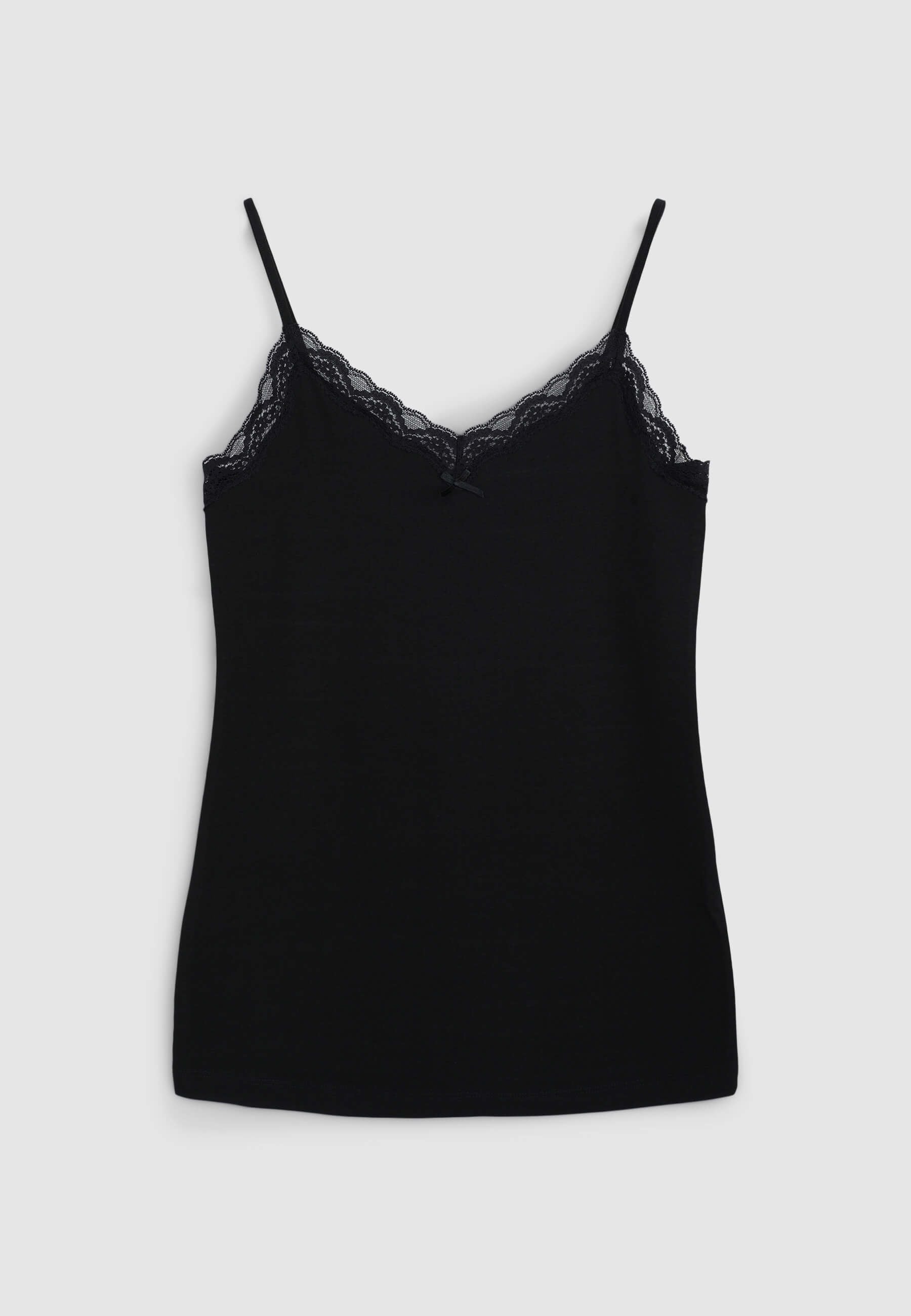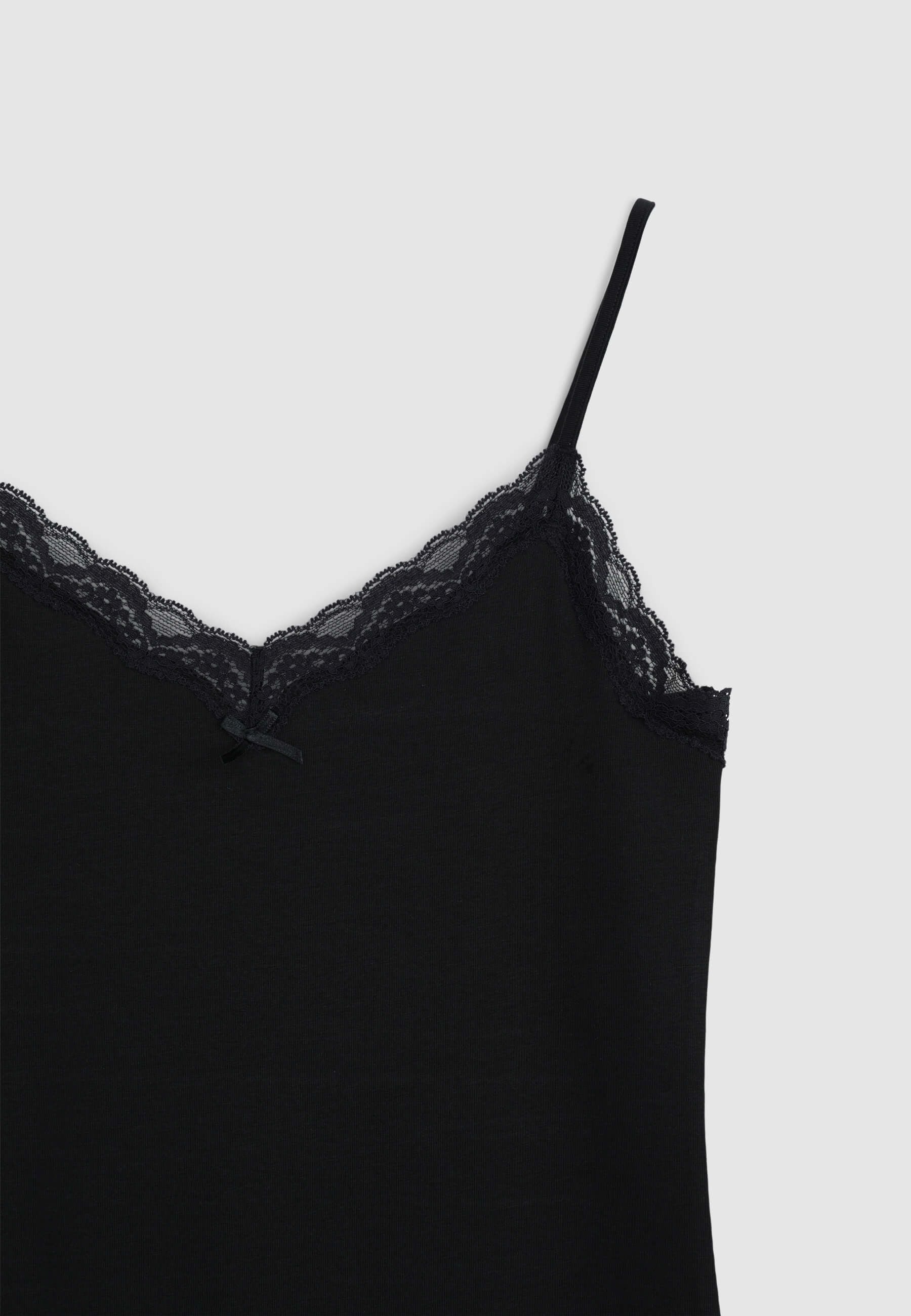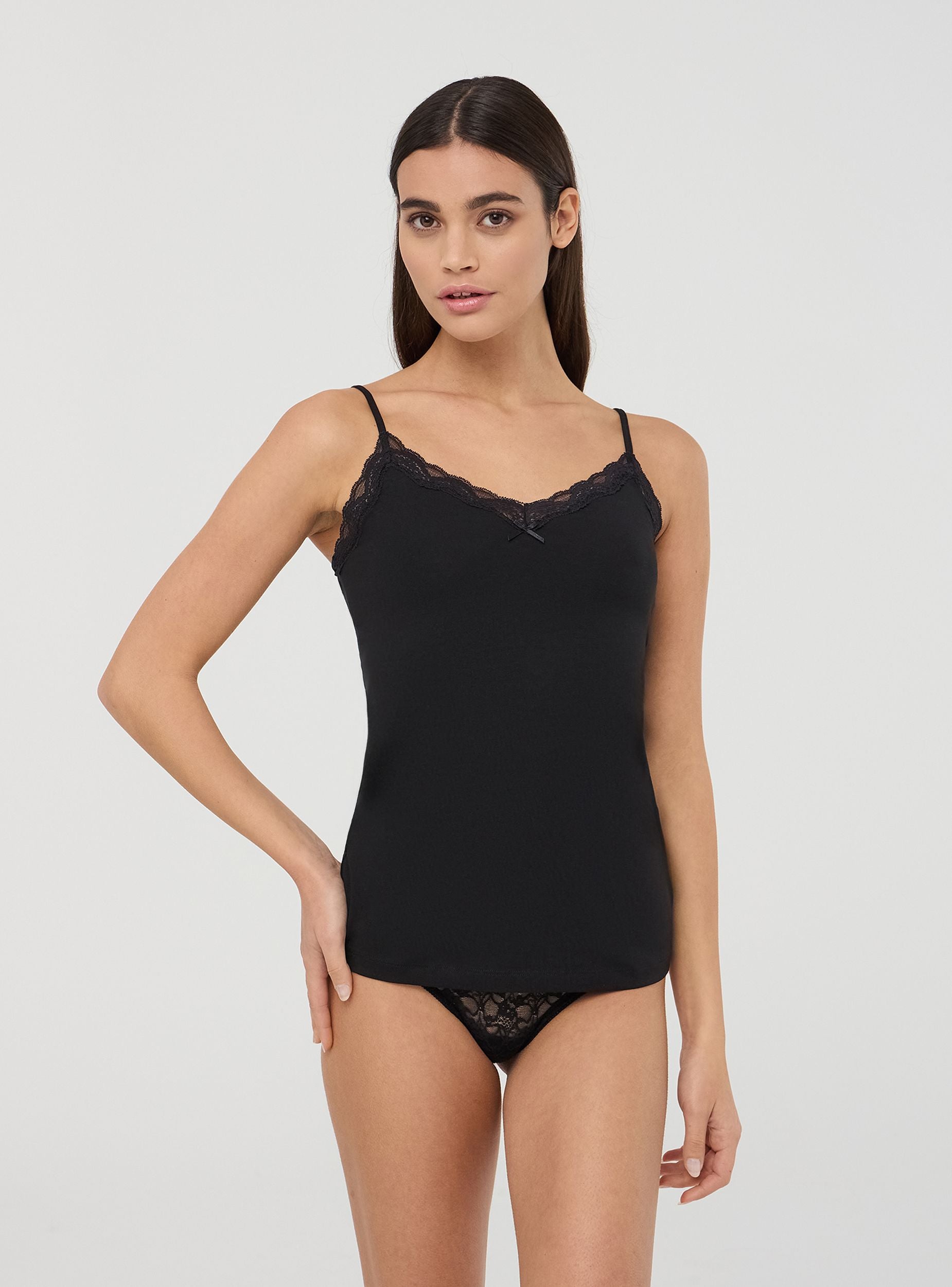 Canotta da donna dal design raffinato e femminile. Presenta una tinta unita valorizzata da delicati profili in pizzo lungo lo scollo e un piccolo fiocchetto decorativo al centro. Le spalline sottili aggiungono un tocco di eleganza, rendendola ideale per un look intimo curato e confortevole.Dettagli