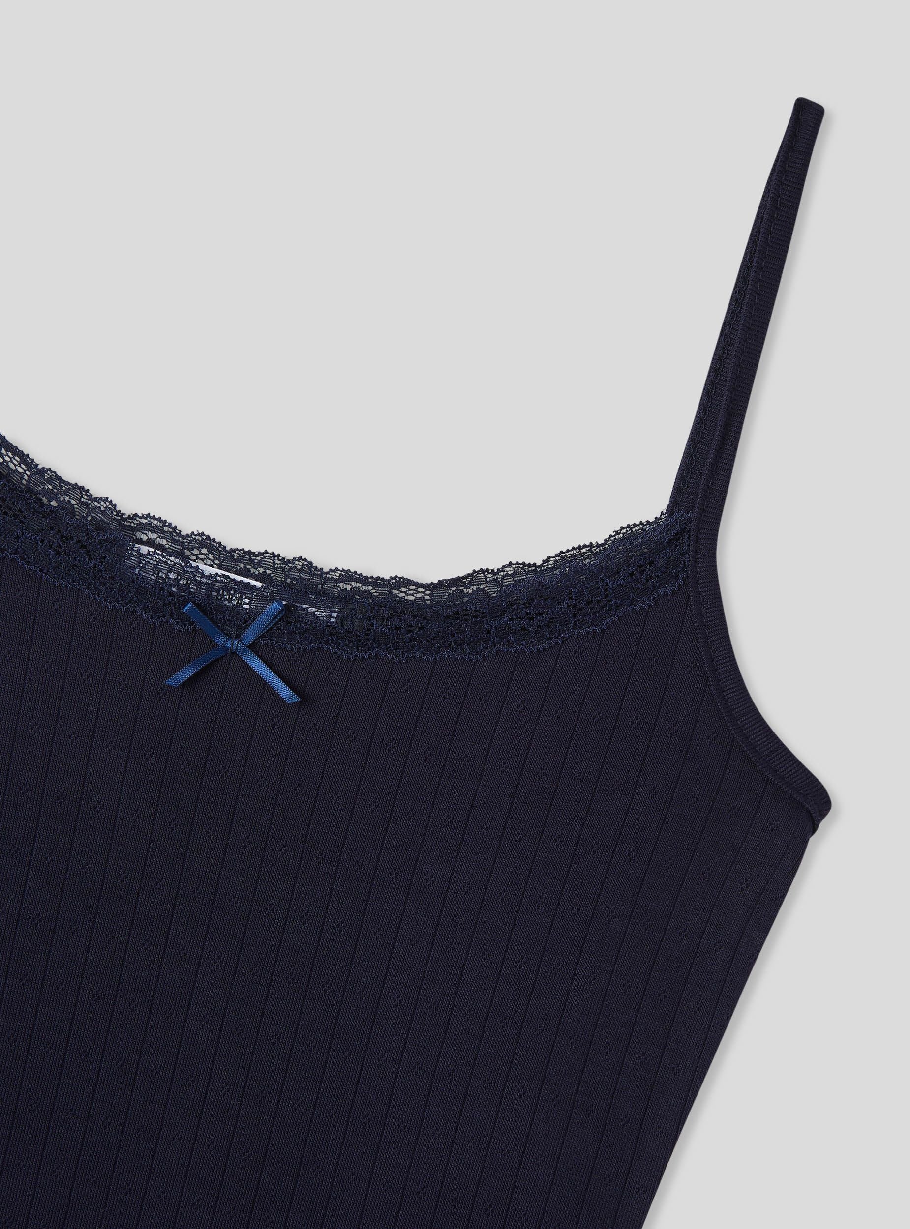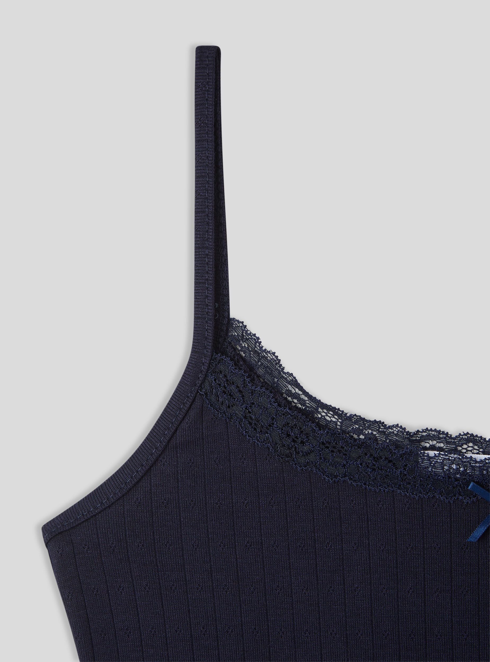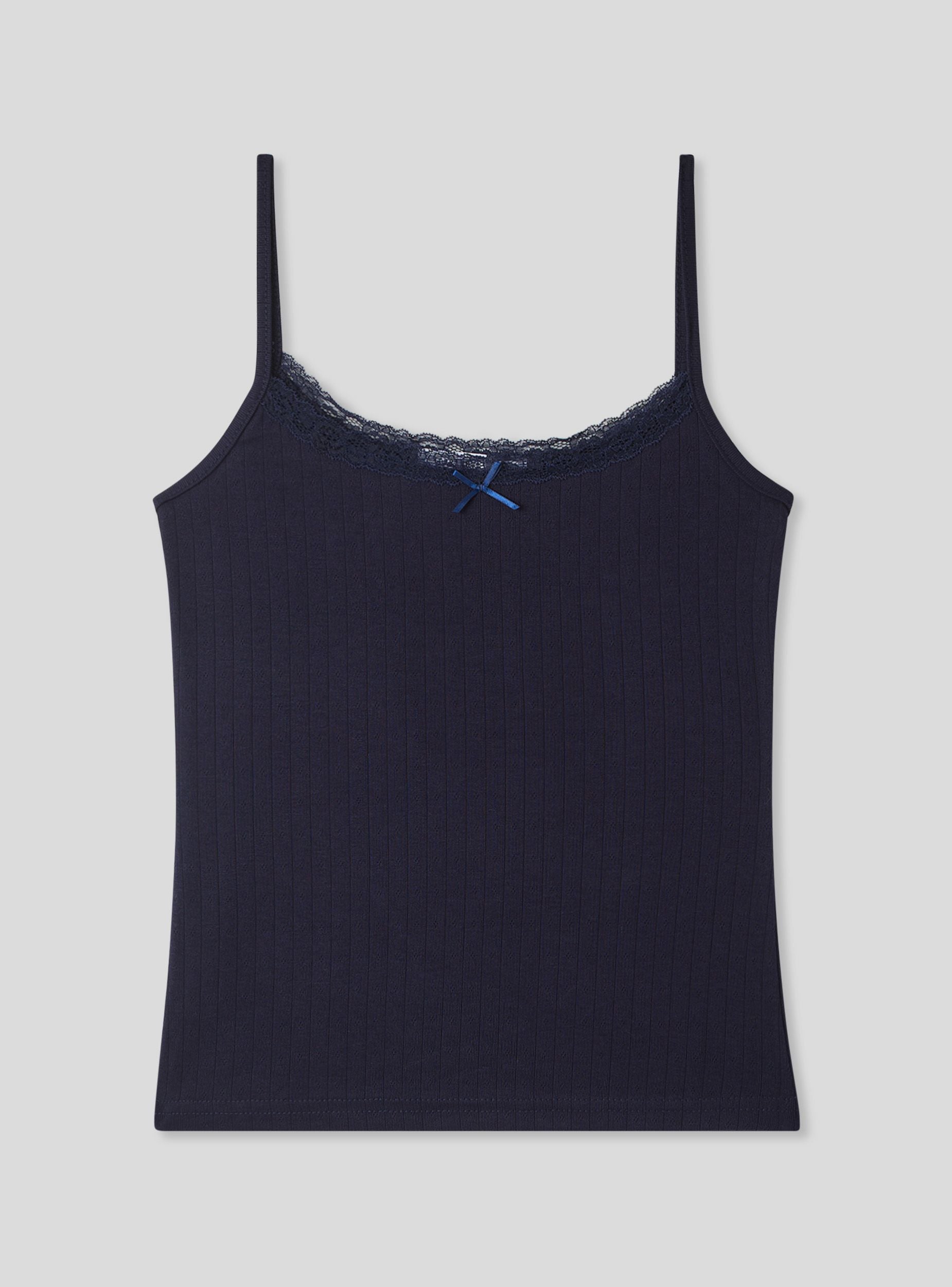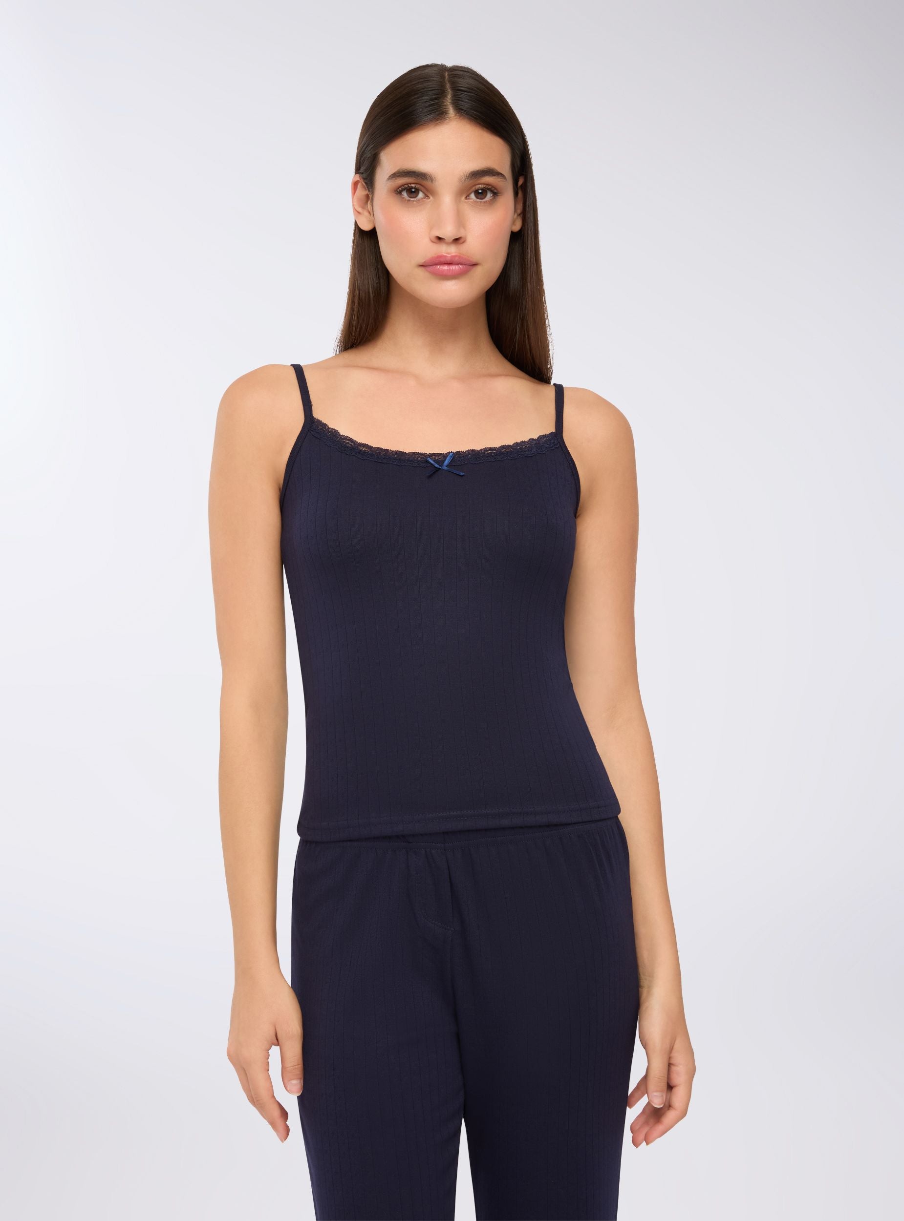Canotta da donna con spalline sottili, ideale per un look casual e femminile. Presenta un dettaglio in pizzo sullo scollo che aggiunge un tocco di eleganza. Perfetta da indossare sotto una giacca o da sola per un outfit estivo. La vestibilità regolare garantisce comfort e stile in ogni occasione.Dettagli