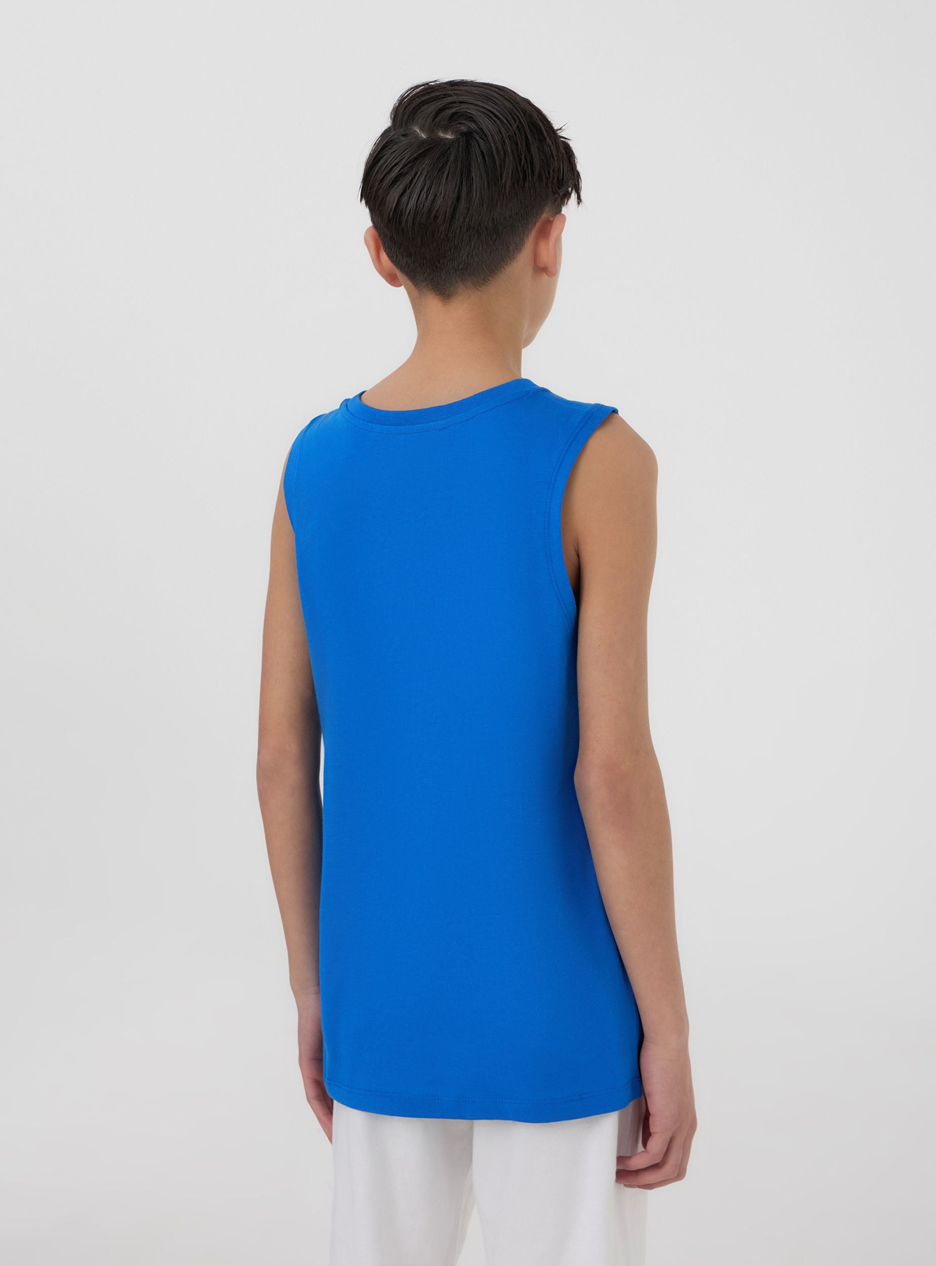 Canotta da bambino caratterizzata da un design semplice e a tinta unita, con una comoda vestibilità smanicata, perfetta per i mesi estivi. Sul petto è presente una stampa a contrasto che aggiunge un tocco sportivo e moderno al capo, rendendolo adatto sia per il tempo libero che per attività all'aperto. Un capo versatile e pratico per un look casual.Dettagli