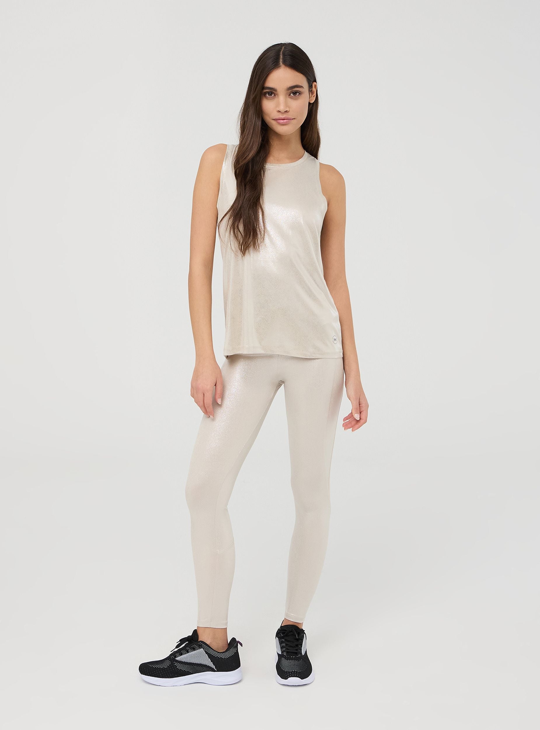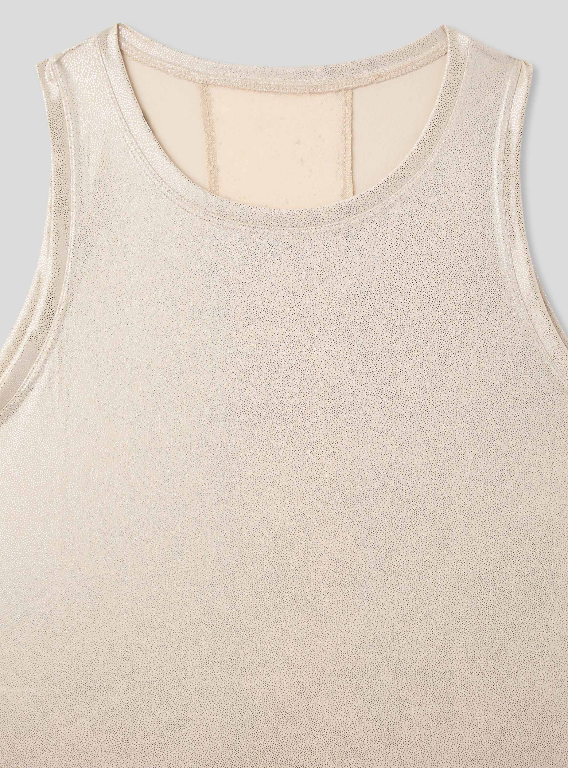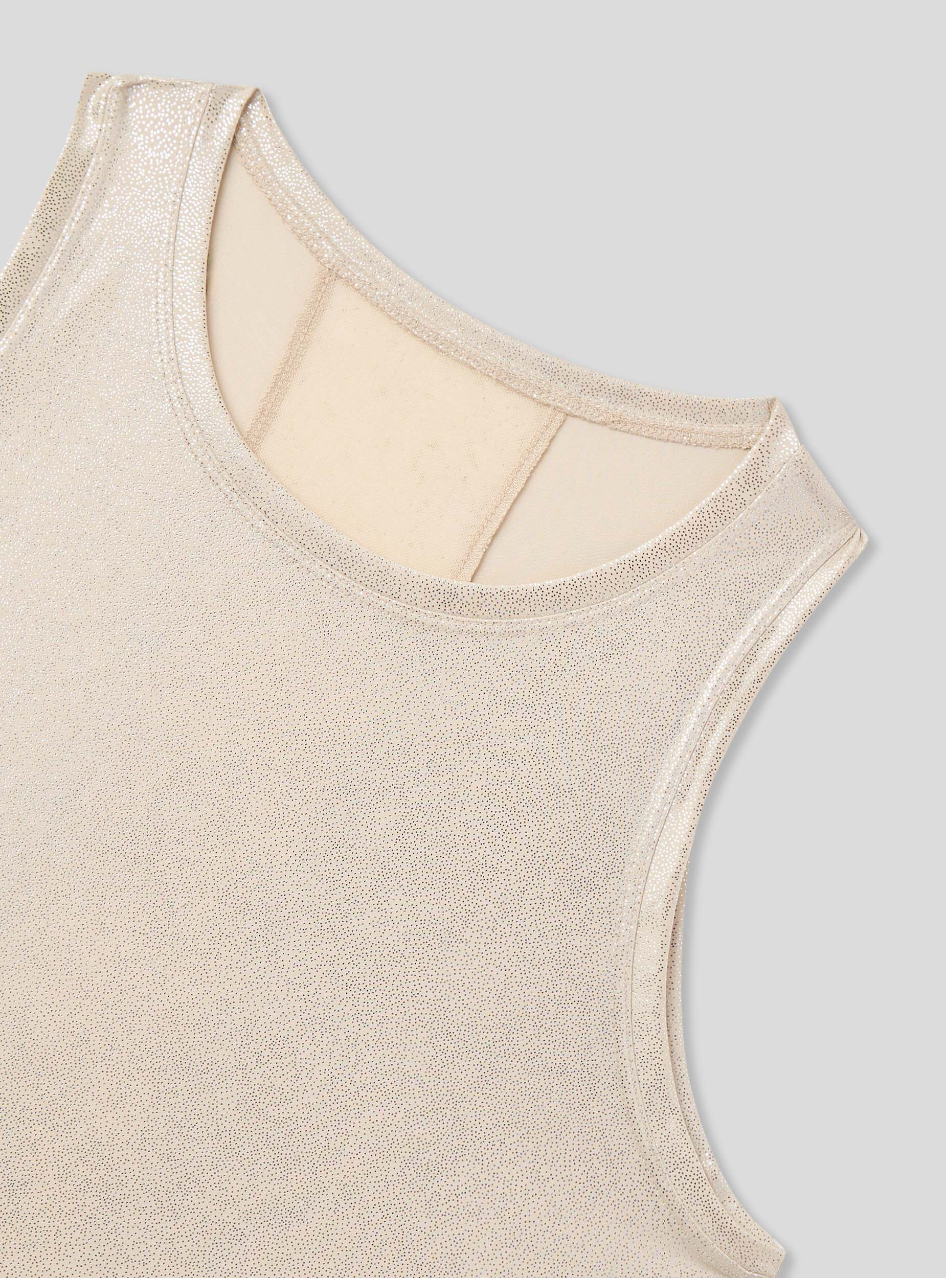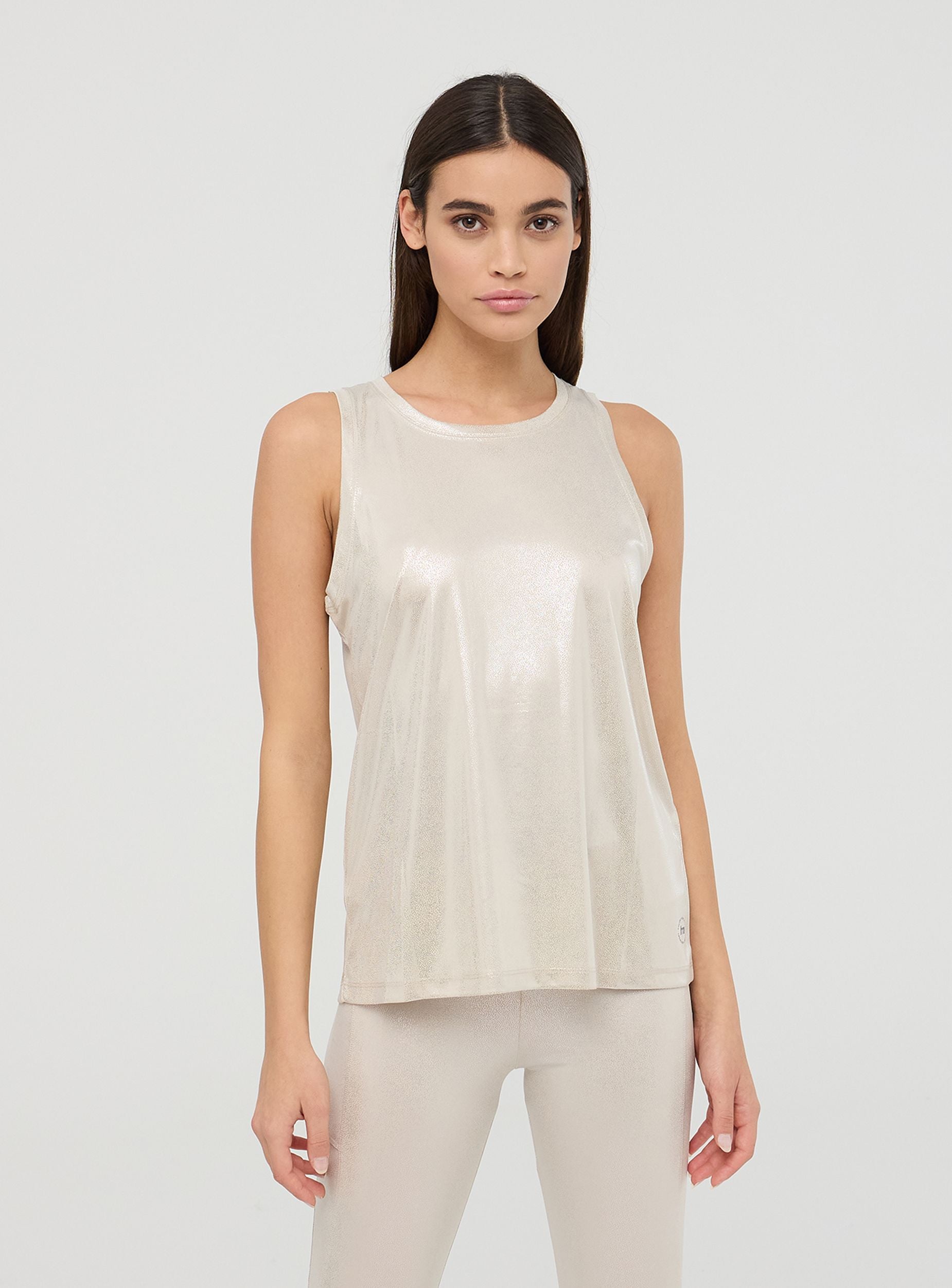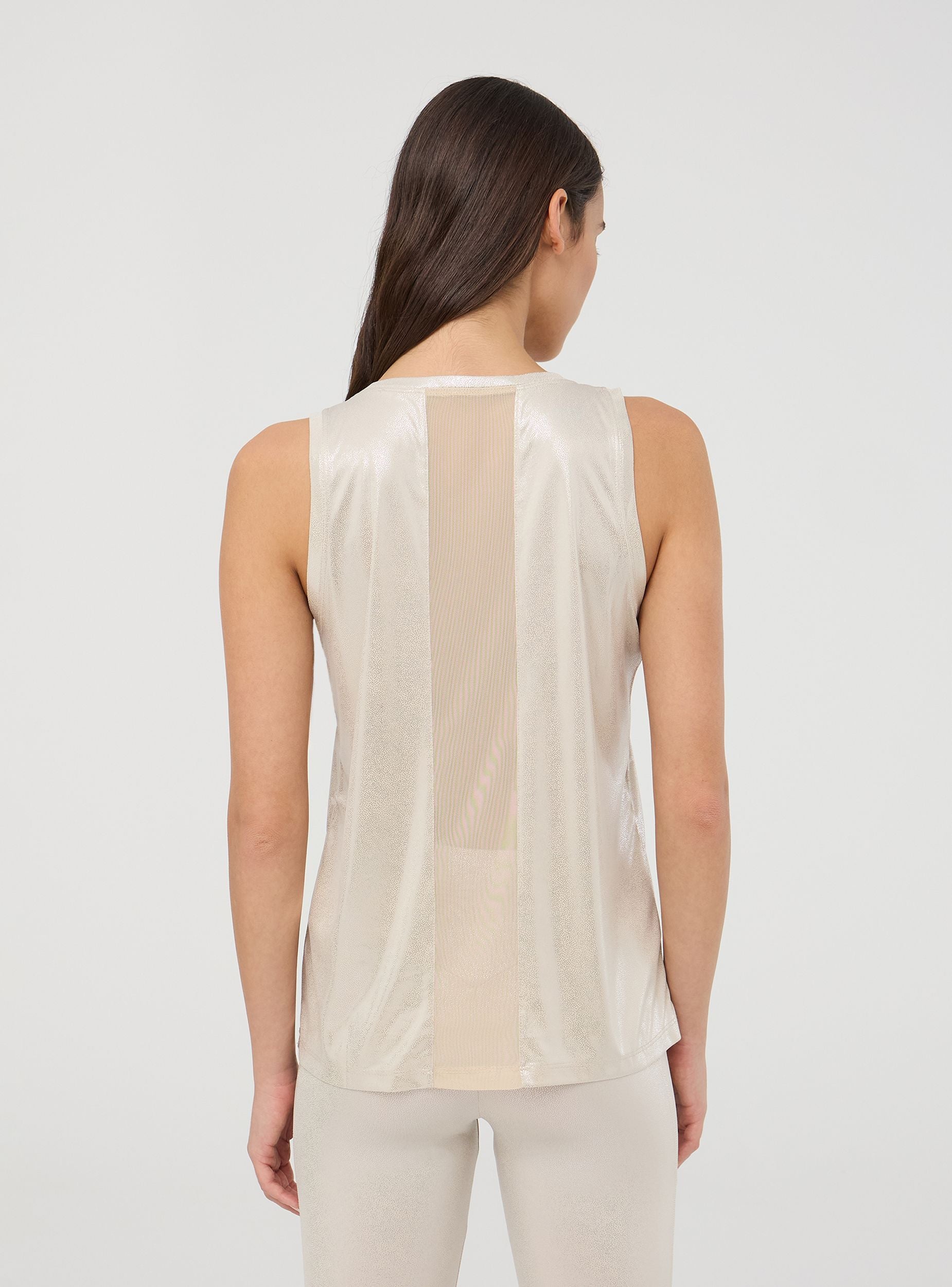 Canotta sportiva da donna perfetta per l'attività fisica o il tempo libero, caratterizzata da un design moderno ed elegante. Presenta una finitura lucida che aggiunge un tocco di luminosità al look, mentre le spalline larghe offrono comfort e praticità durante il movimento. Il dettaglio distintivo è l'inserto in tulle trasparente sul retro, che conferisce un effetto dinamico e traspirante. Tinta unita e versatile, è ideale per completare outfit sportivi o casual. Linea Active.Dettagli