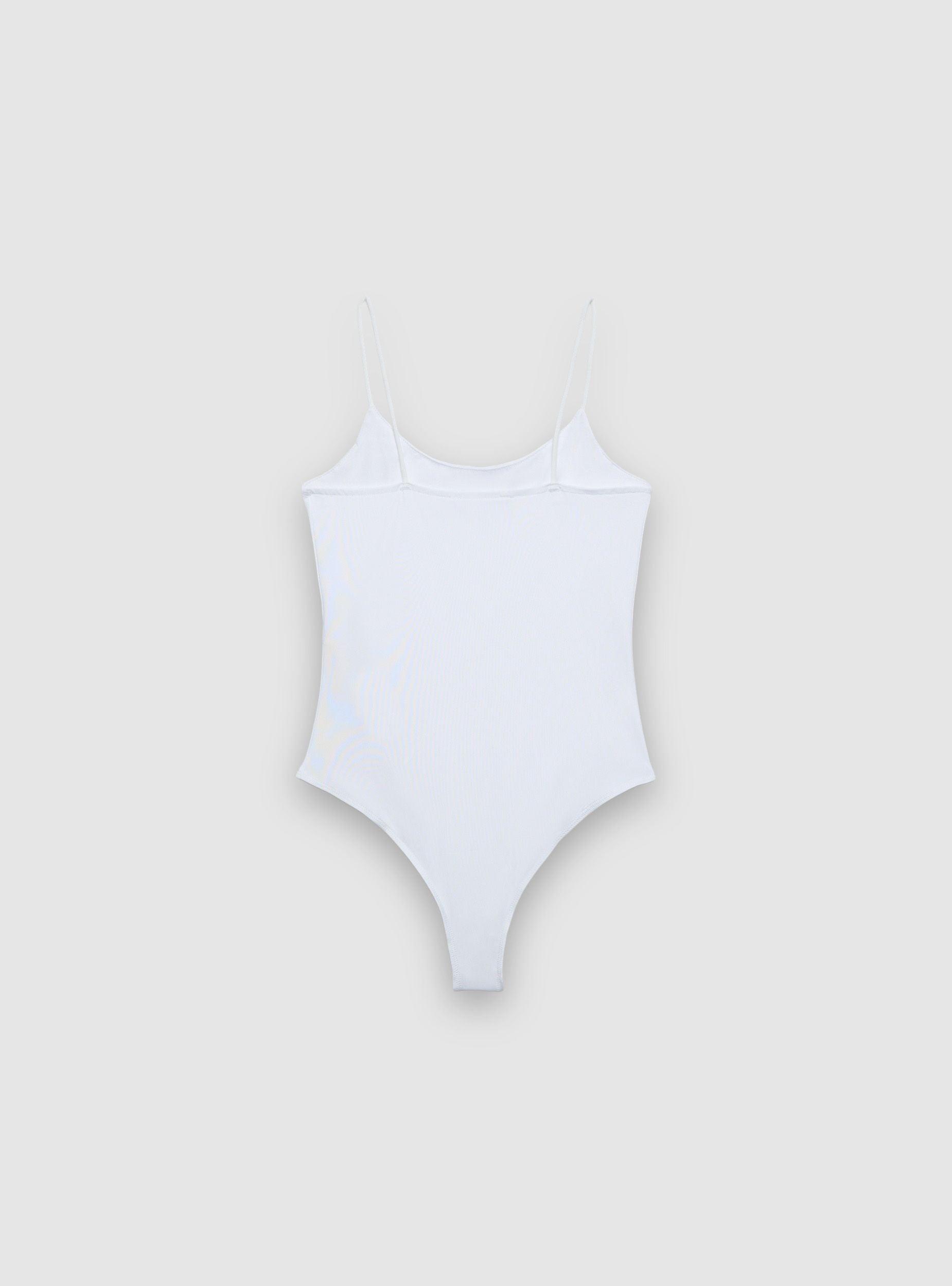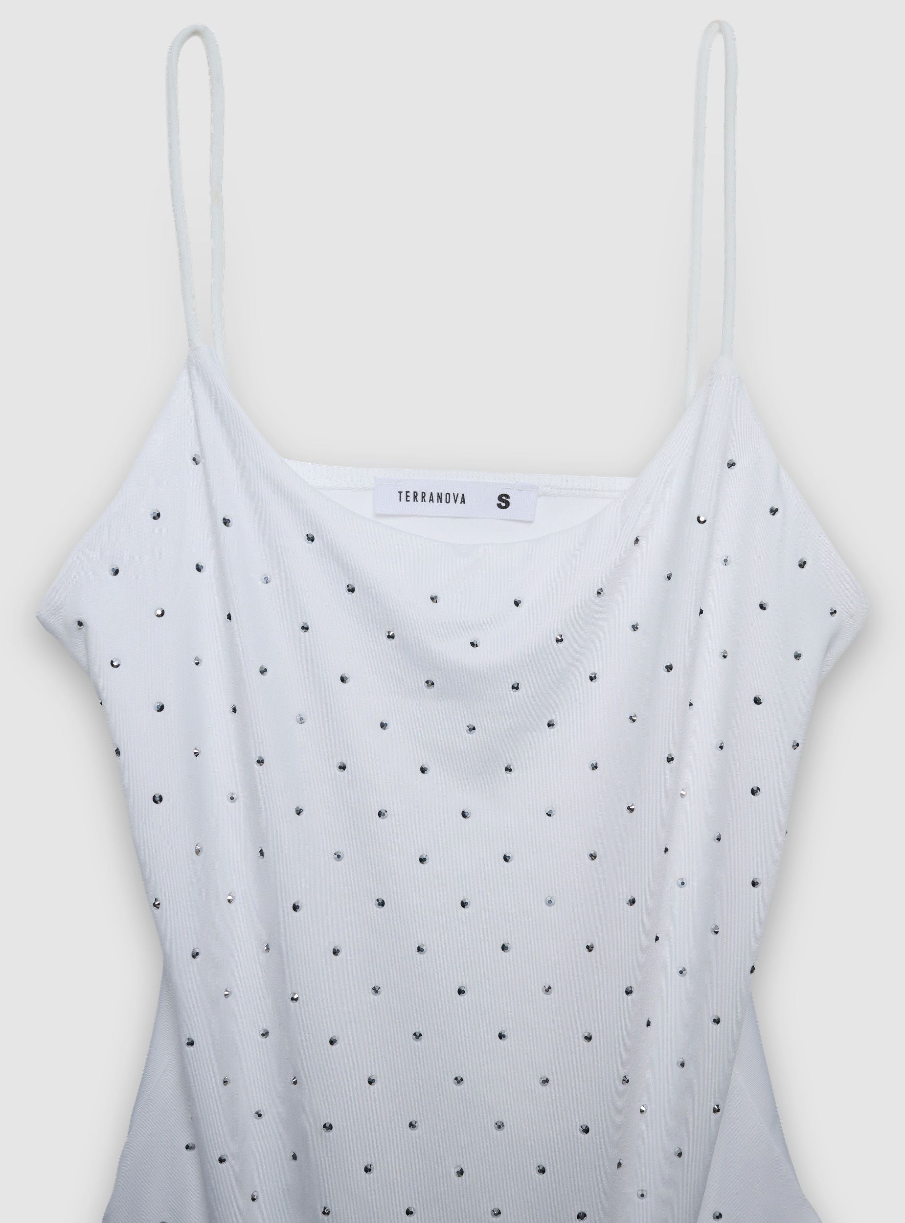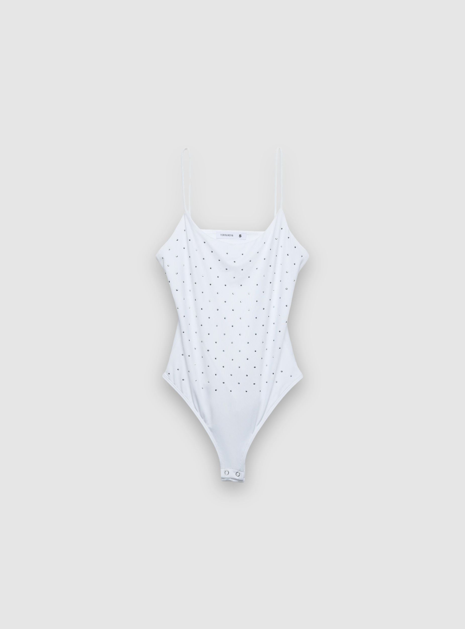 Body da donna a tinta unita con spalline sottili, impreziosito da applicazioni strass. Chiusura con bottoni a pressione al cavallo per una vestibilità pratica. Ideale sotto blazer o camicie per look serali o party, si abbina a jeans skinny o gonne midi. Linea aderente che valorizza la silhouette.Dettagli
