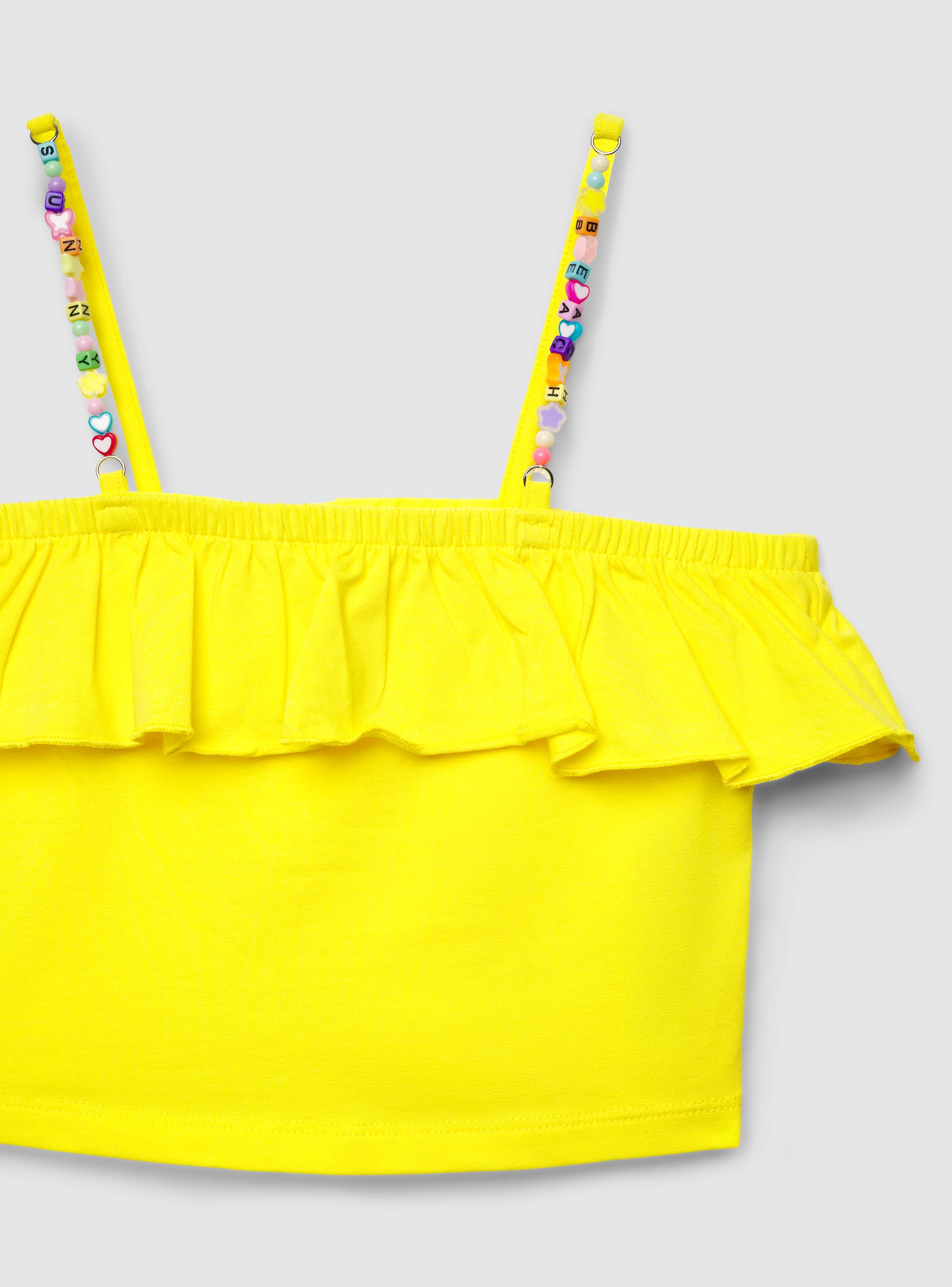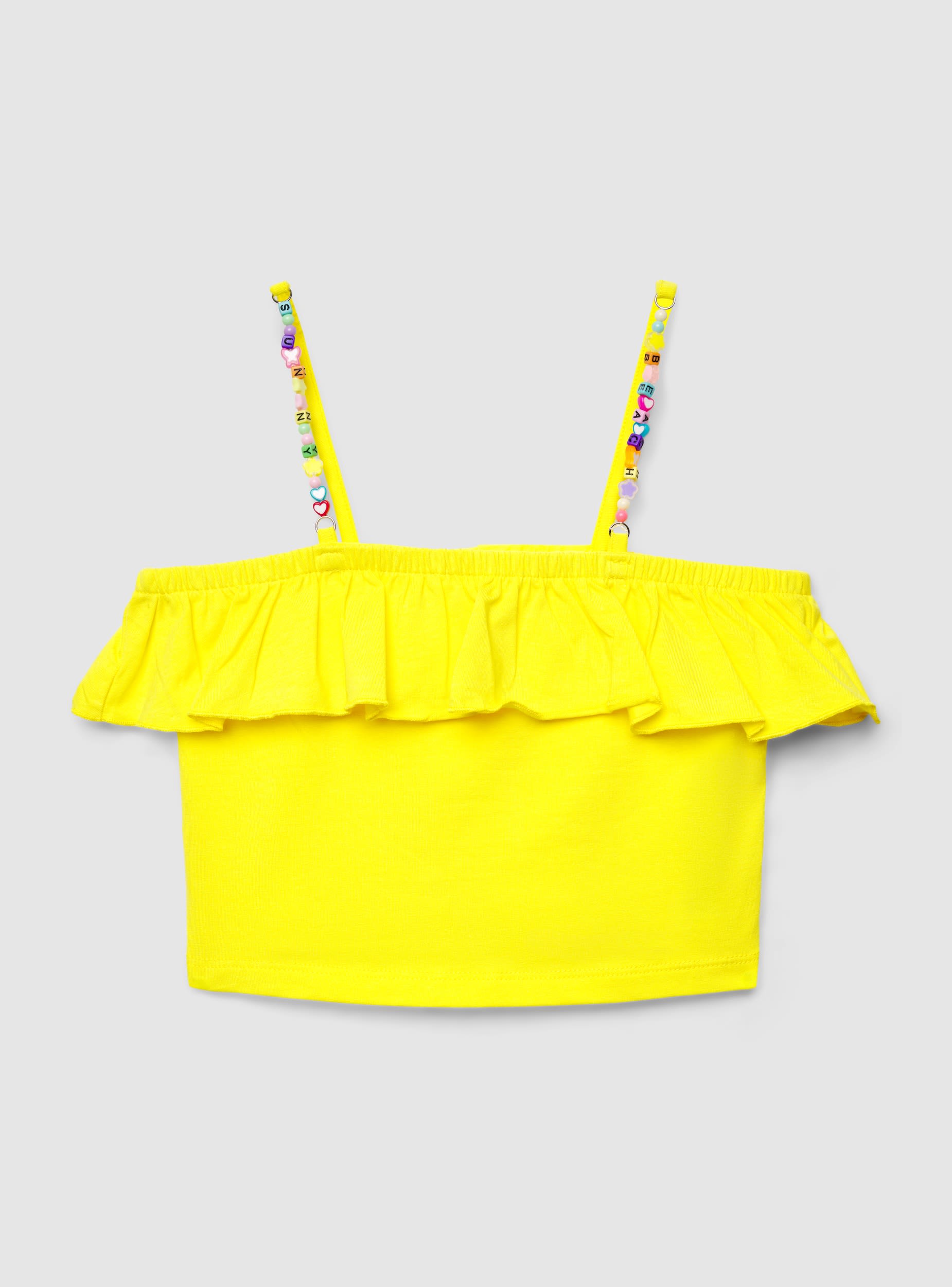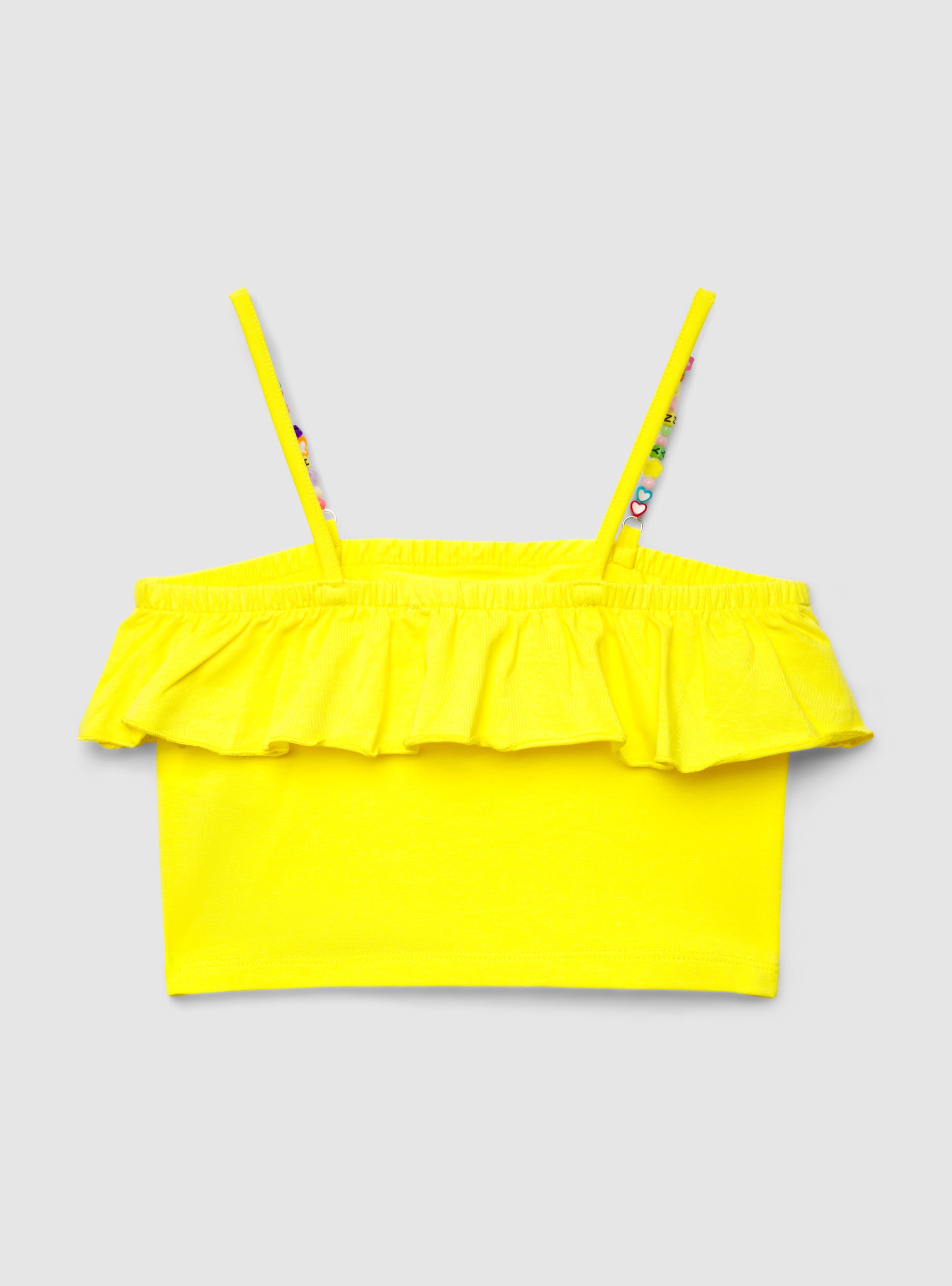 Top da bambina dal taglio crop, ideale per giornate estive e look vacanza. Modello a tinta unita con scollo dritto elasticizzato e spalline sottili decorate da perline multicolor, fissate con piccoli anelli. La balza a volant sul davanti aggiunge movimento e un tocco giocoso. Perfetto con shorts, gonne o jeans per outfit casual e trendy.Dettagli