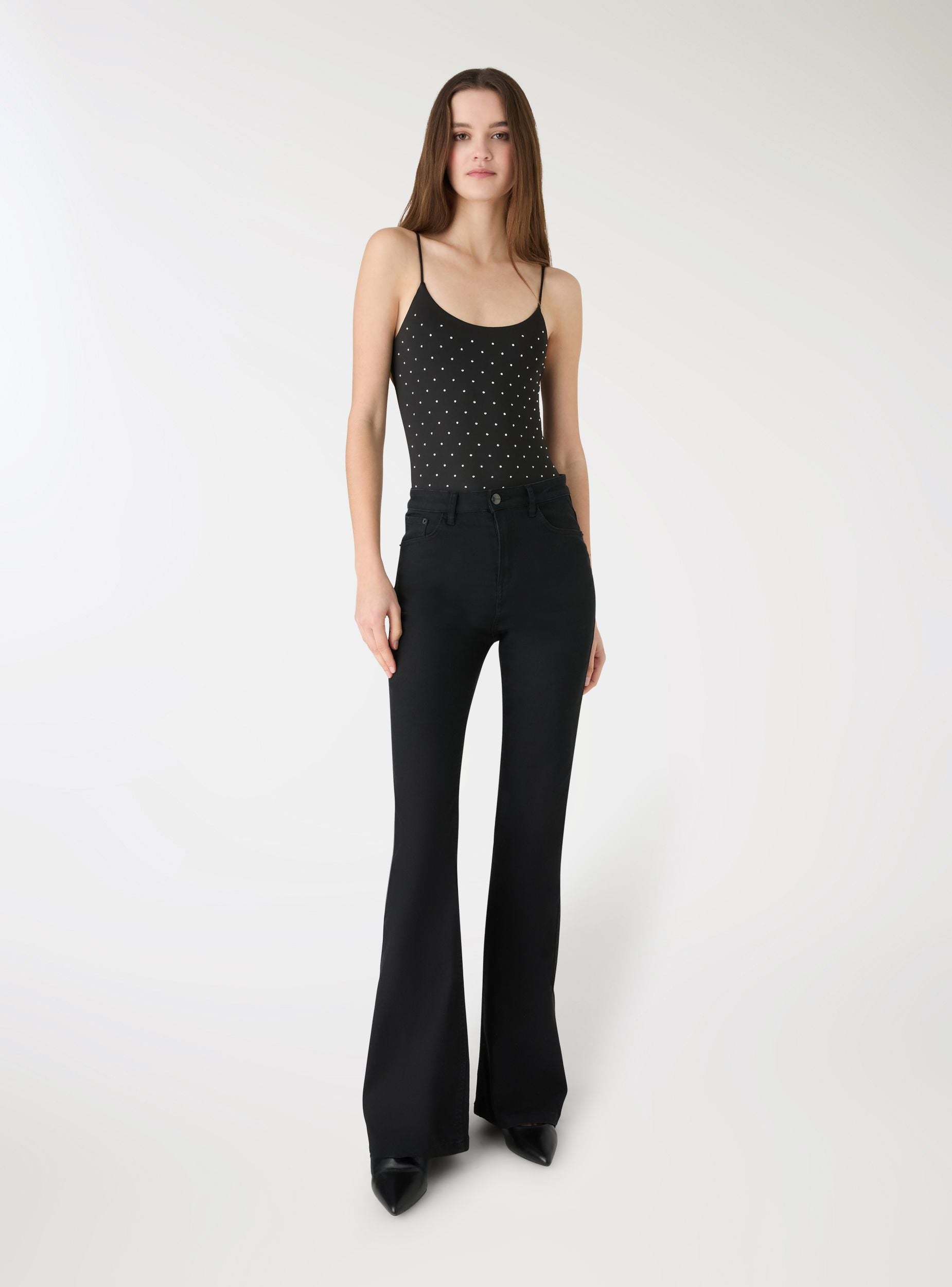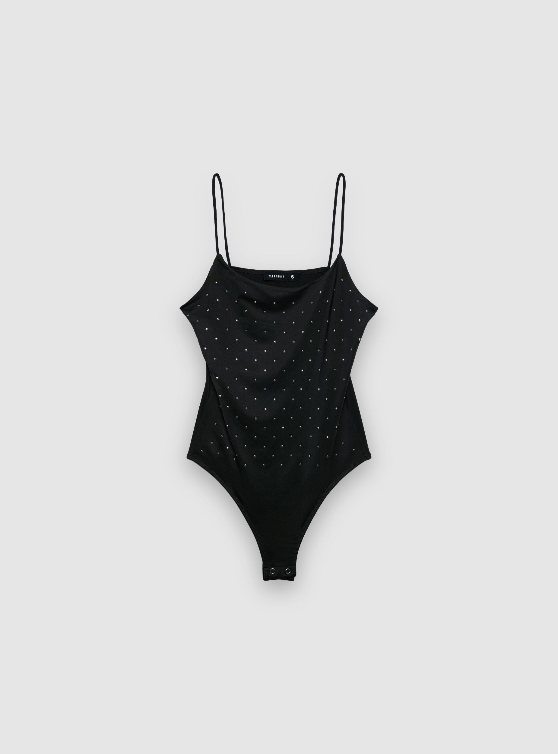 Body da donna a tinta unita con spalline sottili, impreziosito da applicazioni strass. Chiusura con bottoni a pressione al cavallo per una vestibilità pratica. Ideale sotto blazer o camicie per look serali o party, si abbina a jeans skinny o gonne midi. Linea aderente che valorizza la silhouette.Dettagli