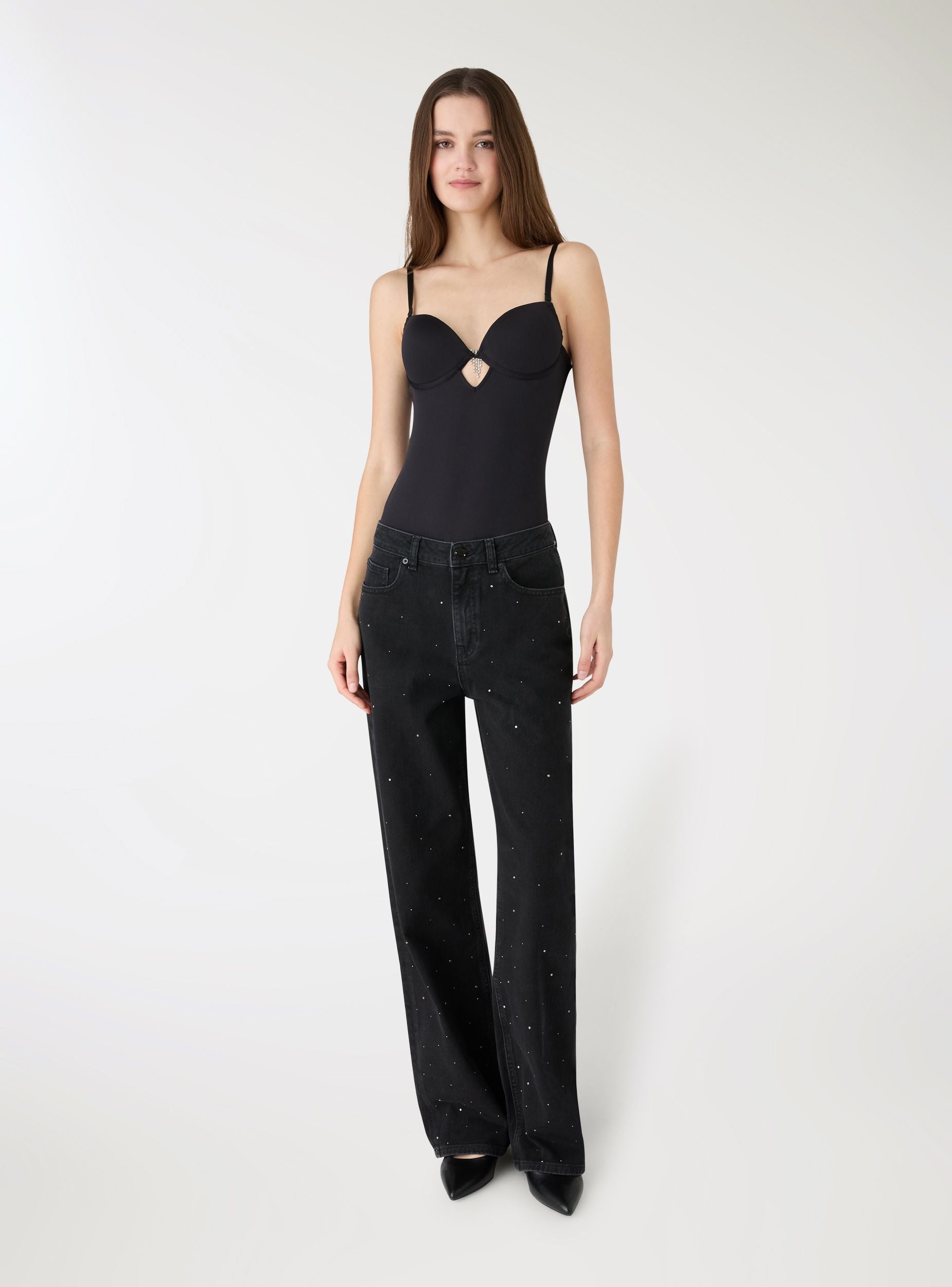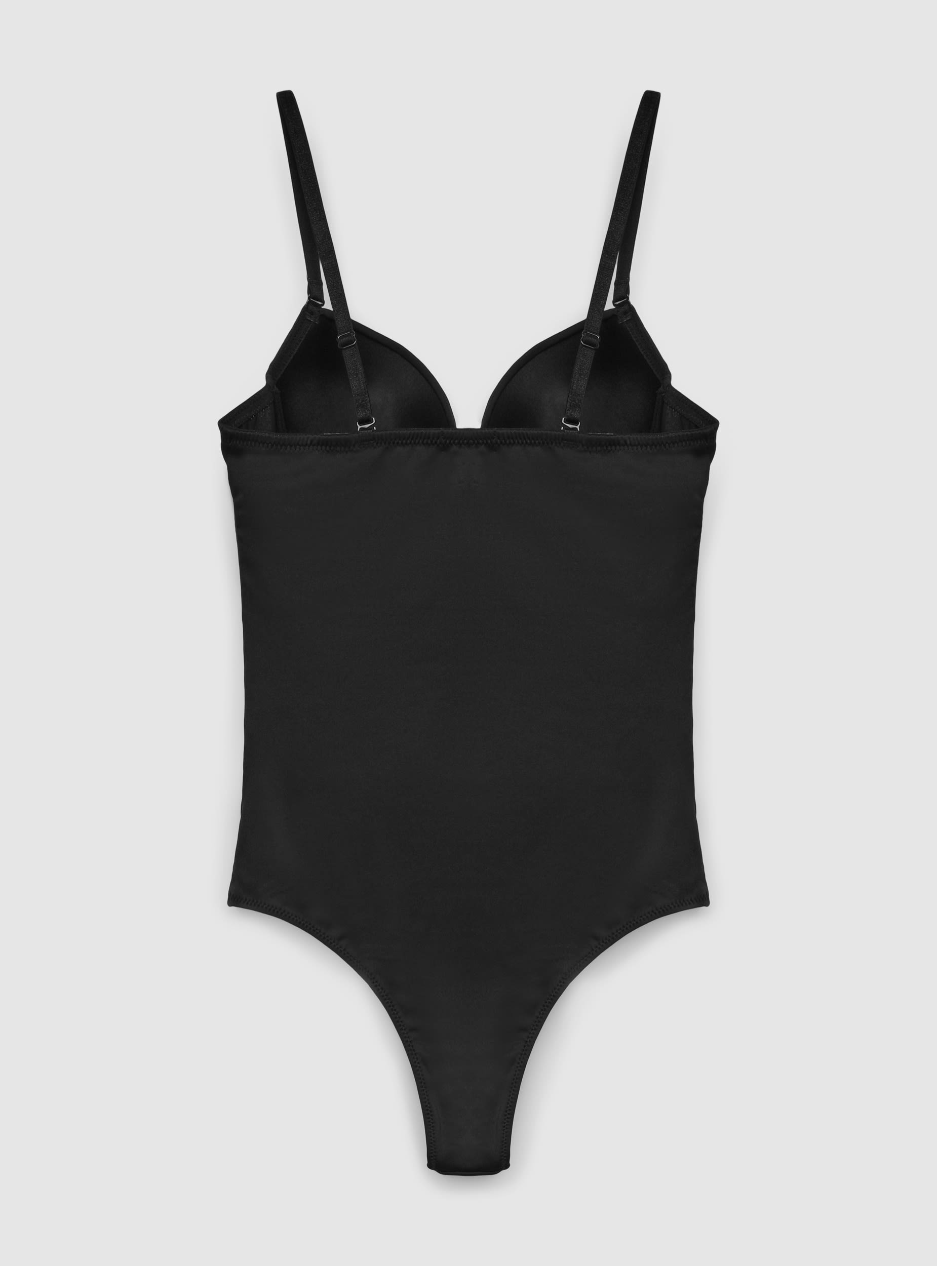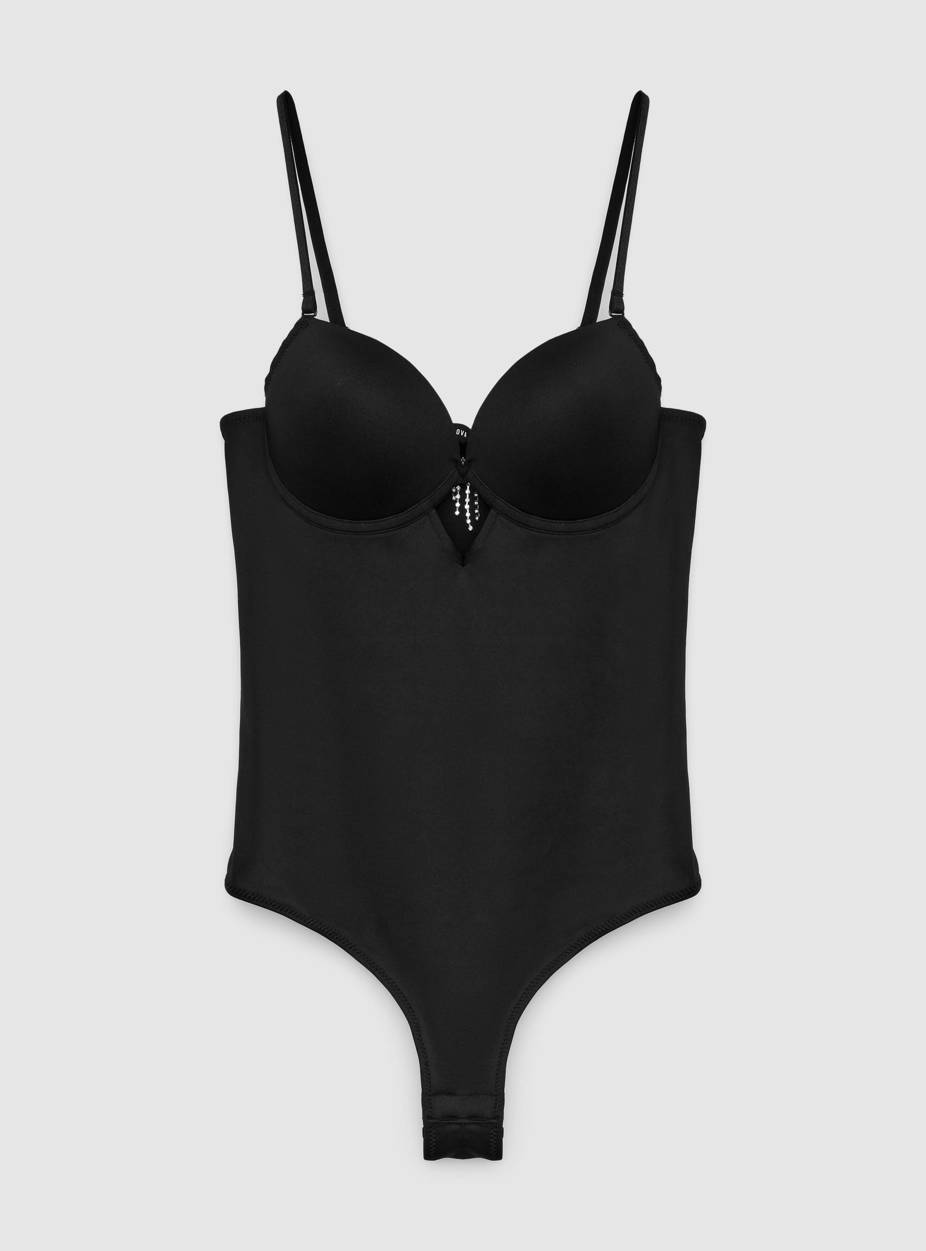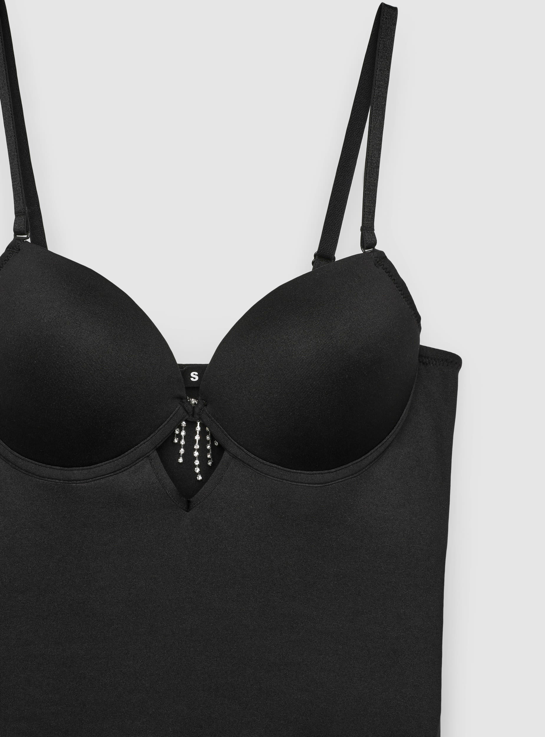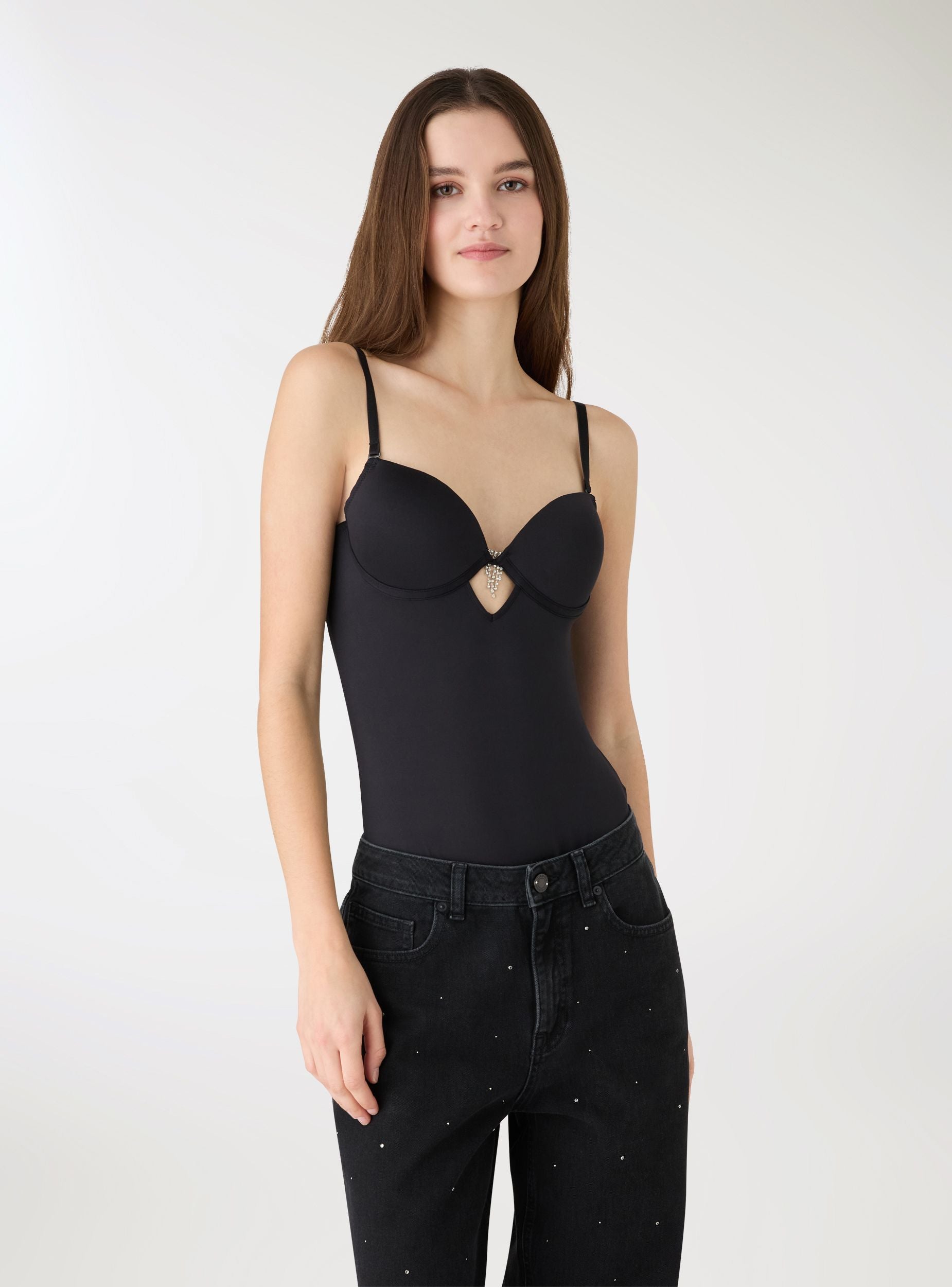 Body da donna a tinta unita con coppe imbottite e ferretto, spalline sottili regolabili e piccolo dettaglio di frange di strass al centro del décolleté. Chiusura al cavallo per praticità. Perfetto sotto blazer o camicie per serate e uscite, dona sostegno e una vestibilità femminile. Linee pulite e design essenziale, ideale per creare look eleganti o valorizzare outfit casual.Dettagli