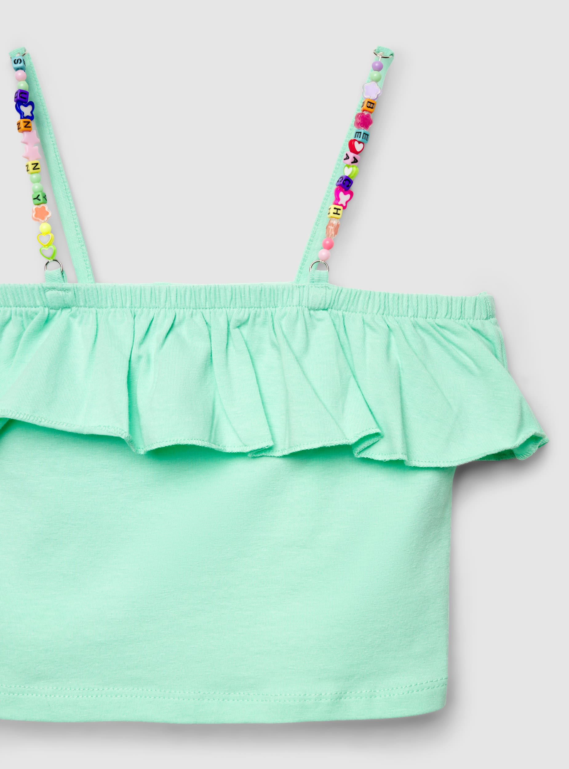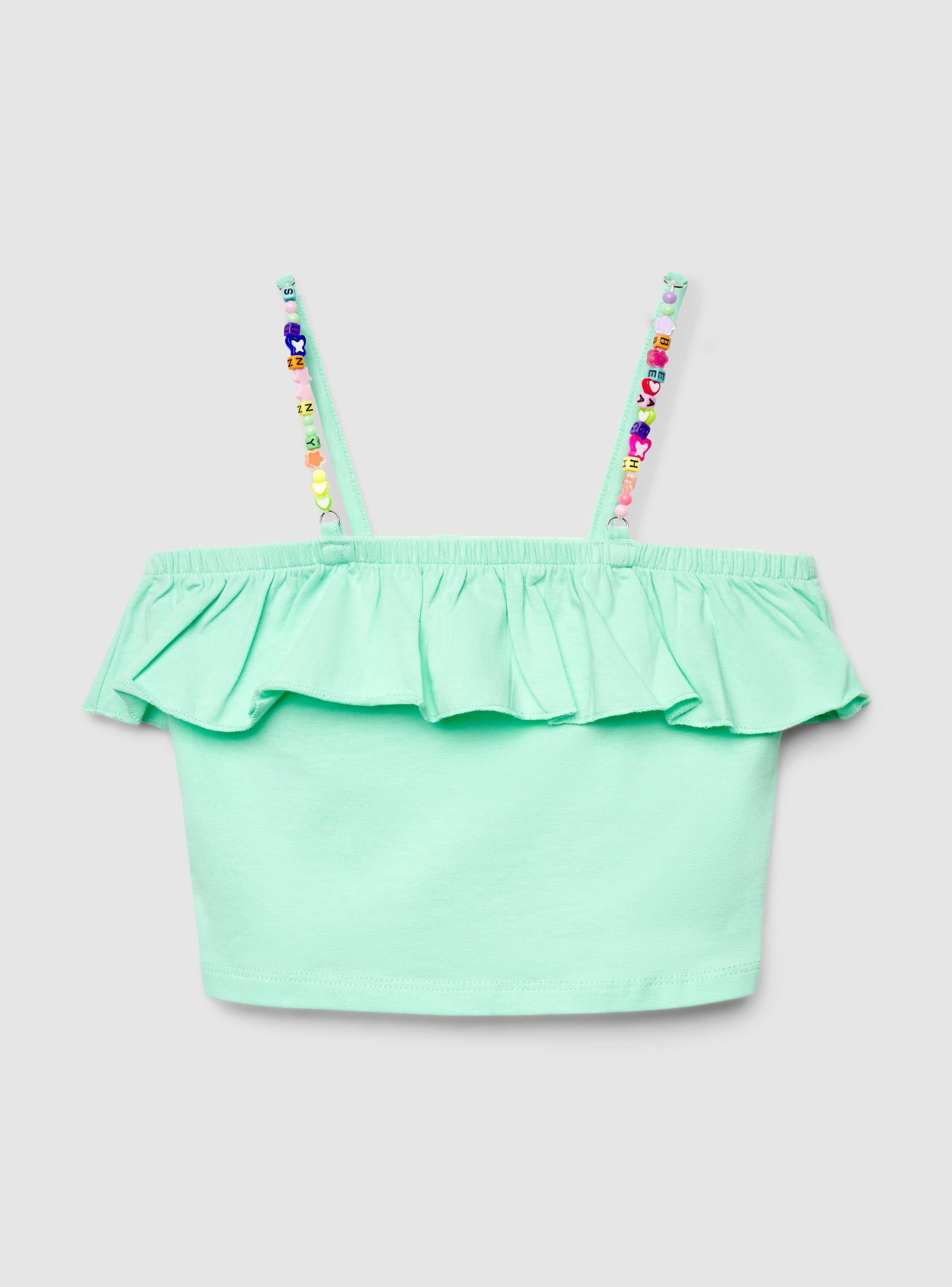 Top da bambina dal taglio crop, ideale per giornate estive e look vacanza. Modello a tinta unita con scollo dritto elasticizzato e spalline sottili decorate da perline multicolor, fissate con piccoli anelli. La balza a volant sul davanti aggiunge movimento e un tocco giocoso. Perfetto con shorts, gonne o jeans per outfit casual e trendy.Dettagli