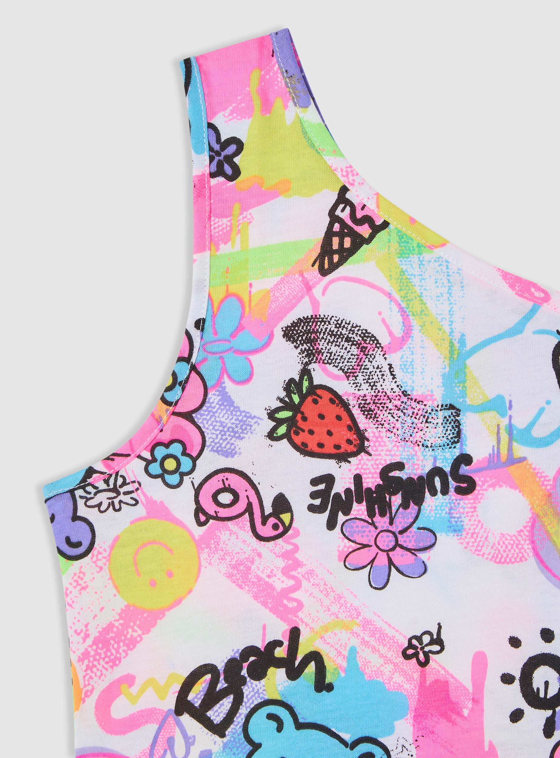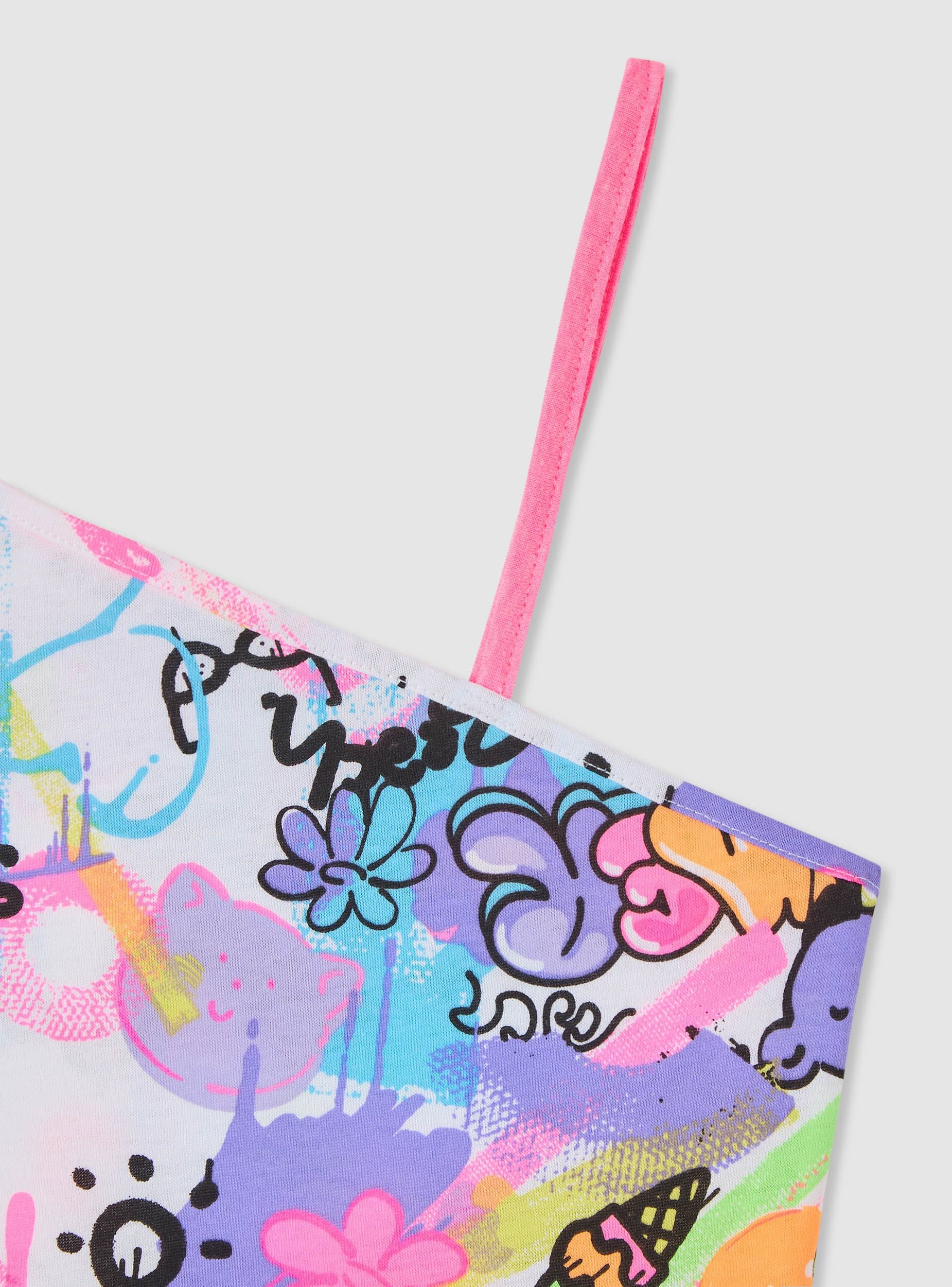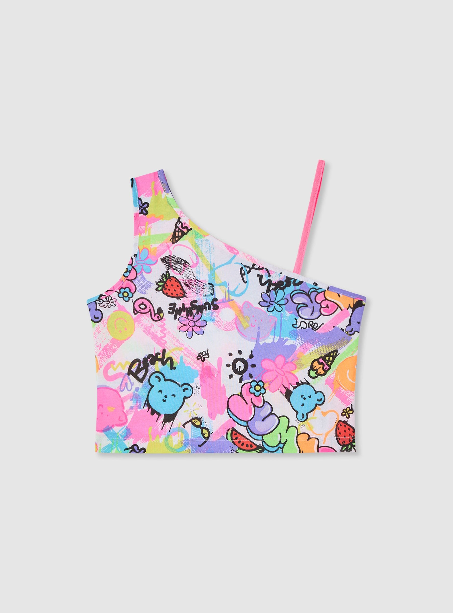 Maglietta da bambina in versione top crop monospalla, perfetta per l’estate e per look giocosi. La spallina sottile su un lato crea un design asimmetrico facile da abbinare con shorts, gonne o jeans. Fantasia con stampa ricca di elementi divertenti. Vestibilità crop che valorizza la silhouette e rende il capo ideale per il tempo libero e le giornate al mare.Dettagli