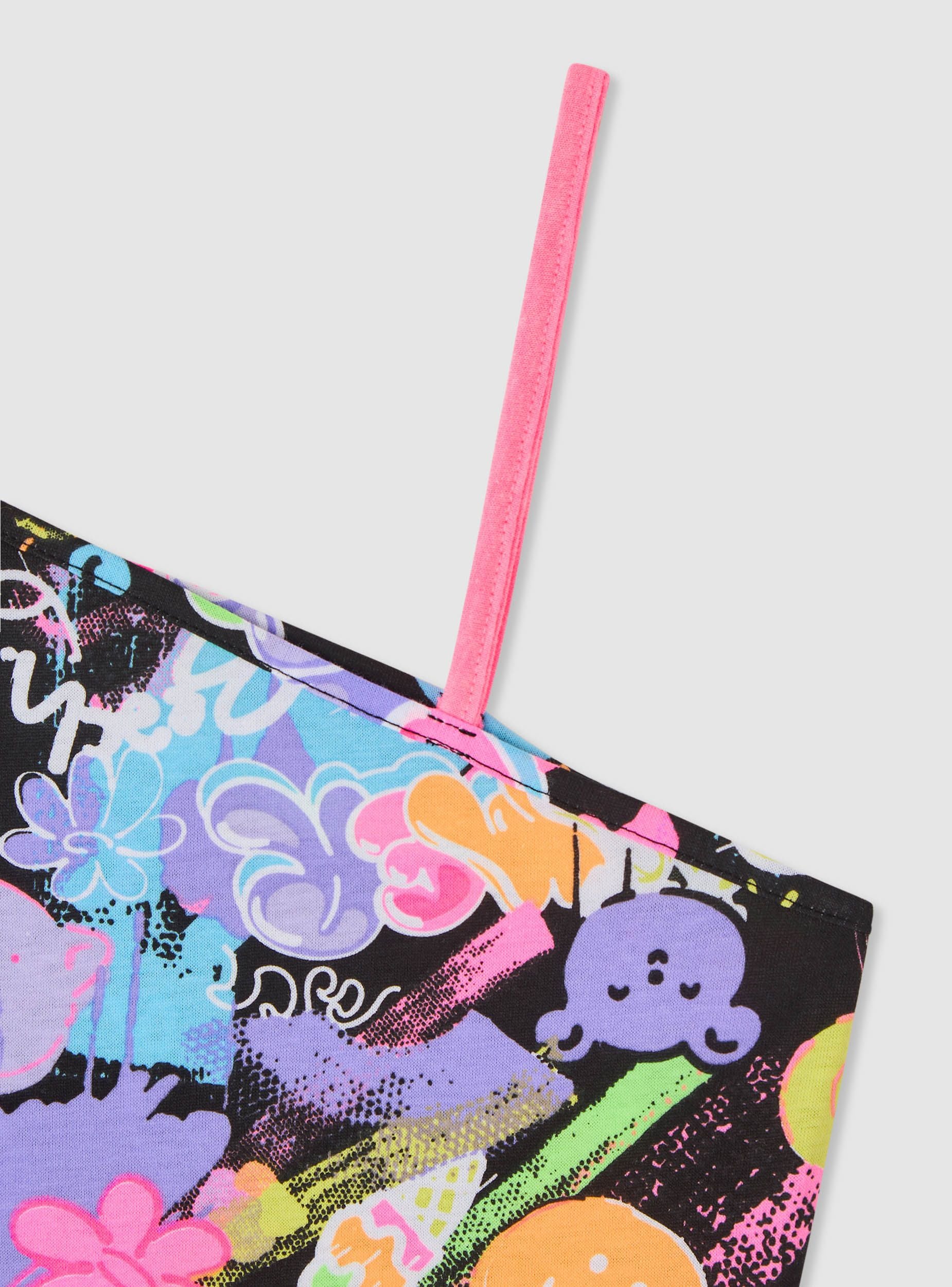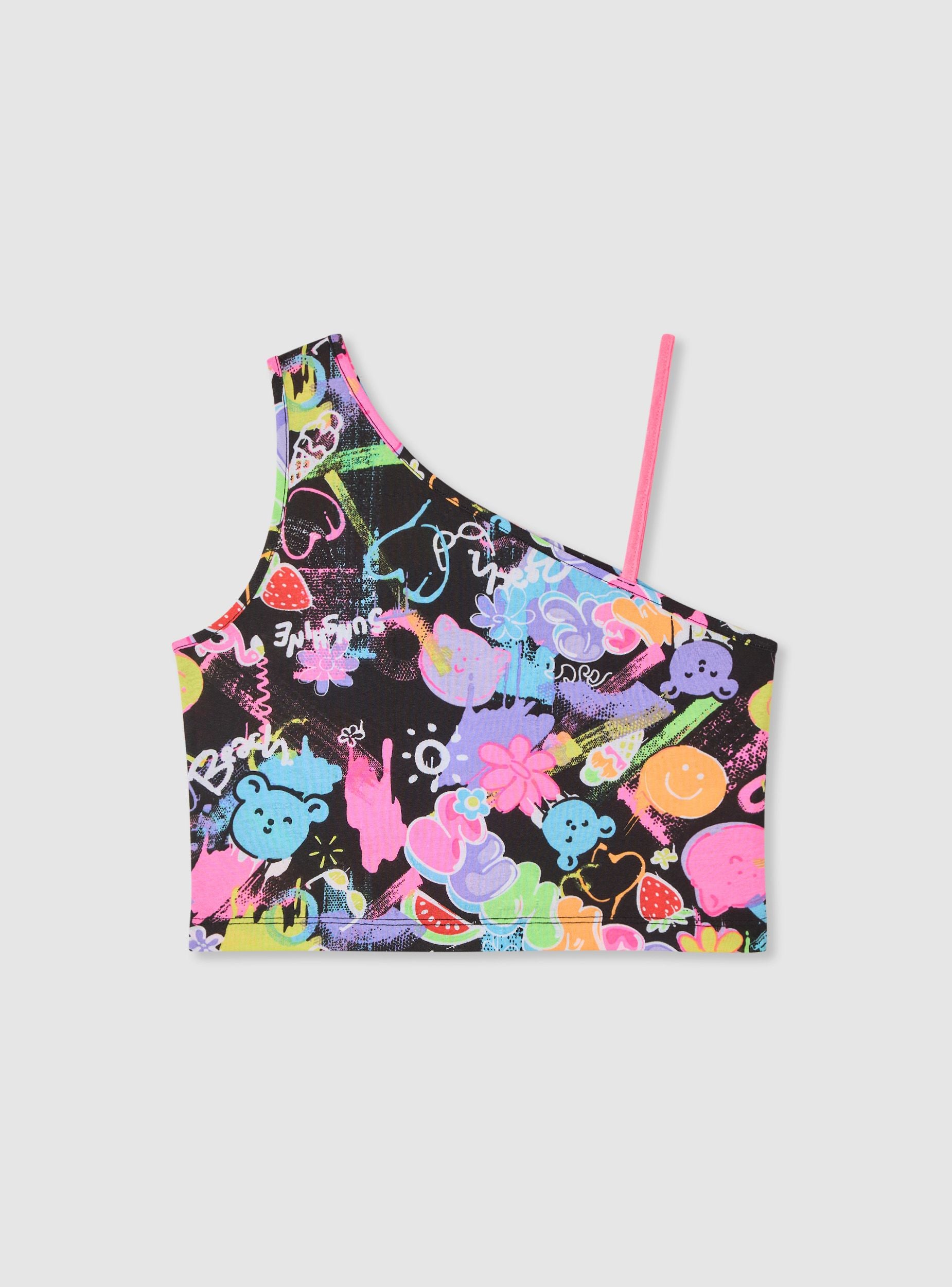 Maglietta da bambina in versione top crop monospalla, perfetta per l’estate e per look giocosi. La spallina sottile su un lato crea un design asimmetrico facile da abbinare con shorts, gonne o jeans. Fantasia con stampa ricca di elementi divertenti. Vestibilità crop che valorizza la silhouette e rende il capo ideale per il tempo libero e le giornate al mare.Dettagli