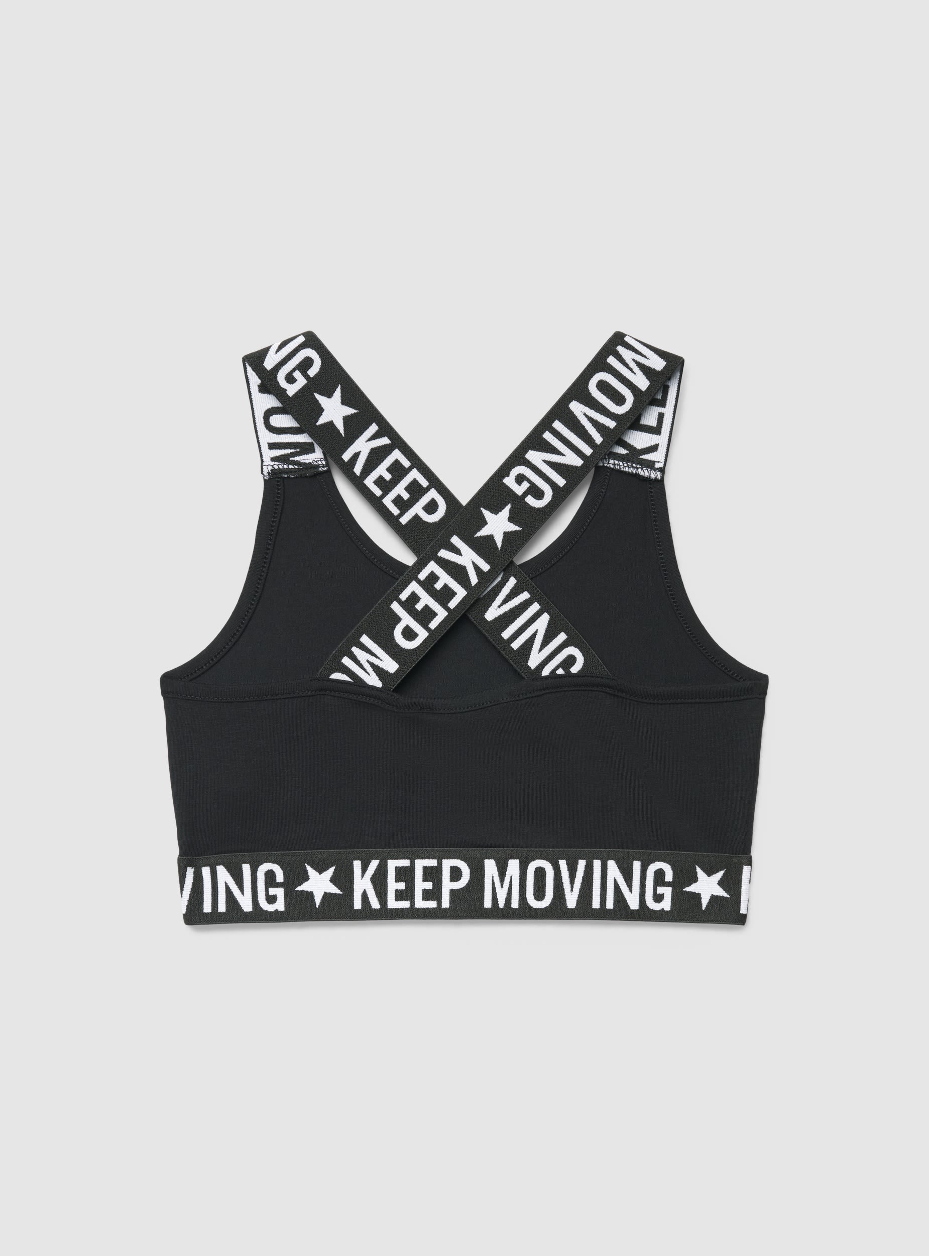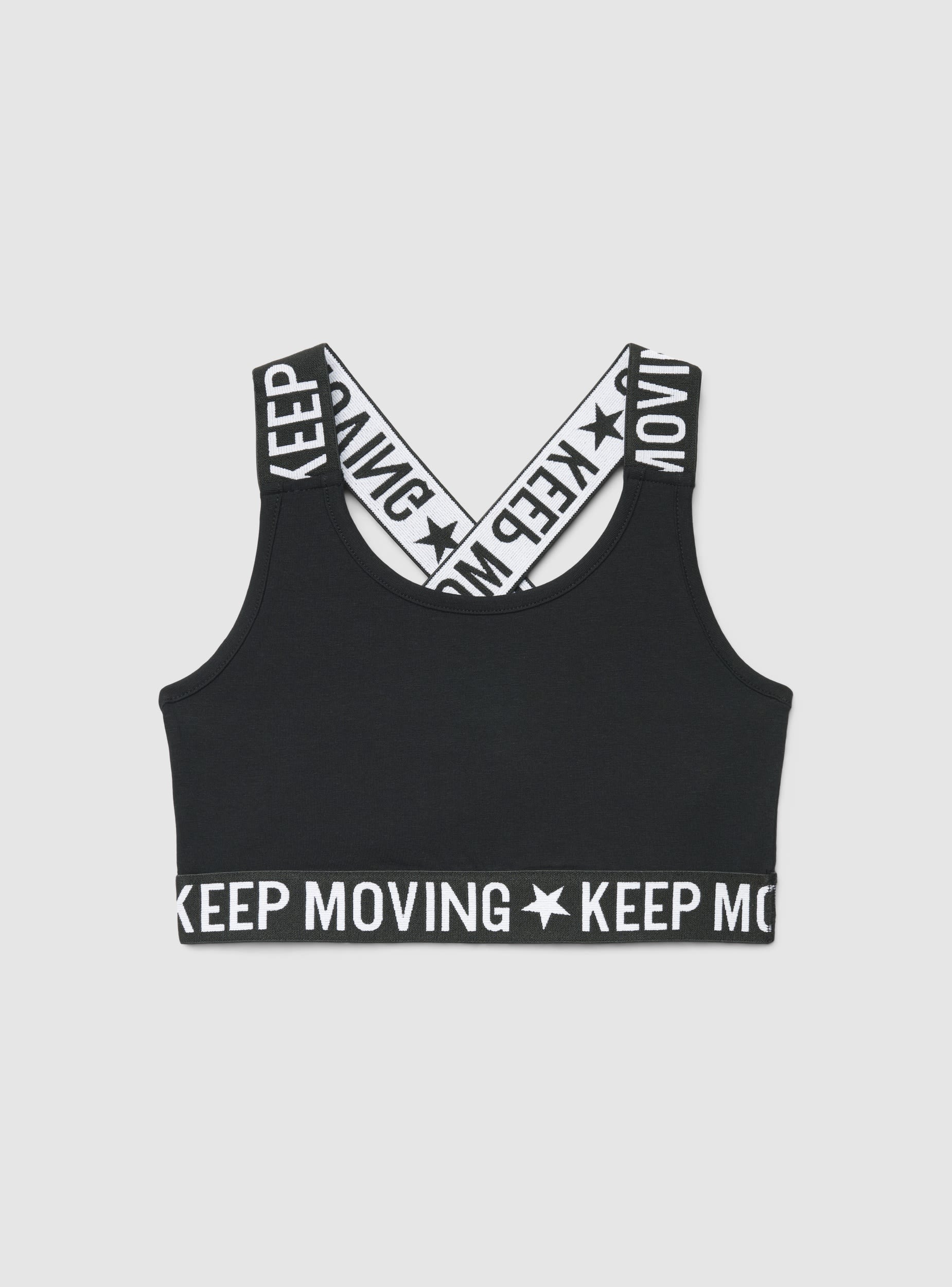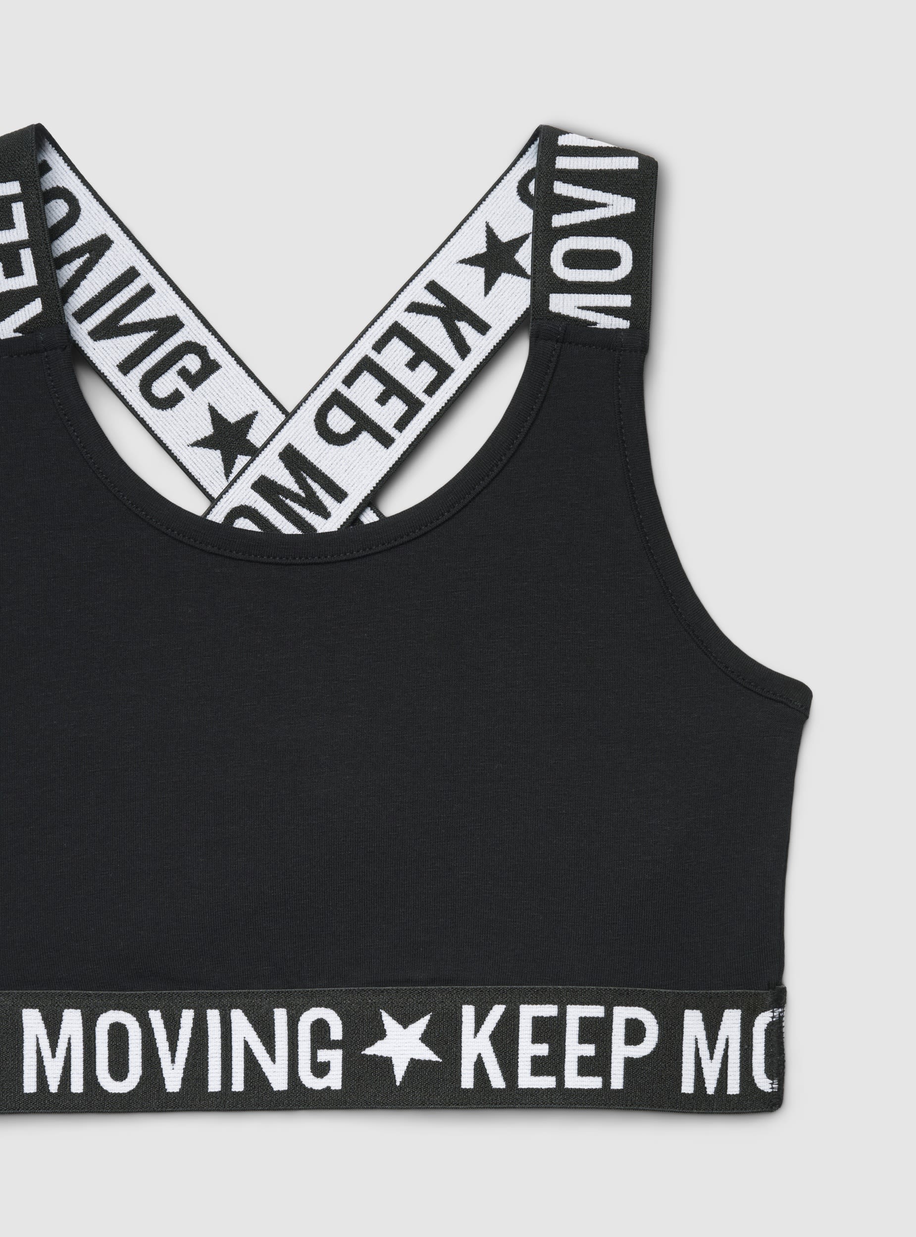 Maglietta da bambina in versione top crop, ideale per sport e tempo libero. Spalline larghe incrociate sul retro e fascia elastica con scritta che assicura sostegno e comfort. Girocollo e vestibilità aderente perfetta sopra leggings, pantaloni tuta o shorts. Design a tinta unita con lettering, pensato per outfit dinamici e per allenamenti o attività quotidiane.Dettagli
