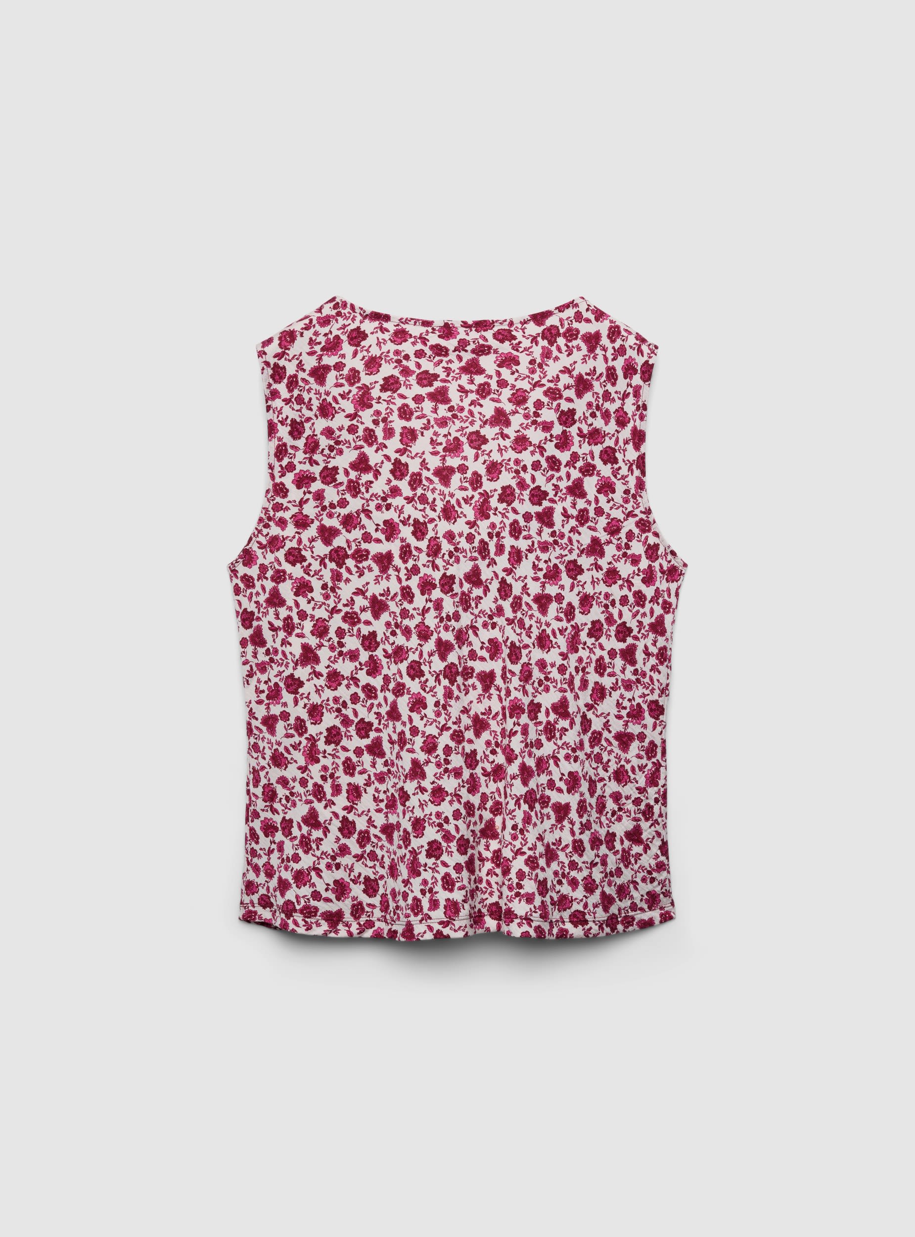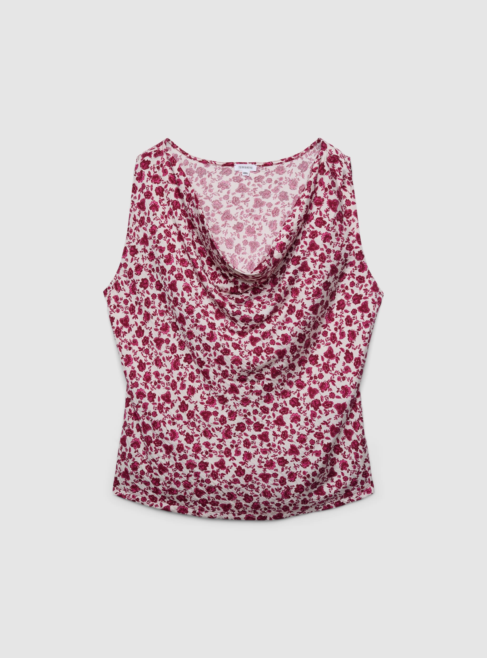 Top da donna con stampa floreale all over e scollo morbido drappeggiato che valorizza il décolleté. Modello smanicato dalla vestibilità regolare, ideale con jeans o pantaloni a vita alta per look da giorno e serate informali. Design essenziale senza chiusura e senza tasche, perfetto anche sotto blazer o cardigan per outfit stratificati.Dettagli