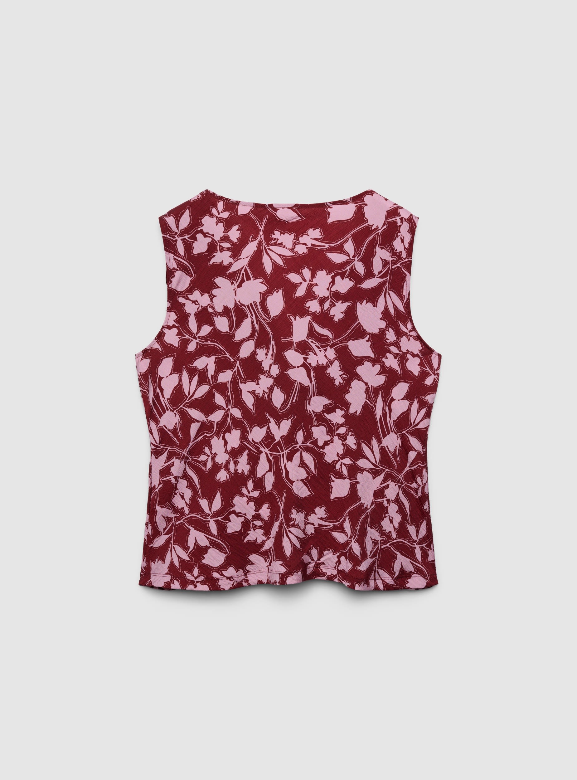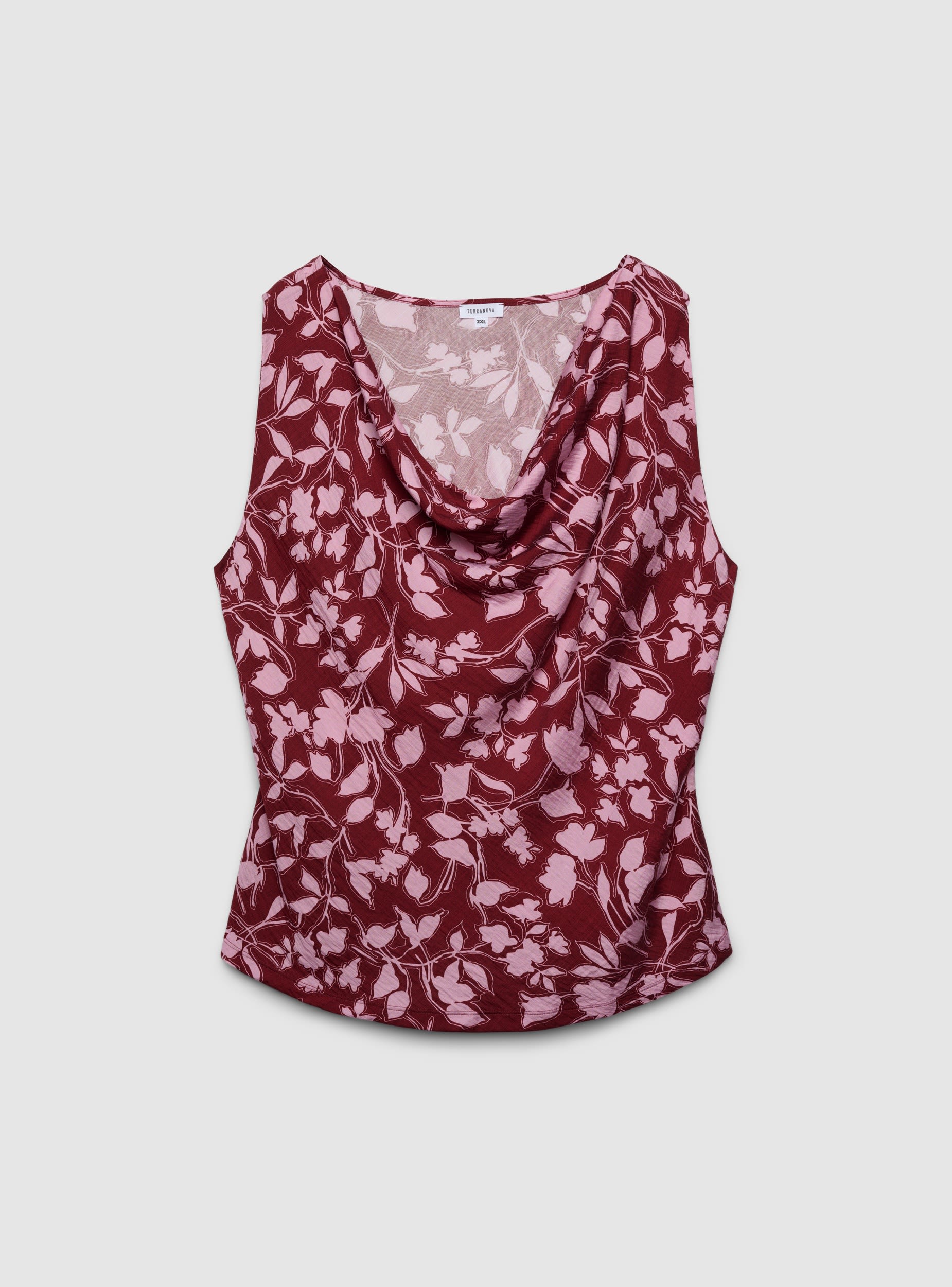 Top da donna con stampa floreale e scollo a cappuccio drappeggiato, pensato per look casual e da giorno. Modello senza maniche con spalline larghe e vestibilità regolare, facile da indossare senza chiusure. Ideale con jeans, pantaloni ampi o gonne per creare outfit versatili, dal lavoro informale all’aperitivo.Dettagli