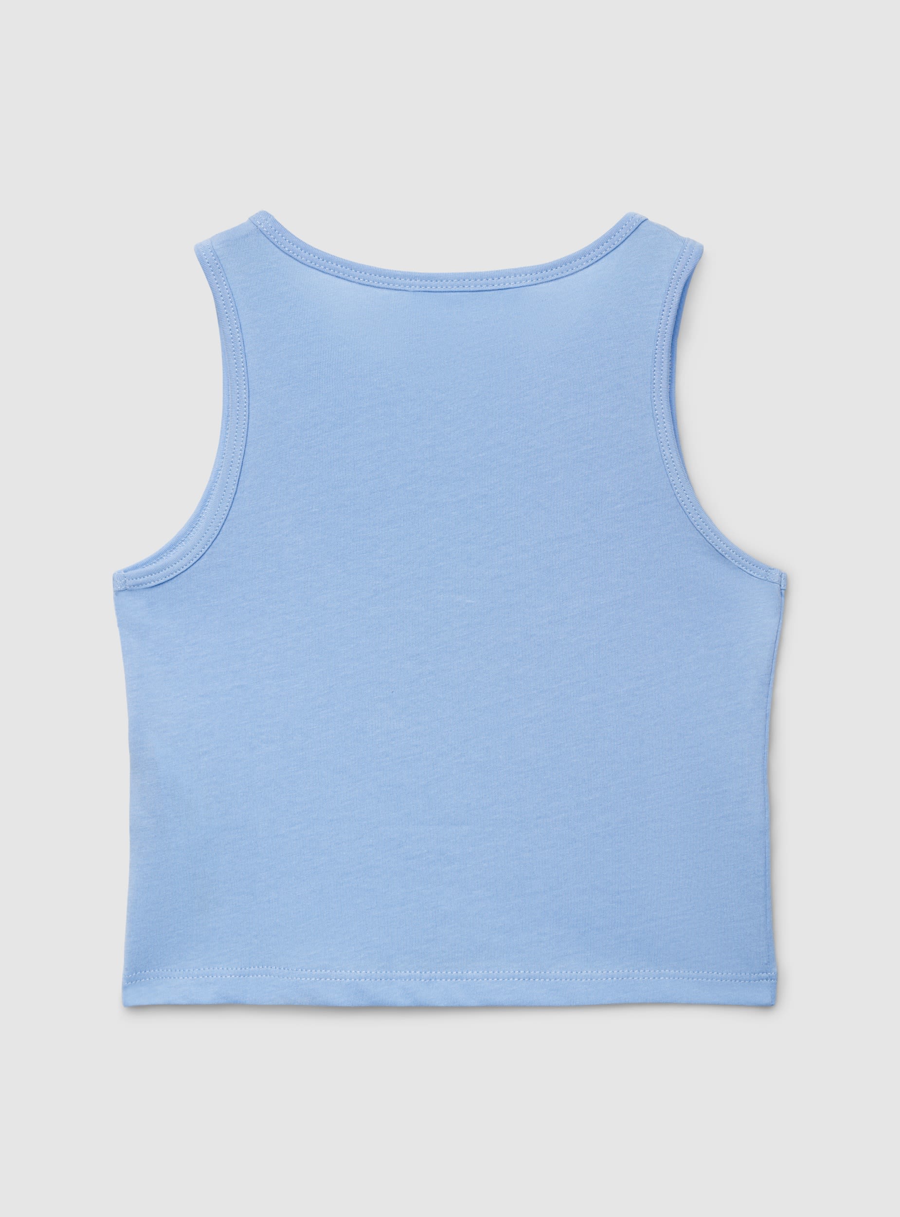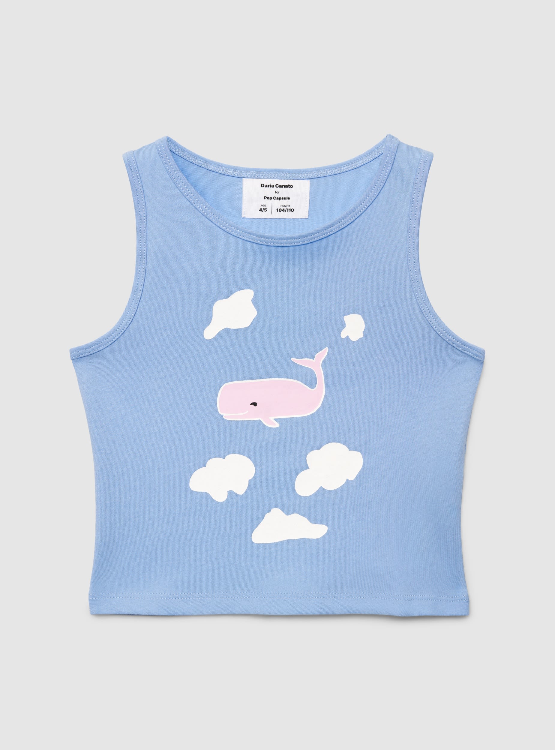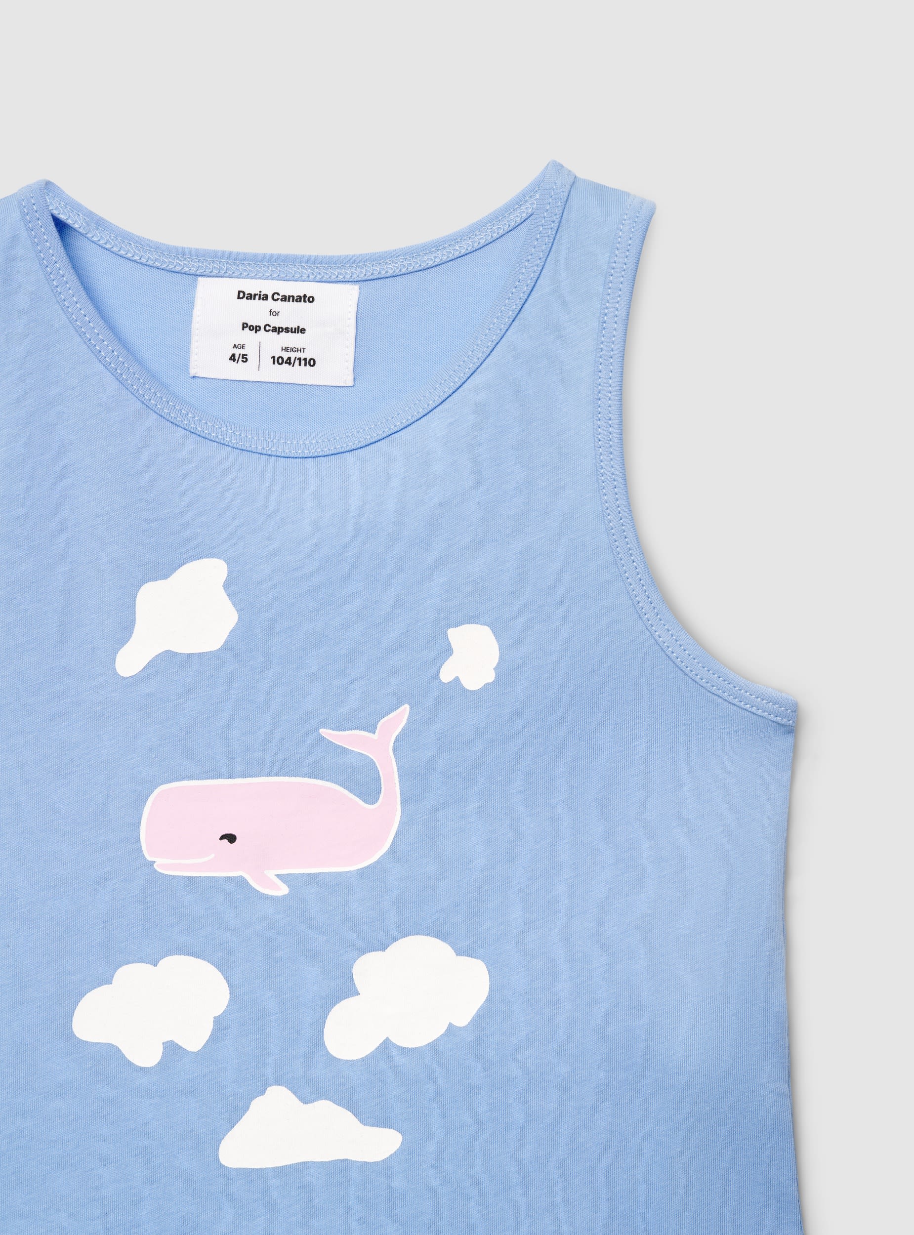 Top da bambina con stampa a tema marino, ideale per look estivi e per il tempo libero. Modello senza maniche con scollo tondo e bordi rifiniti, pensato per una vestibilità comoda. Facile da abbinare a shorts, gonne o jeans per outfit pratici e giocosi, perfetto anche sotto una camicia leggera nelle mezze stagioni.Dettagli