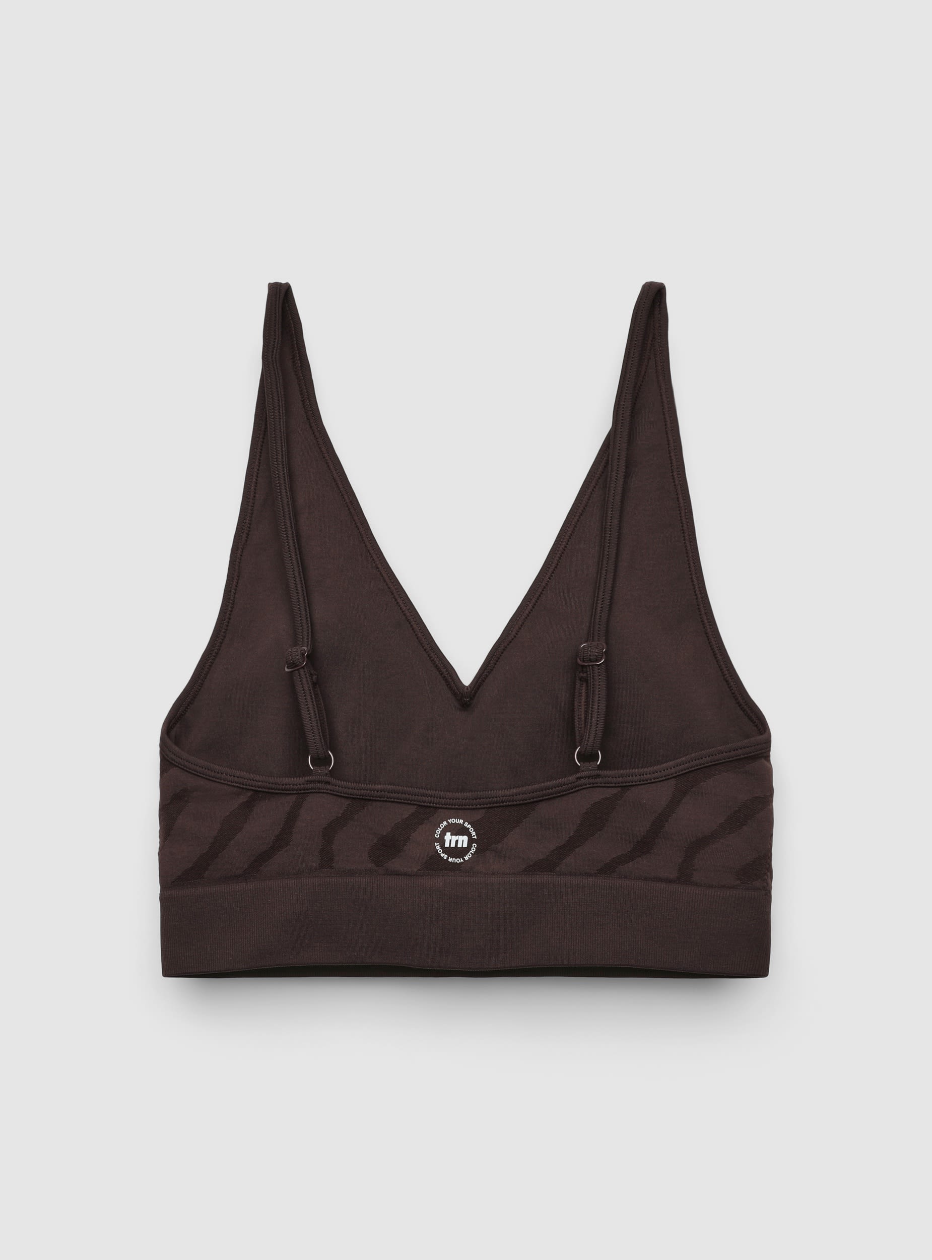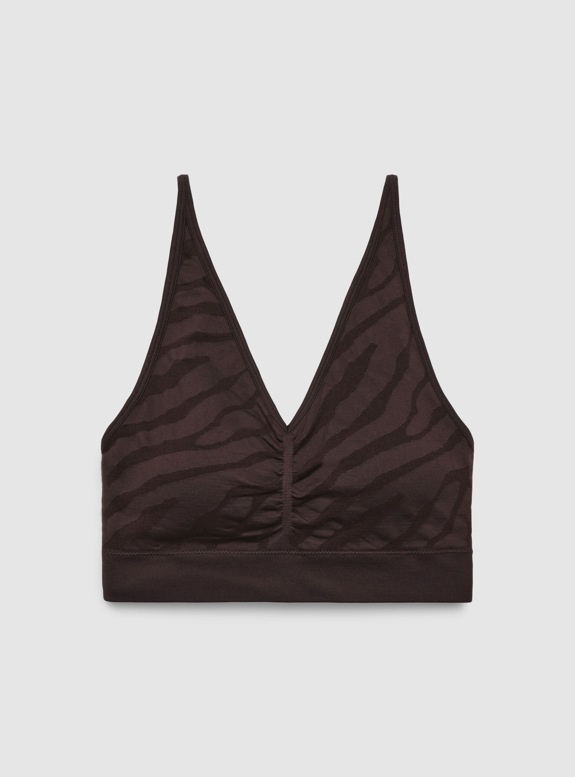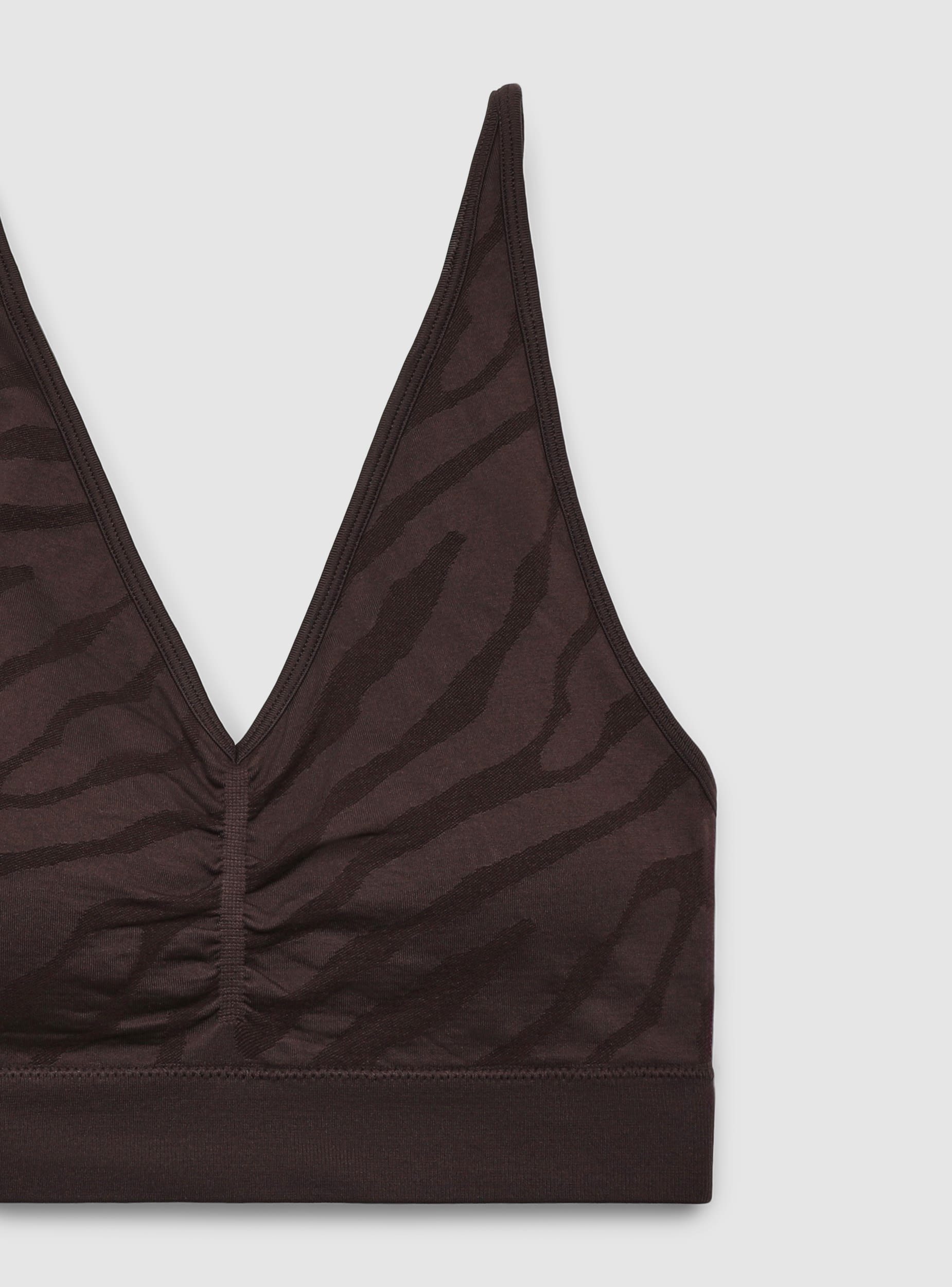 Bra top da donna con scollo a V profondo, ideale per il tempo libero o l’allenamento leggero. Spalline sottili regolabili e arricciatura centrale sul davanti valorizzano la forma. Fascia sottoseno elasticizzata per sostegno confortevole. Motivo animalier che dona carattere. Linea Active.Dettagli